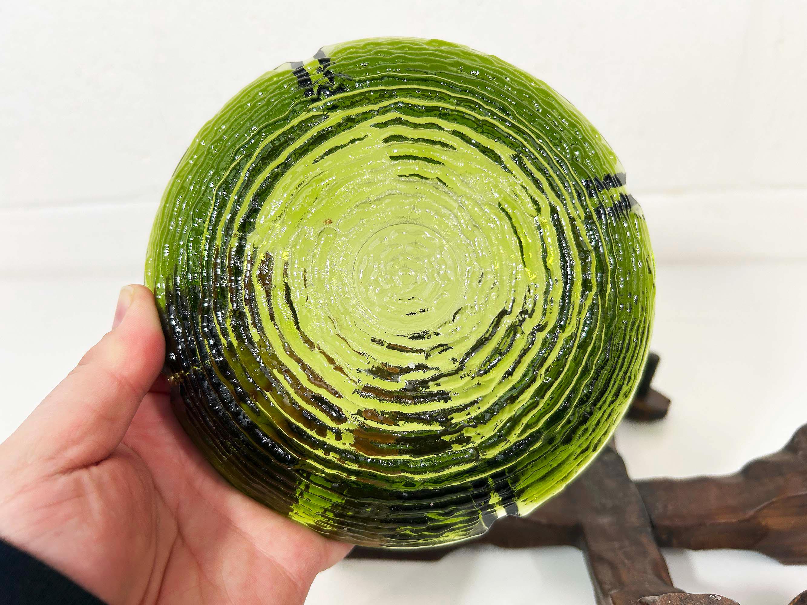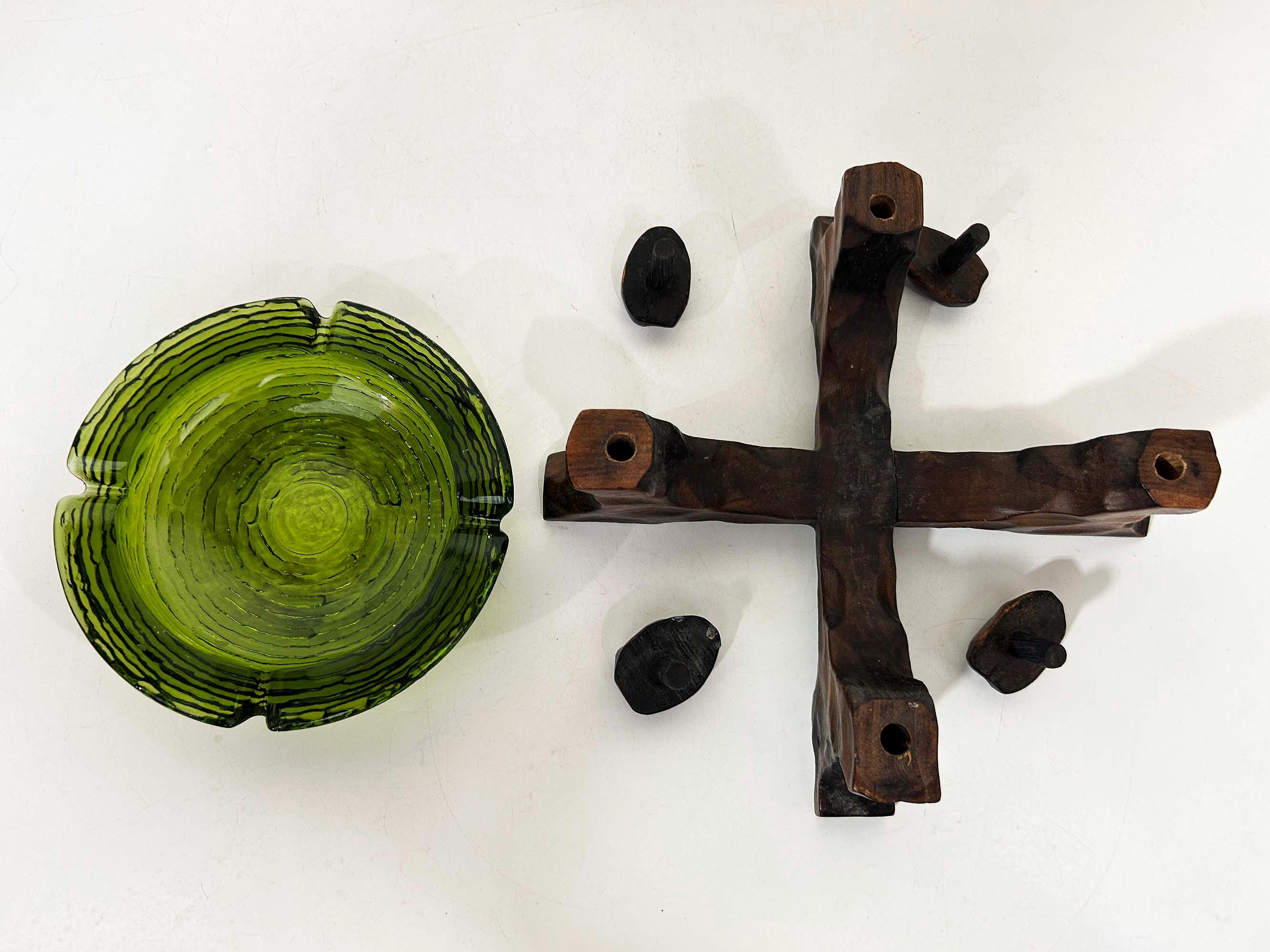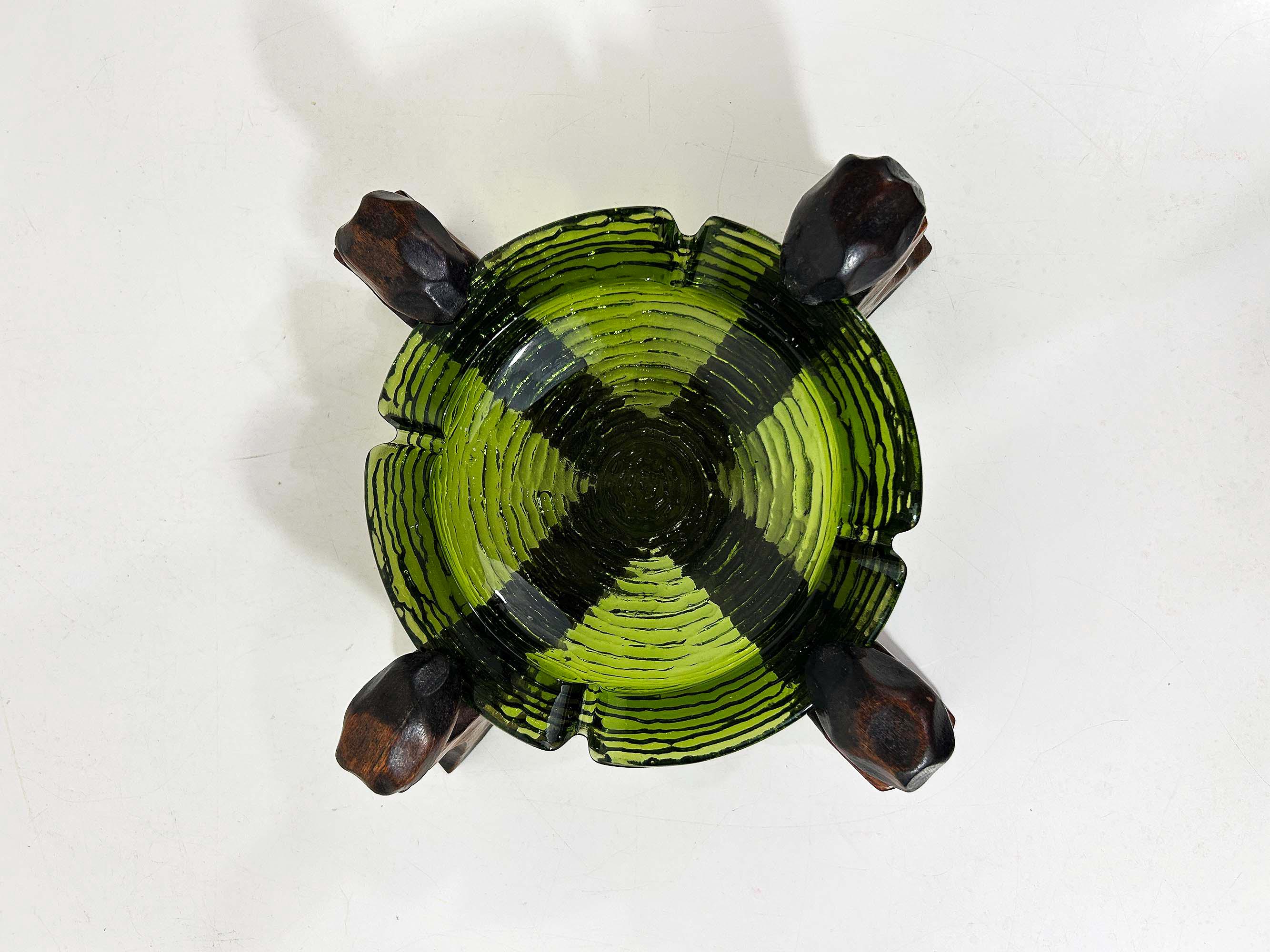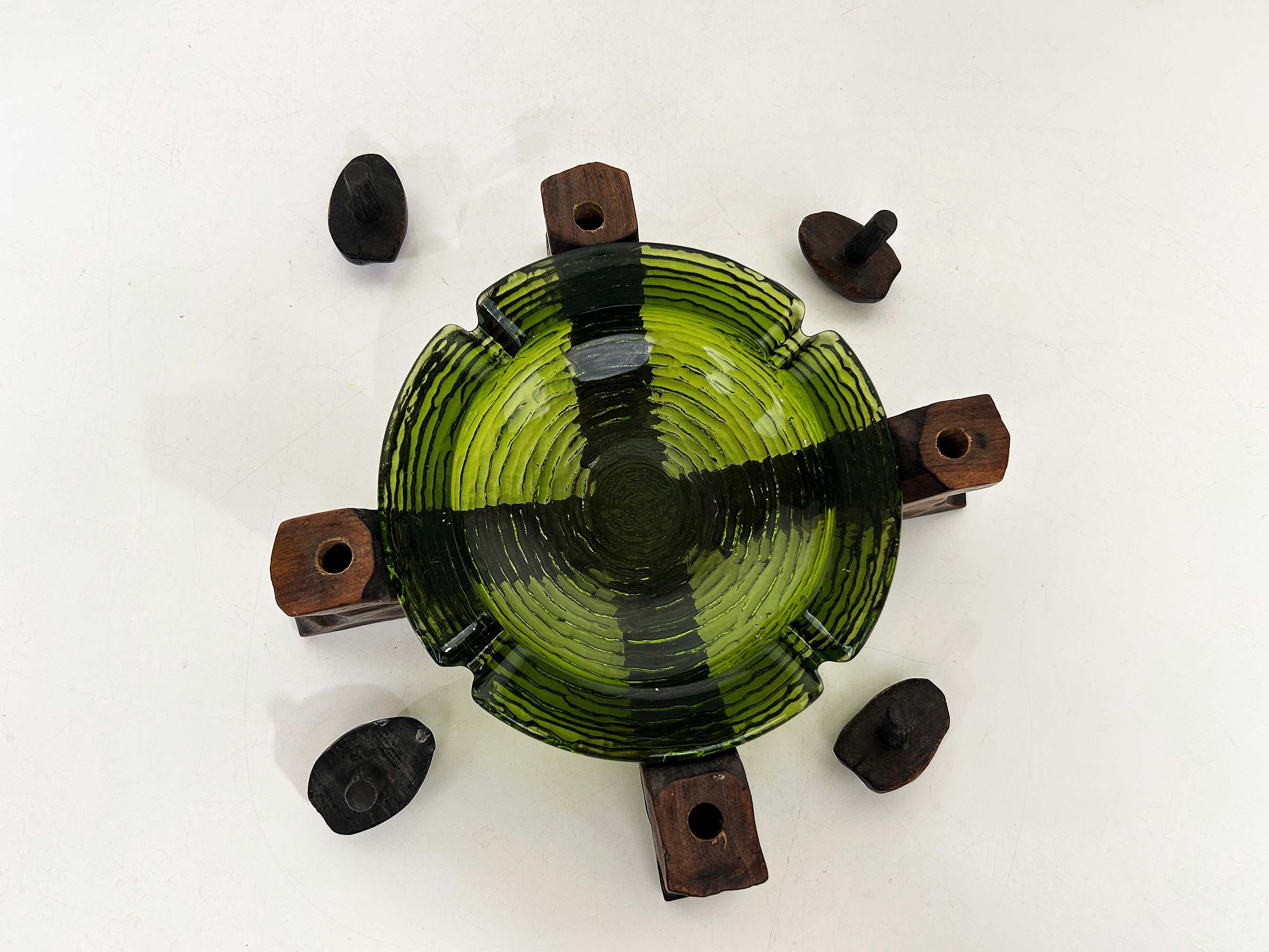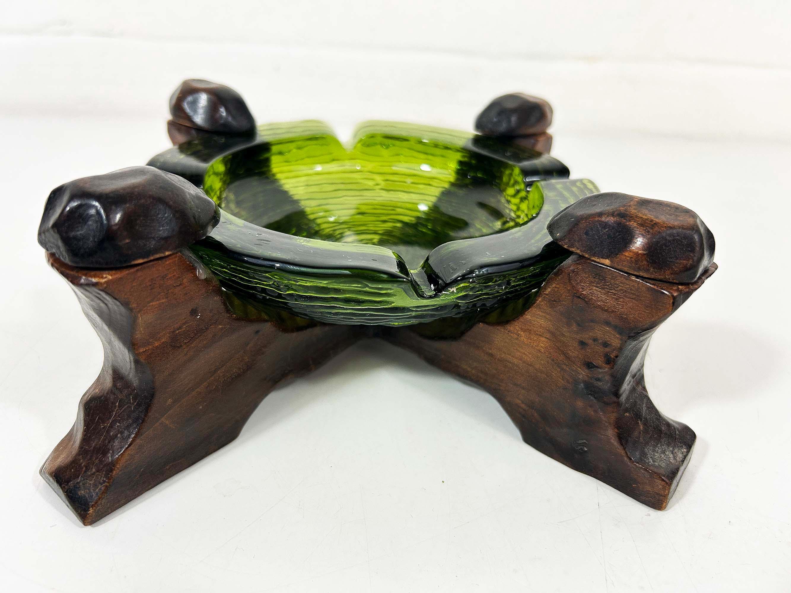 The funkiest green glass ashtray with a unique wood stand! It is in good vintage condition with no significant flaws. Such a cool statement piece for your home! The wooden stand comes apart so you can easily clean the glass ashtray. The ashtray is about 6 1/2 inches in diameter and 3 inches tall.