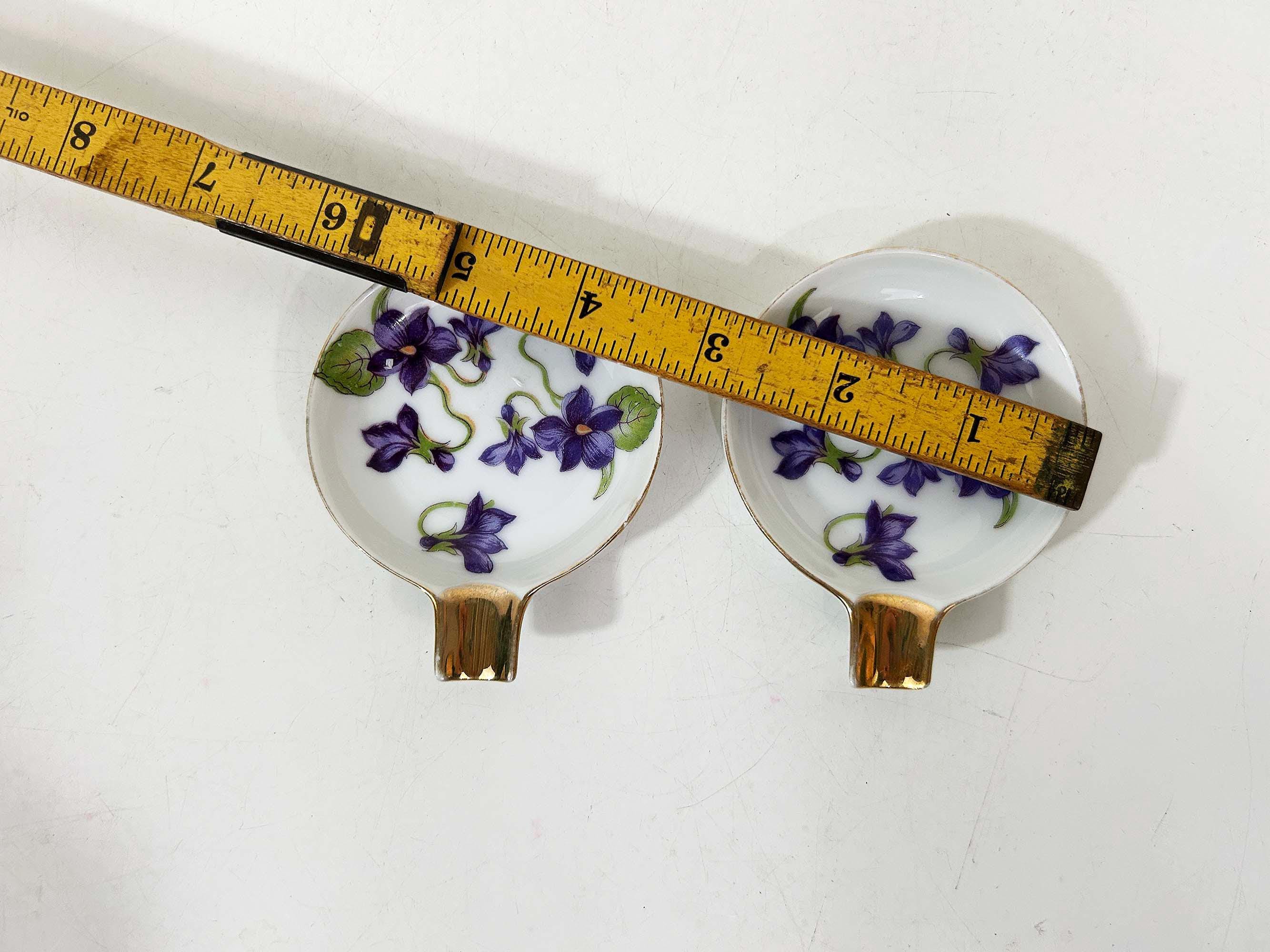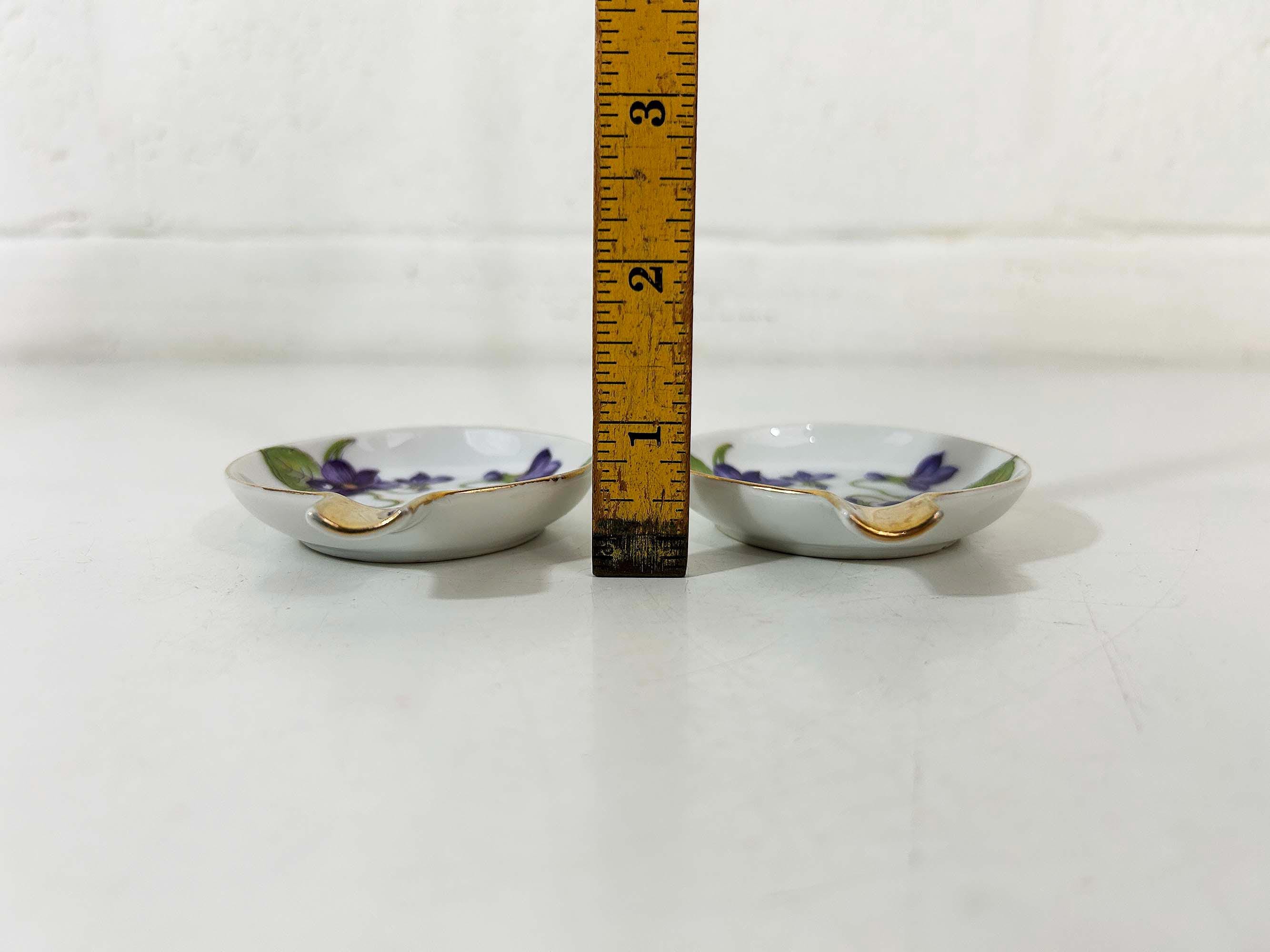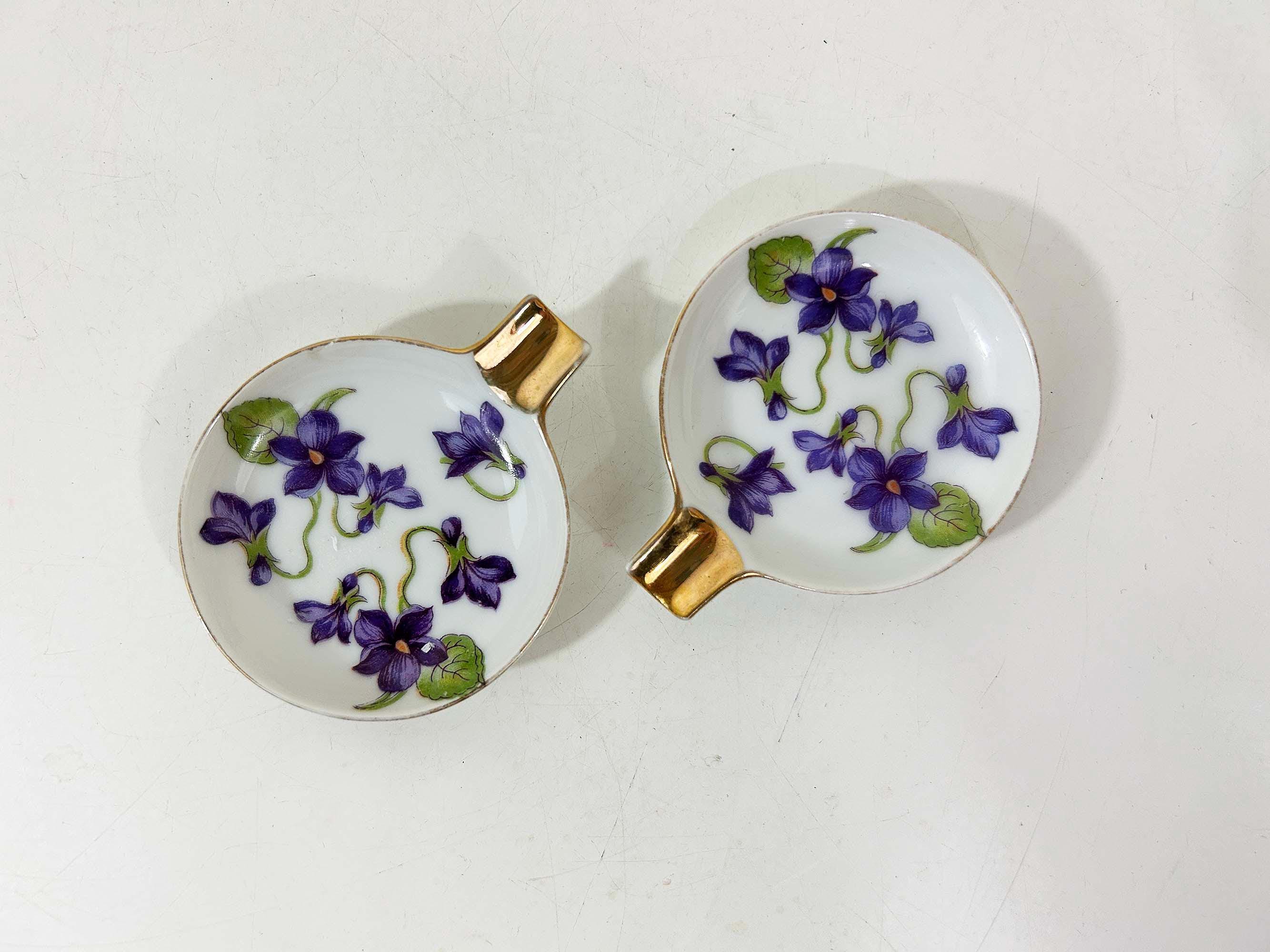 Cutest set of 2 mini personal ashtrays with lovely purple painted flowers. Each ashtray is approximately 2 1/2 inches in diameter and 3/4 inches tall.
