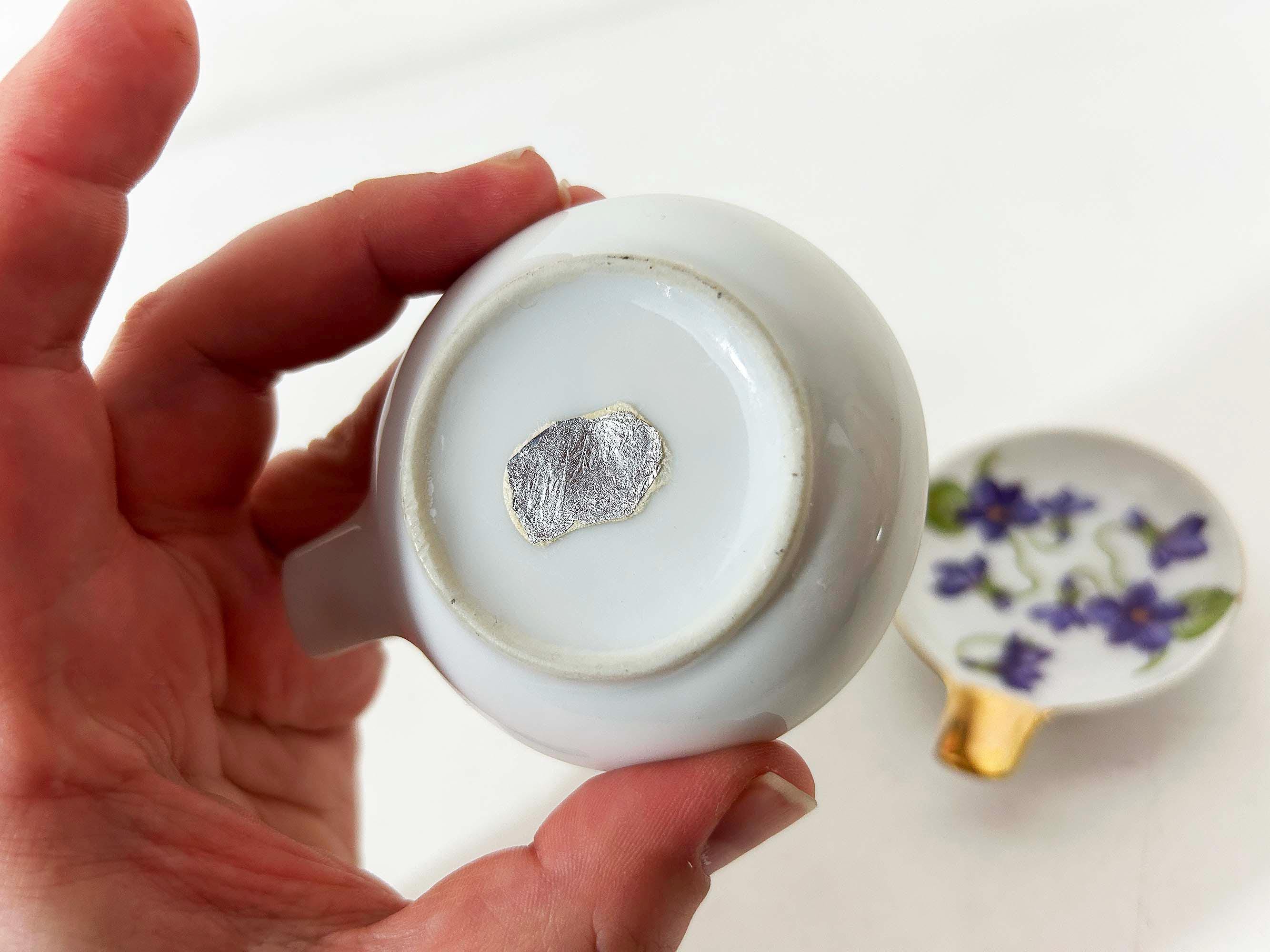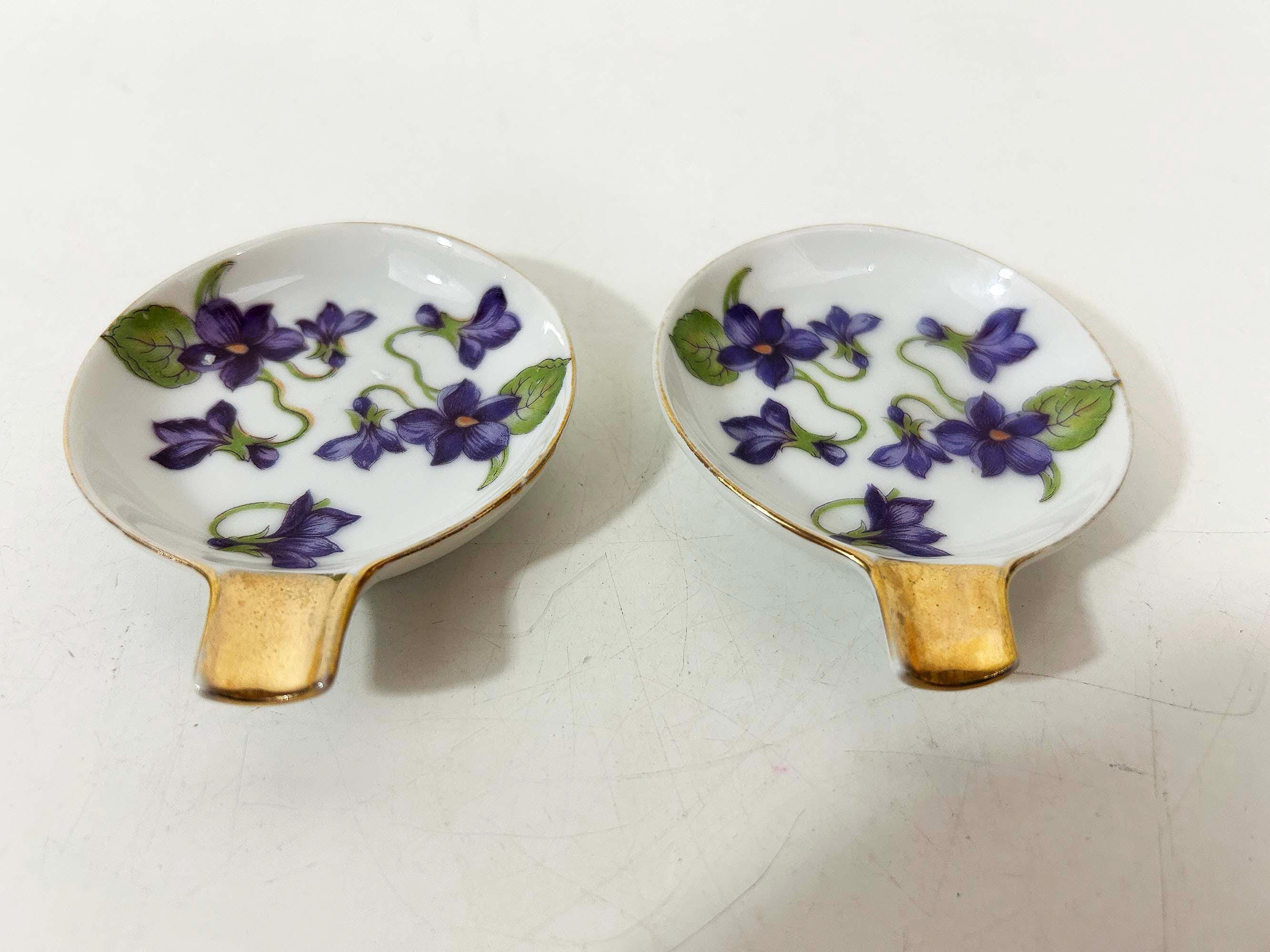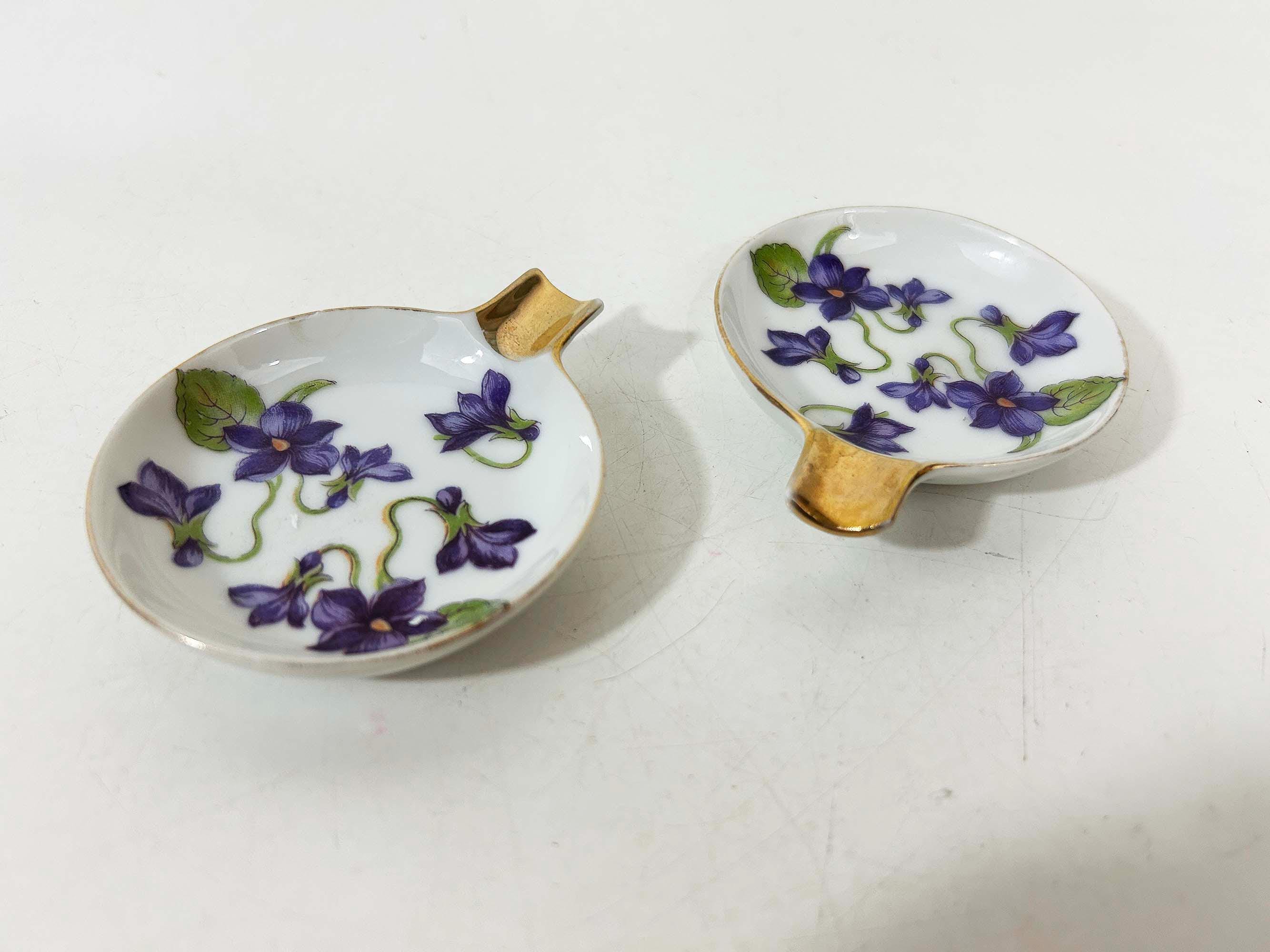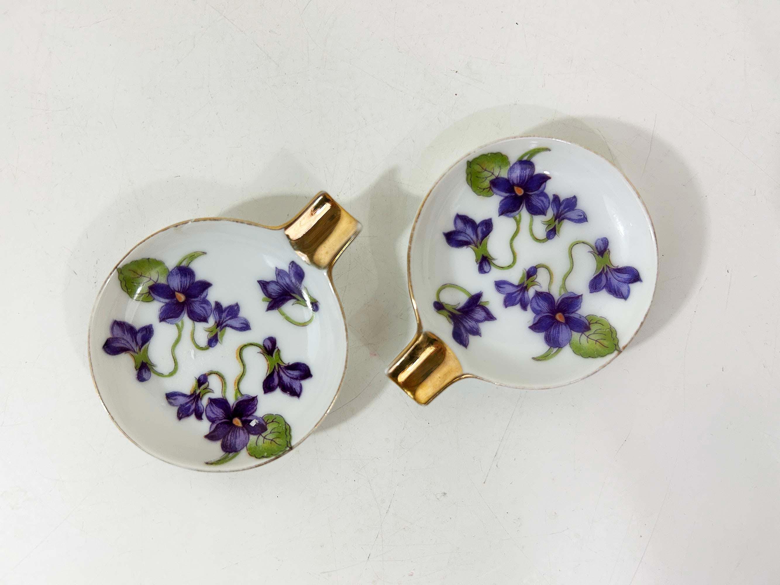 Cutest set of 2 mini personal ashtrays with lovely purple painted flowers. Each ashtray is approximately 2 1/2 inches in diameter and 3/4 inches tall.