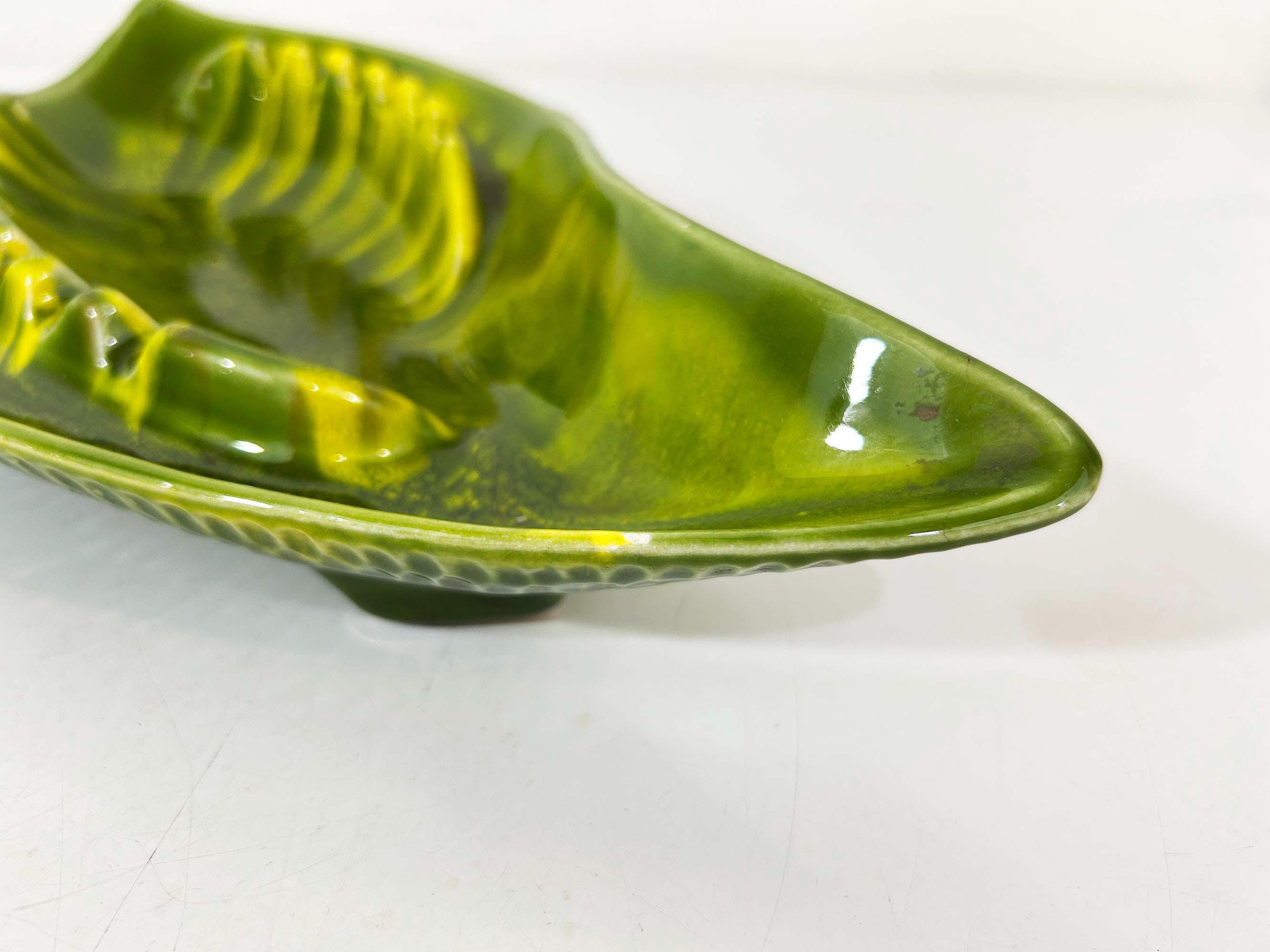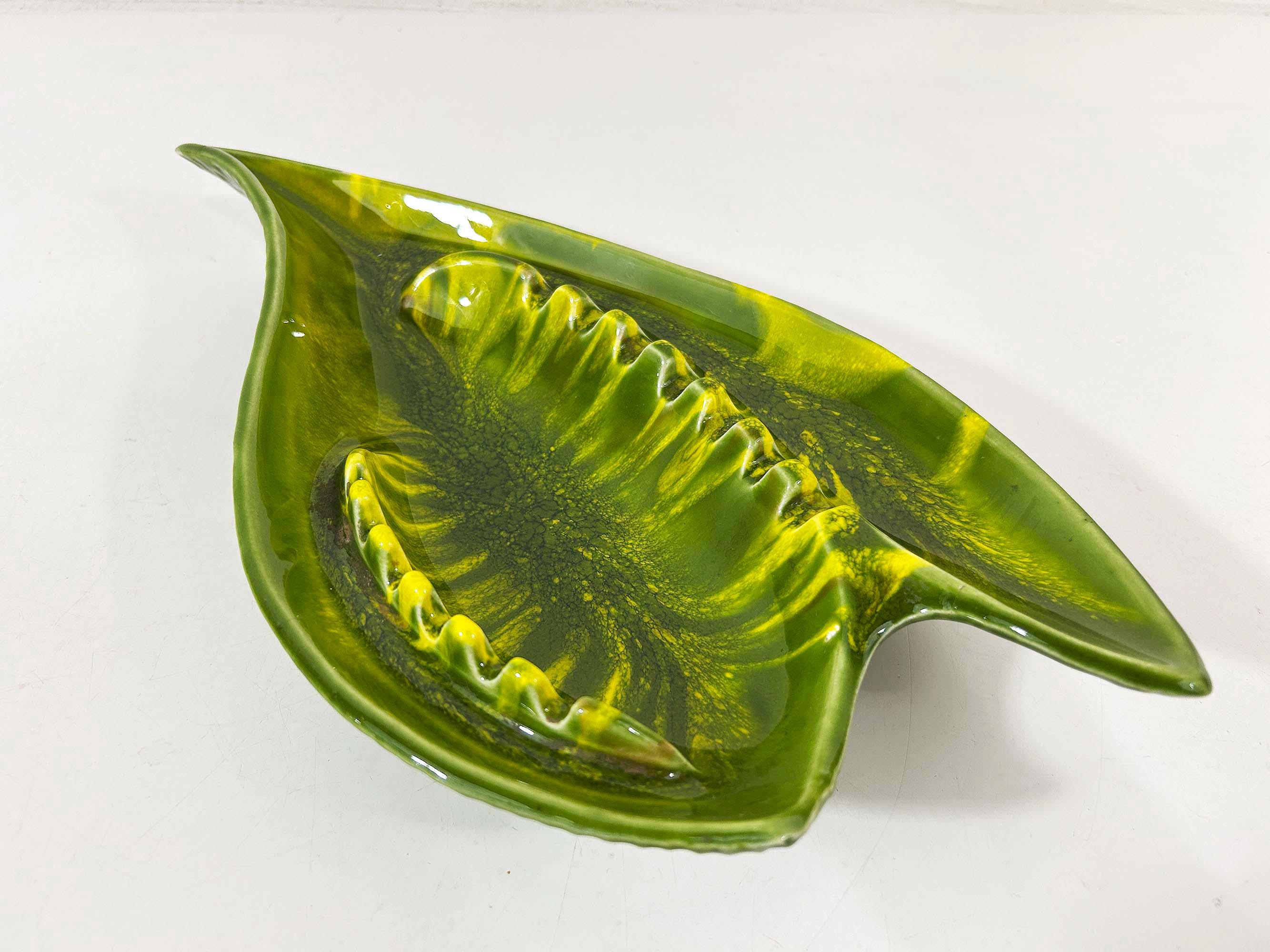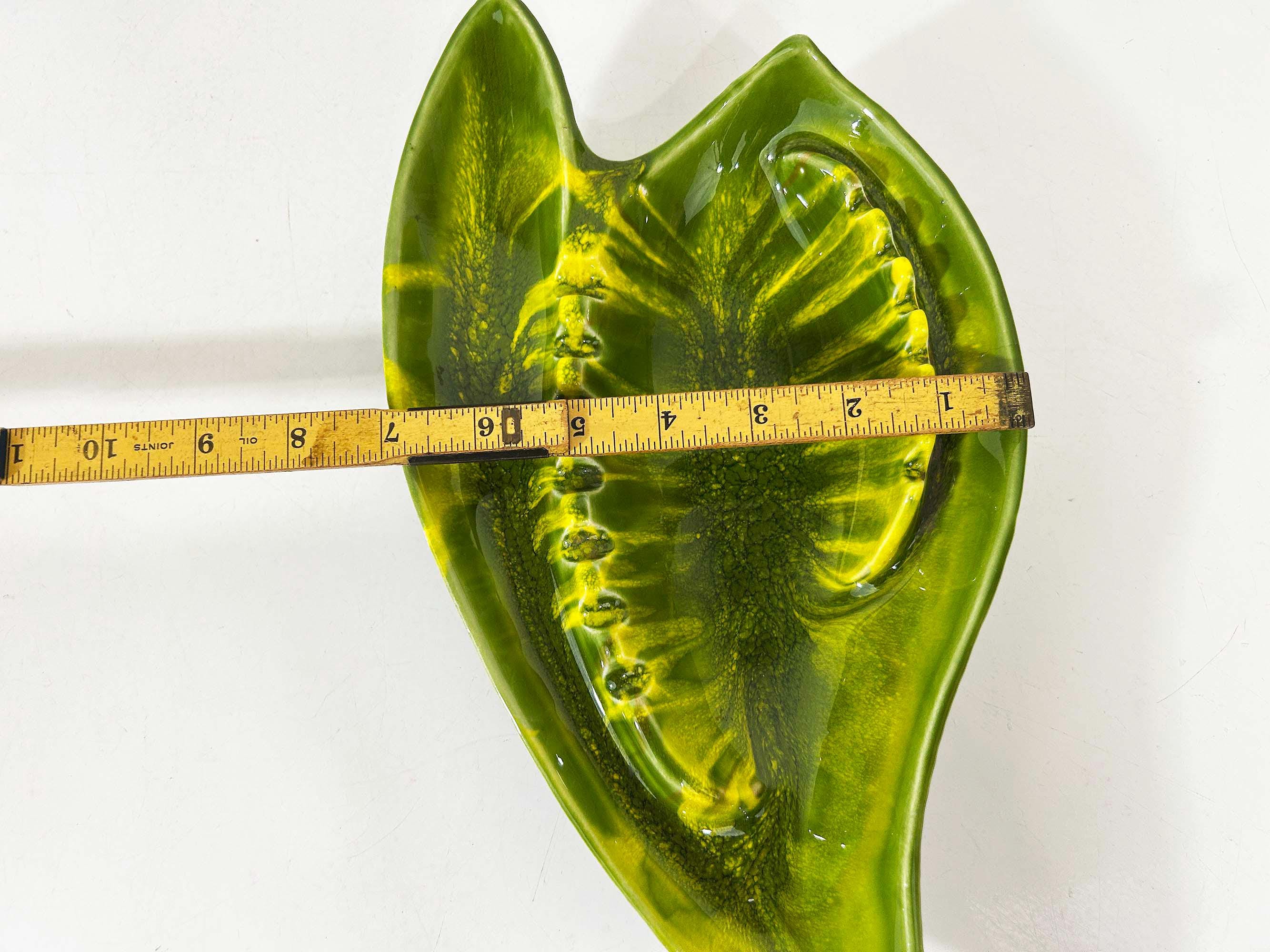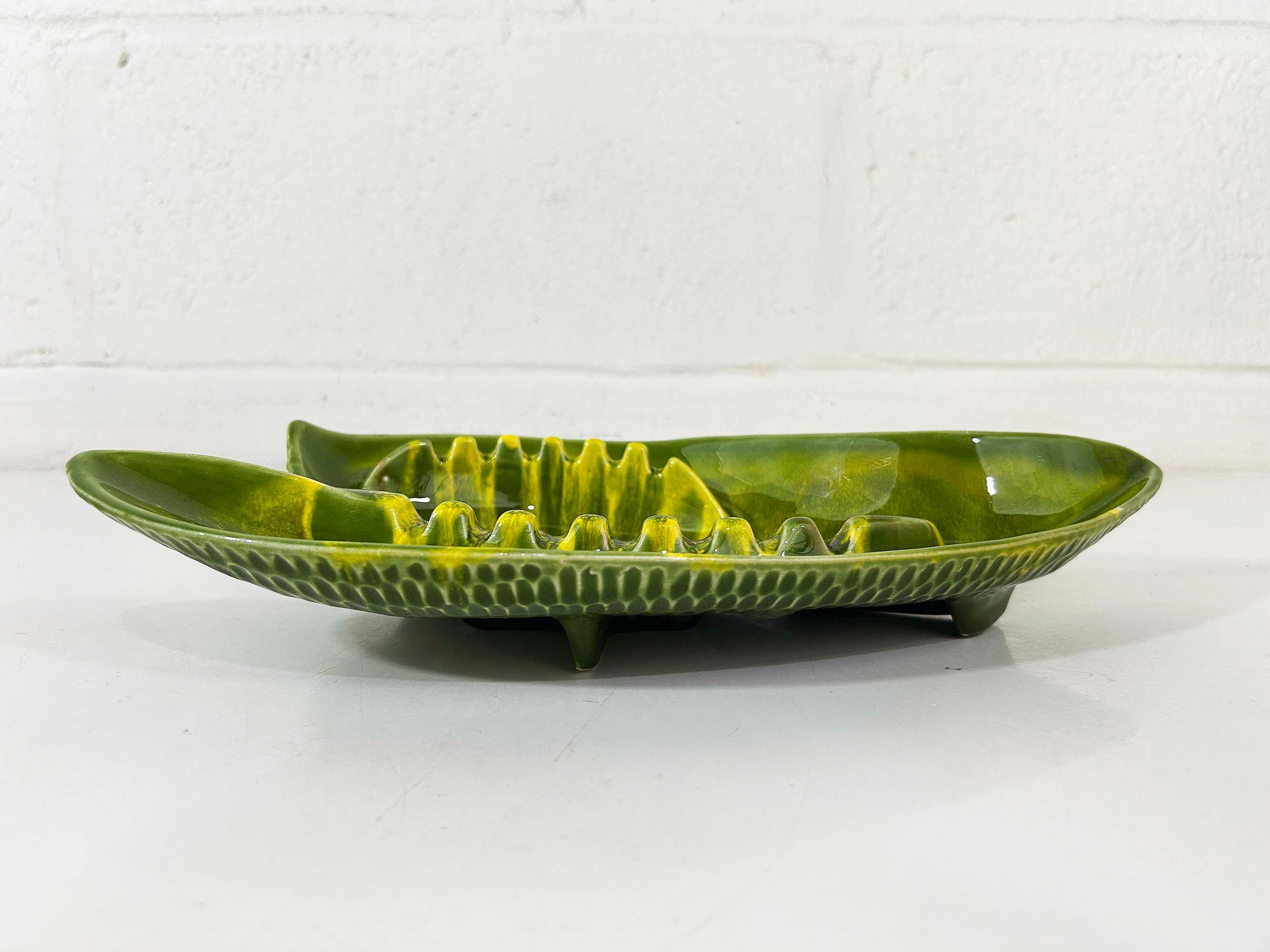 Amazing bright green atomic ashtray with drip glaze accents! If you don't smoke it can be used to decorate or hold jewelry, change or other small trinkets. It is in good vintage condition - please be sure to inspect all photos. The ashtray is about 13 inches wide, 7 inches deep, and 2 inches tall.