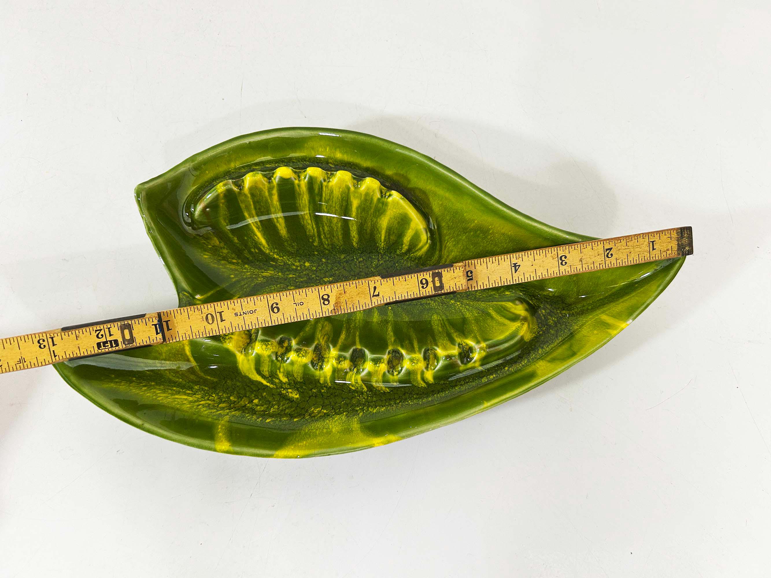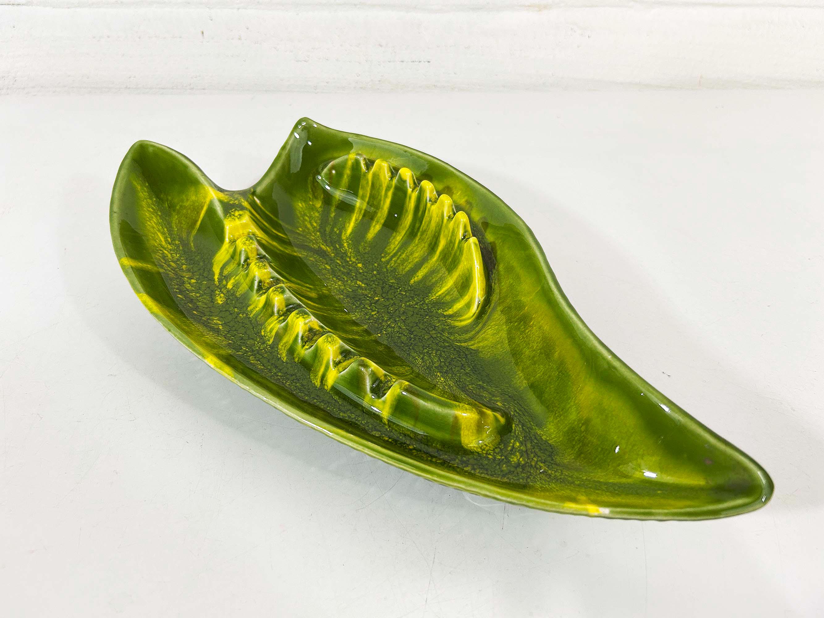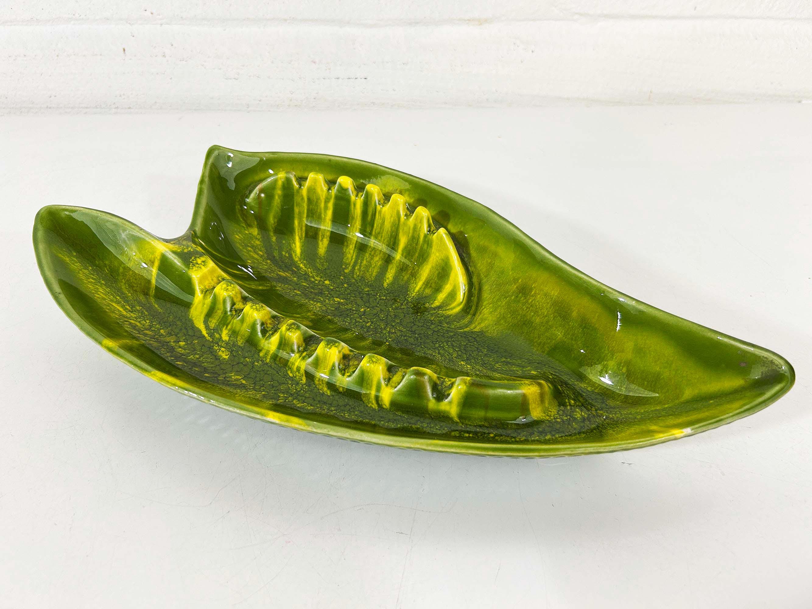 Amazing bright green atomic ashtray with drip glaze accents! If you don't smoke it can be used to decorate or hold jewelry, change or other small trinkets. It is in good vintage condition - please be sure to inspect all photos. The ashtray is about 13 inches wide, 7 inches deep, and 2 inches tall.