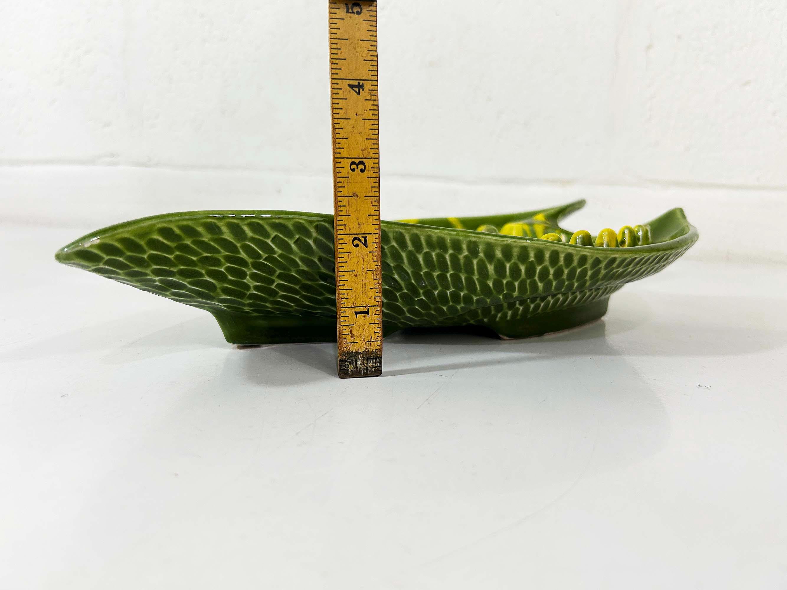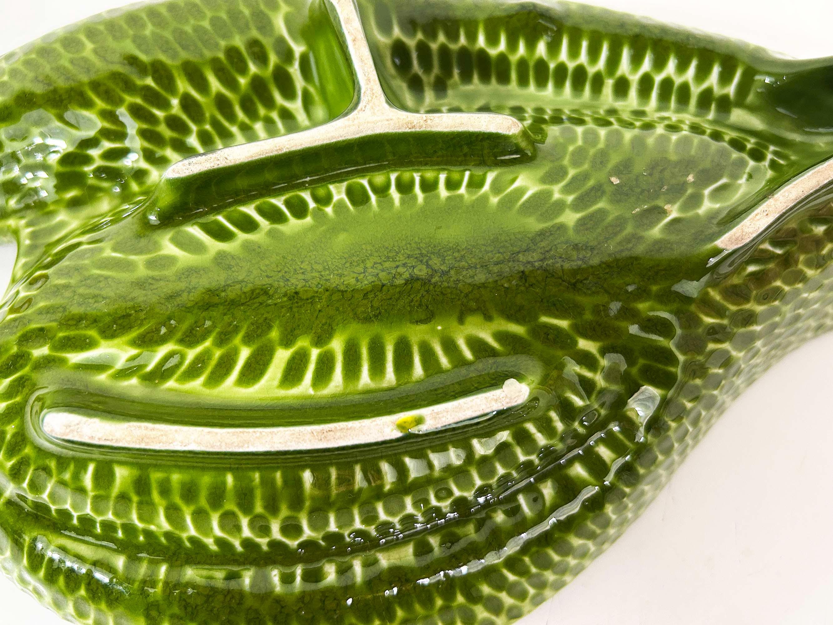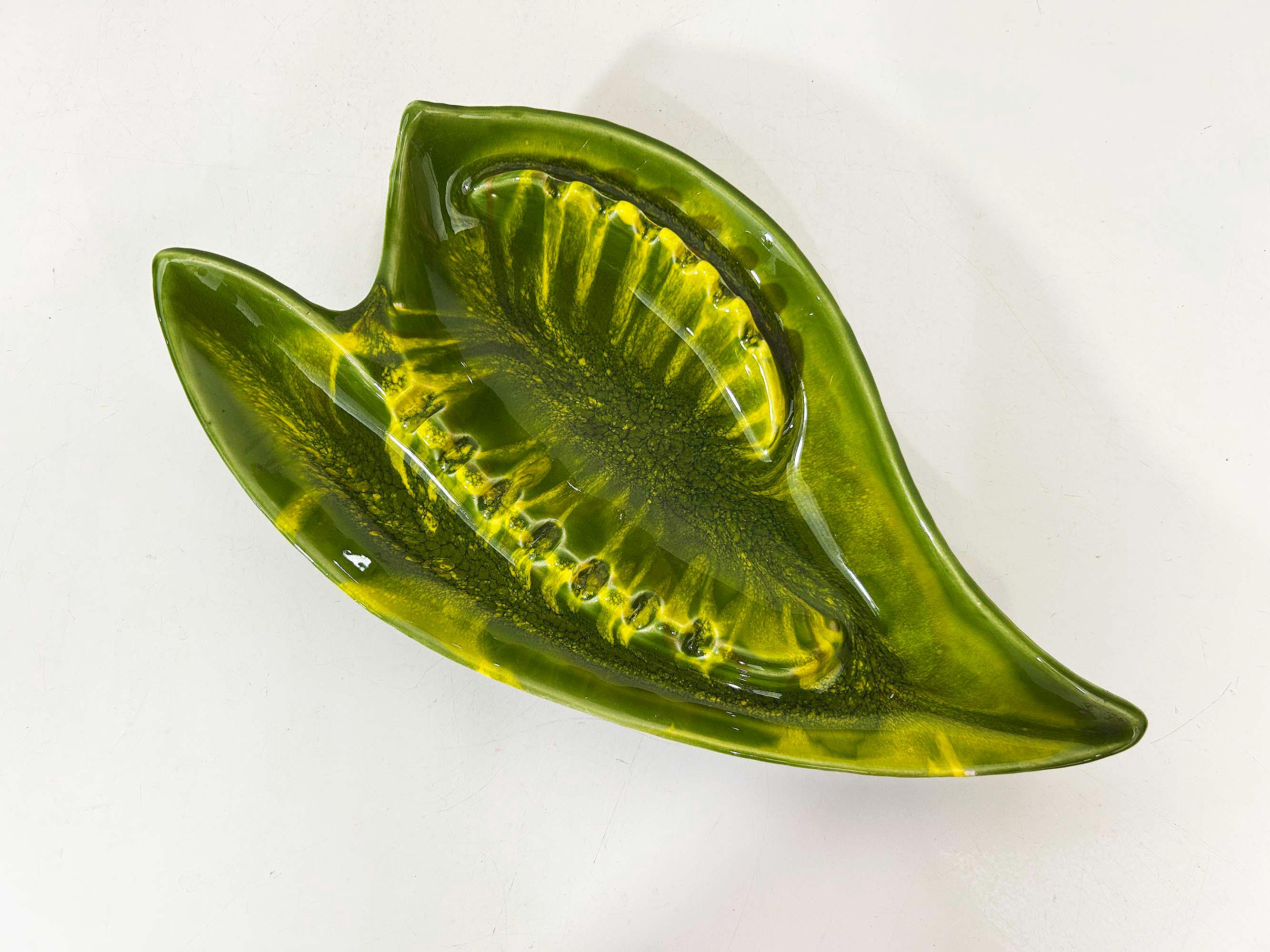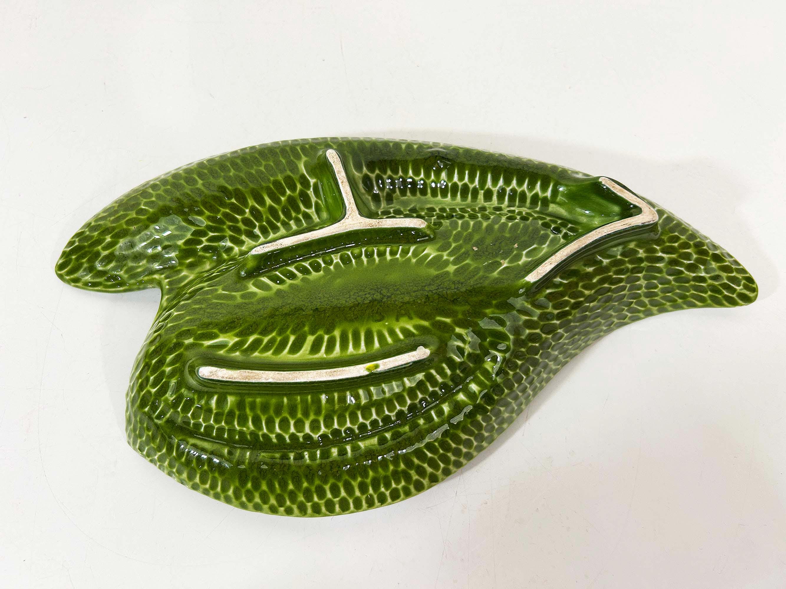 Amazing bright green atomic ashtray with drip glaze accents! If you don't smoke it can be used to decorate or hold jewelry, change or other small trinkets. It is in good vintage condition - please be sure to inspect all photos. The ashtray is about 13 inches wide, 7 inches deep, and 2 inches tall.