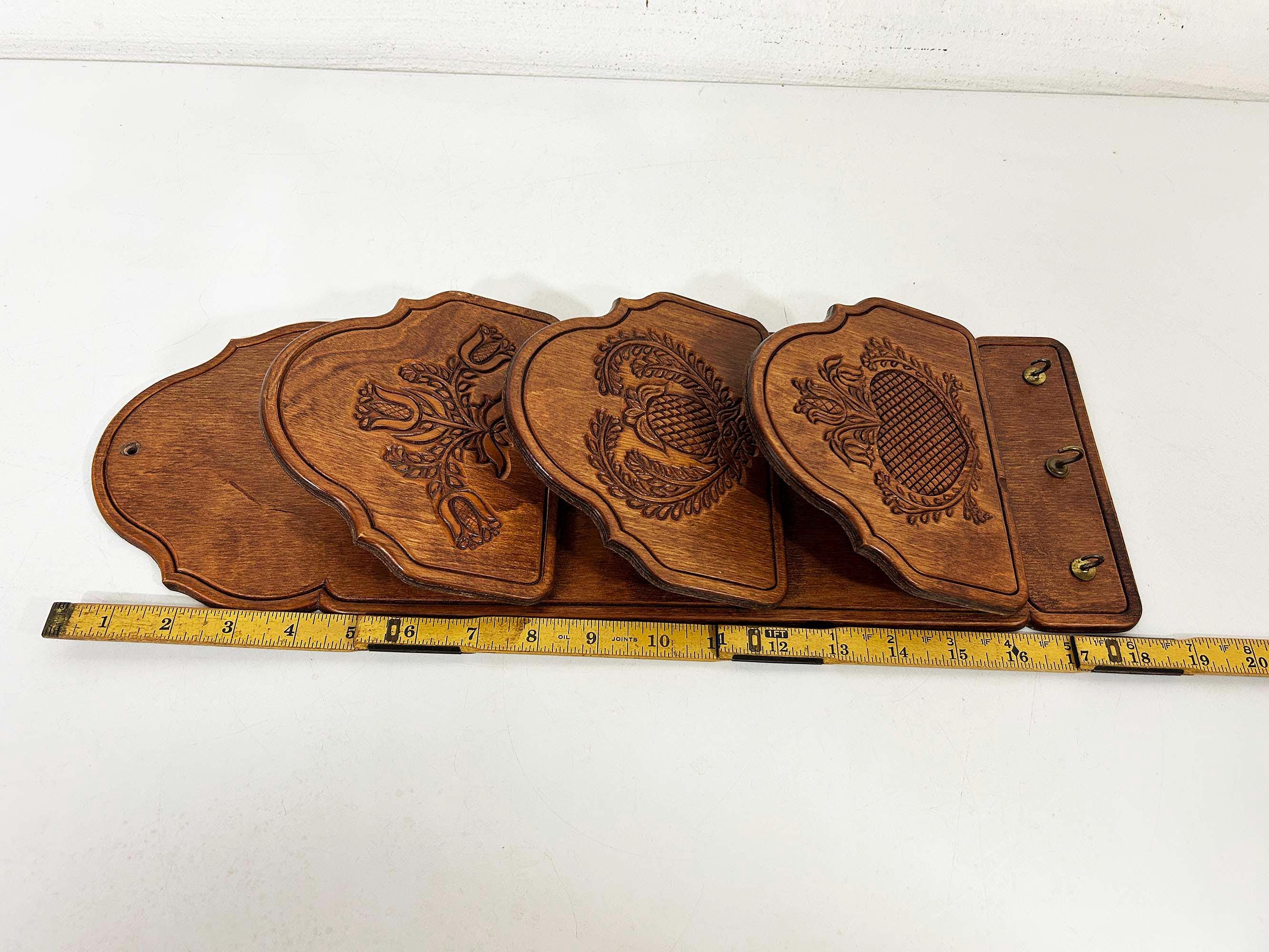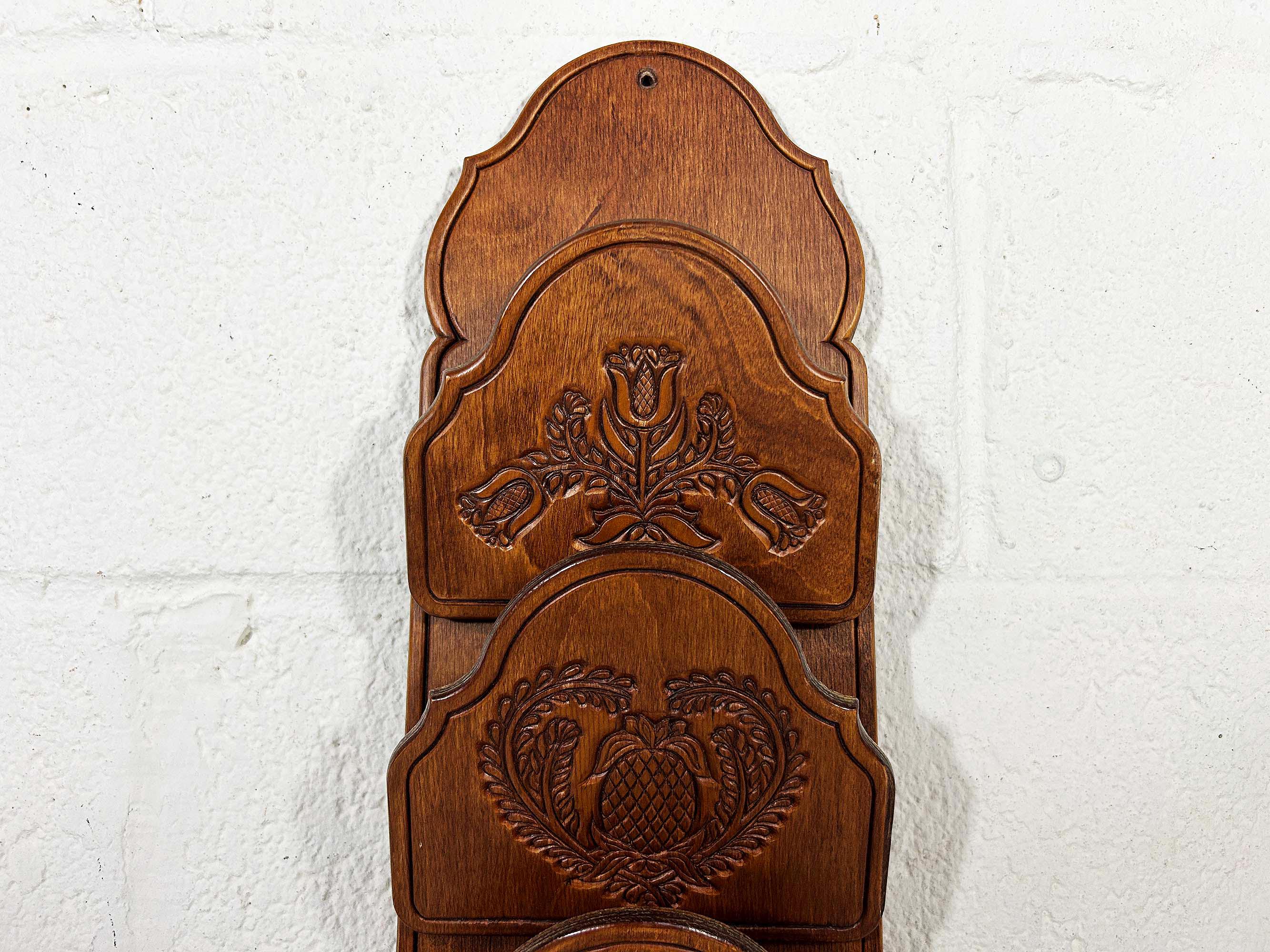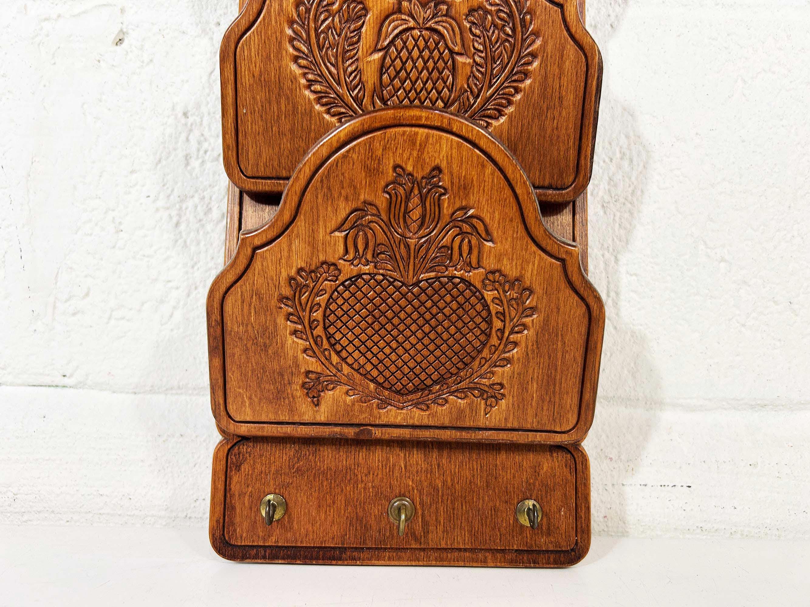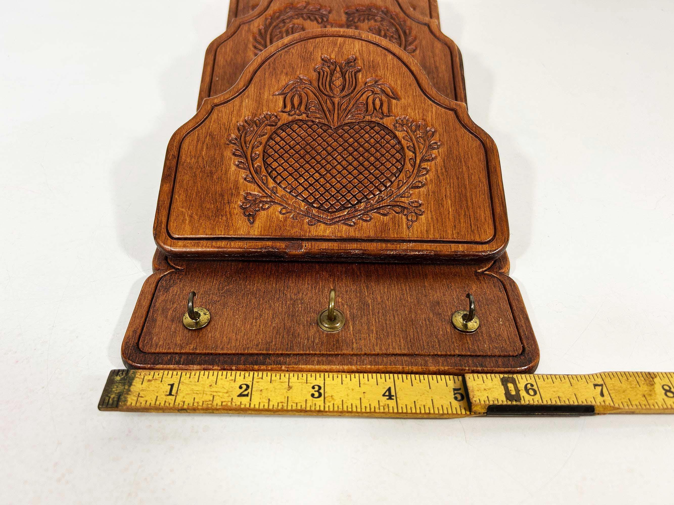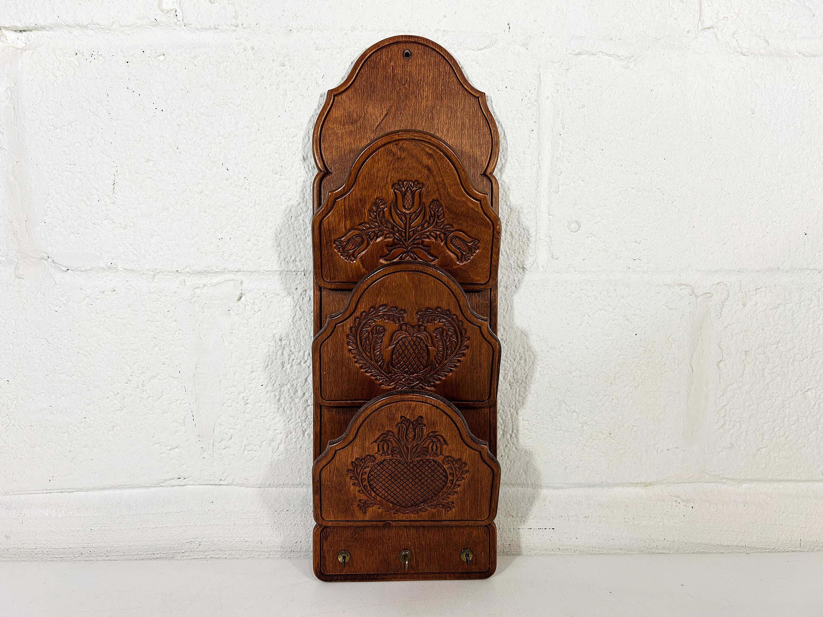 Super handy mail organizer. Great for storing and organizing bills and mail! In great vintage condition with a few dings and scratches here and there. The organizer measures about 18 inches tall, 6 inches wide, and 2 1/4 inches deep where each slot is.