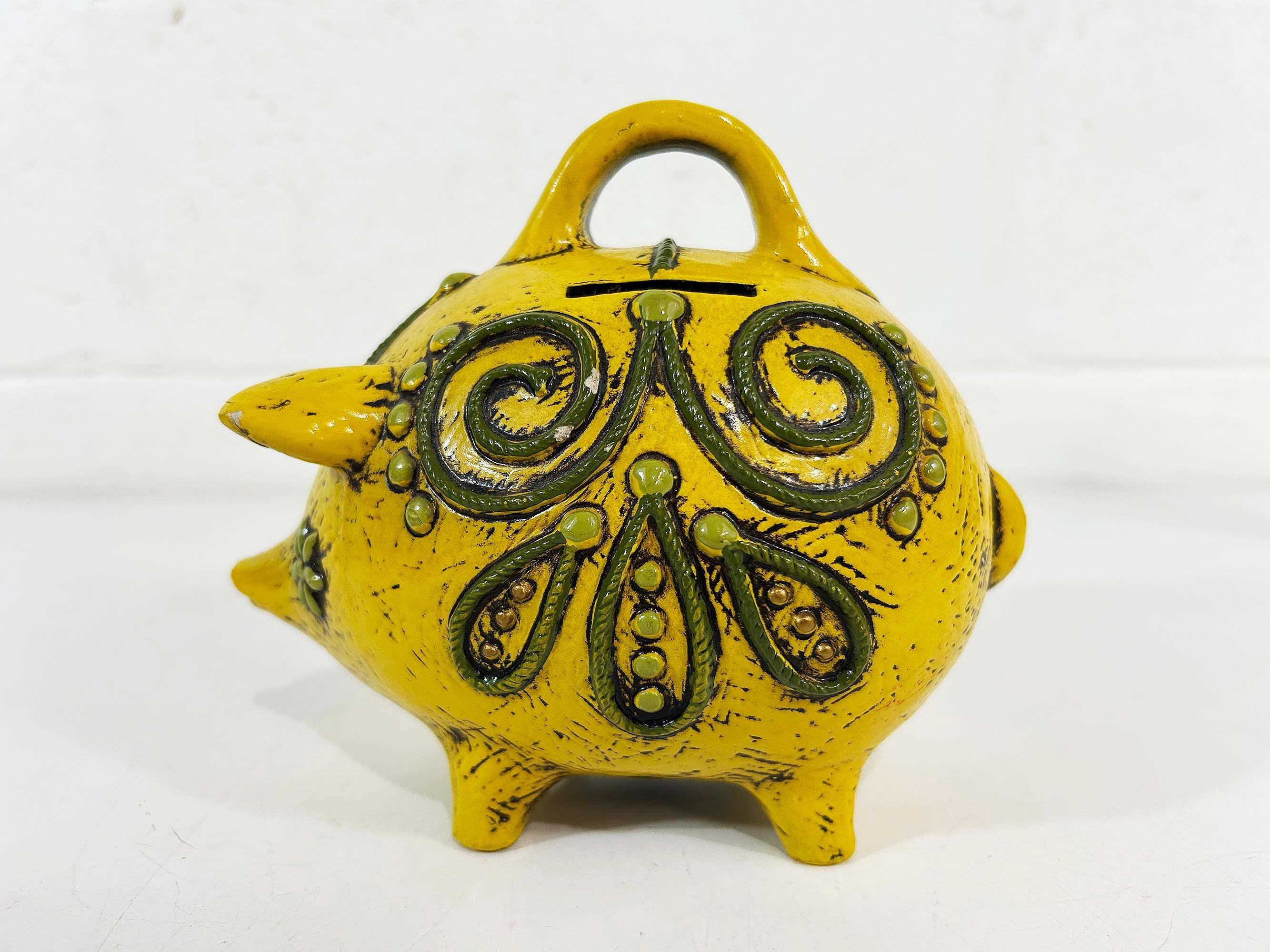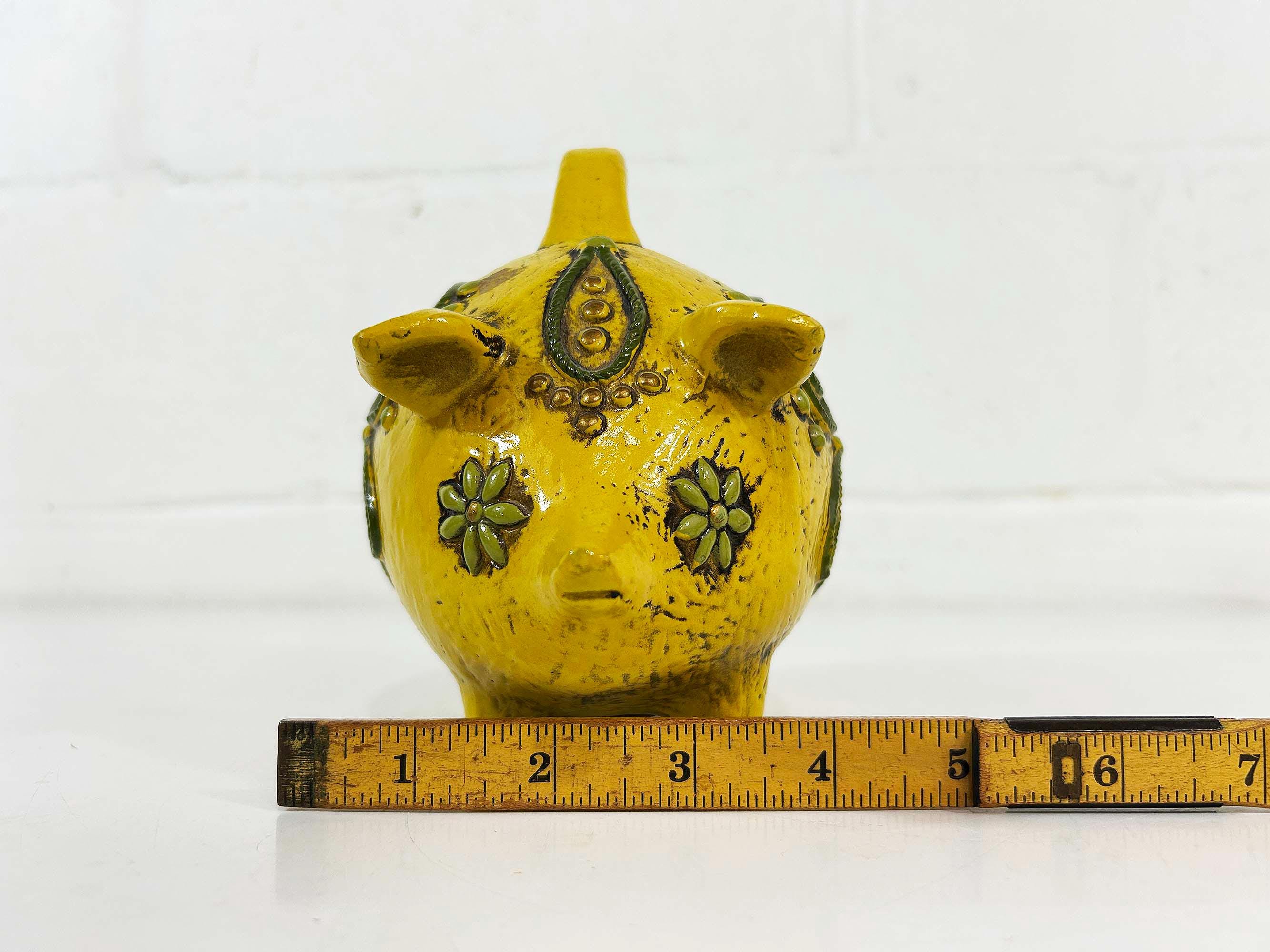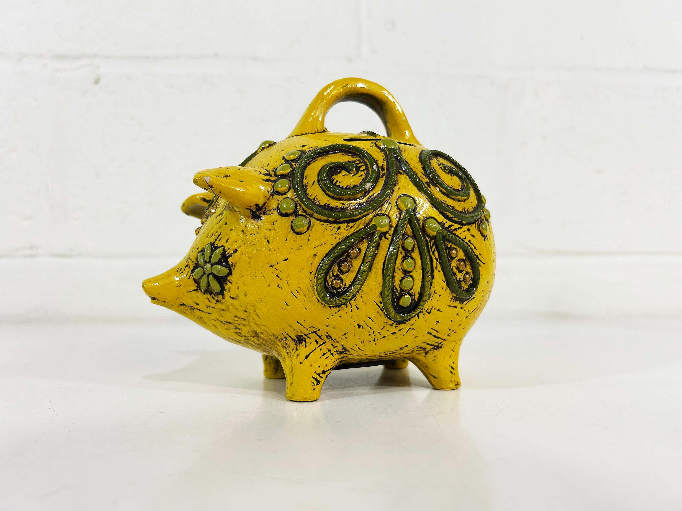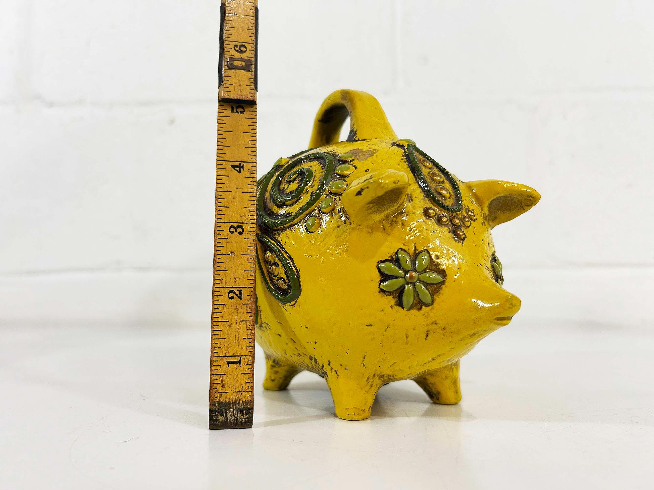 Adorable piggy bank with the cutest flower power design. It has some chips - please be sure to inspect all photos. Otherwise in great condition and would look so cute on a shelf! The piggy bank is approximately 6 inches wide, 5 1/2 inches tall and 4 inches deep.