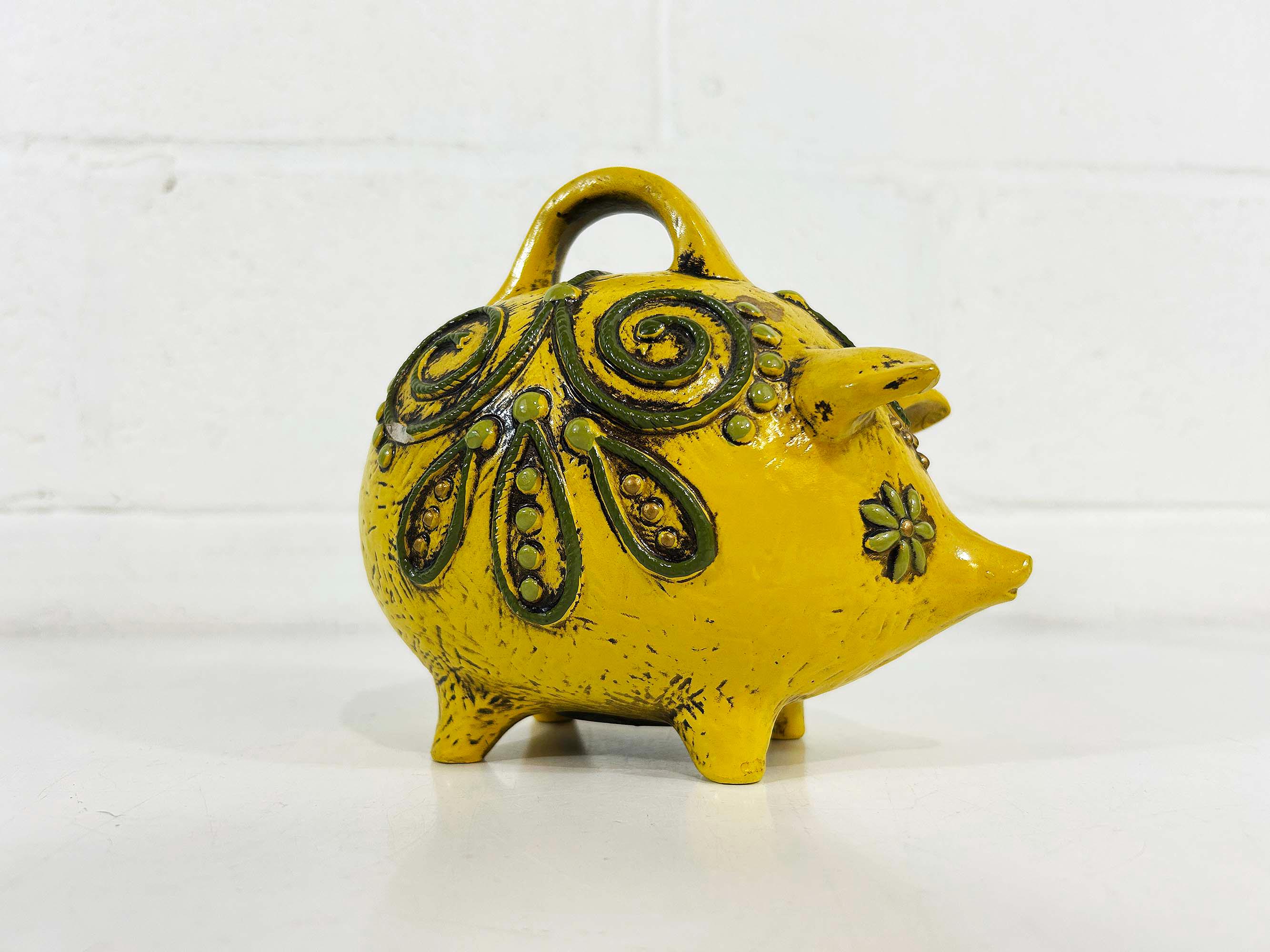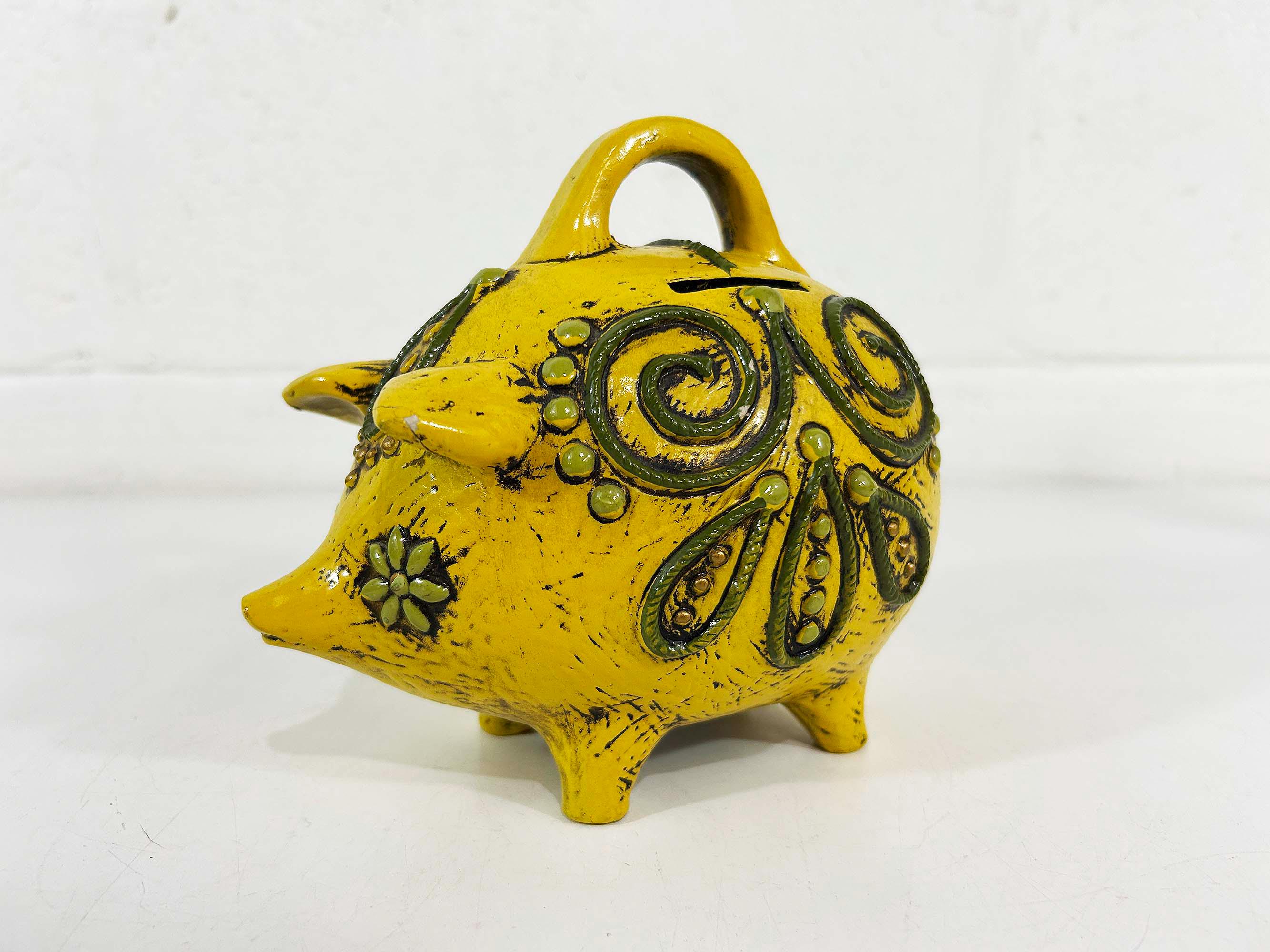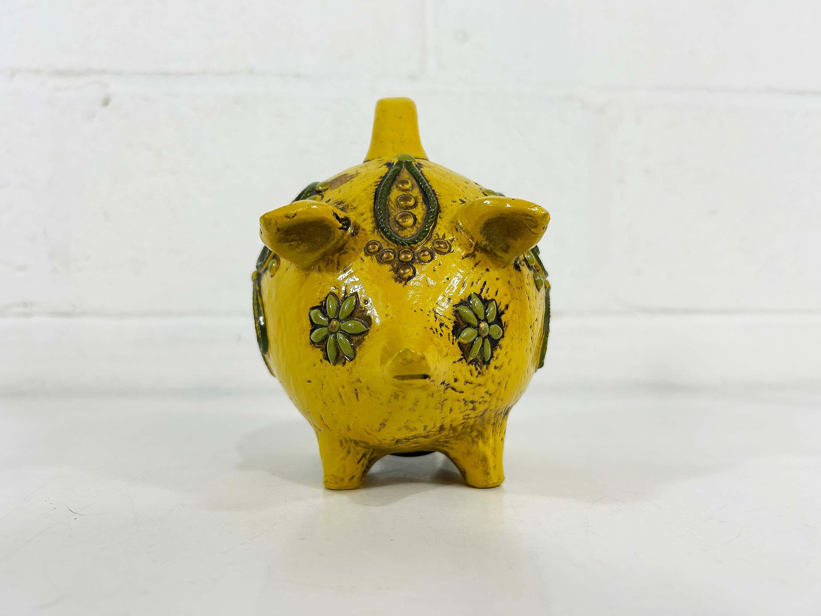 Adorable piggy bank with the cutest flower power design. It has some chips - please be sure to inspect all photos. Otherwise in great condition and would look so cute on a shelf! The piggy bank is approximately 6 inches wide, 5 1/2 inches tall and 4 inches deep.