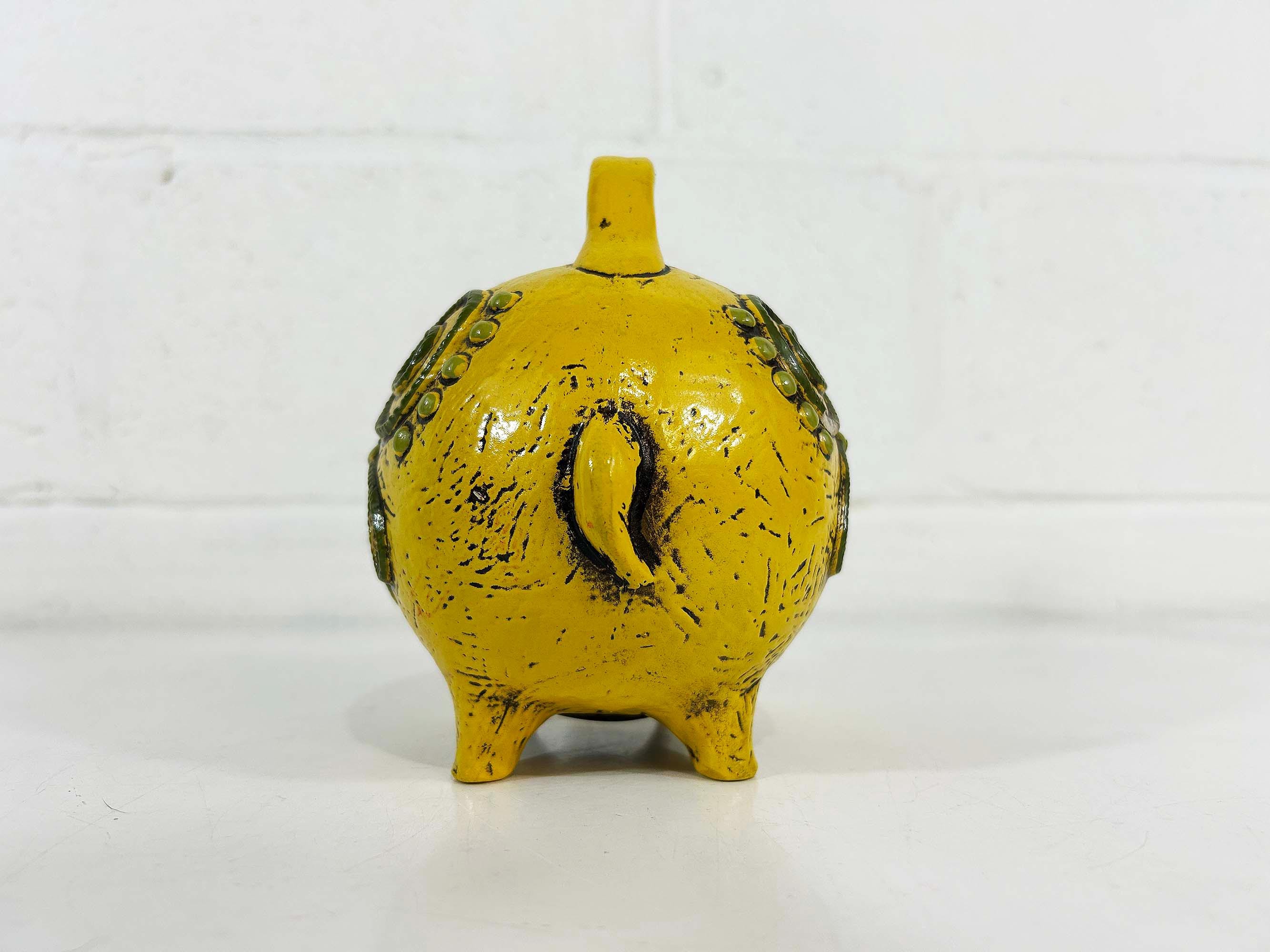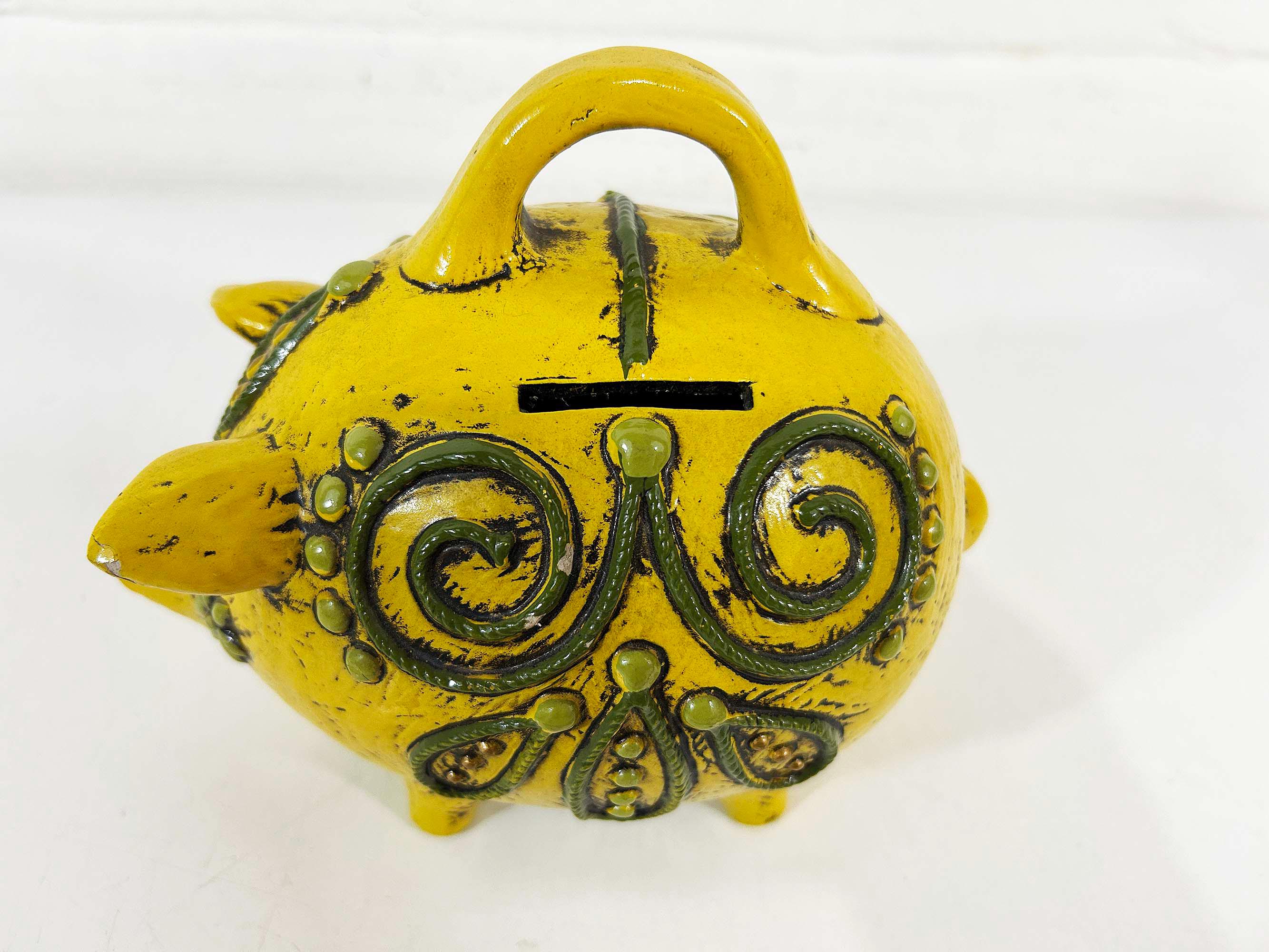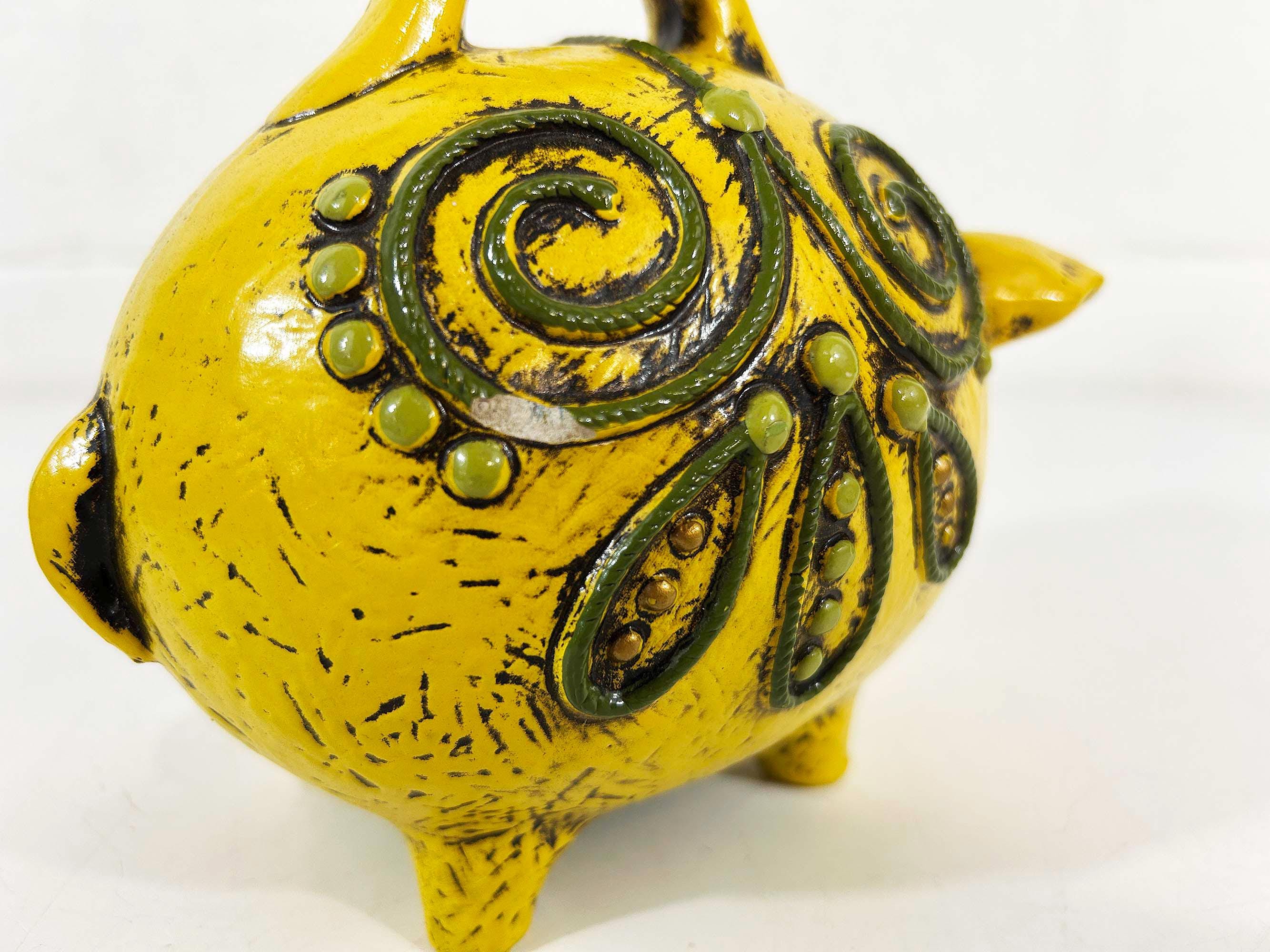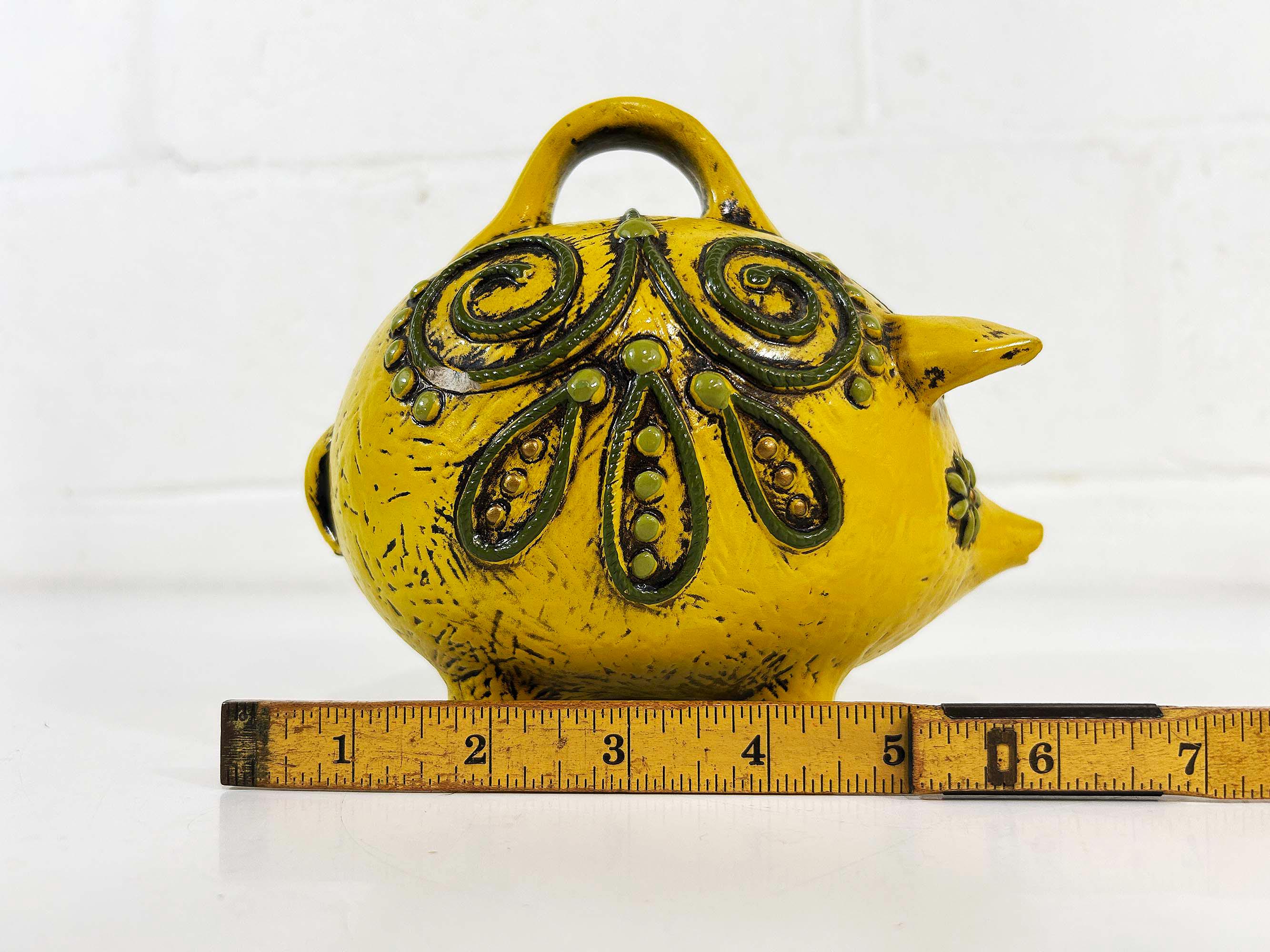 Adorable piggy bank with the cutest flower power design. It has some chips - please be sure to inspect all photos. Otherwise in great condition and would look so cute on a shelf! The piggy bank is approximately 6 inches wide, 5 1/2 inches tall and 4 inches deep.