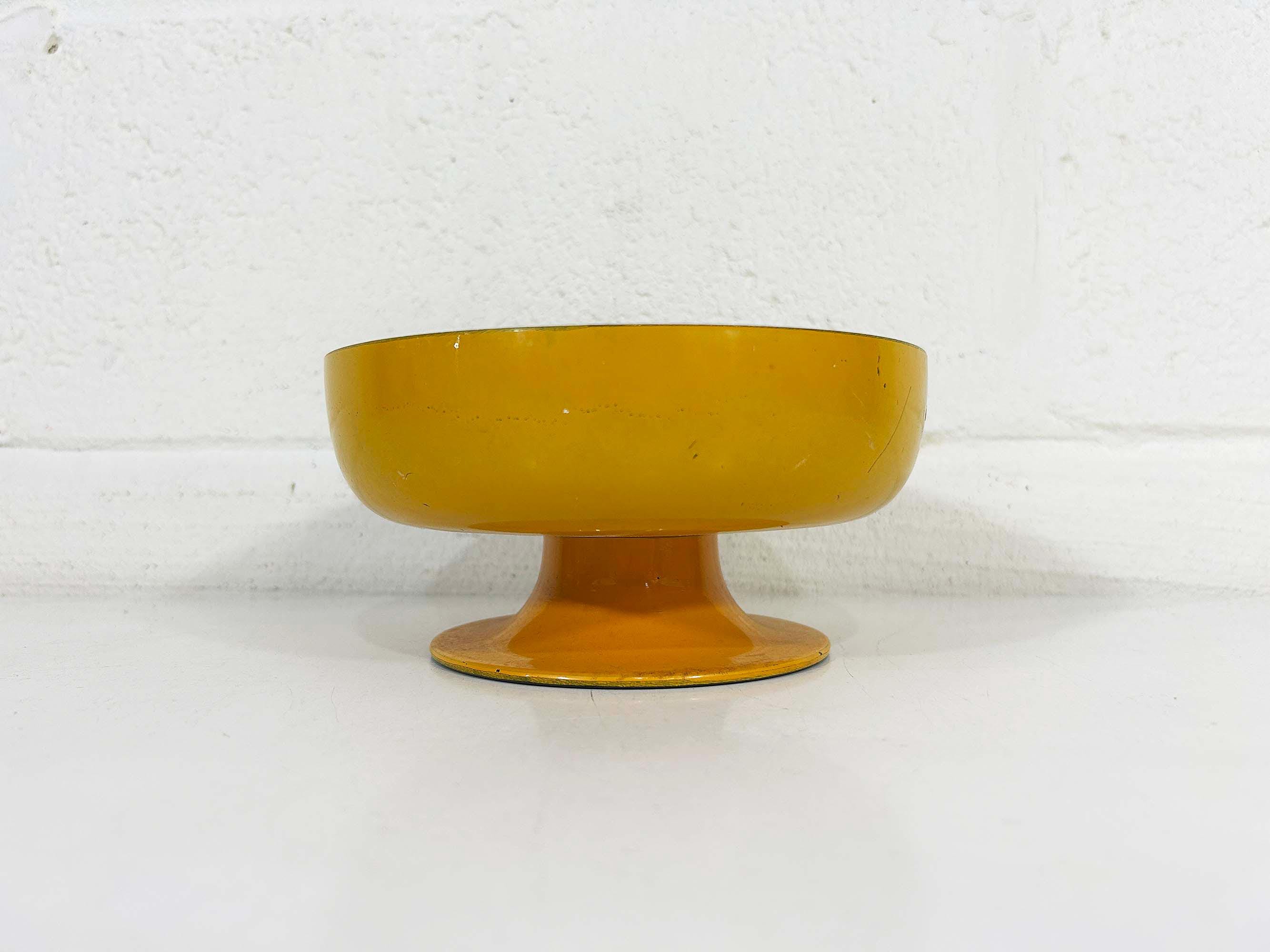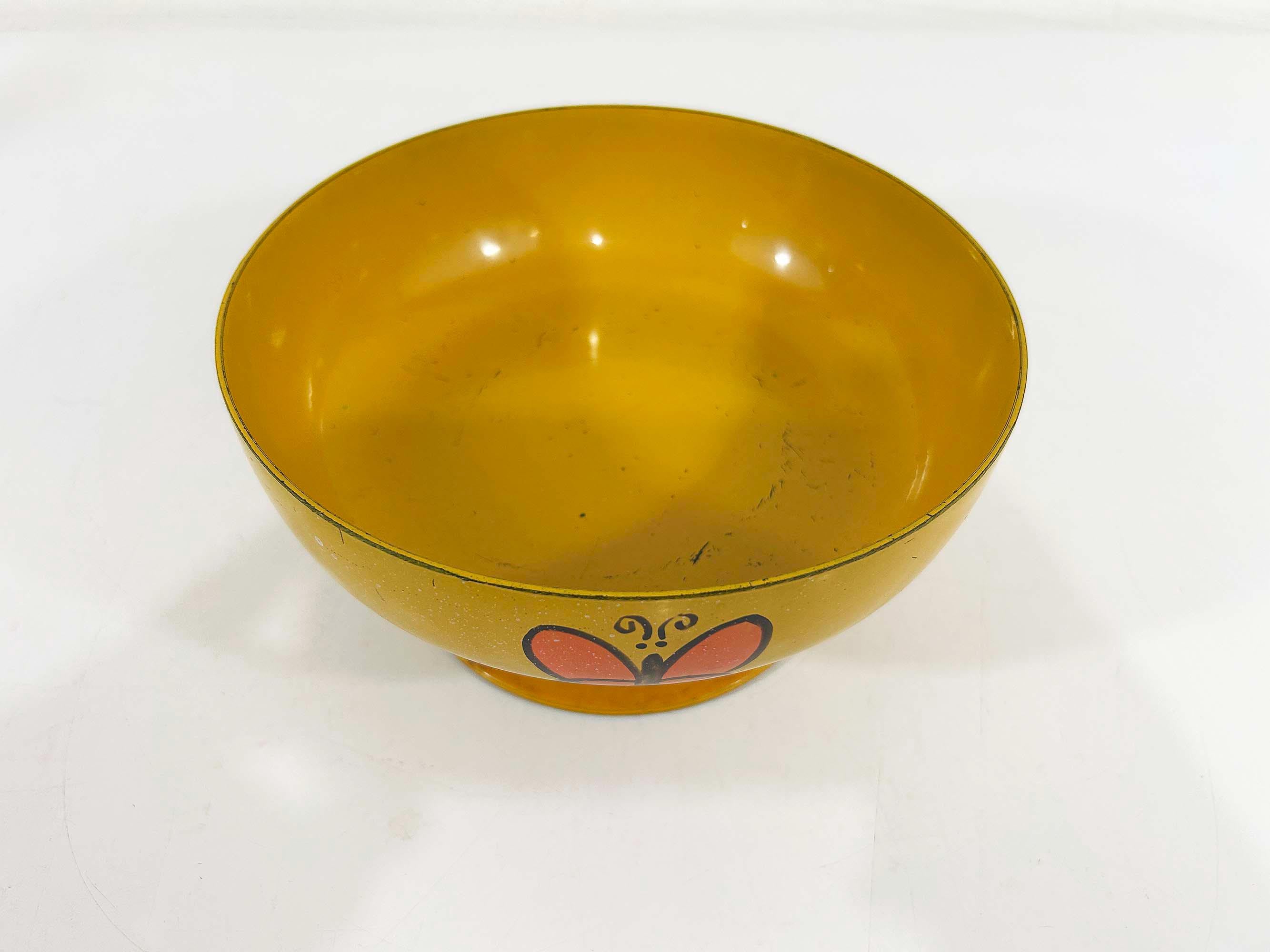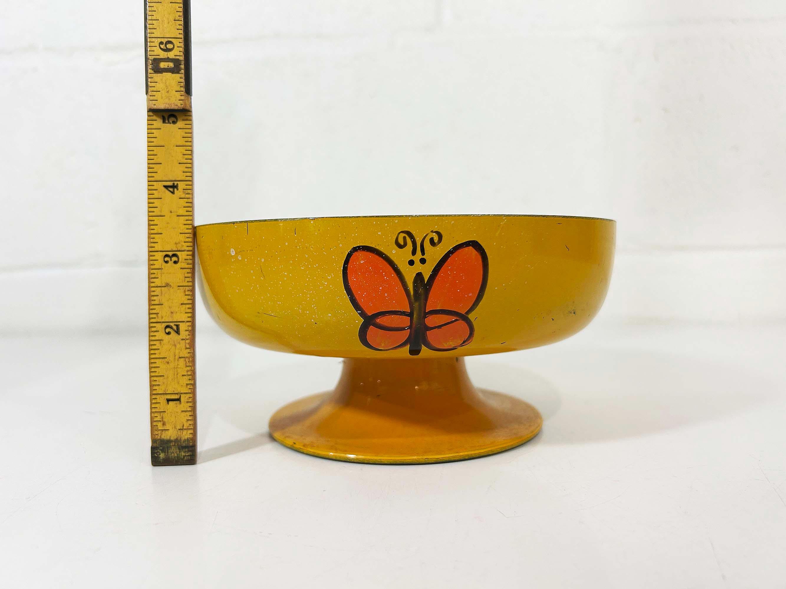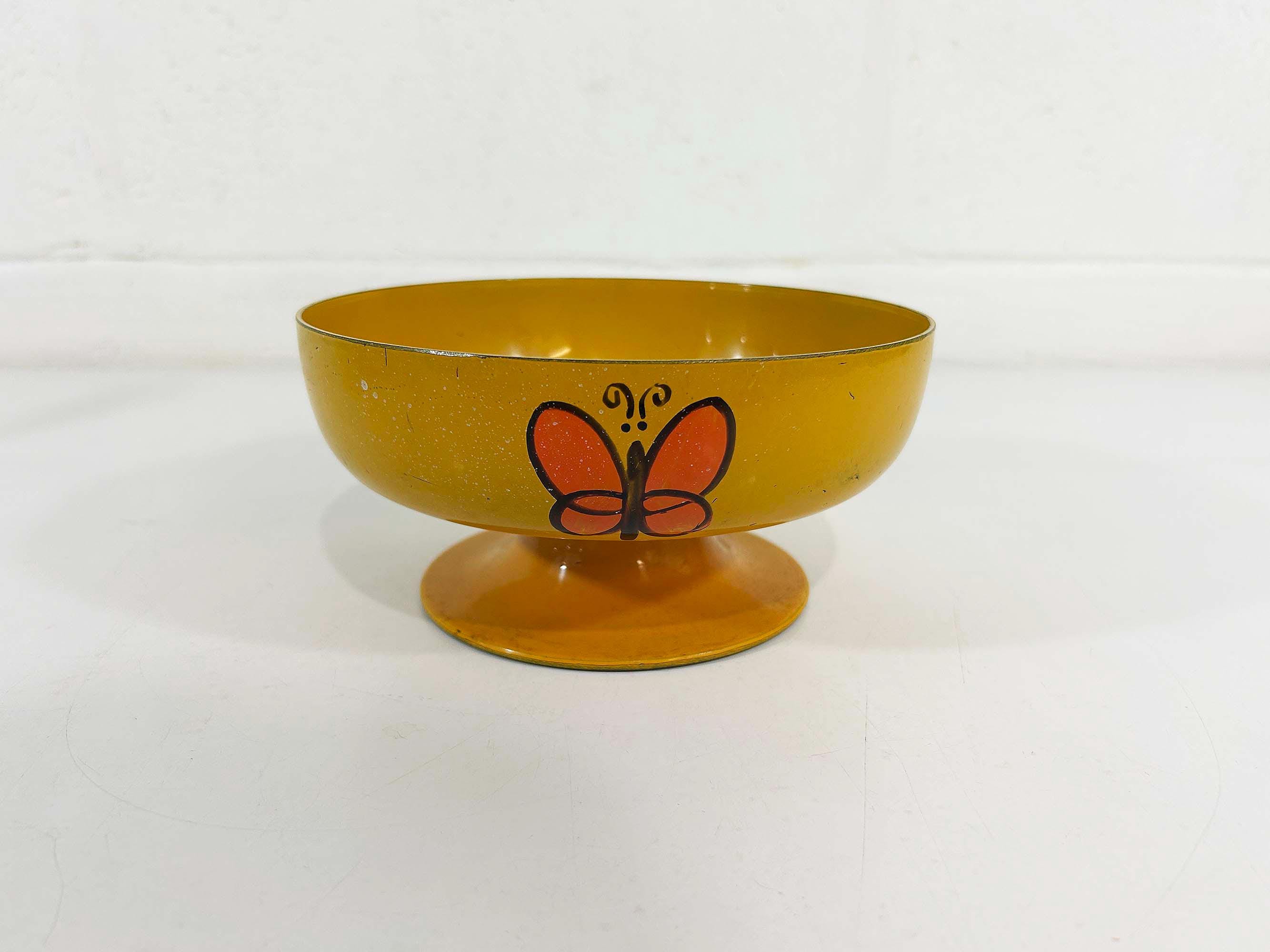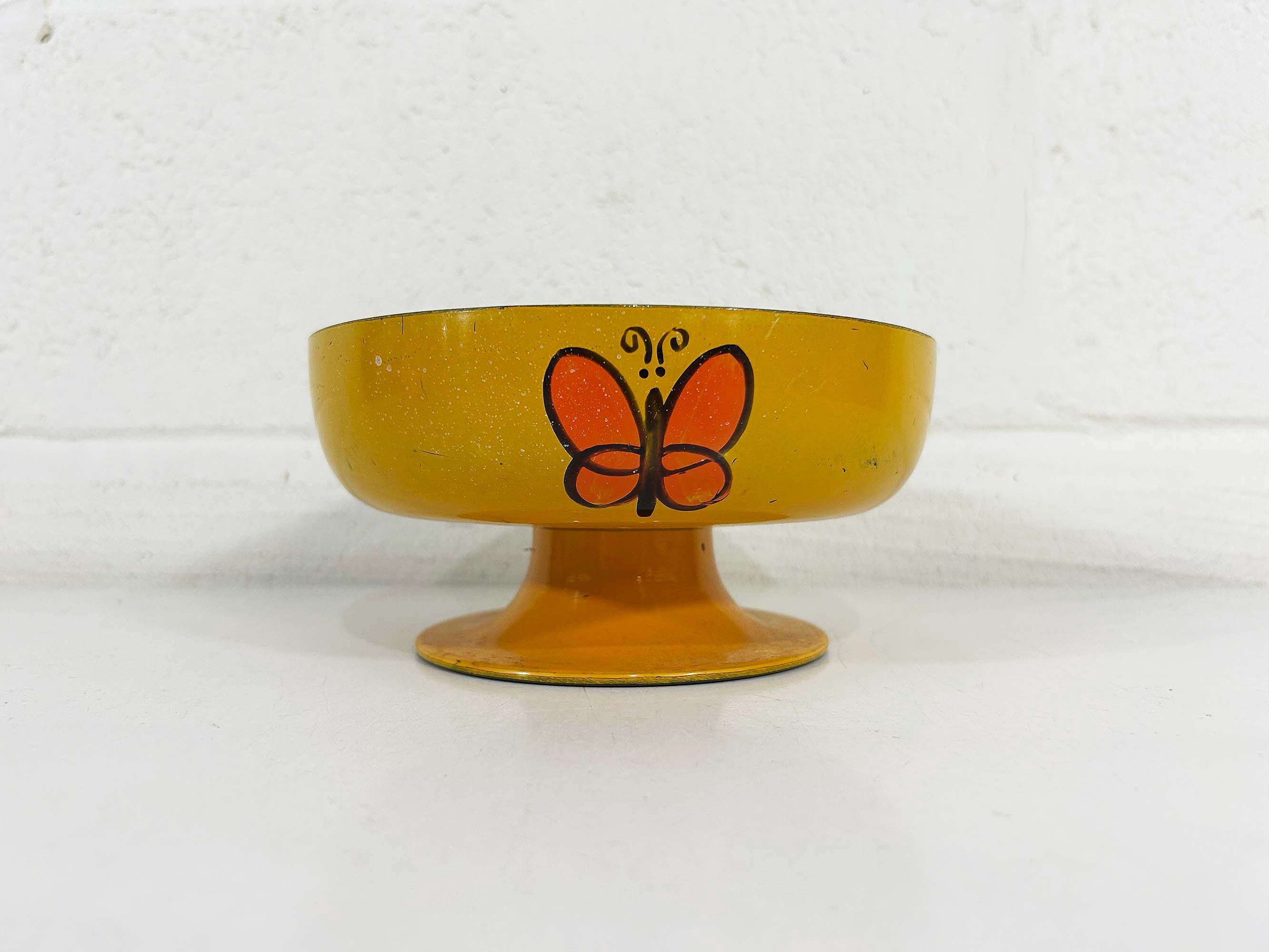 Super cute plastic yellow and orange butterfly pedestal bowl. A perfect addition to your retro home. It is in good vintage condition with a couple of light scratches and scuffs- please be sure to inspect all photos. The bowl is 6 3/4 inches in diameter and 3 1/2 inches tall.