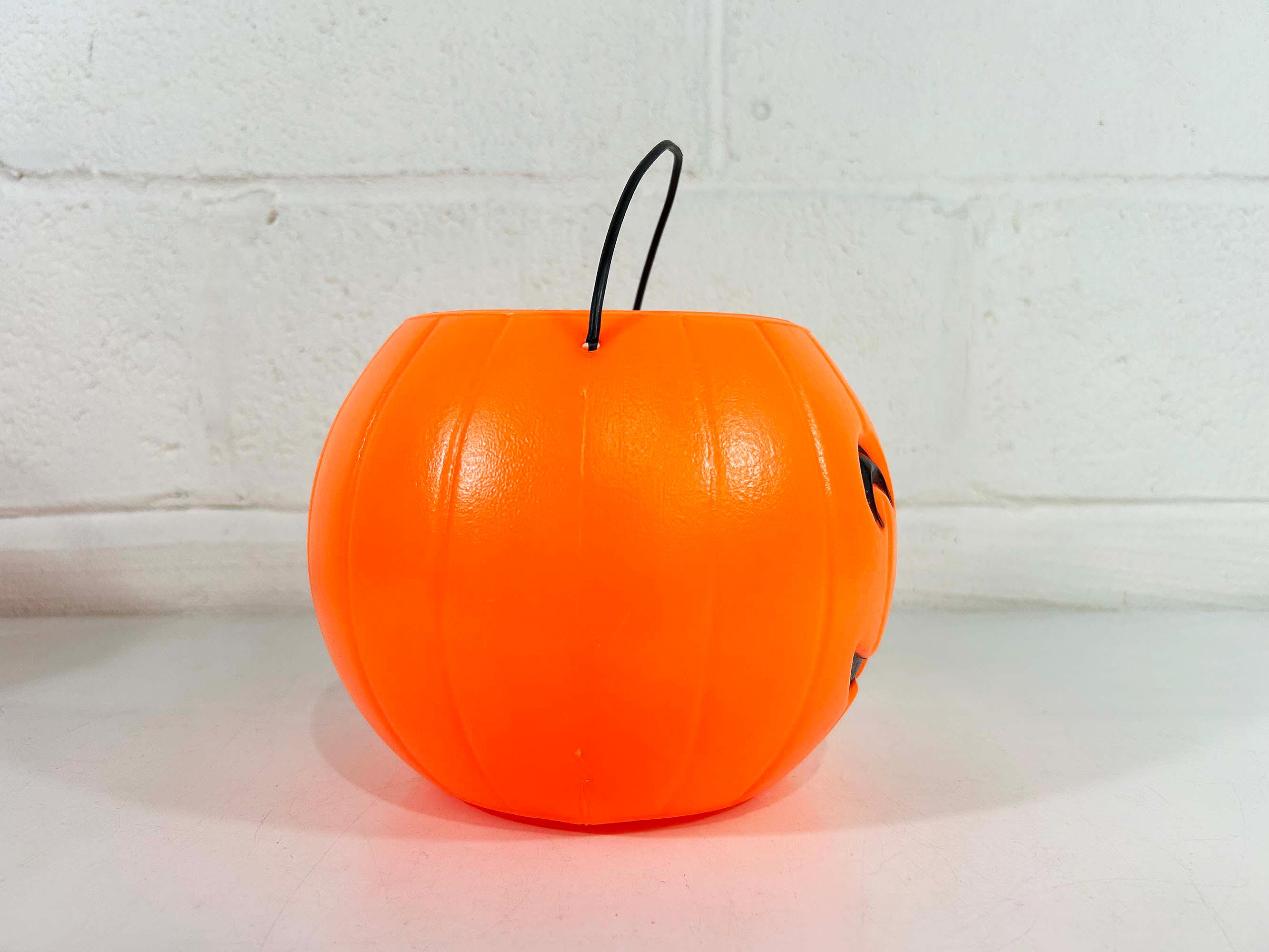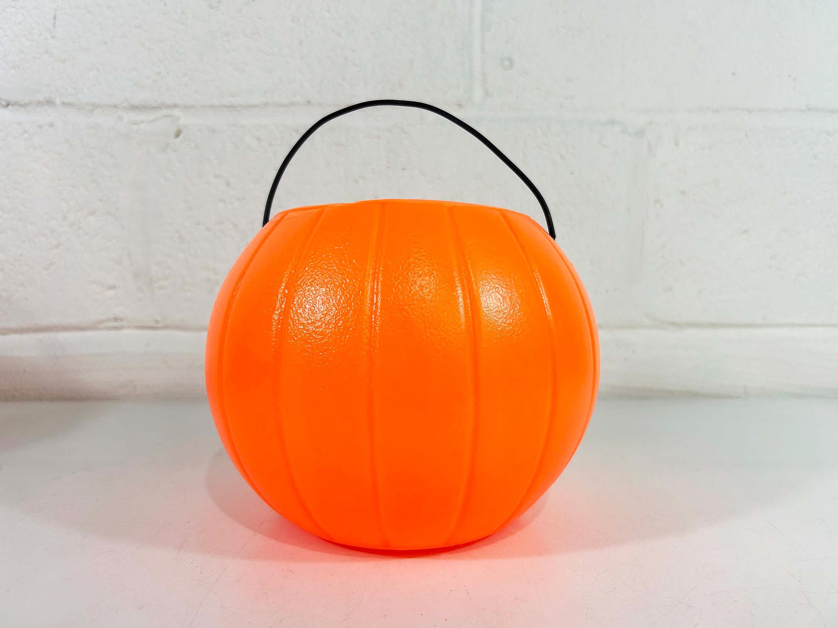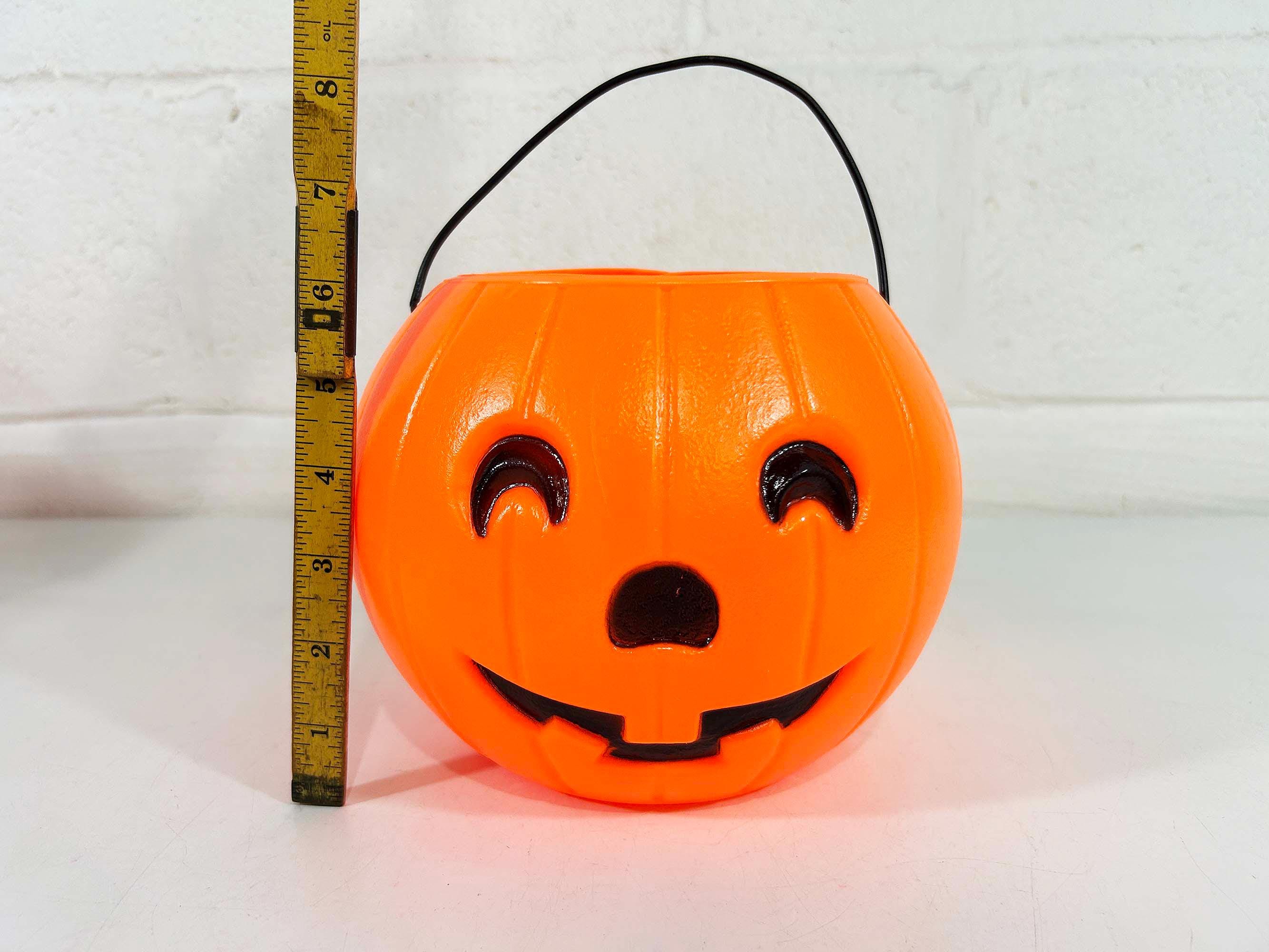 Super cool vintage Halloween pumpkin bucket! It is in good vintage condition with some scuffs and scratches. There is a crack along the rim of the opening - please be sure to inspect all photos closely. Perfect for collecting or handing out candy on Halloween night! The pumpkin is 6 inches tall and 4 3/4 inches in diameter at the opening. It is dated 1985 on the base!