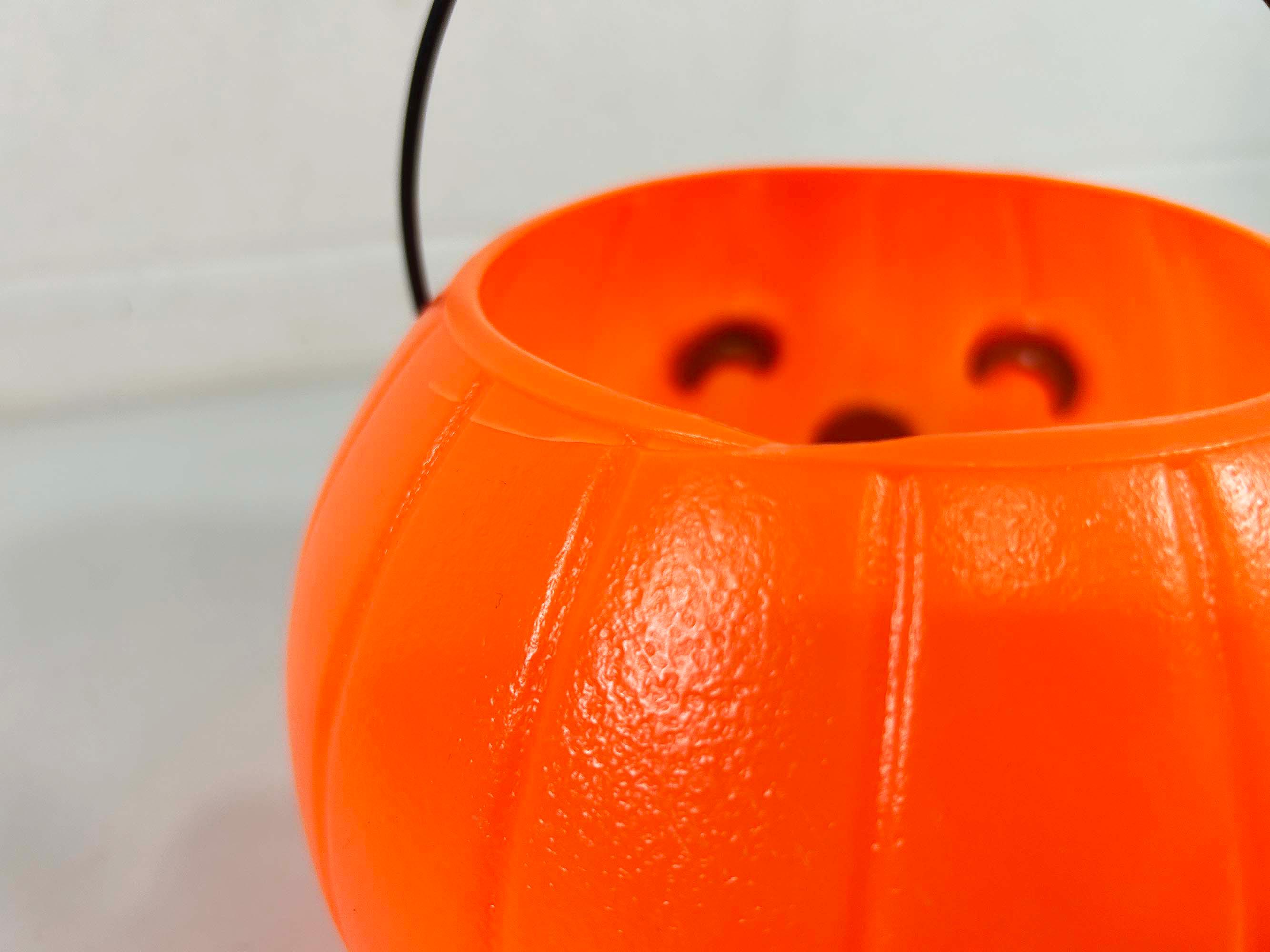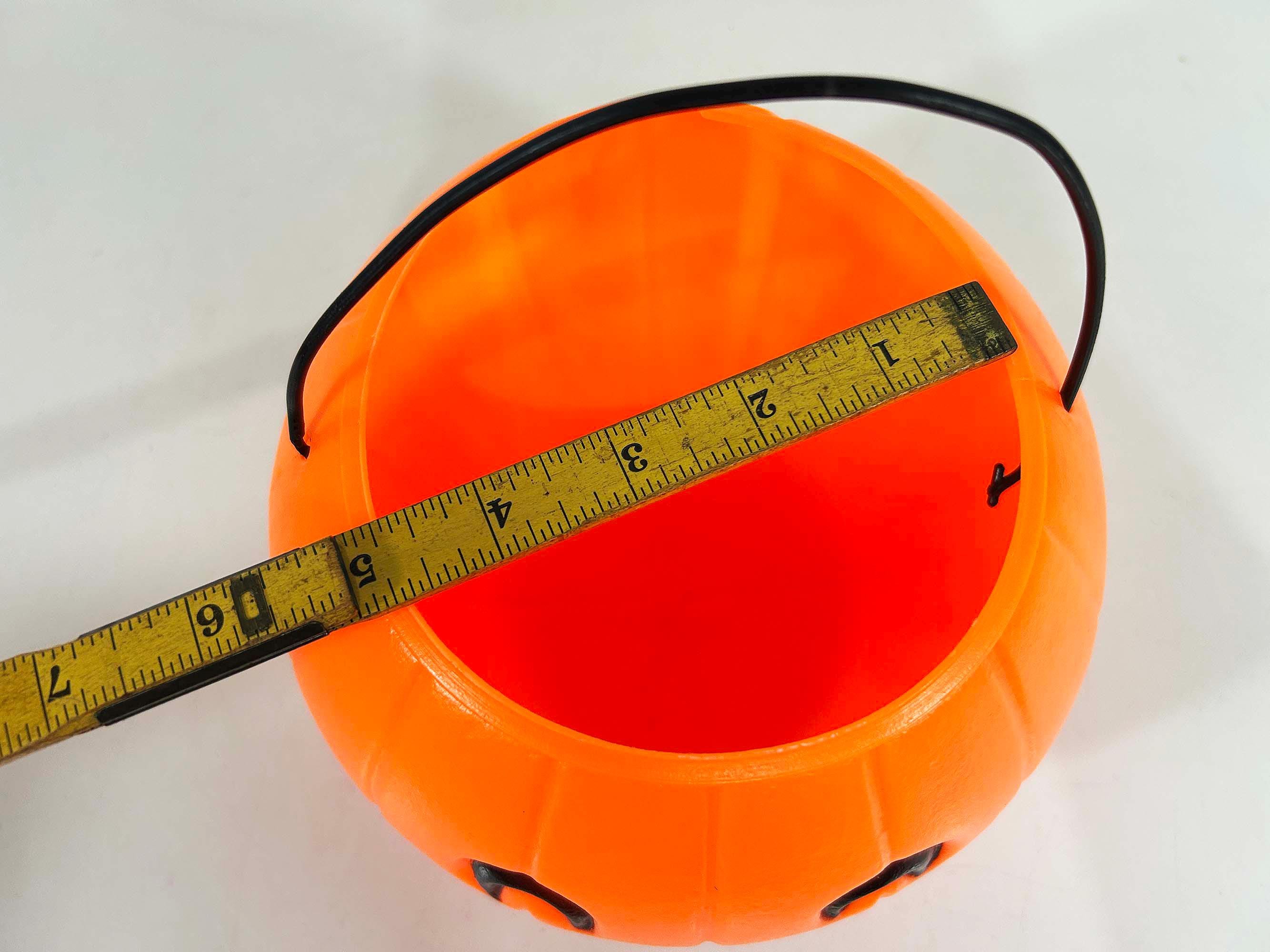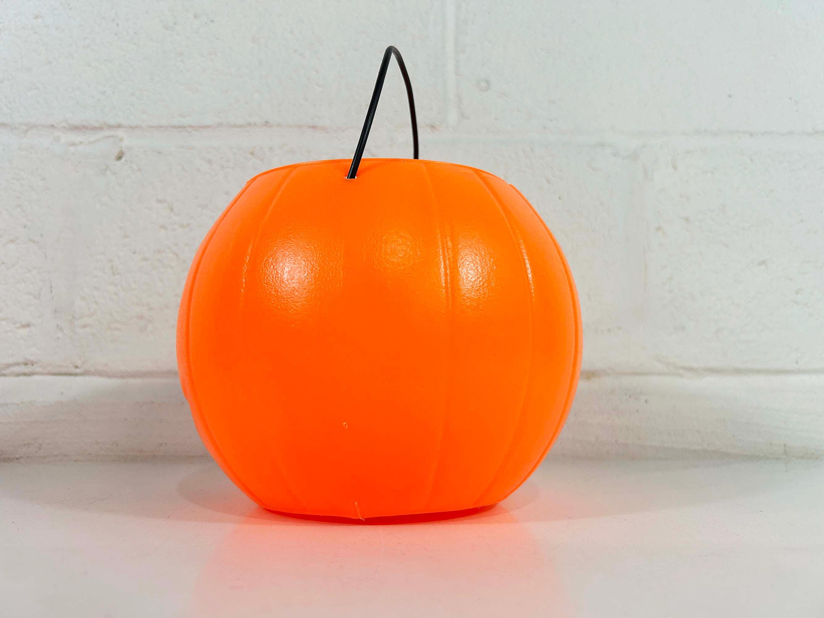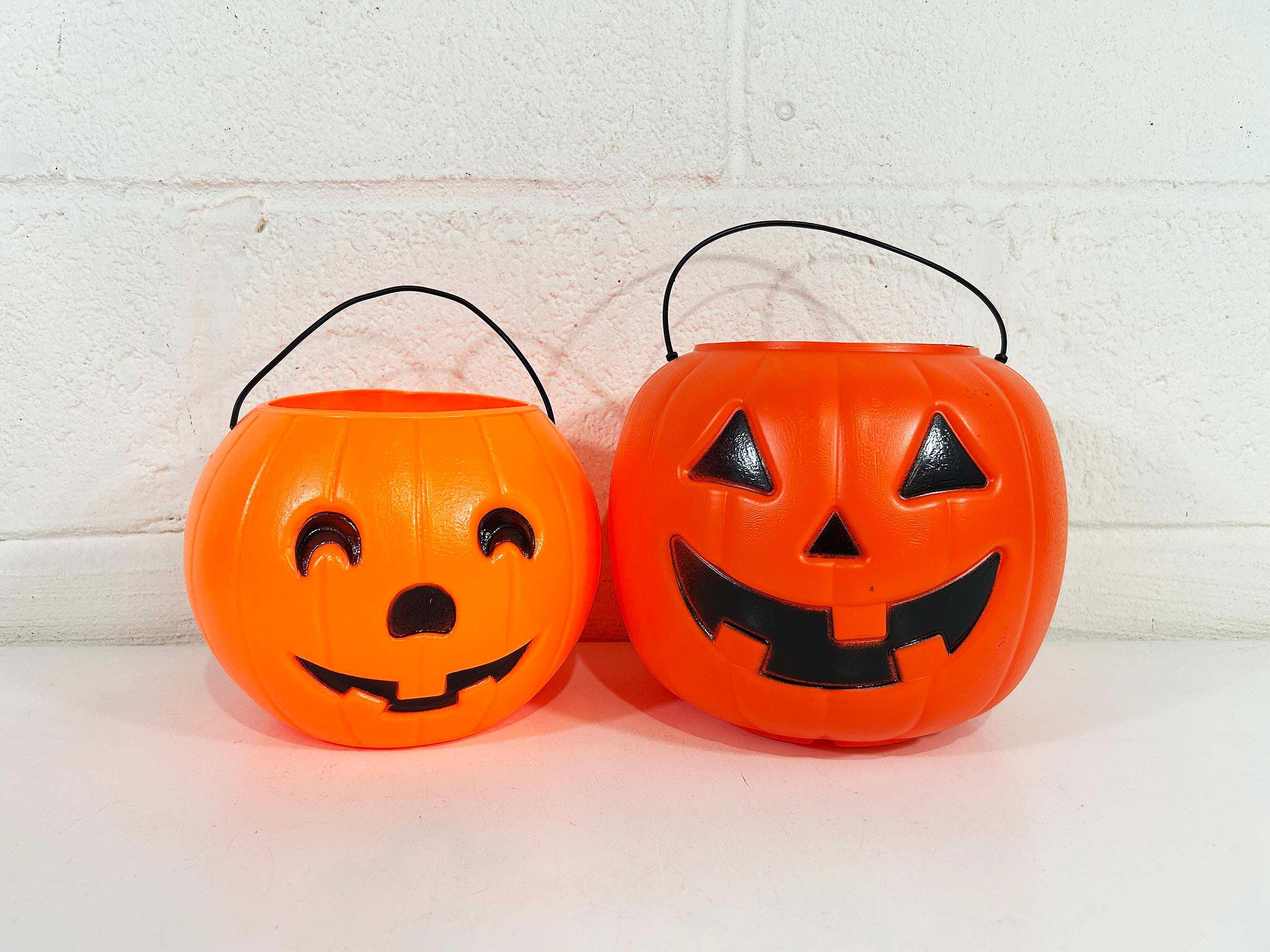 Super cool vintage Halloween pumpkin bucket! It is in good vintage condition with some scuffs and scratches. There is a crack along the rim of the opening - please be sure to inspect all photos closely. Perfect for collecting or handing out candy on Halloween night! The pumpkin is 6 inches tall and 4 3/4 inches in diameter at the opening. It is dated 1985 on the base!