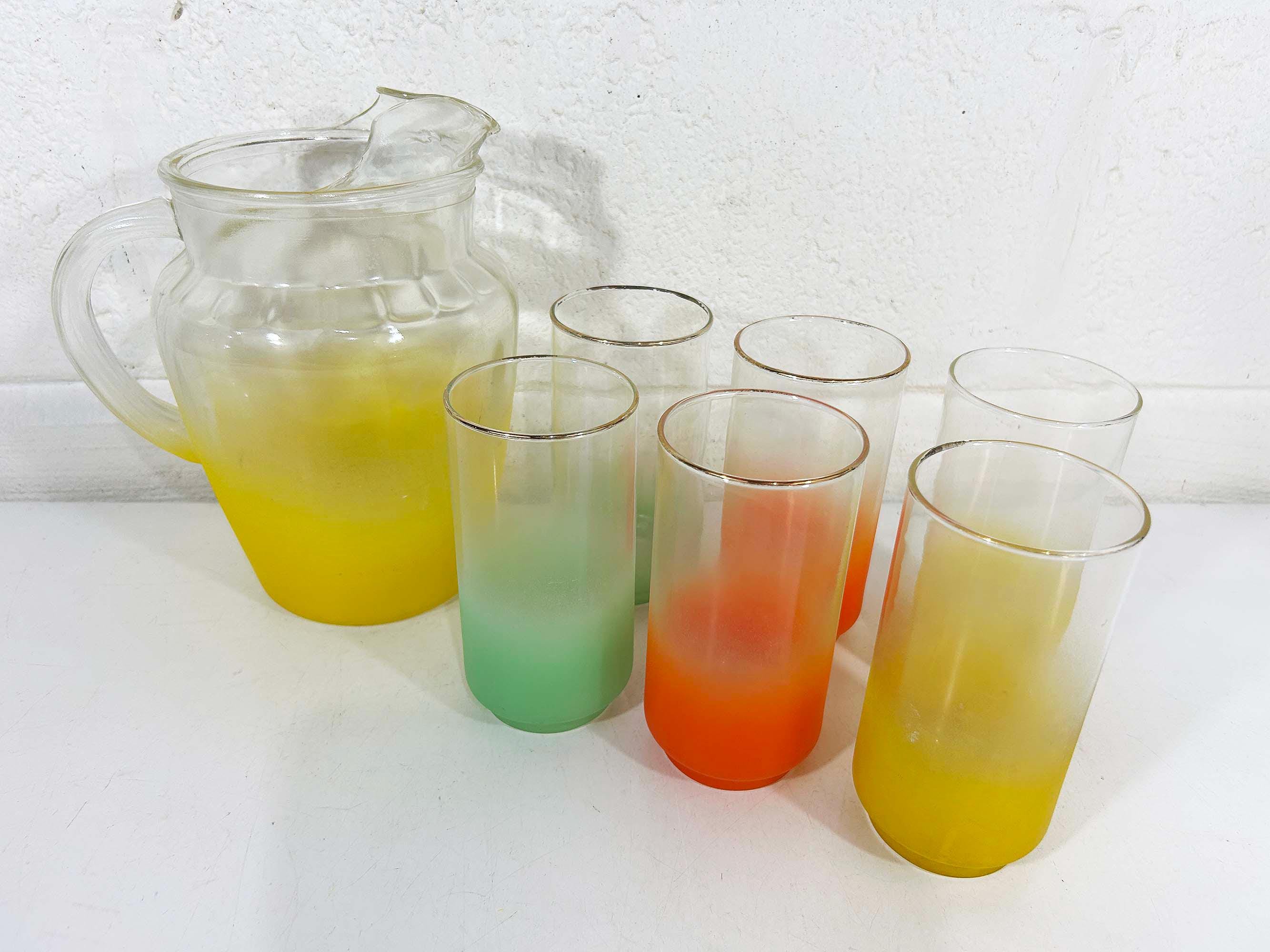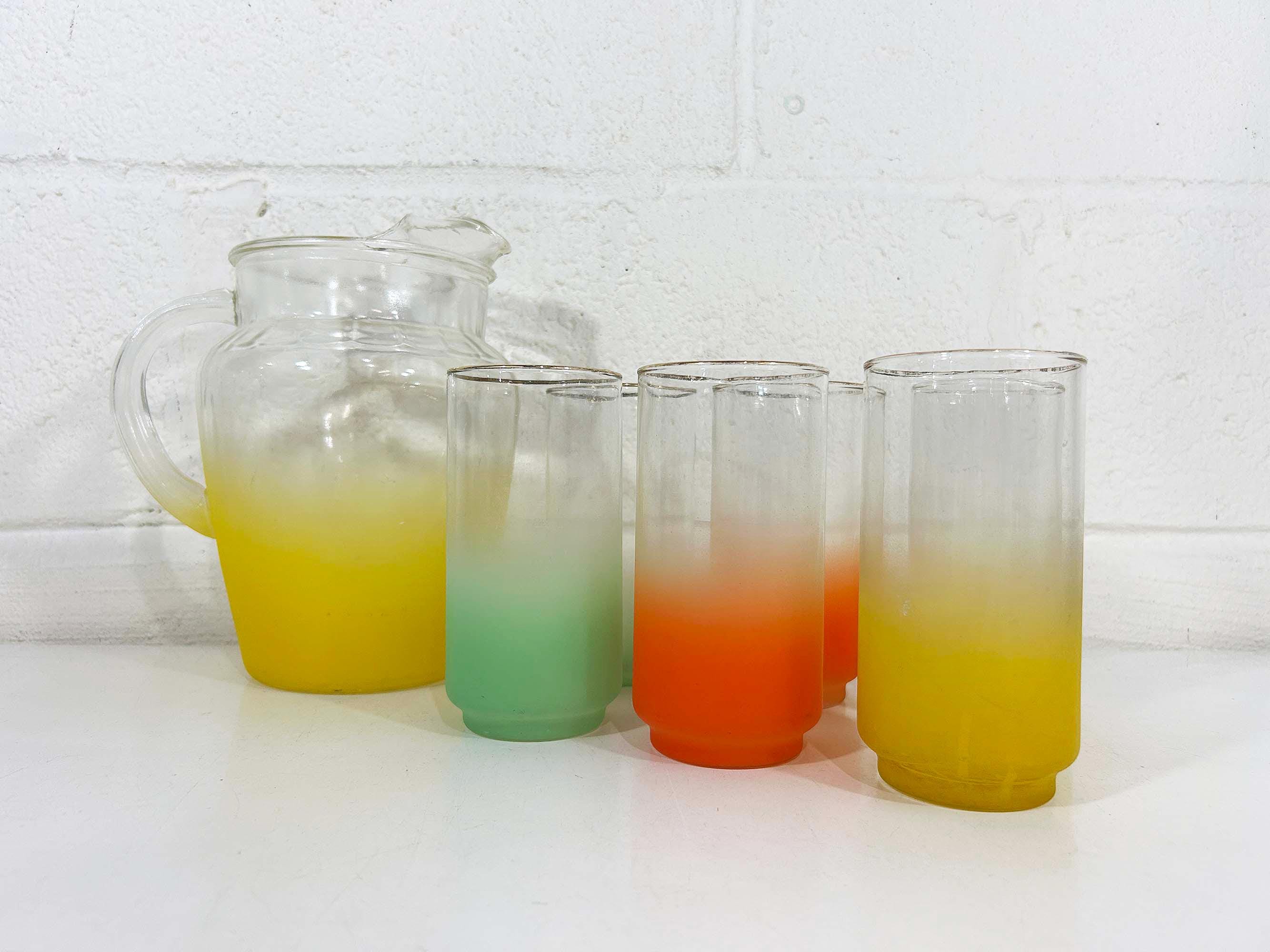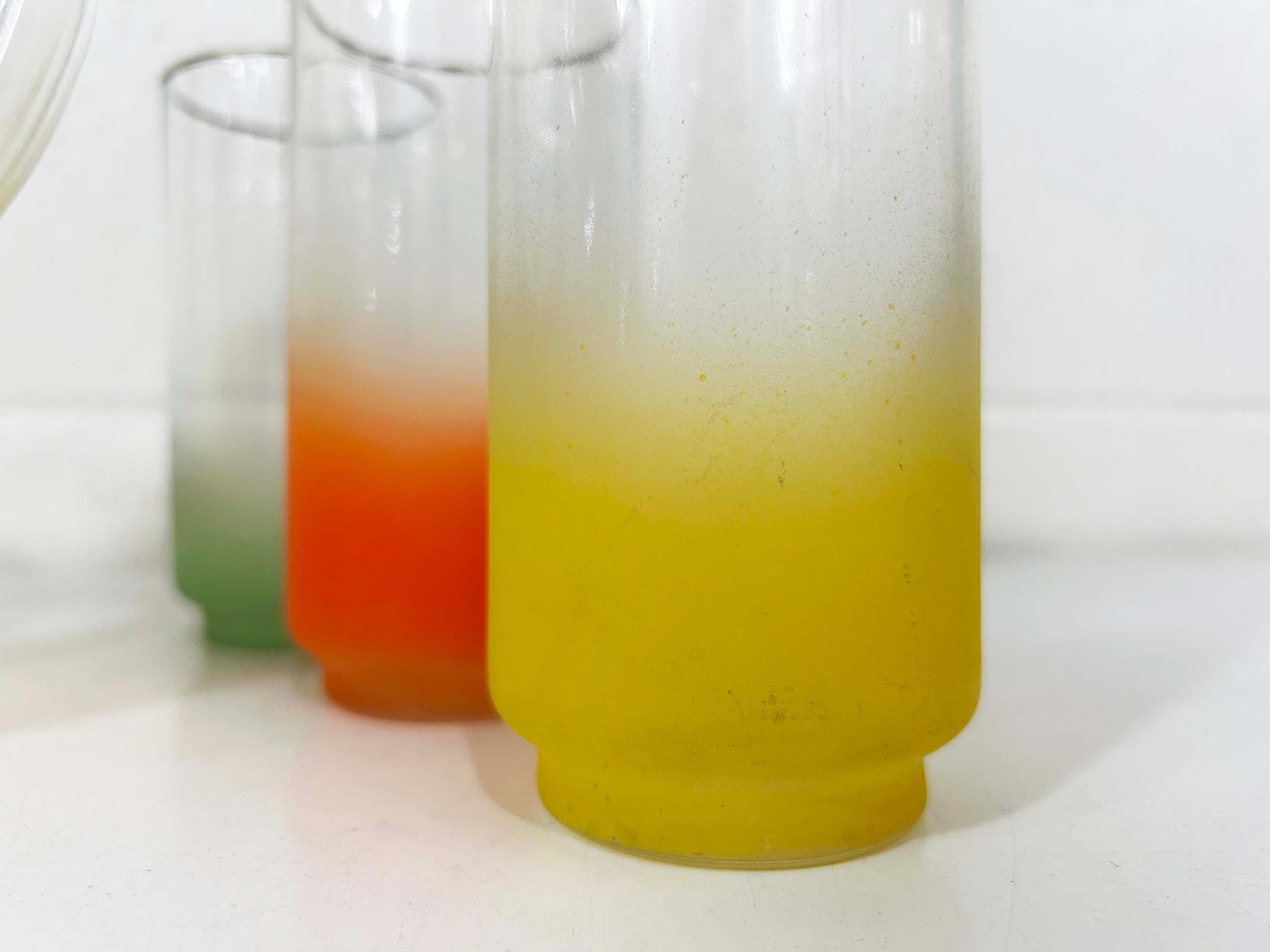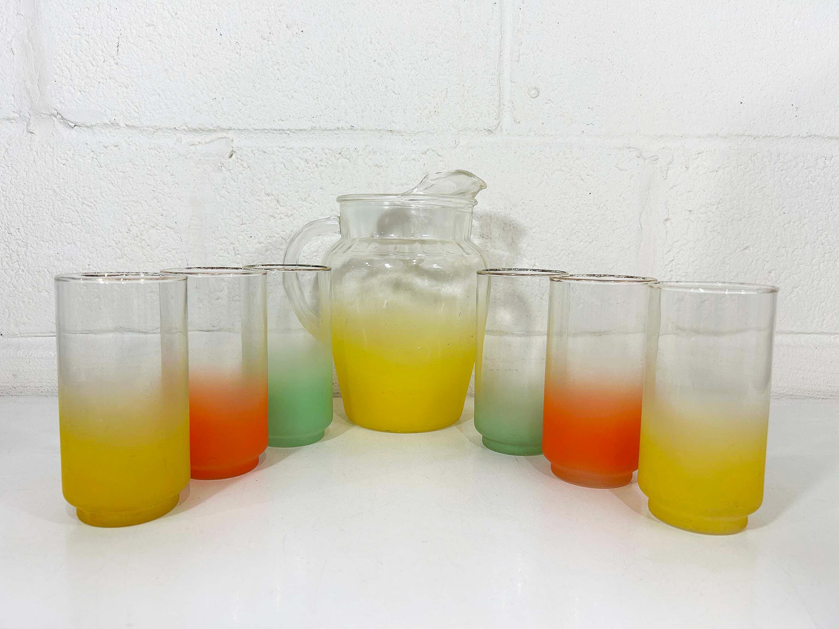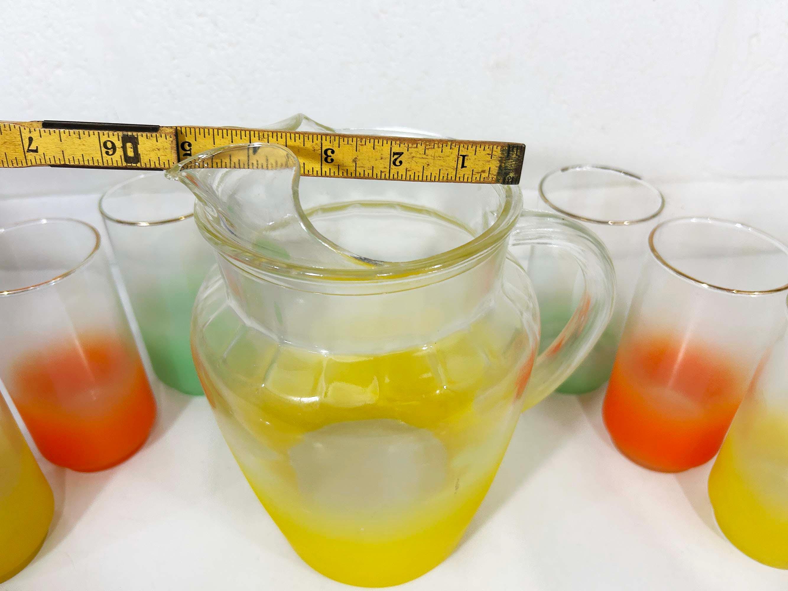 Vintage set of 6 frosted yellow, green, and orange glasses with a matching pitcher. Perfect addition to any bar or vintage kitchen! All are in good vintage condition with some scratches and paint loss from use. Each glass is approximately 6 inches tall and 2 1/2 inches across the top. The pitcher is approximately 9 inches tall and 5 inches in diameter at the top. The glasses each hold approximately 16 ounces of liquid when filled to the brim. The pitcher holds approximately ounces of 72 liquid when filled to the brim.