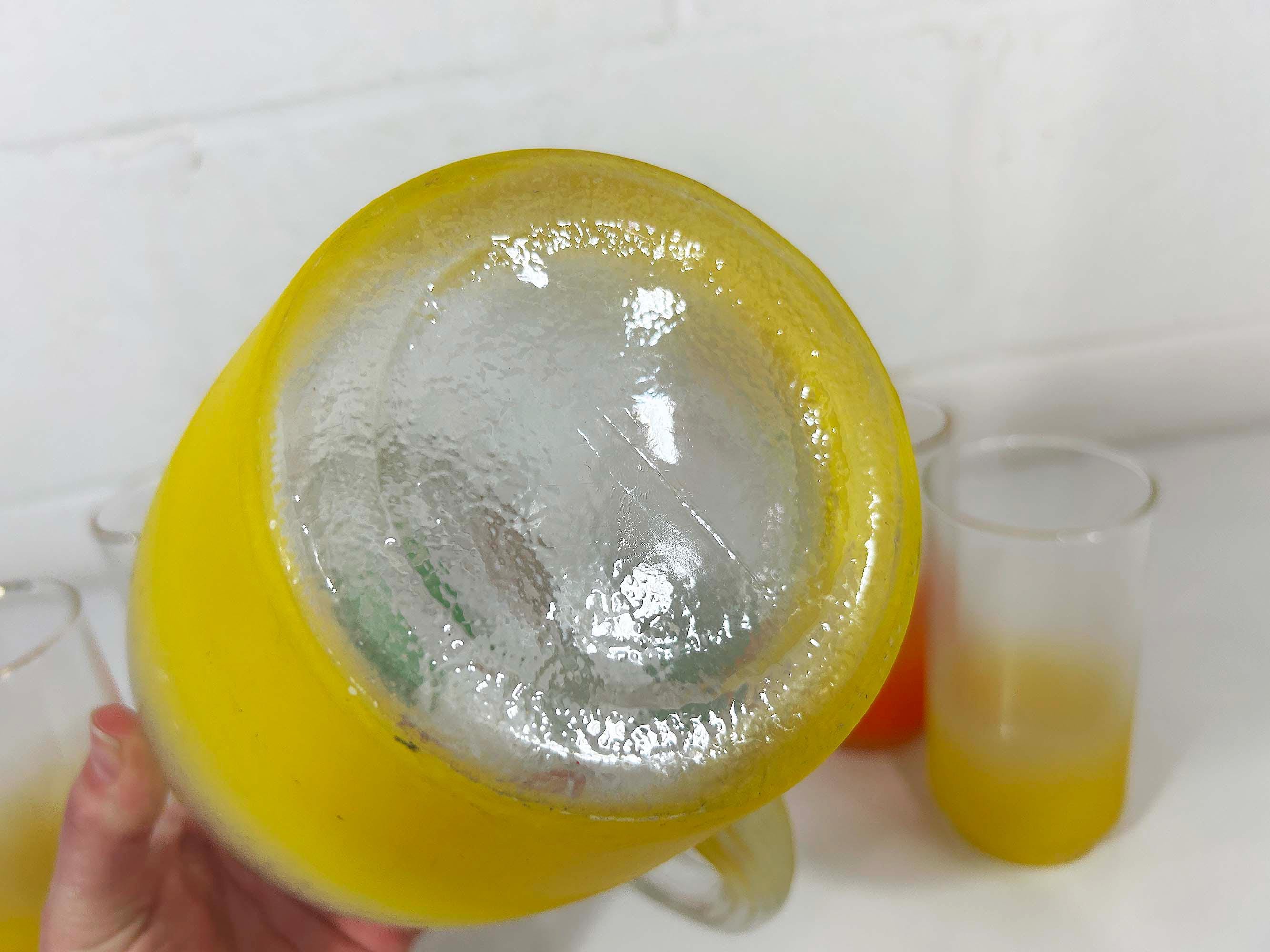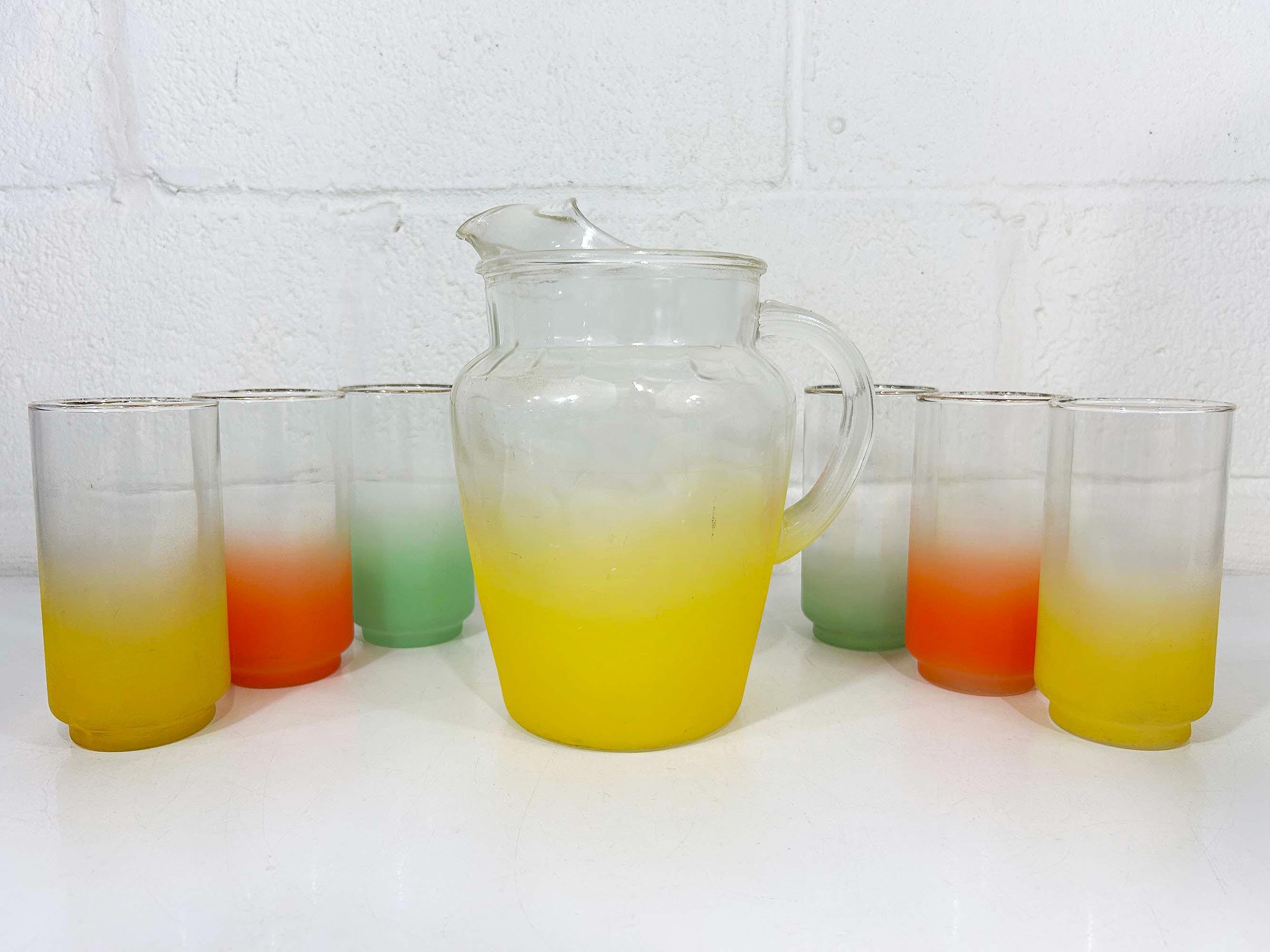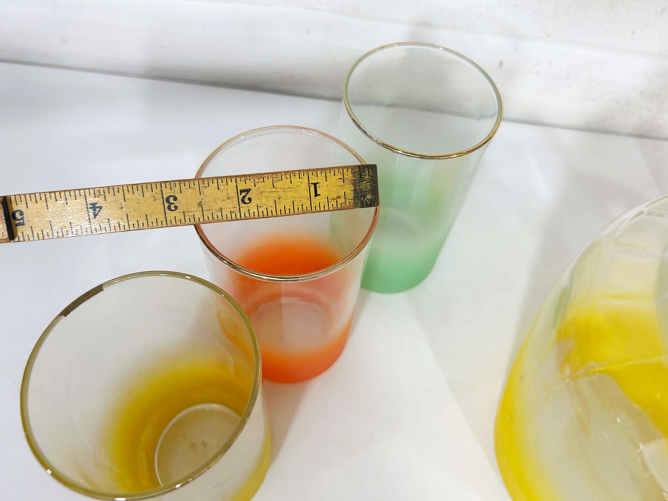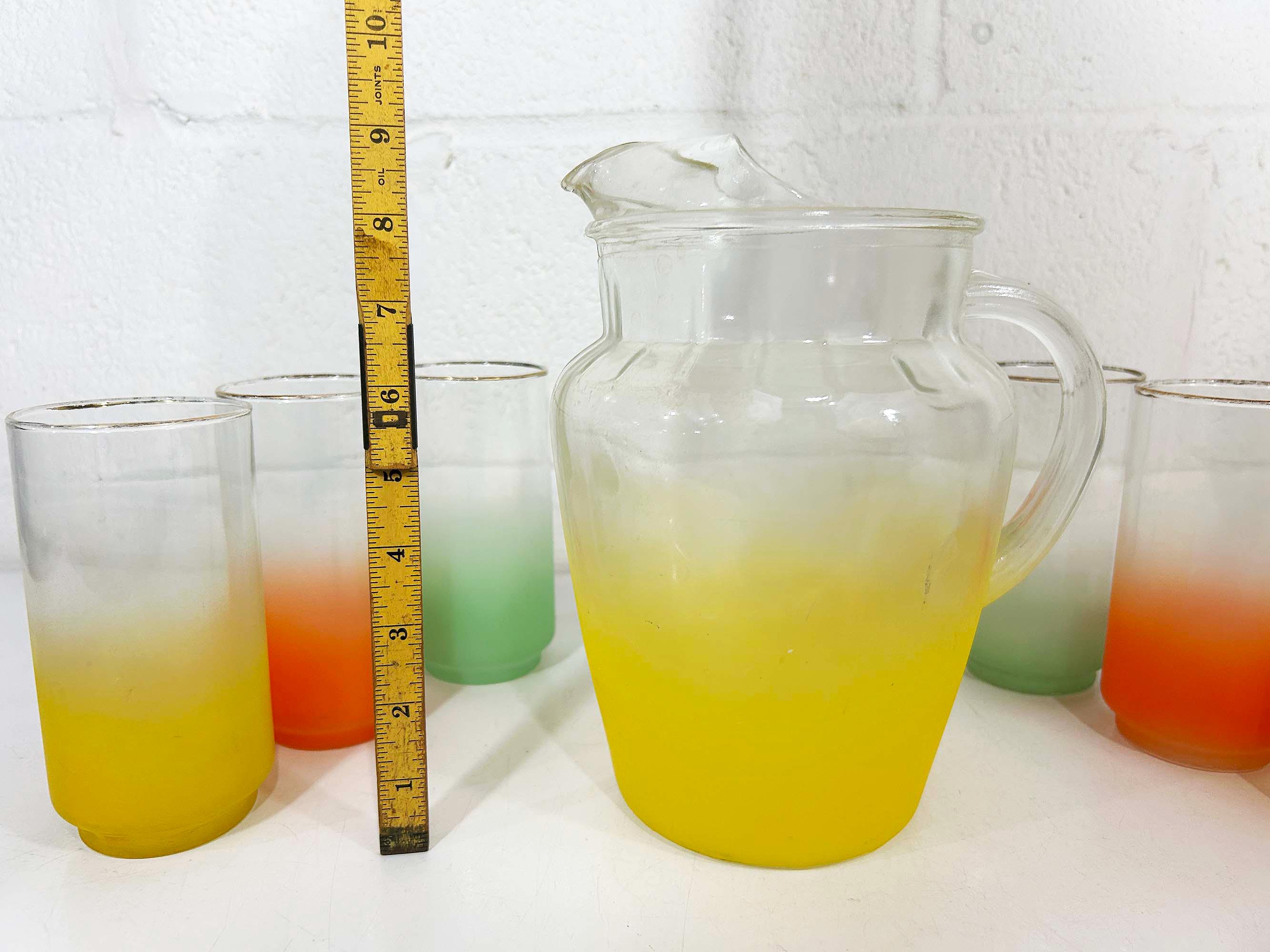 Vintage set of 6 frosted yellow, green, and orange glasses with a matching pitcher. Perfect addition to any bar or vintage kitchen! All are in good vintage condition with some scratches and paint loss from use. Each glass is approximately 6 inches tall and 2 1/2 inches across the top. The pitcher is approximately 9 inches tall and 5 inches in diameter at the top. The glasses each hold approximately 16 ounces of liquid when filled to the brim. The pitcher holds approximately ounces of 72 liquid when filled to the brim.