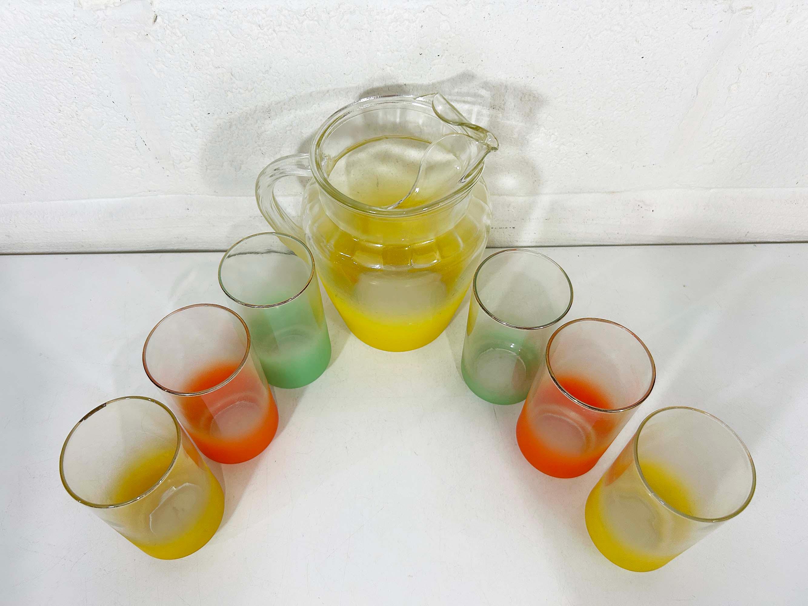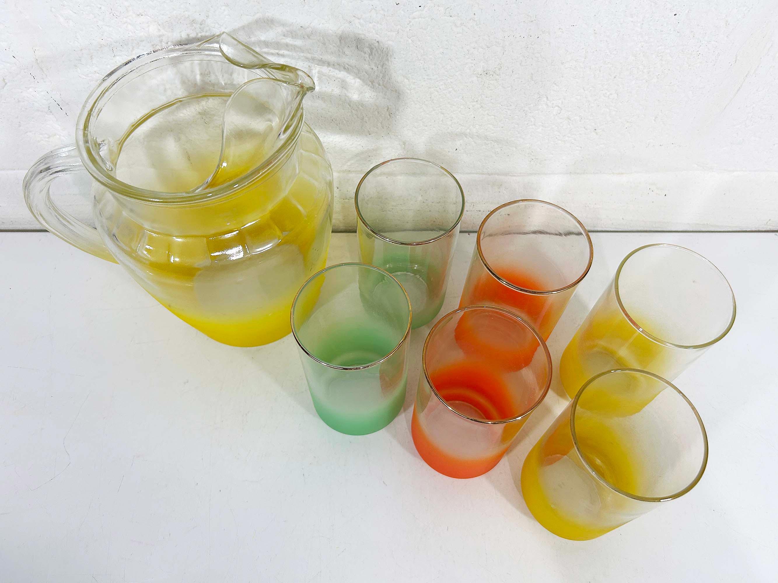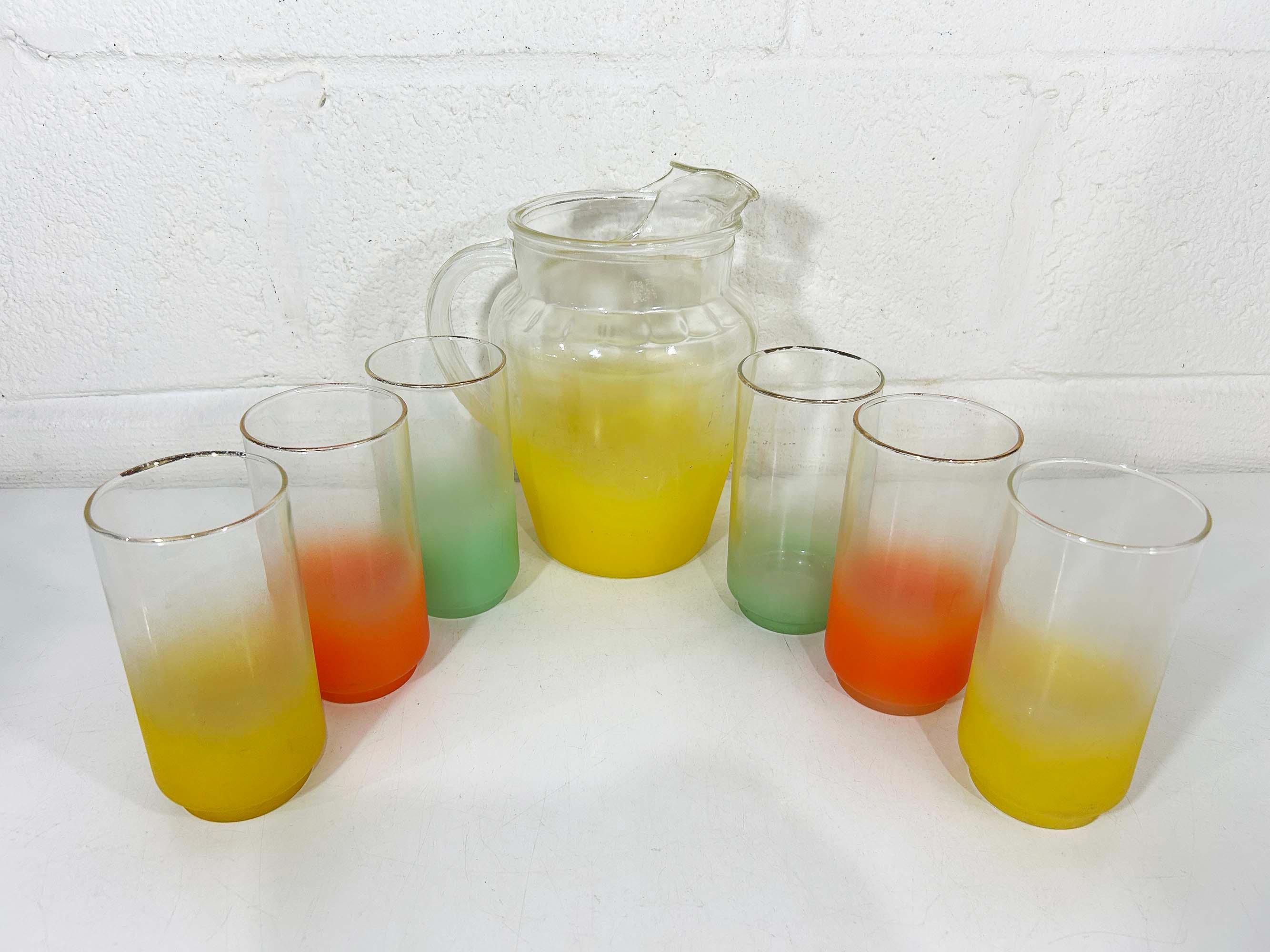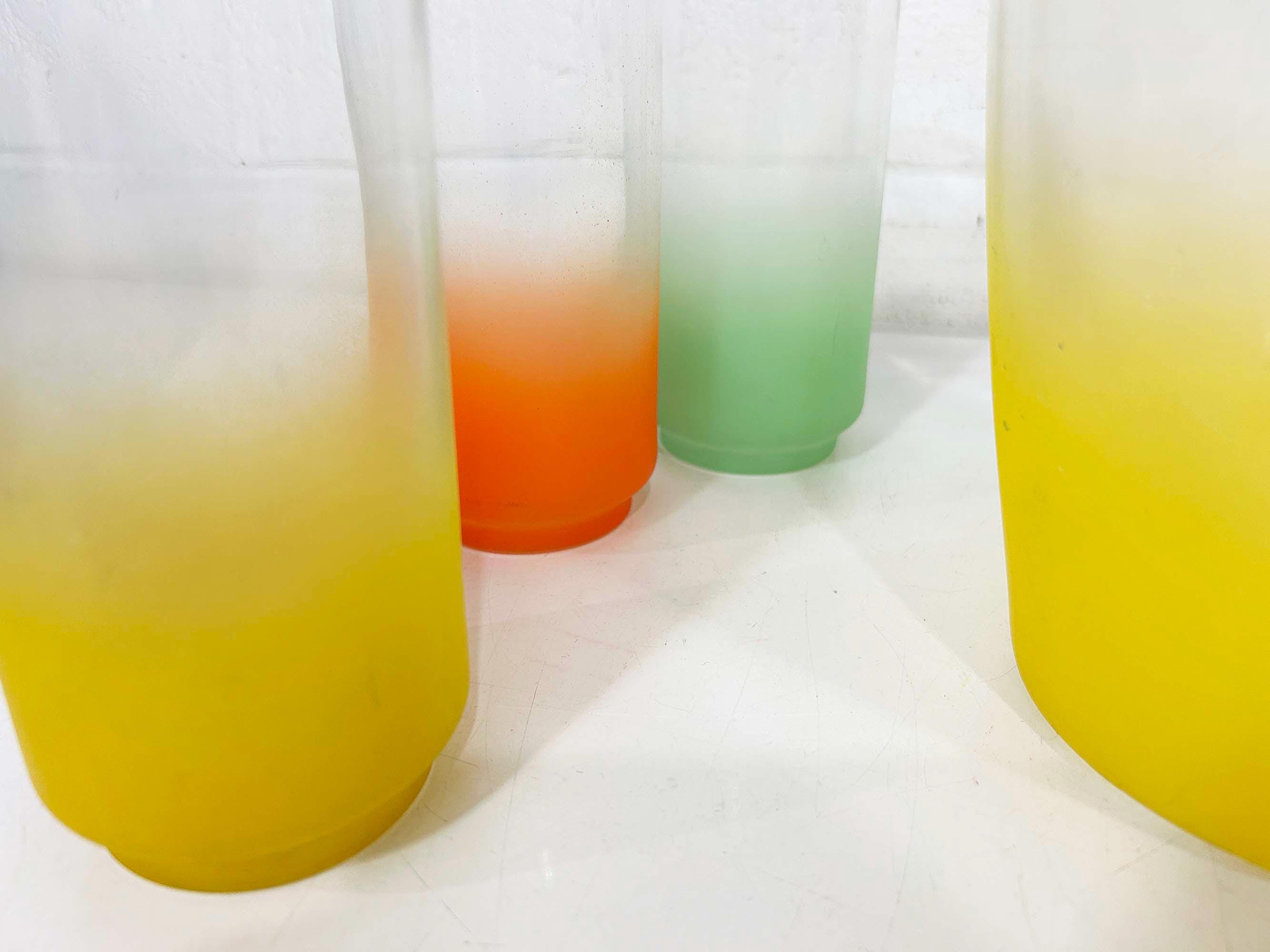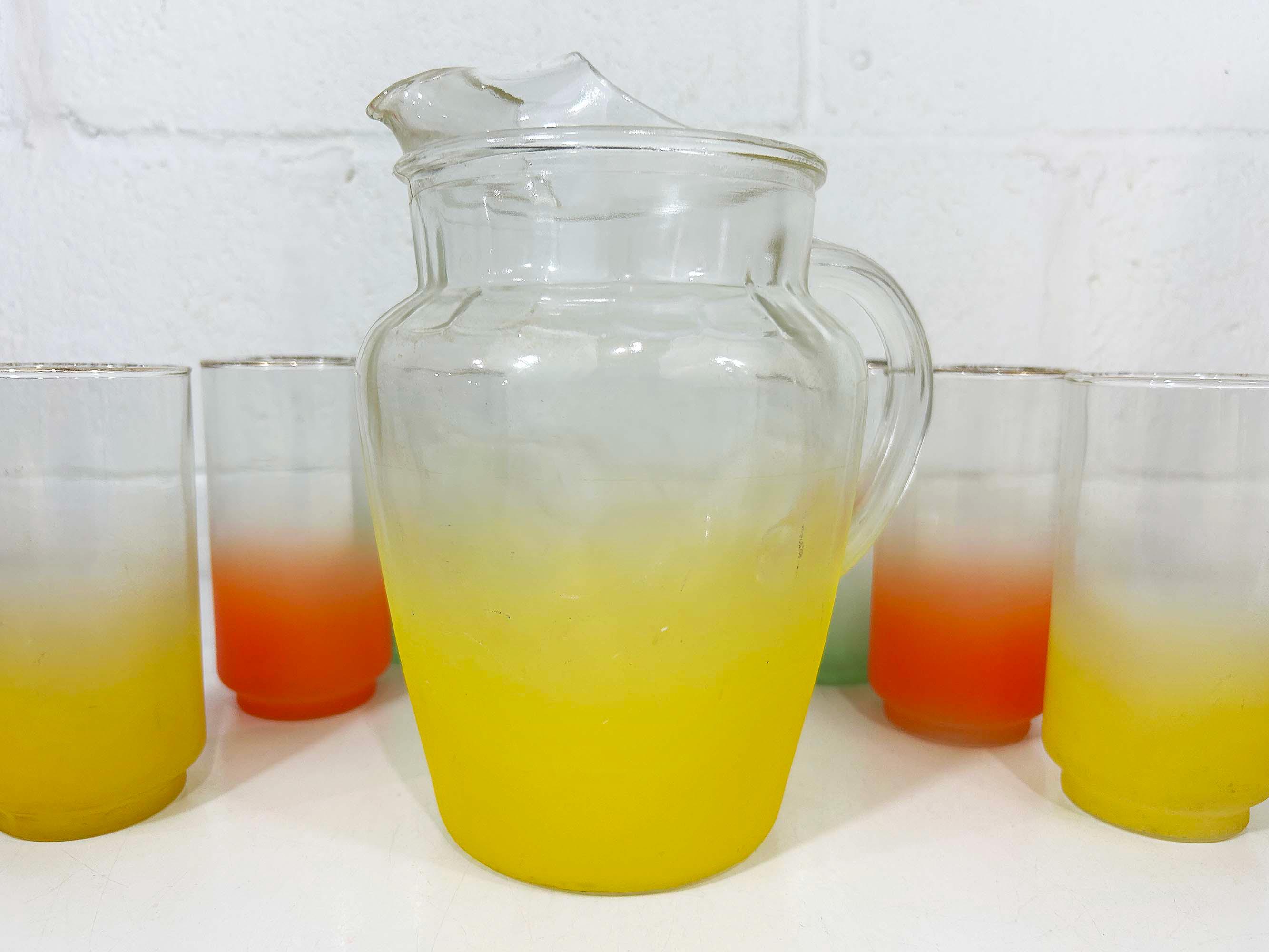 Vintage set of 6 frosted yellow, green, and orange glasses with a matching pitcher. Perfect addition to any bar or vintage kitchen! All are in good vintage condition with some scratches and paint loss from use. Each glass is approximately 6 inches tall and 2 1/2 inches across the top. The pitcher is approximately 9 inches tall and 5 inches in diameter at the top. The glasses each hold approximately 16 ounces of liquid when filled to the brim. The pitcher holds approximately ounces of 72 liquid when filled to the brim.
