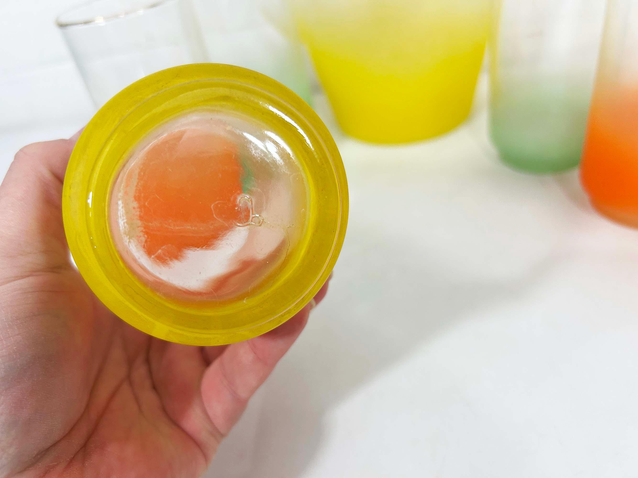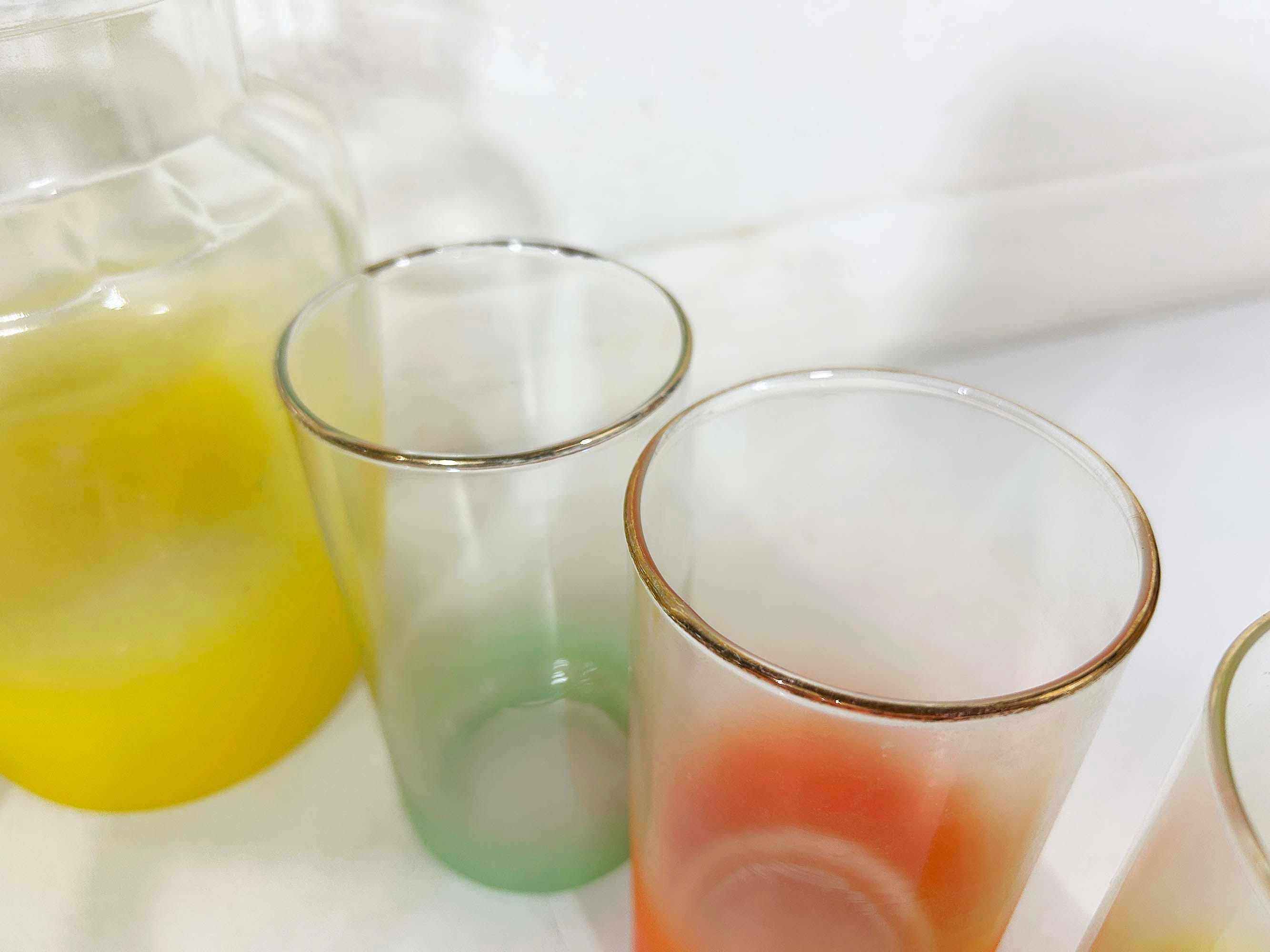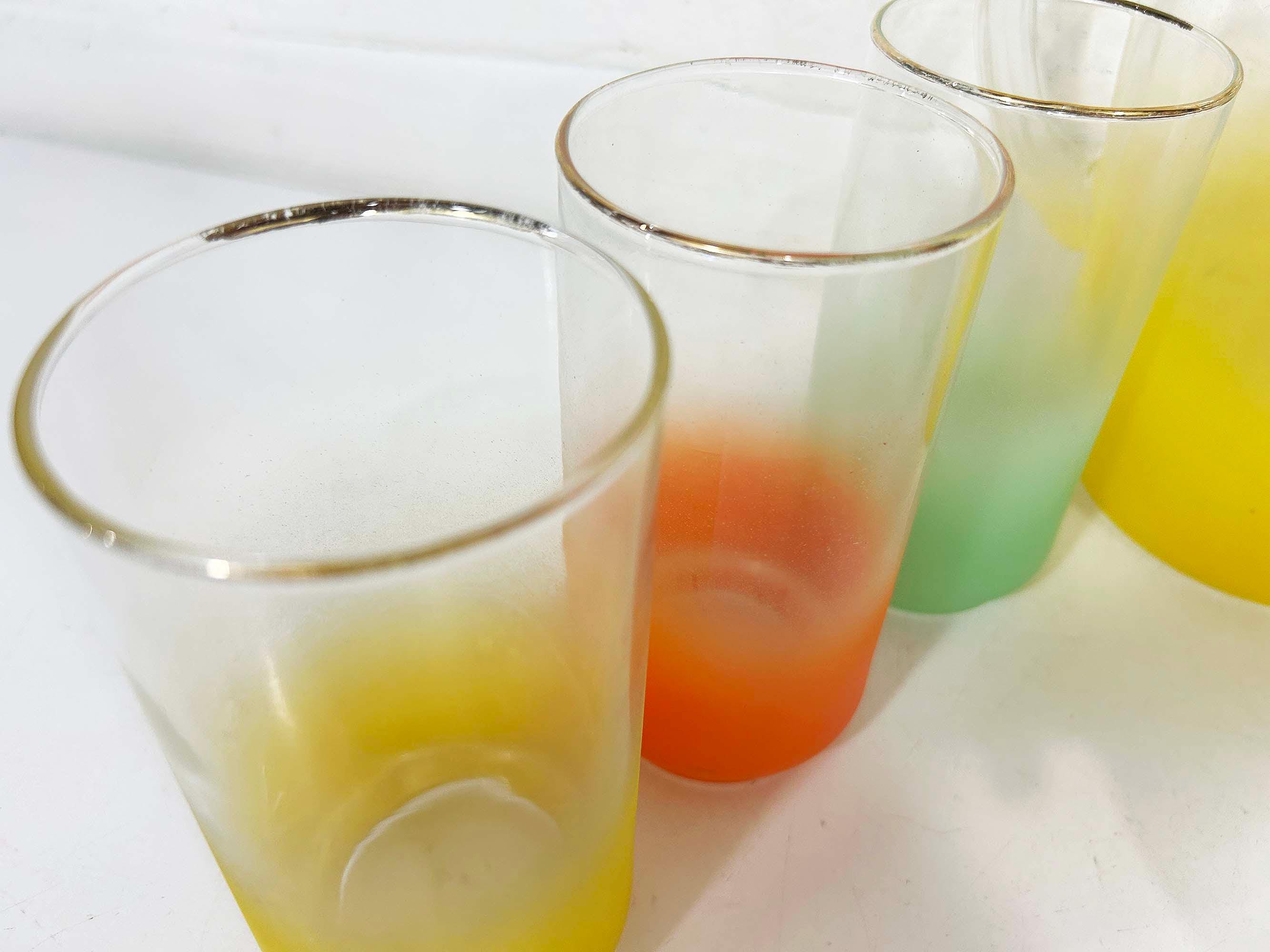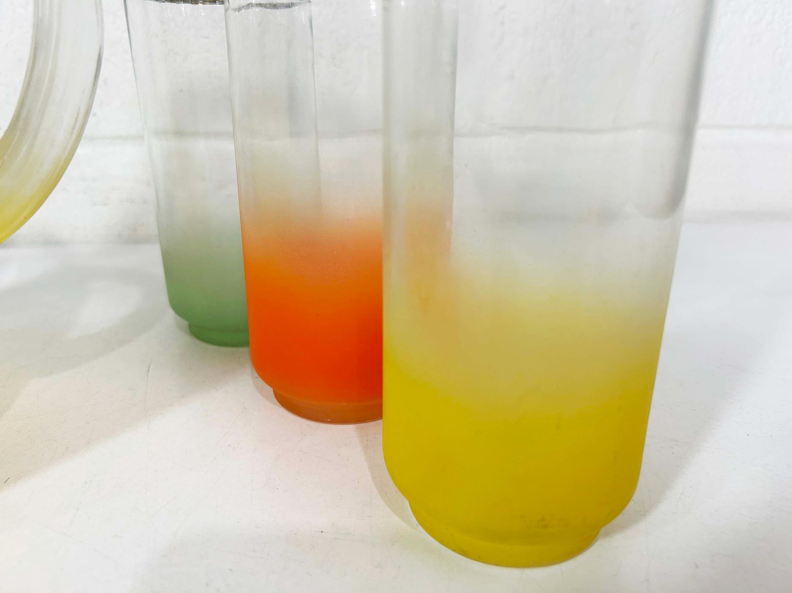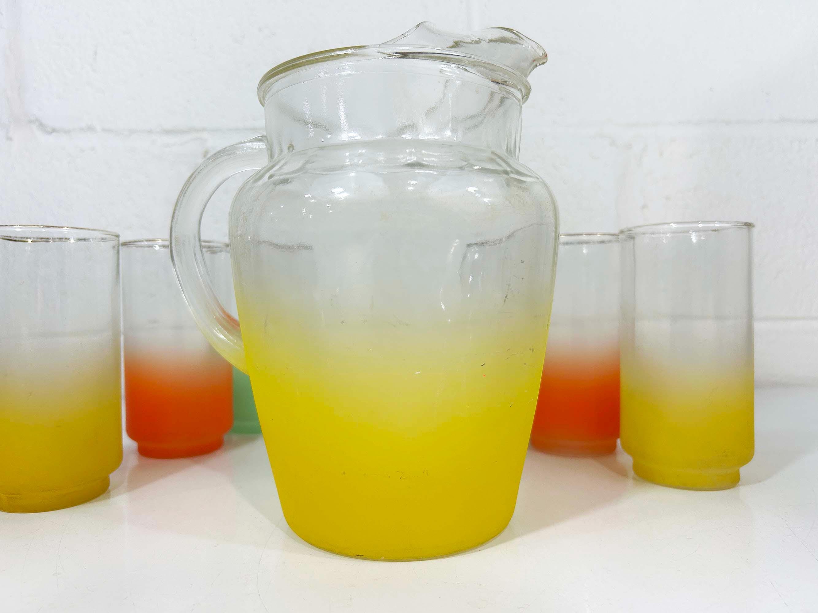 Vintage set of 6 frosted yellow, green, and orange glasses with a matching pitcher. Perfect addition to any bar or vintage kitchen! All are in good vintage condition with some scratches and paint loss from use. Each glass is approximately 6 inches tall and 2 1/2 inches across the top. The pitcher is approximately 9 inches tall and 5 inches in diameter at the top. The glasses each hold approximately 16 ounces of liquid when filled to the brim. The pitcher holds approximately ounces of 72 liquid when filled to the brim.