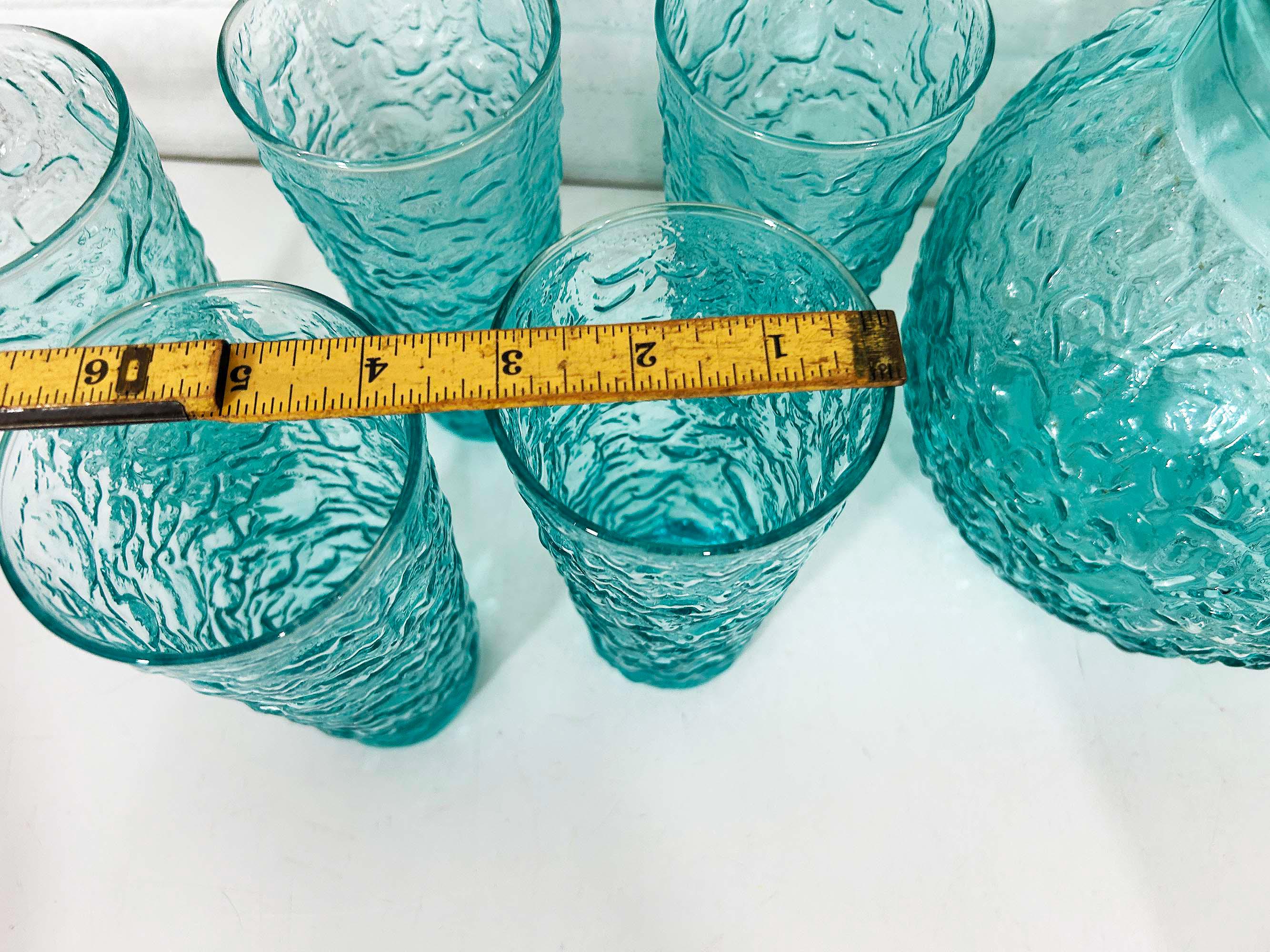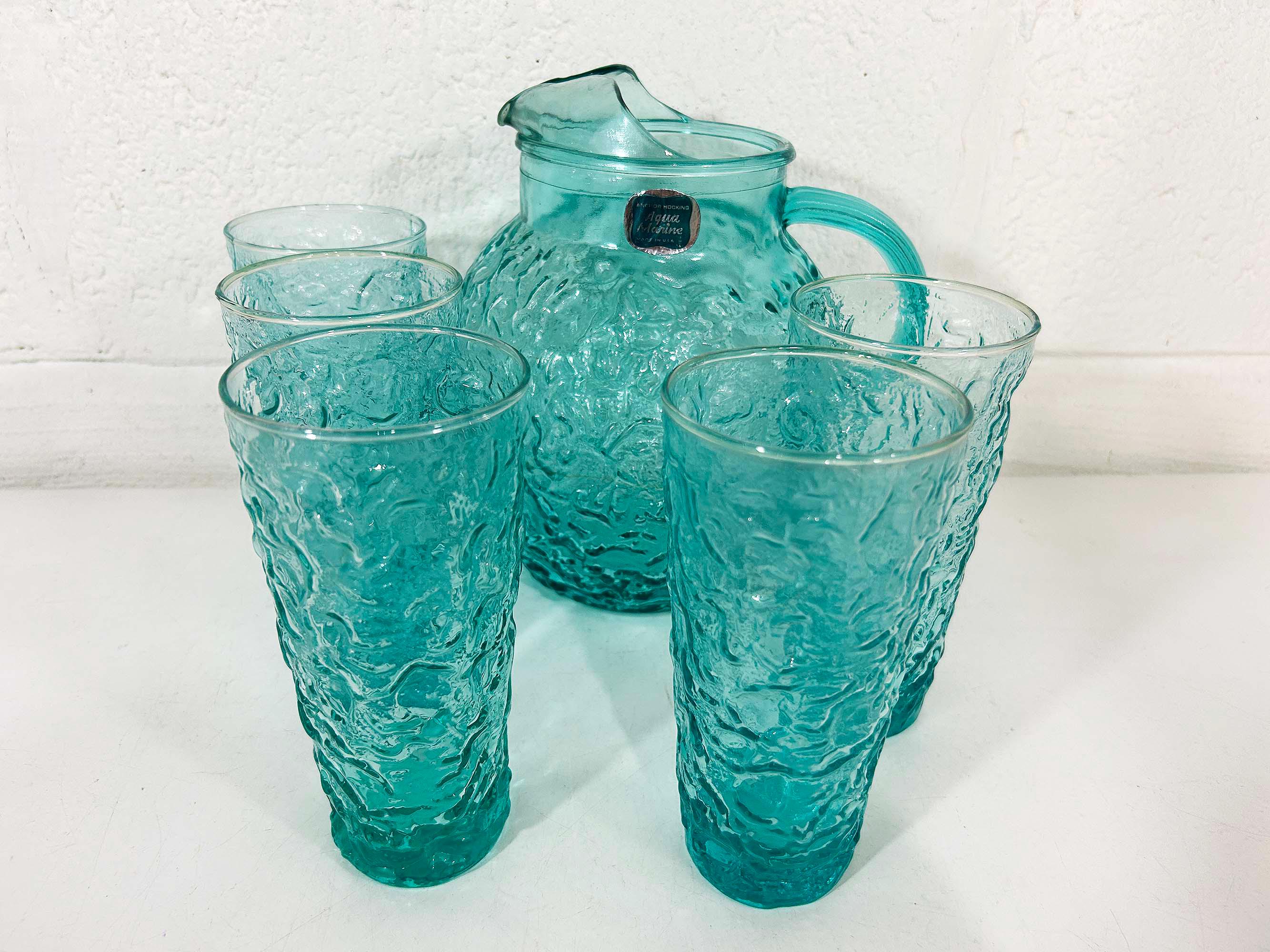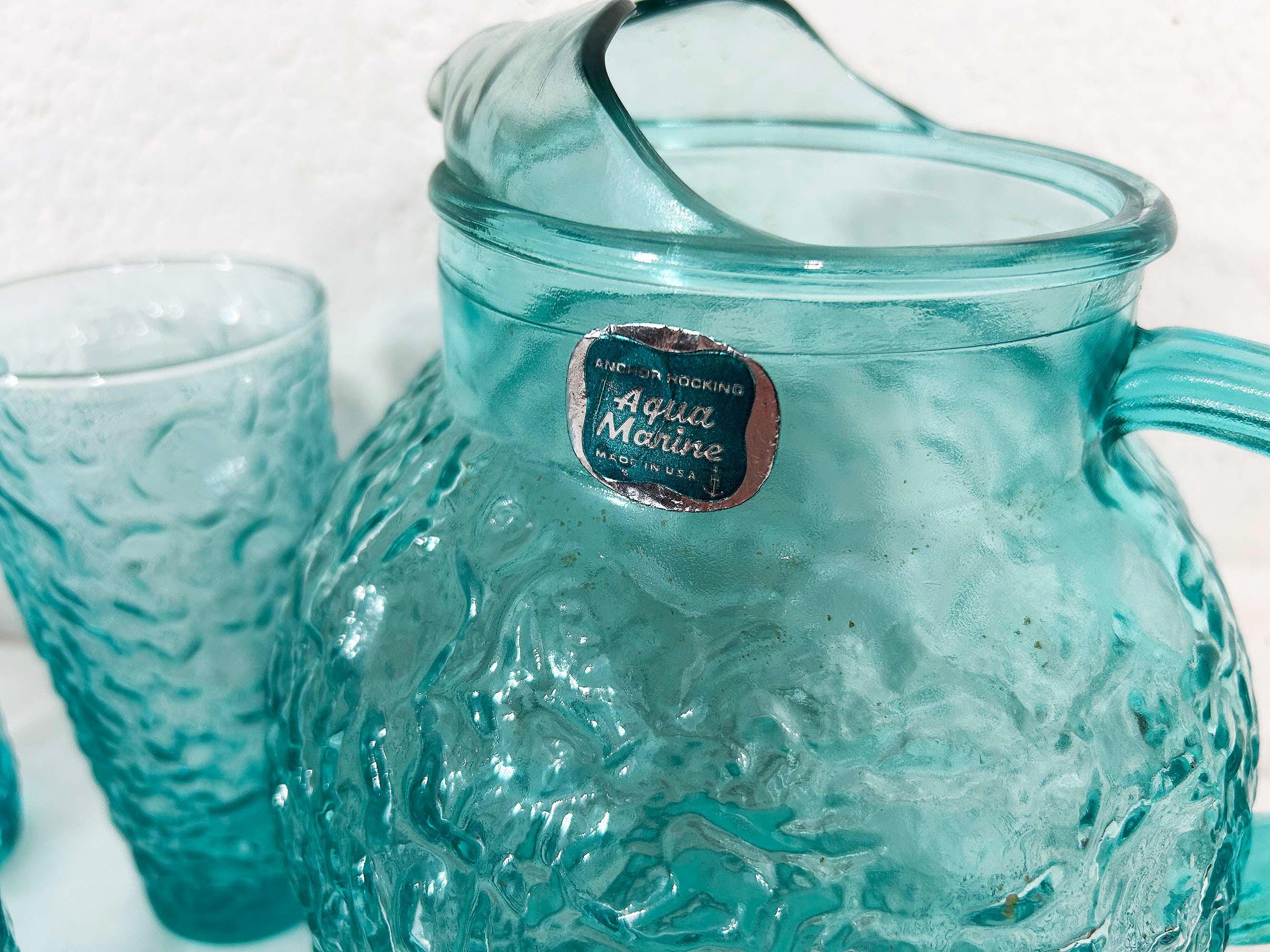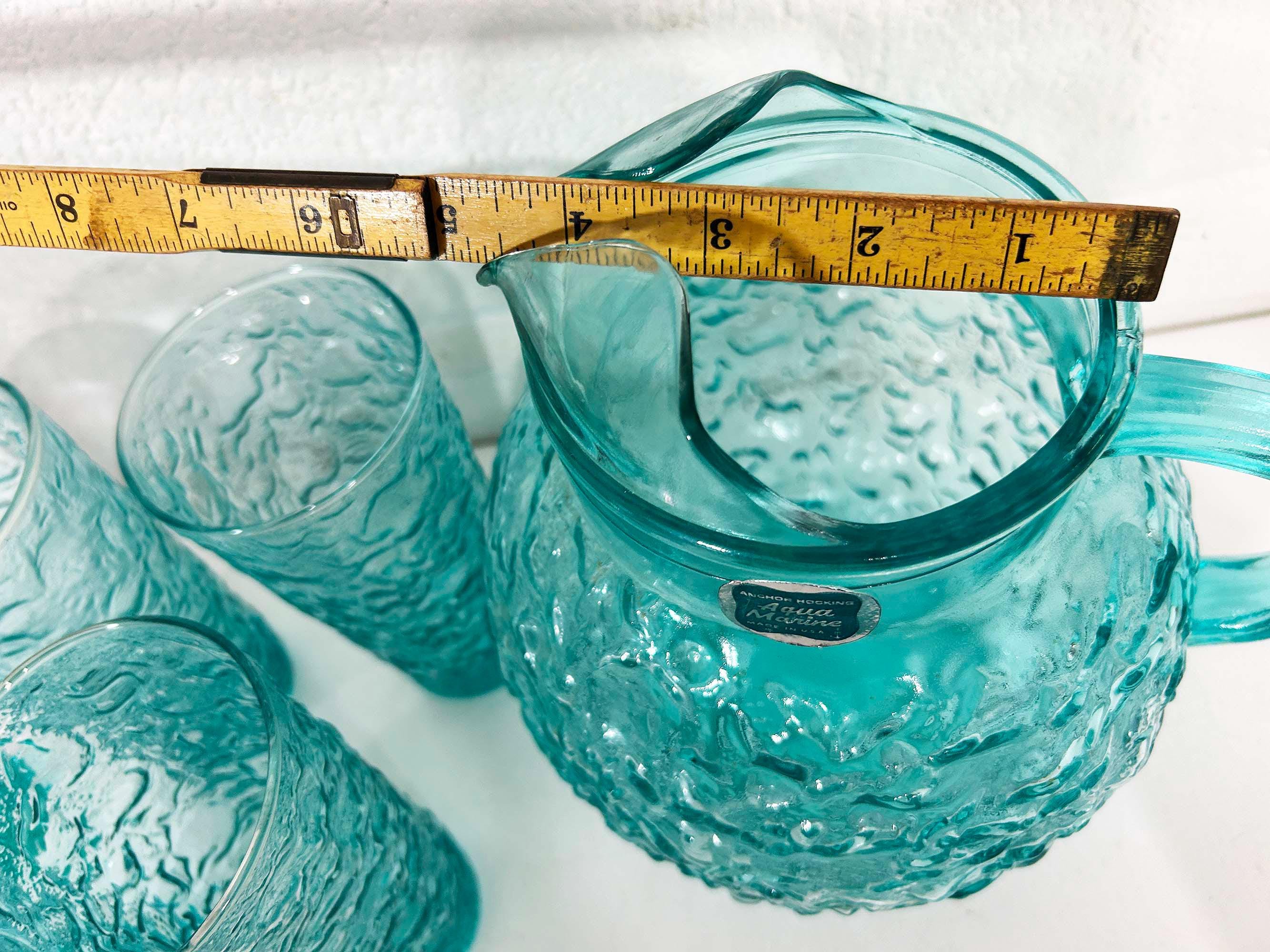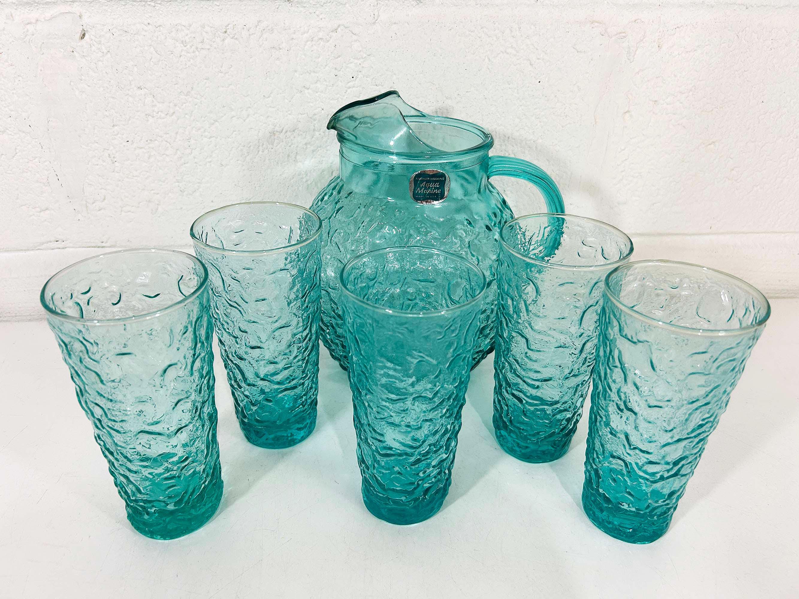 Super cute aqua marine blue glass pitcher and glassware matching set! Perfect for iced tea or lemonade in the summertime. In excellent vintage condition - the pitcher still has the original brand's sticker. The pitcher is about 8 1/2 inches tall, 7 inches wide in the middle, and 4 1/2 inches in diameter across the top. Each glass is approximately 6 1/2 inches tall and 3 inches in diameter across the top. The glasses each hold approximately 16 ounces of liquid when filled to the brim. The pitcher holds approximately ounces of 72 liquid when filled to the brim.