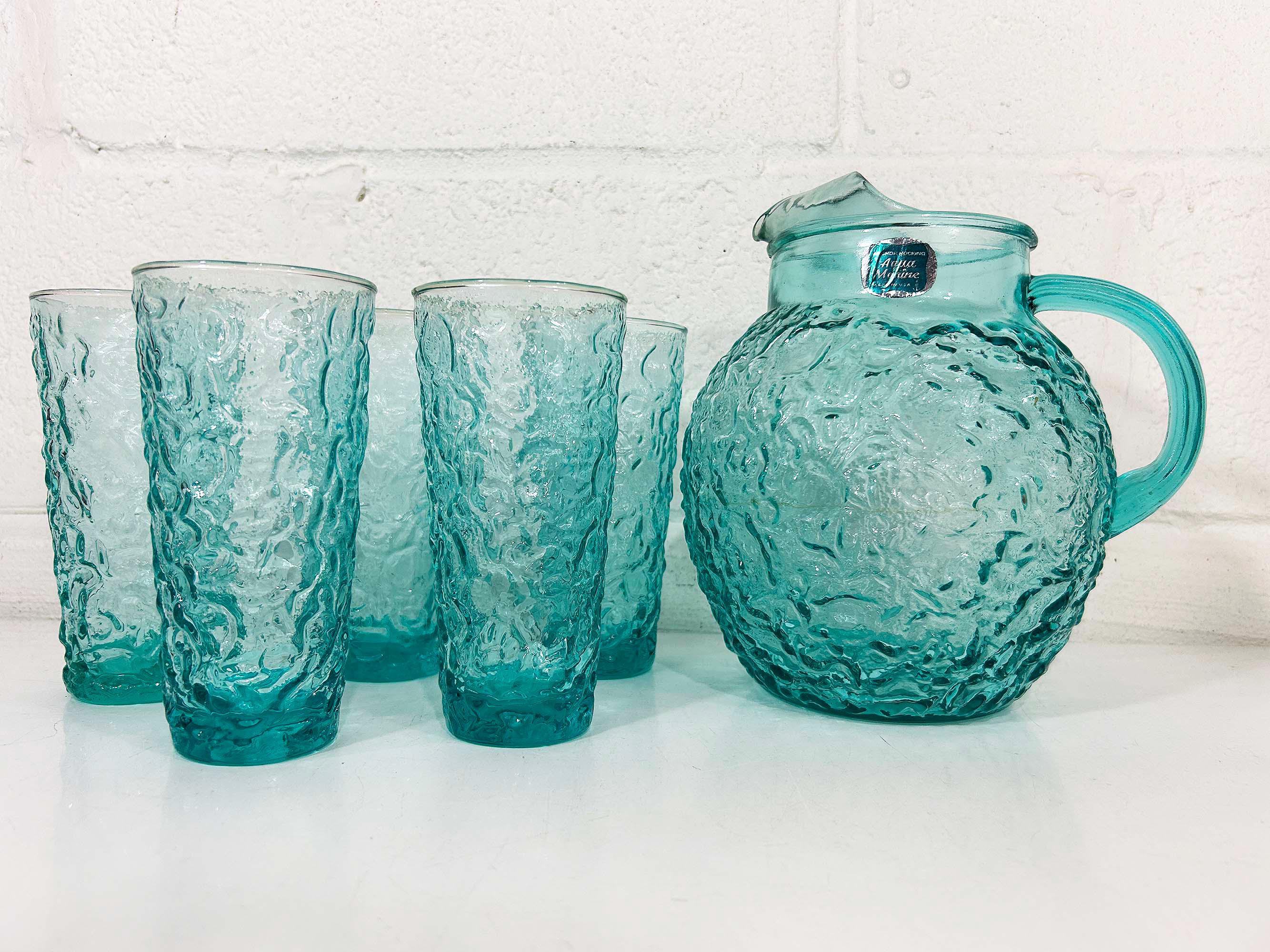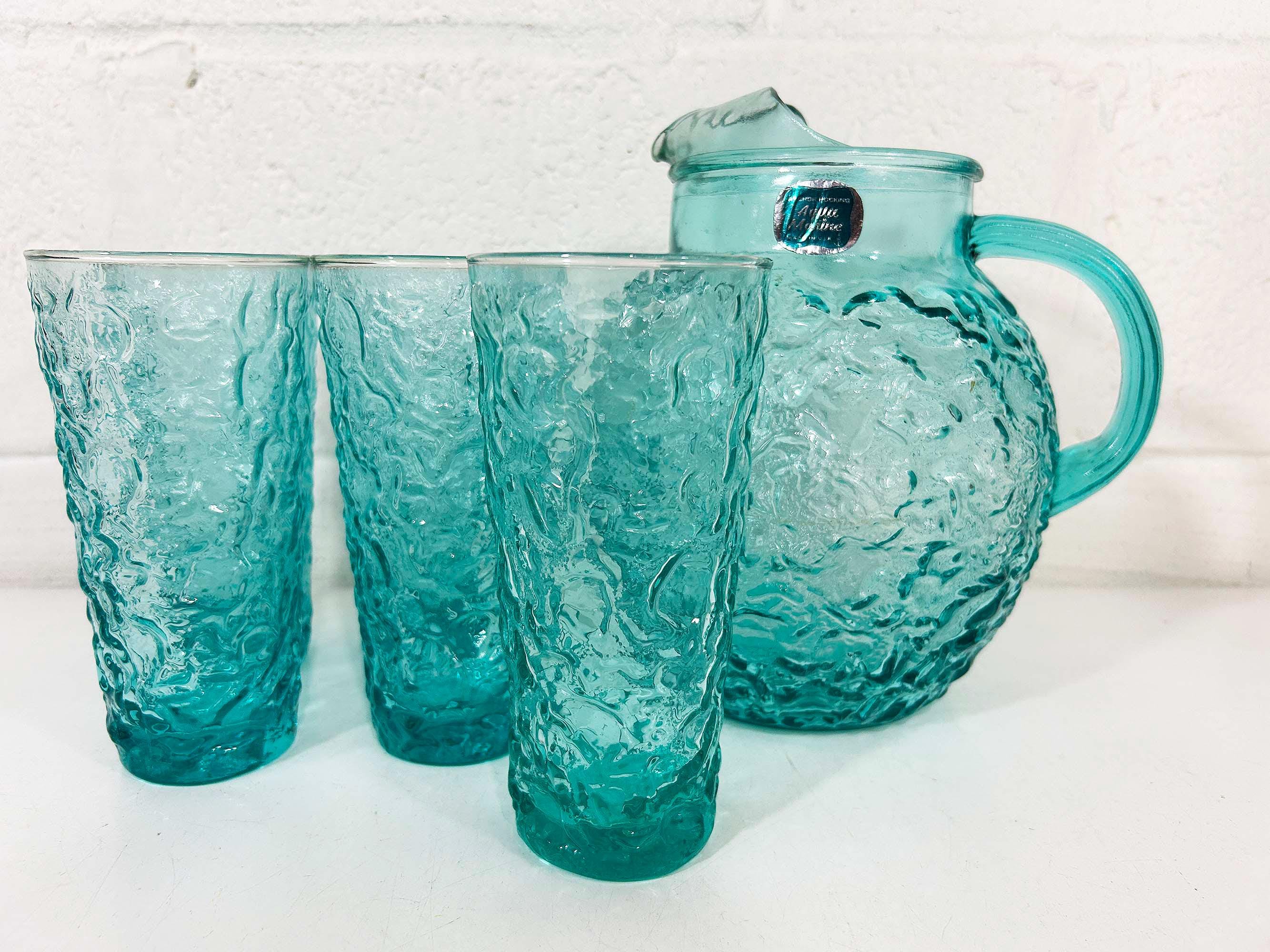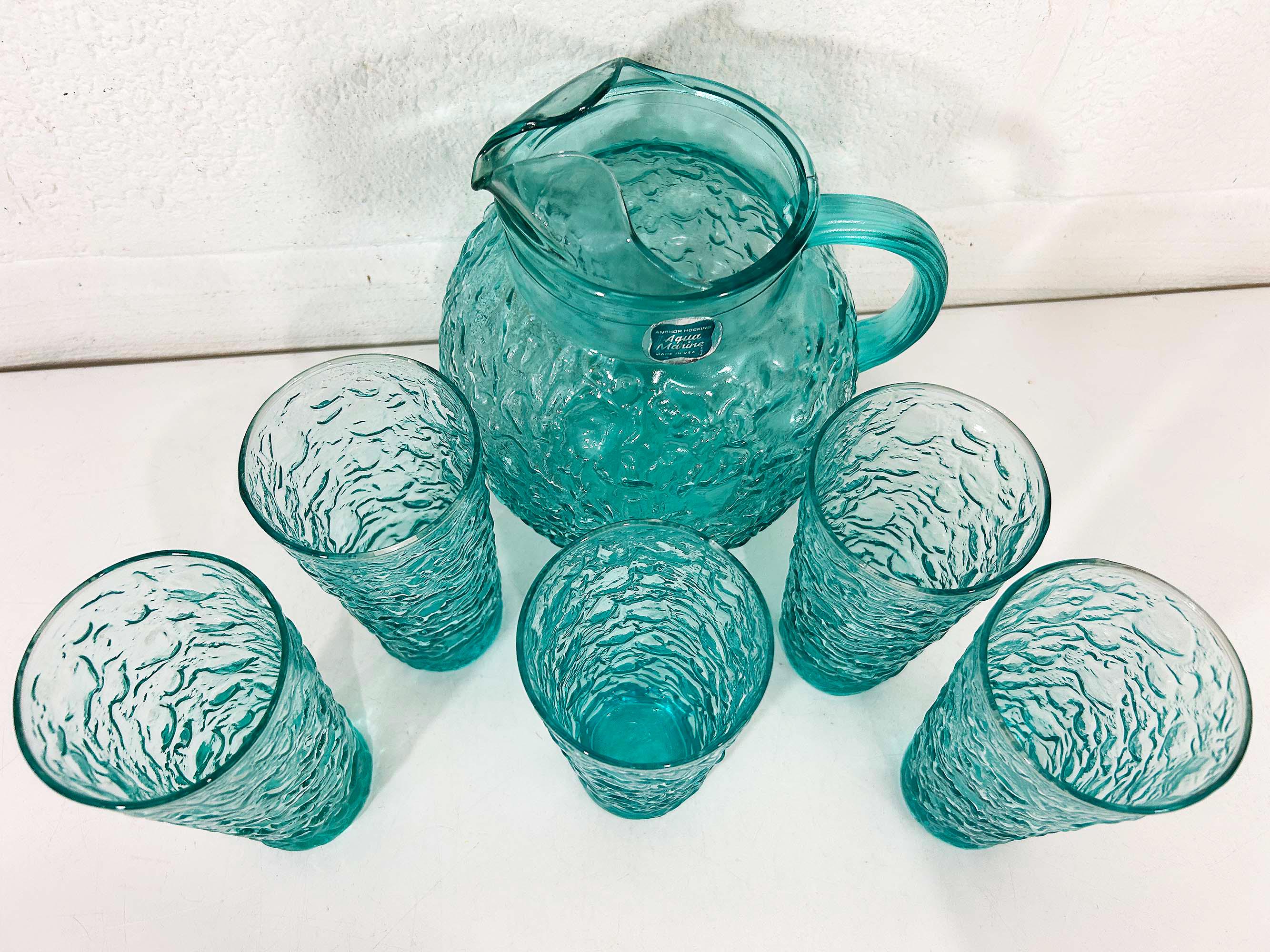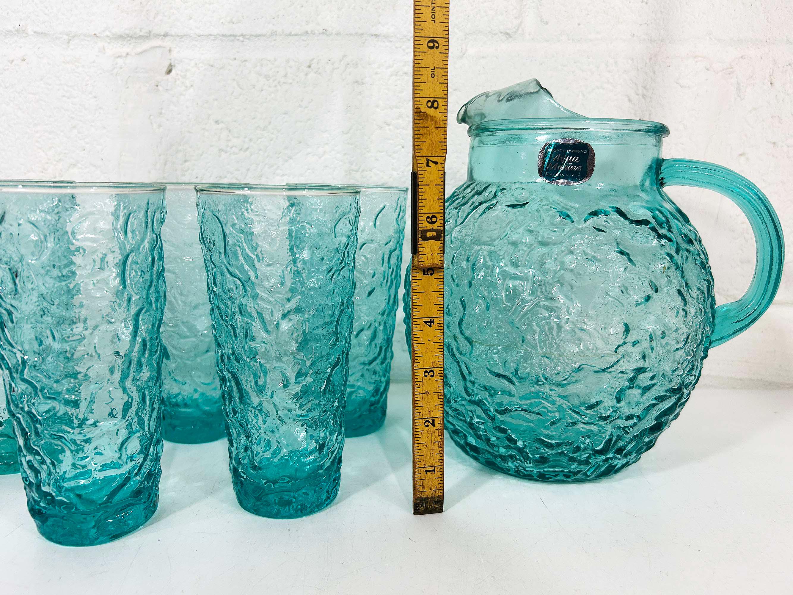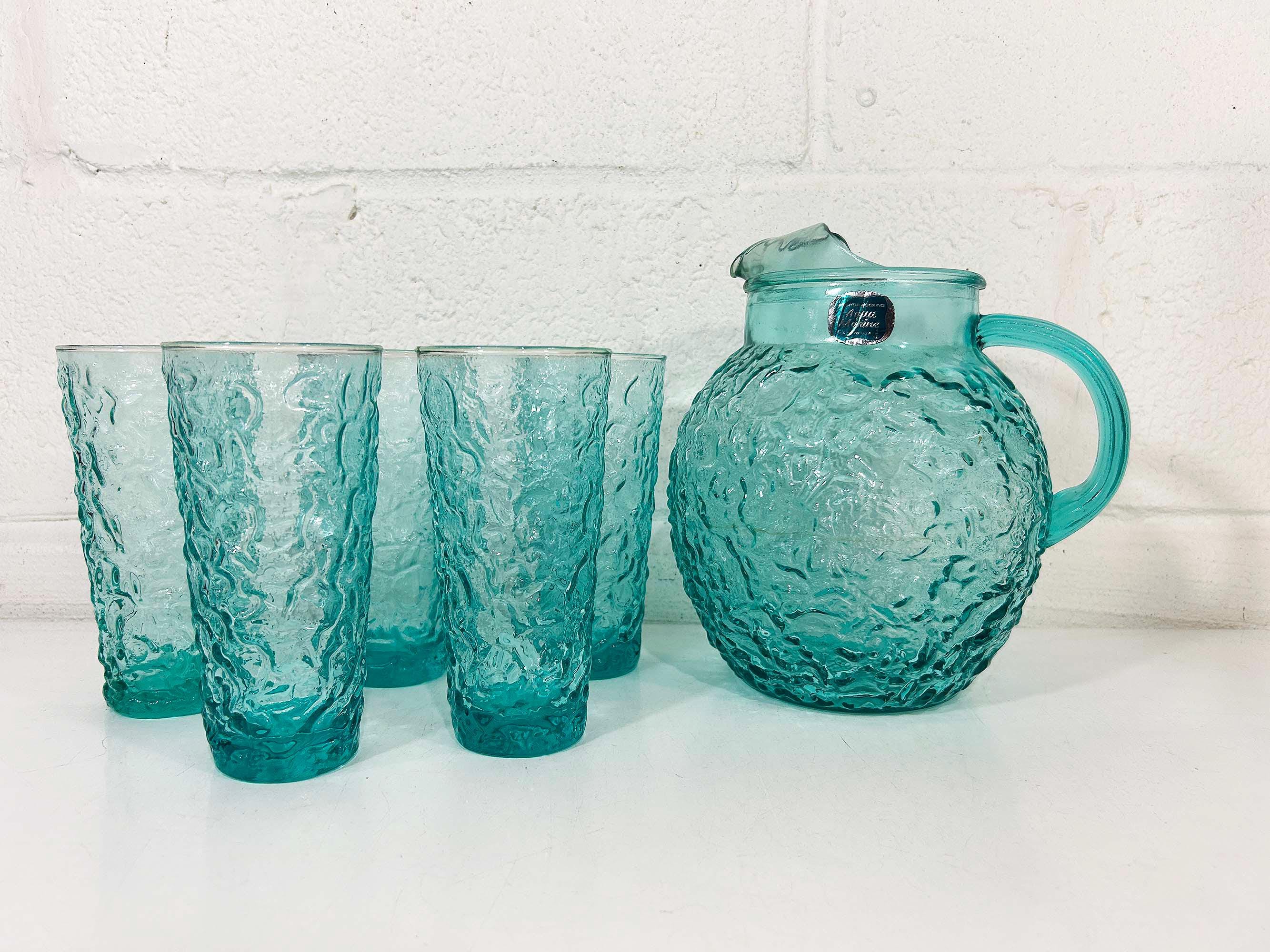 Super cute aqua marine blue glass pitcher and glassware matching set! Perfect for iced tea or lemonade in the summertime. In excellent vintage condition - the pitcher still has the original brand's sticker. The pitcher is about 8 1/2 inches tall, 7 inches wide in the middle, and 4 1/2 inches in diameter across the top. Each glass is approximately 6 1/2 inches tall and 3 inches in diameter across the top. The glasses each hold approximately 16 ounces of liquid when filled to the brim. The pitcher holds approximately ounces of 72 liquid when filled to the brim.