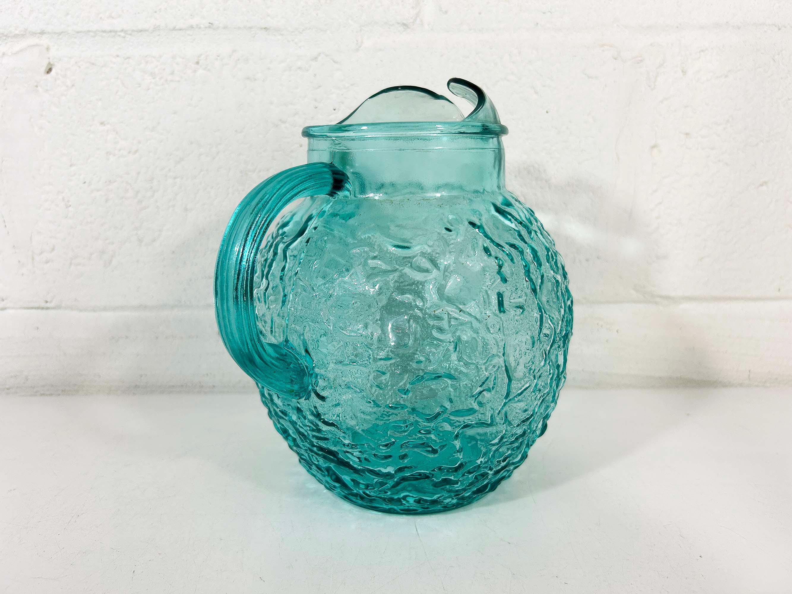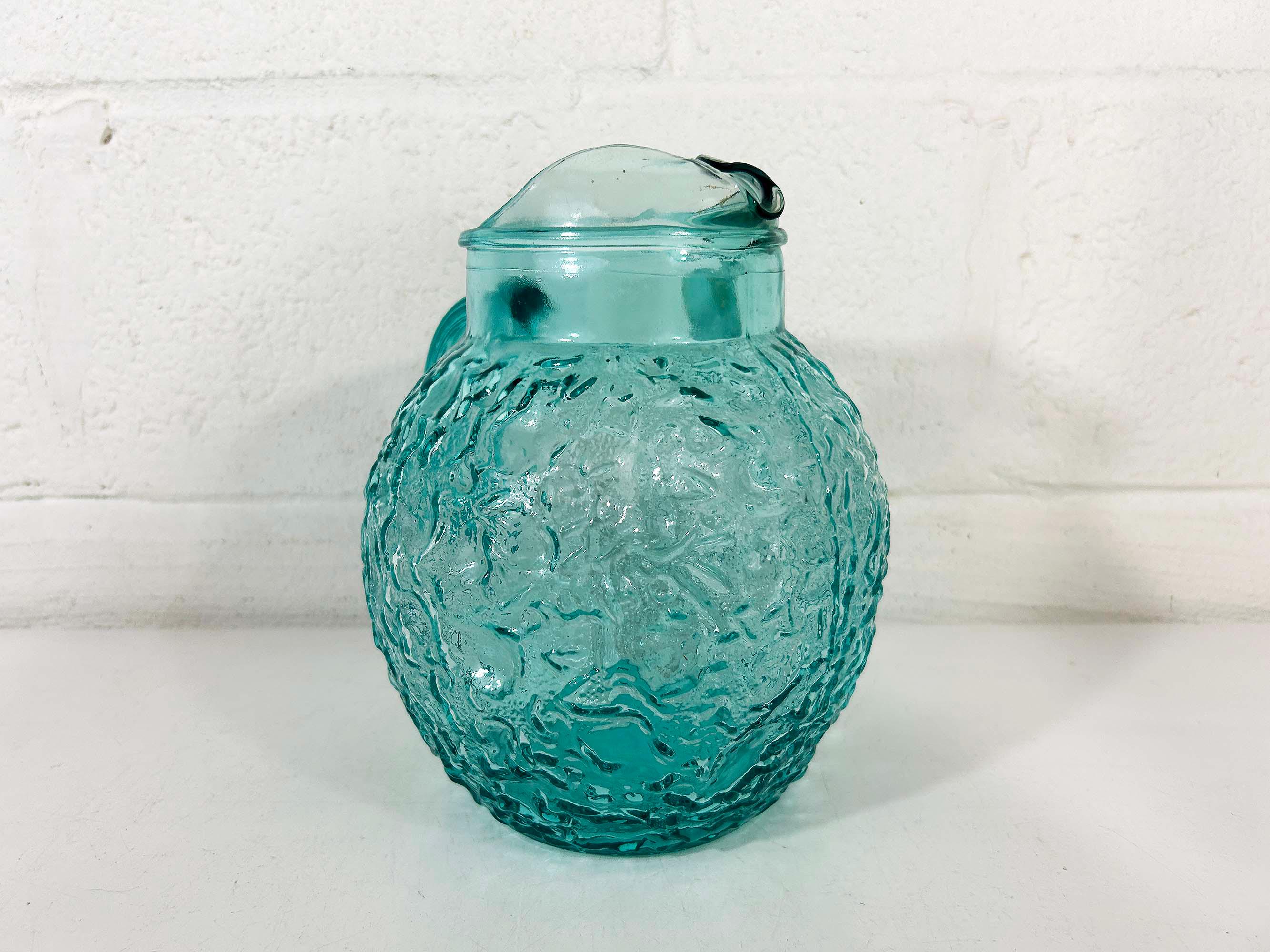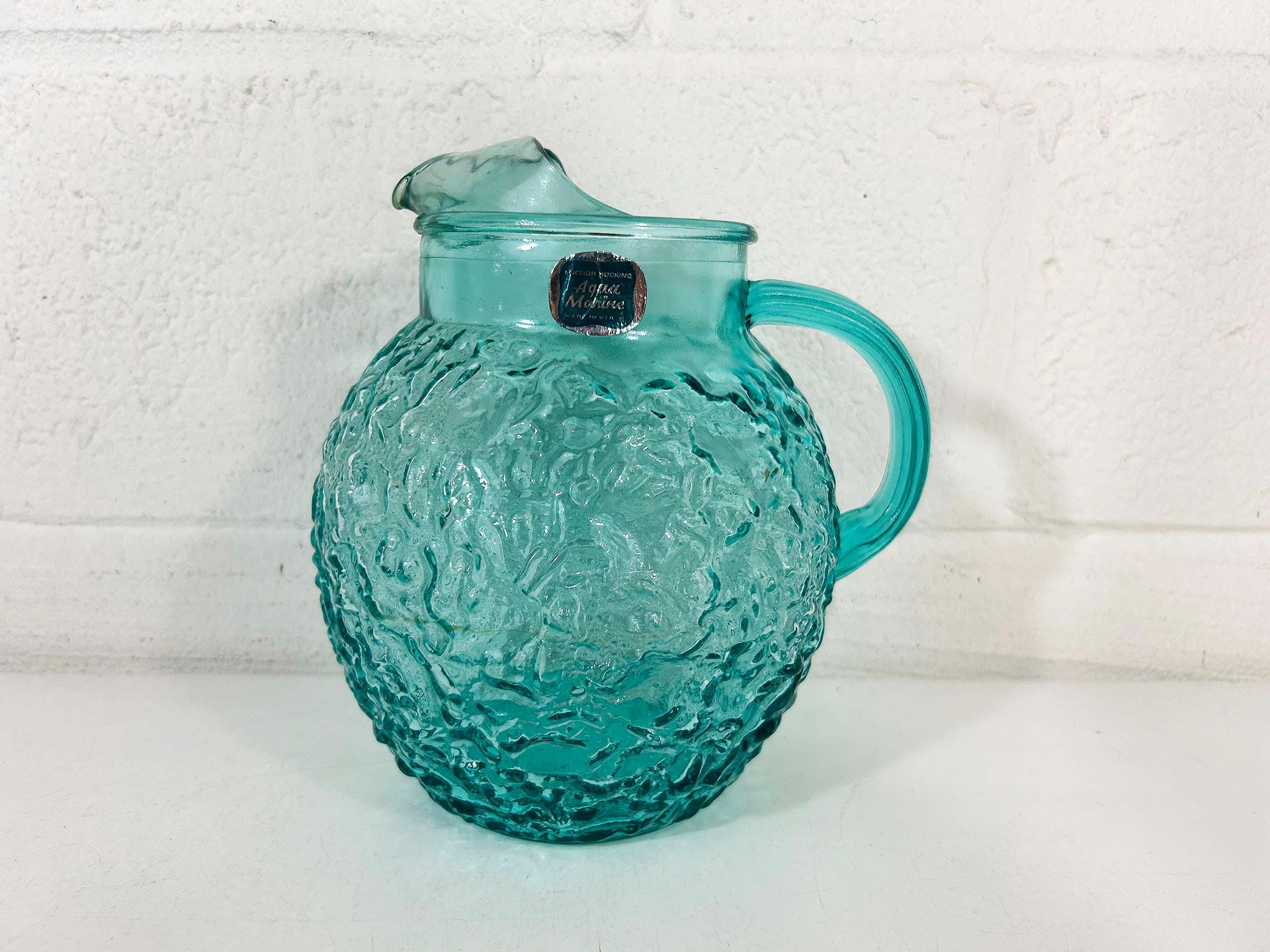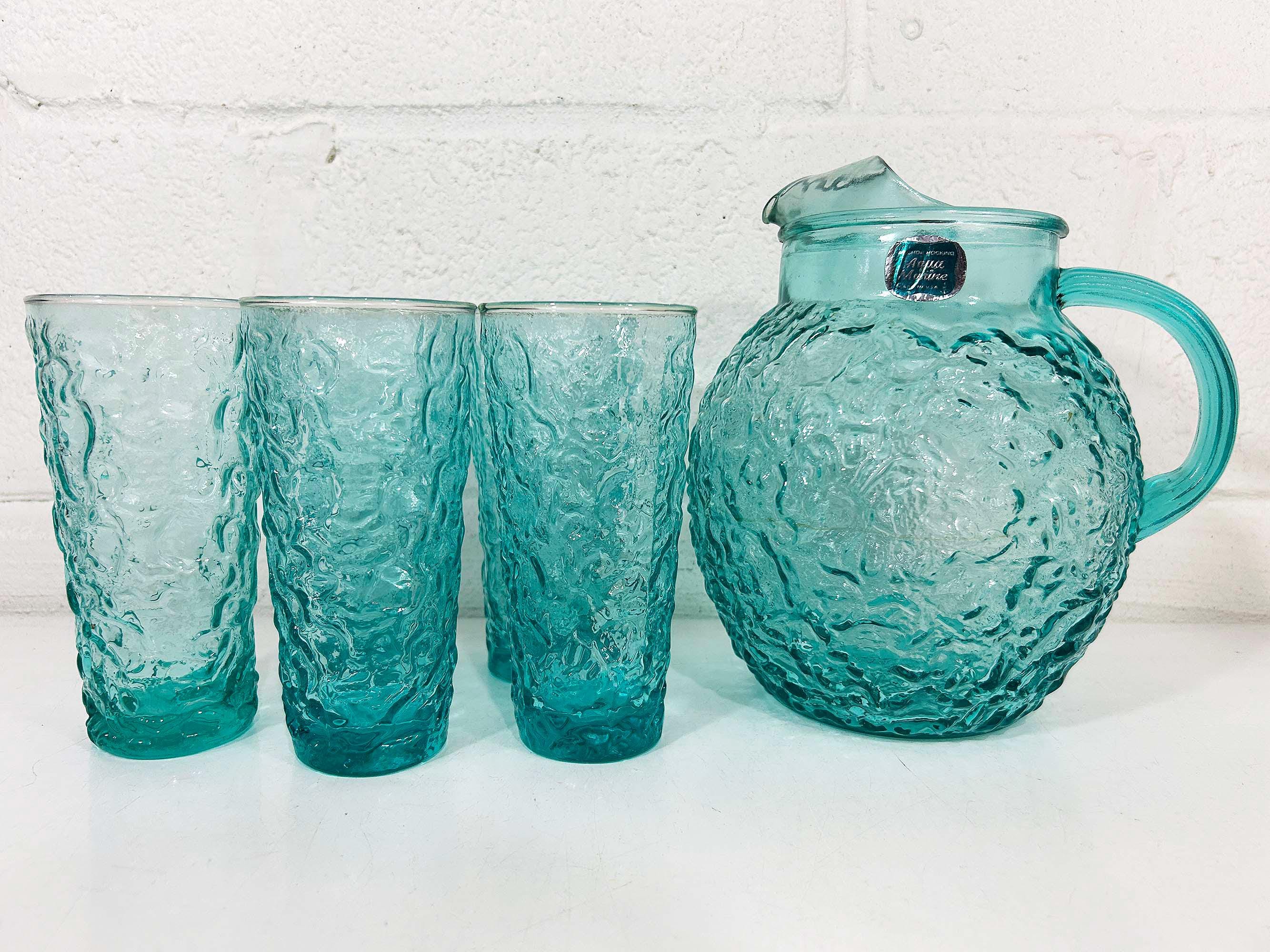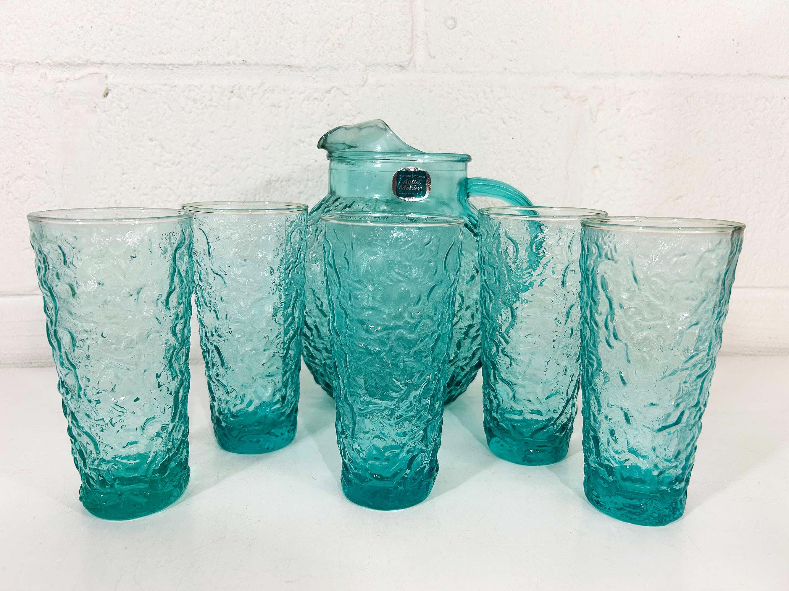 Super cute aqua marine blue glass pitcher and glassware matching set! Perfect for iced tea or lemonade in the summertime. In excellent vintage condition - the pitcher still has the original brand's sticker. The pitcher is about 8 1/2 inches tall, 7 inches wide in the middle, and 4 1/2 inches in diameter across the top. Each glass is approximately 6 1/2 inches tall and 3 inches in diameter across the top. The glasses each hold approximately 16 ounces of liquid when filled to the brim. The pitcher holds approximately ounces of 72 liquid when filled to the brim.