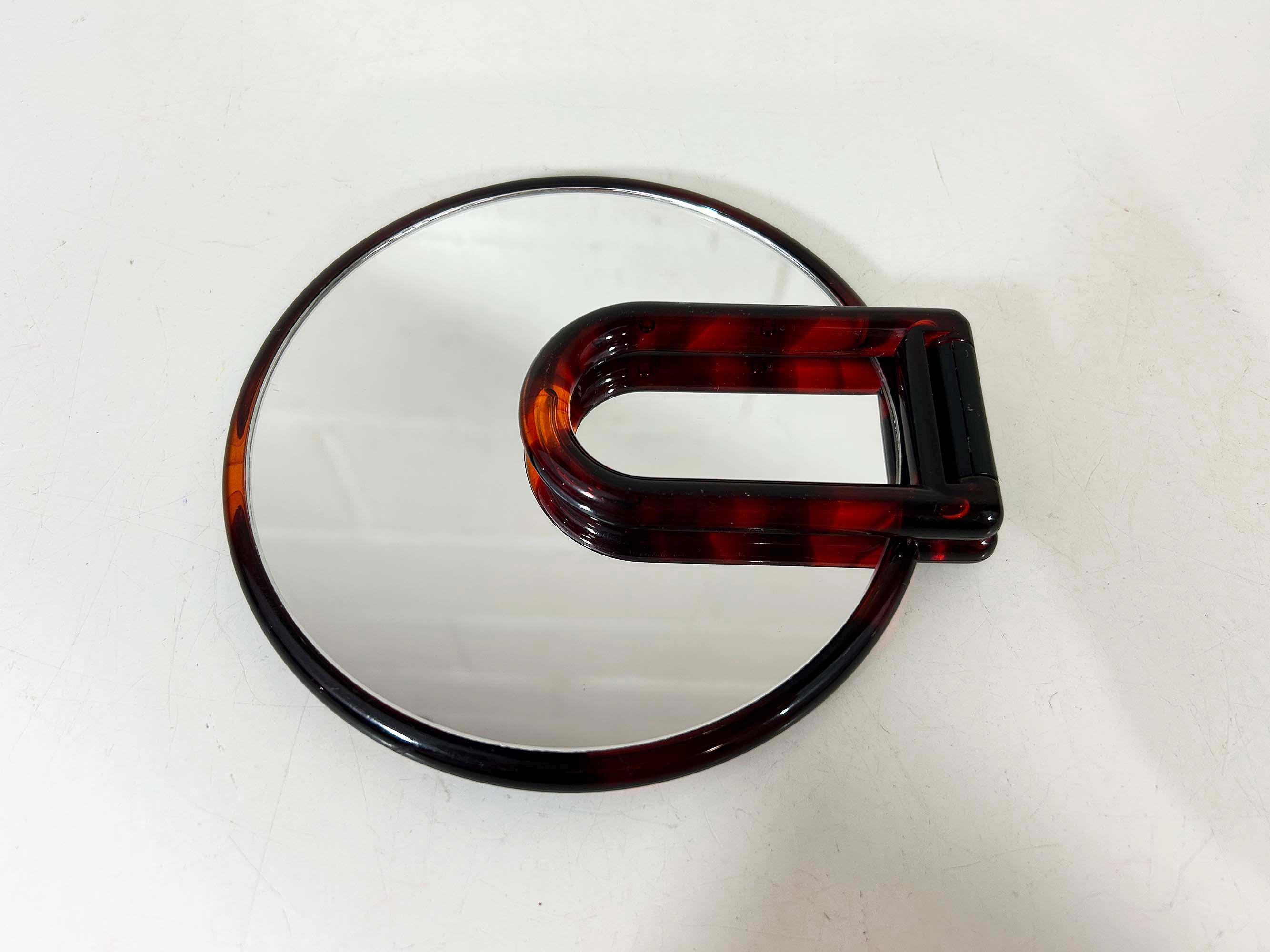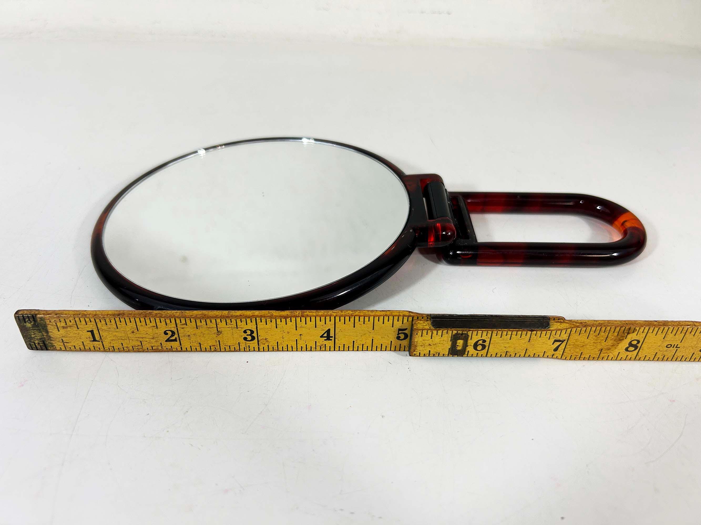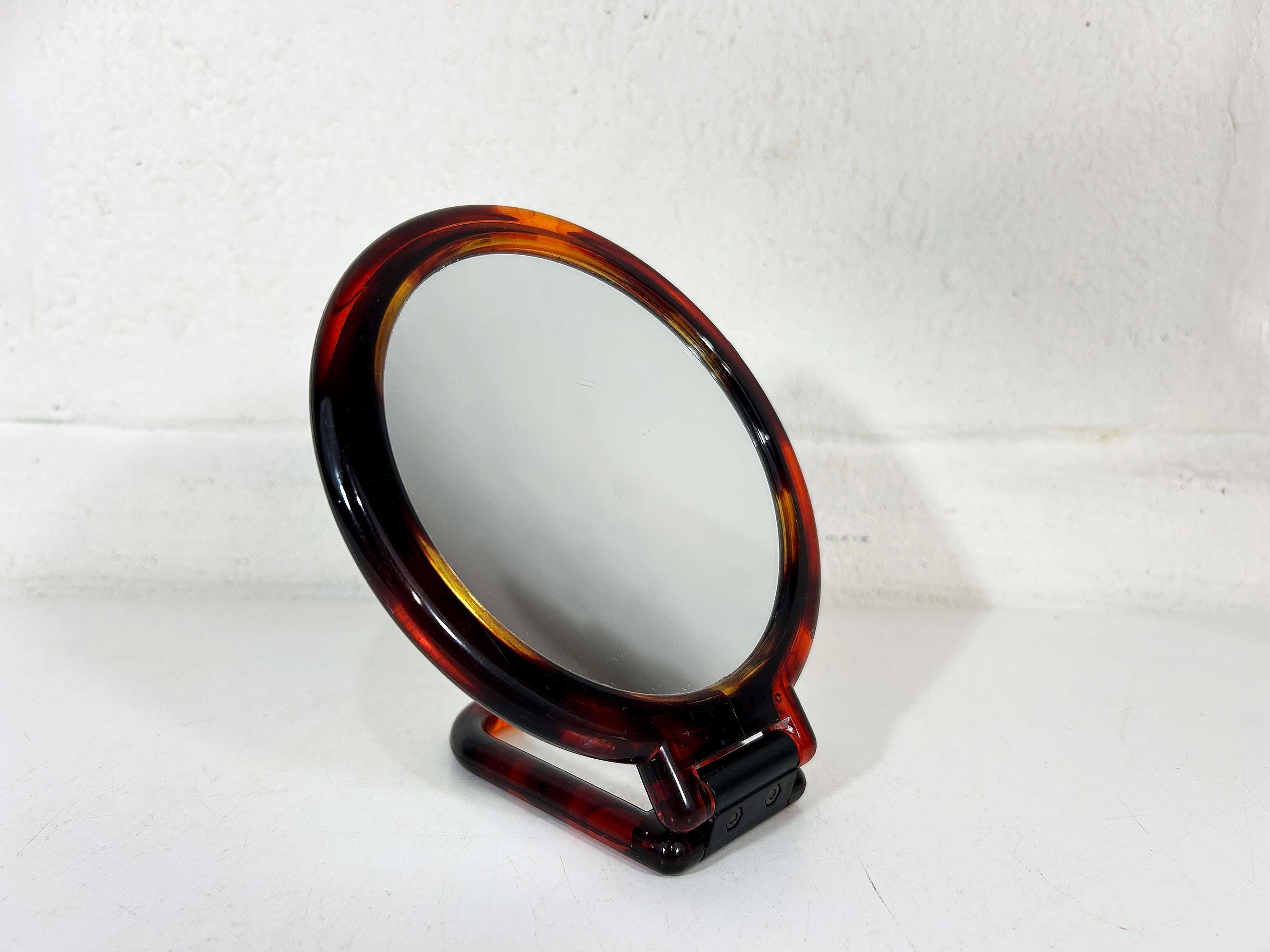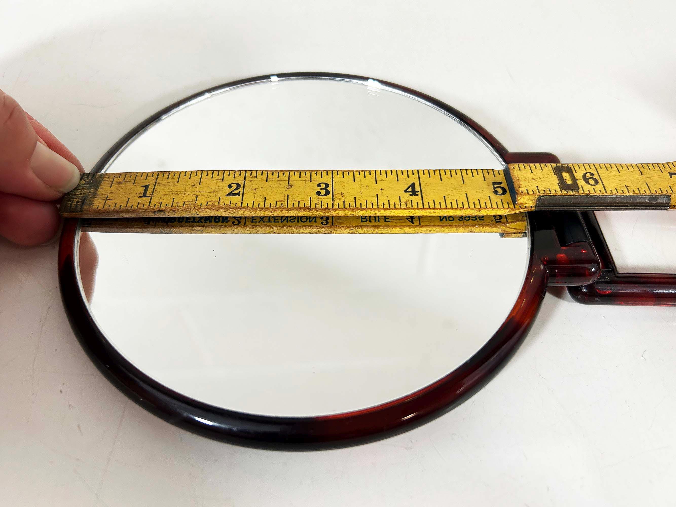 Great vintage tabletop or hand held makeup mirror. Its in great condition with some scratches on the plastic. One side is a regular mirror, the other side is magnifying. It is approximately 5 inches in diameter.