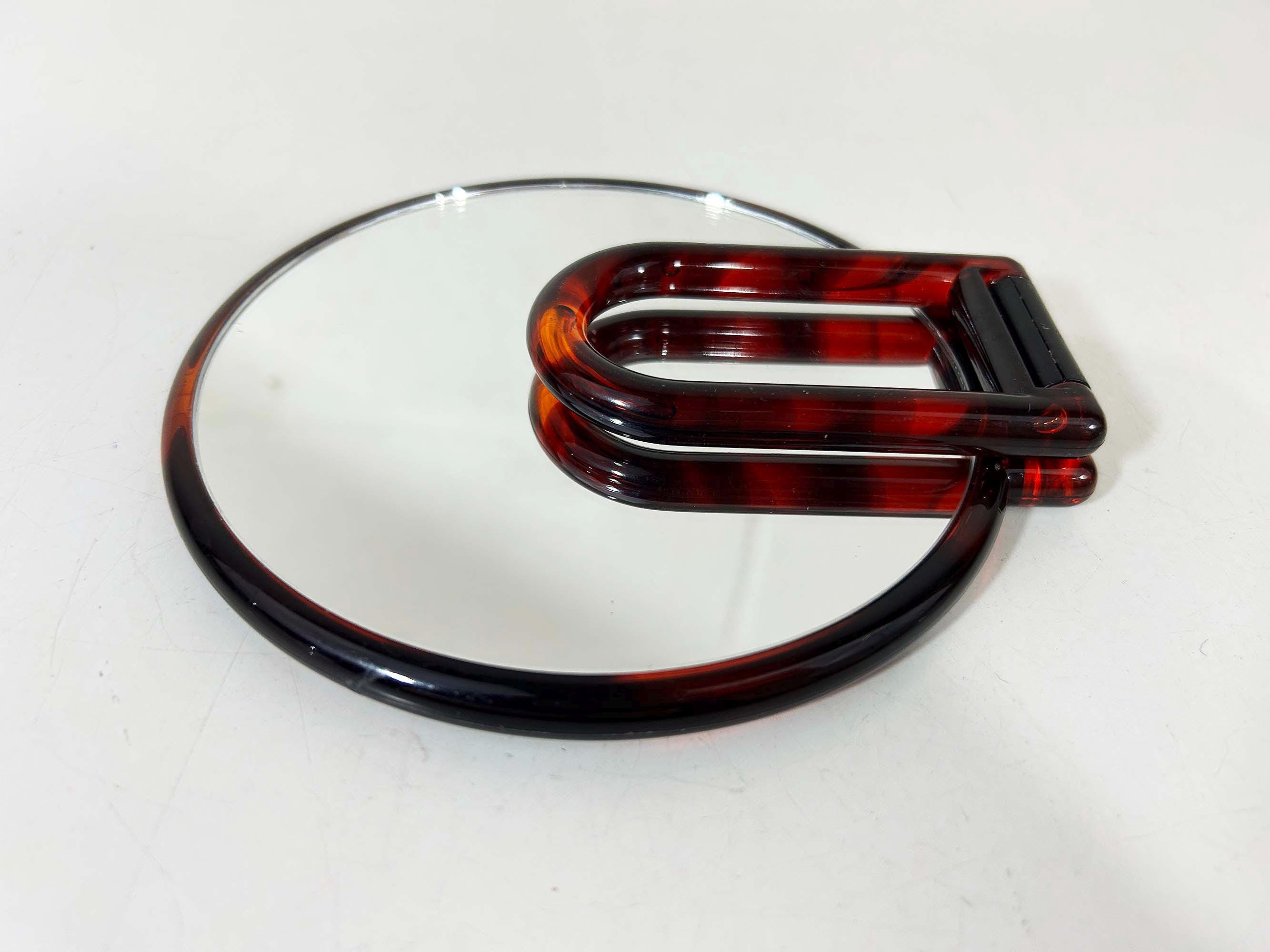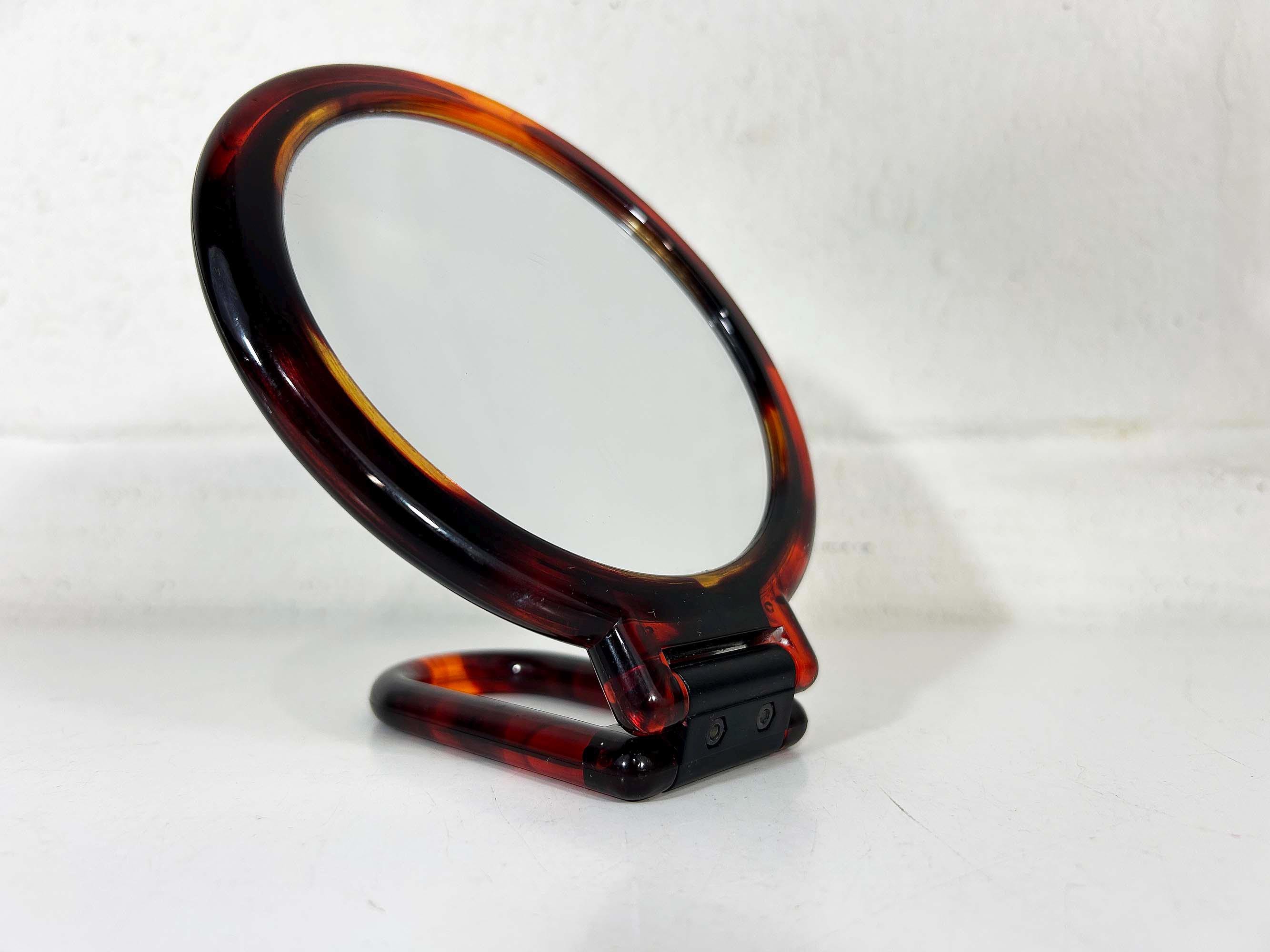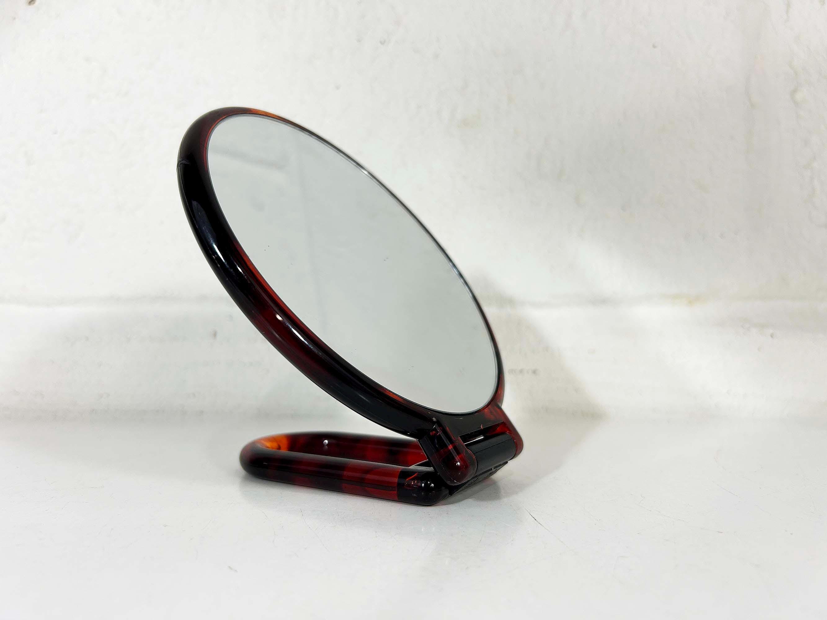 Great vintage tabletop or hand held makeup mirror. Its in great condition with some scratches on the plastic. One side is a regular mirror, the other side is magnifying. It is approximately 5 inches in diameter.