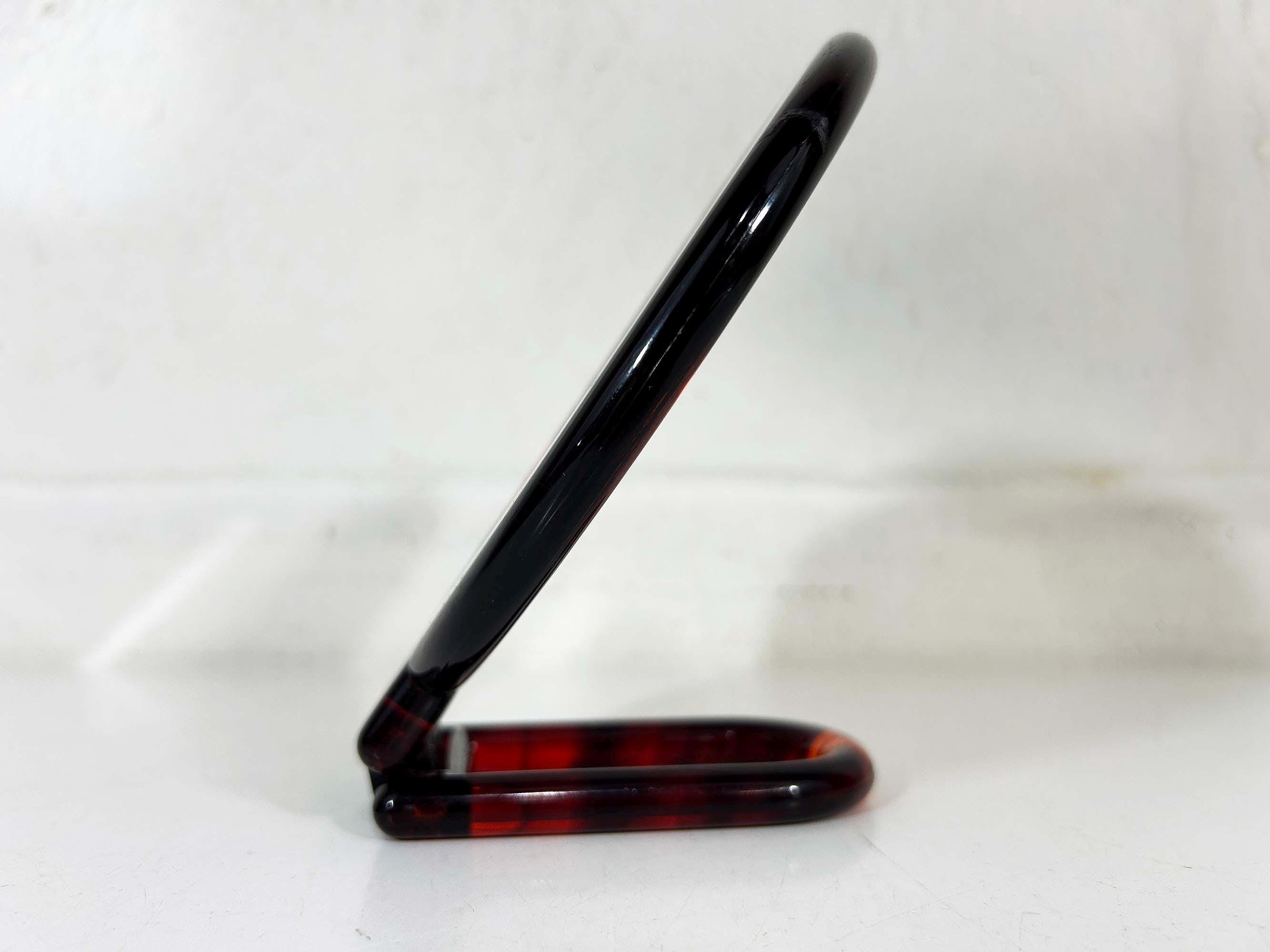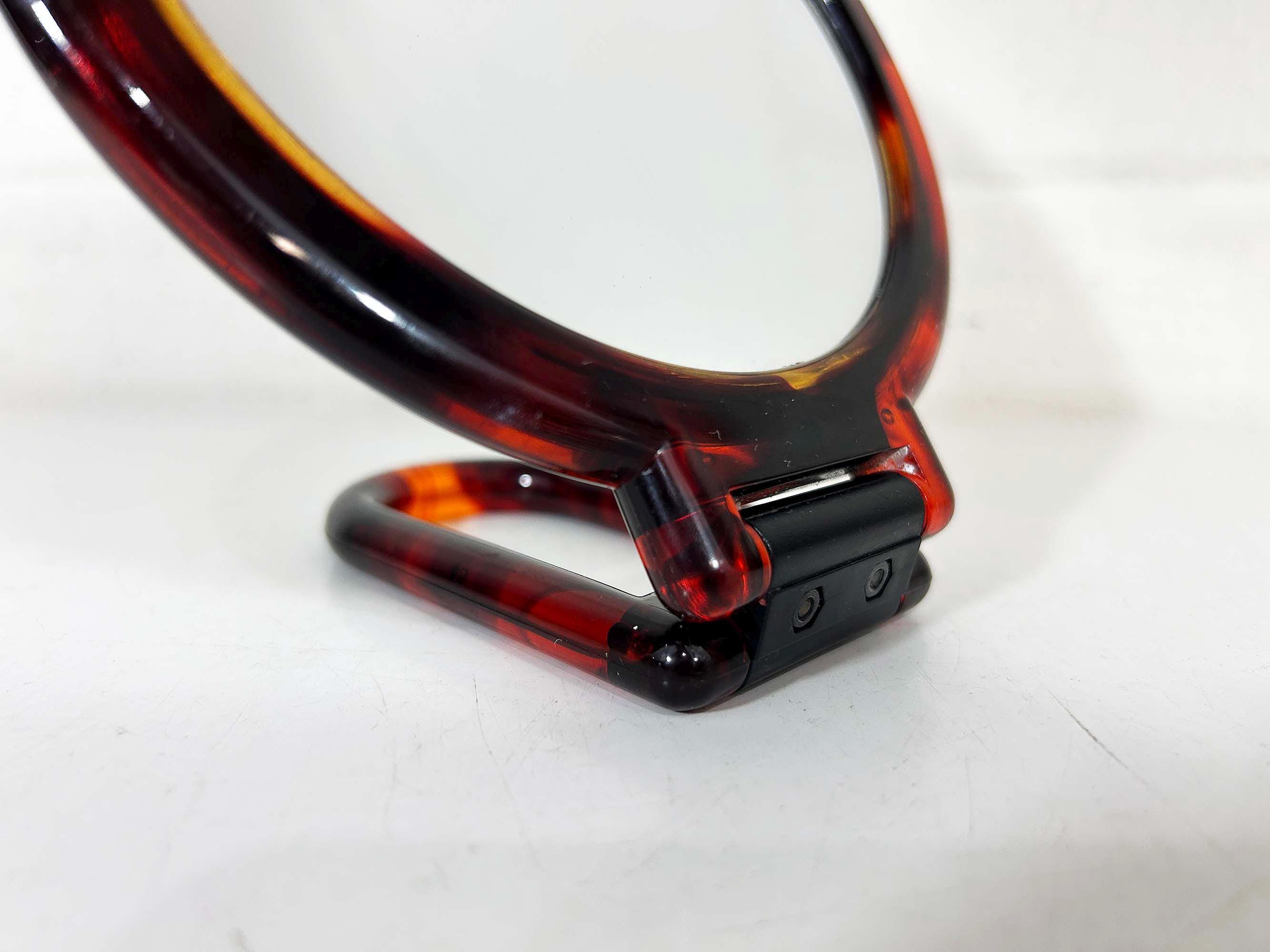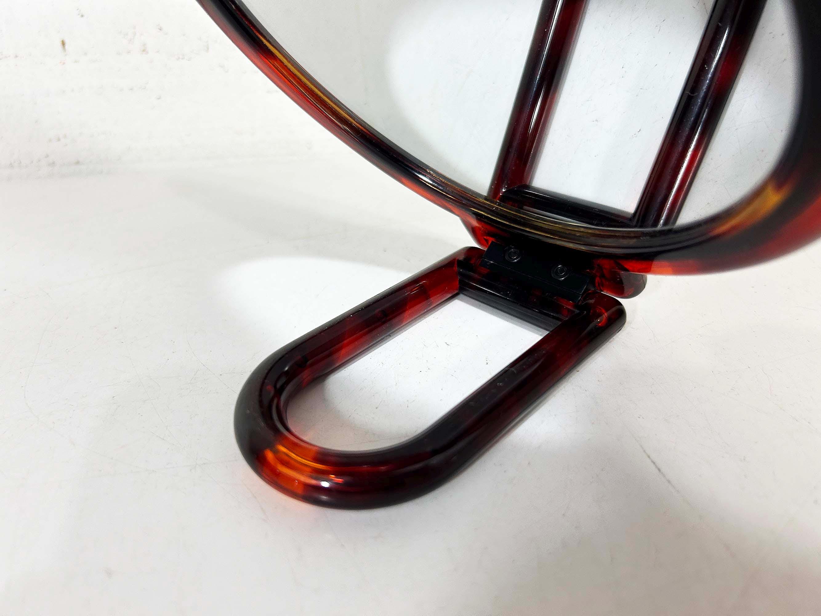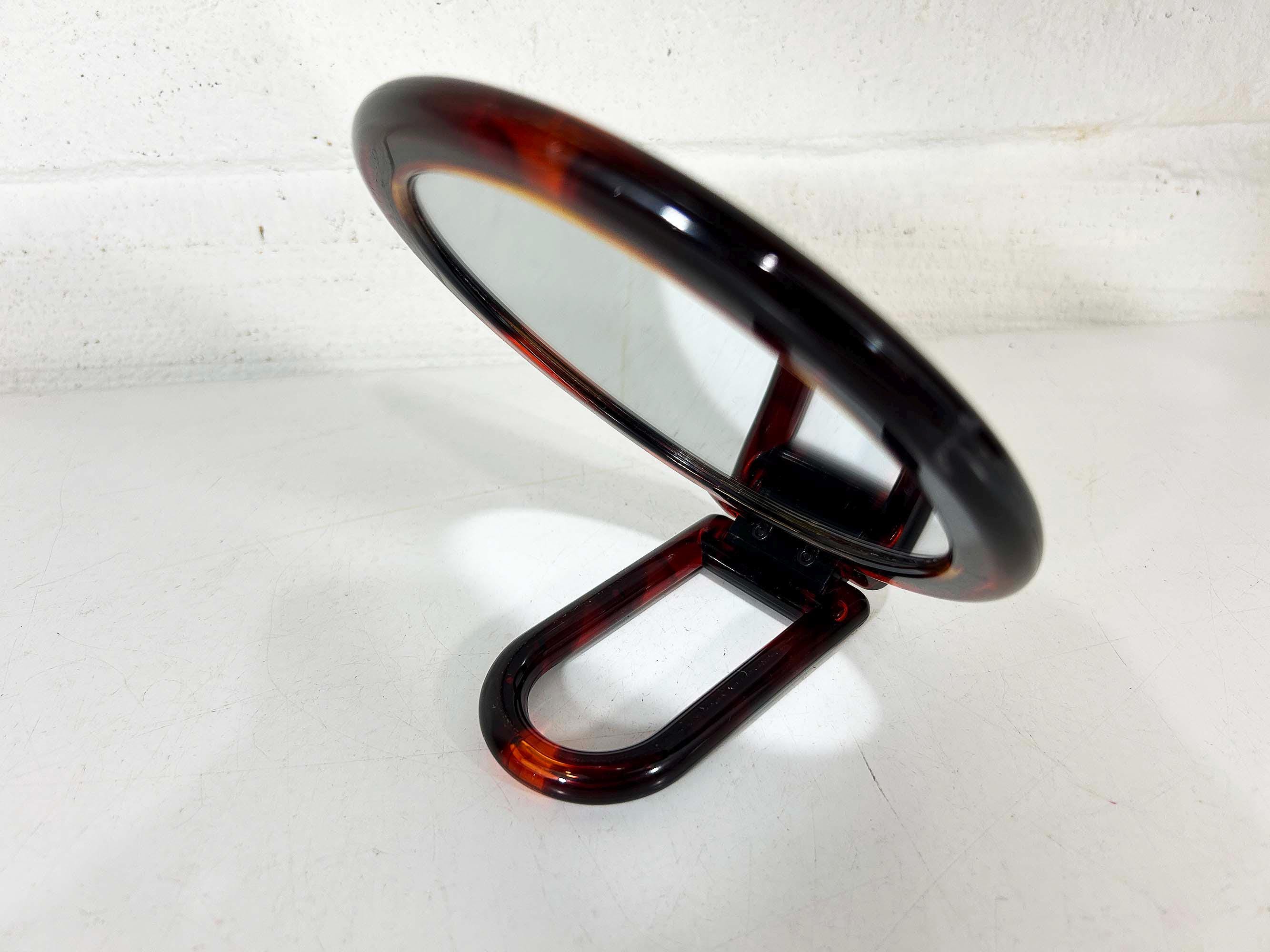 Great vintage tabletop or hand held makeup mirror. Its in great condition with some scratches on the plastic. One side is a regular mirror, the other side is magnifying. It is approximately 5 inches in diameter.