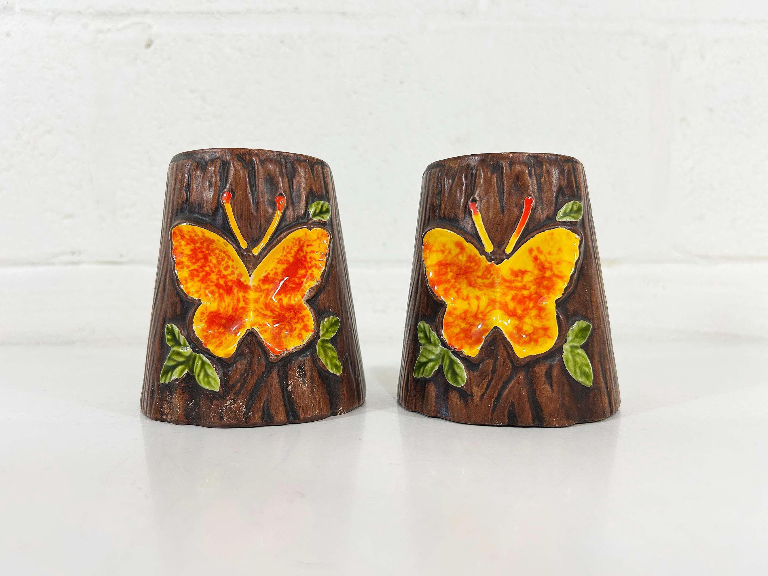 Cute and kitschy butterfly salt and pepper shakers! They are in great condition with no significant flaws. Perfect for your vintage kitchen! They still have their rubber stoppers. The shakers are approximately 4 inches tall and 3 1/2 inches in diameter at the base.
