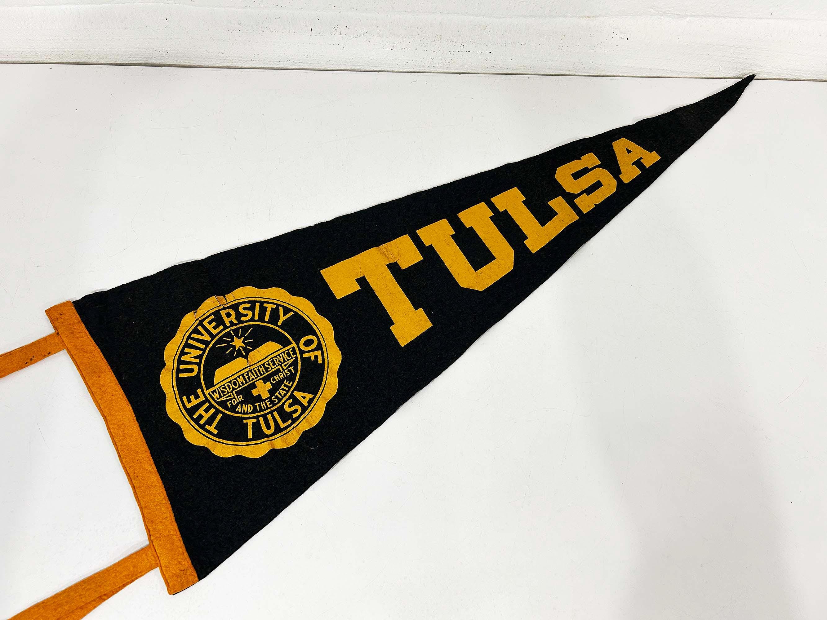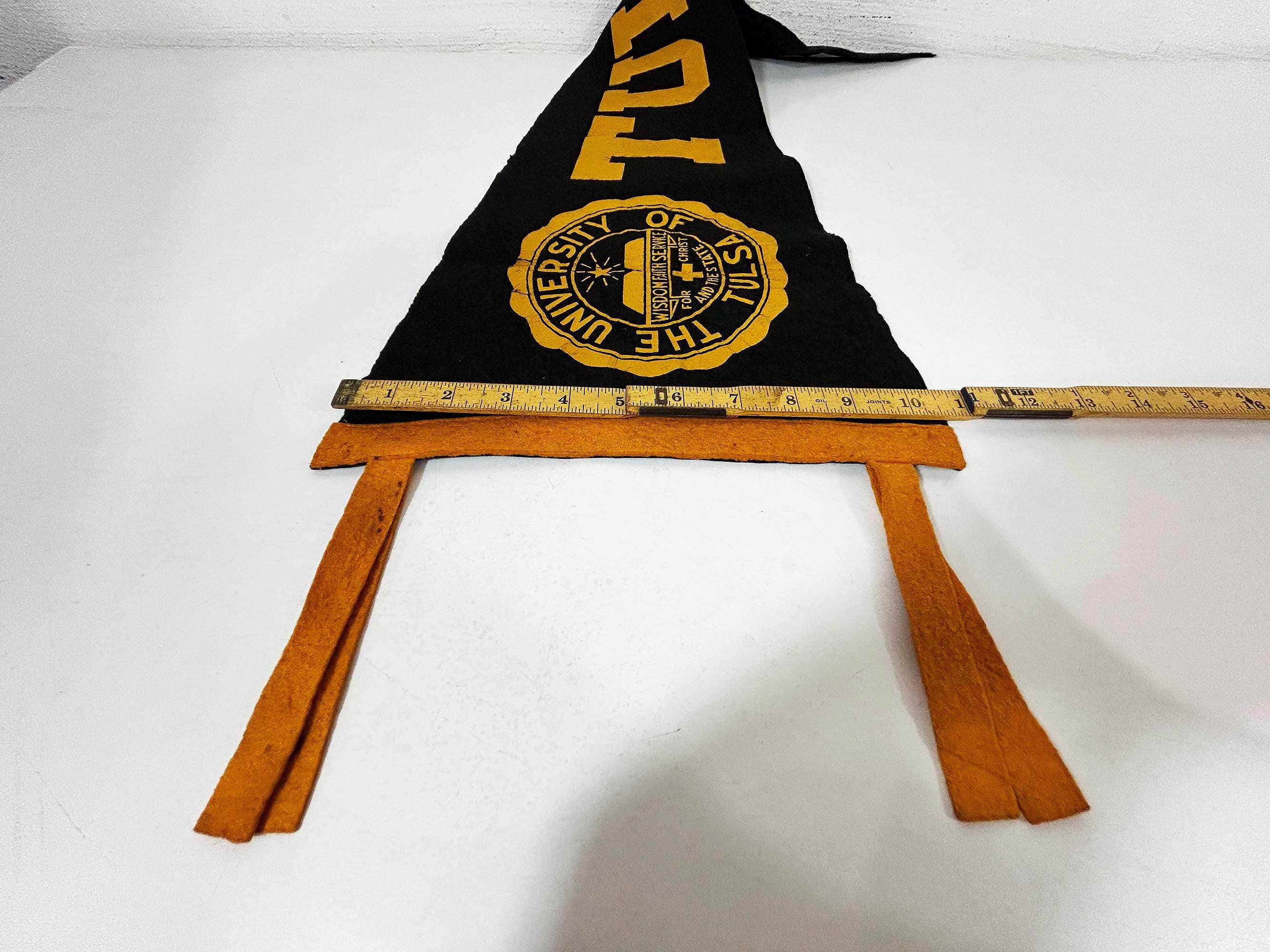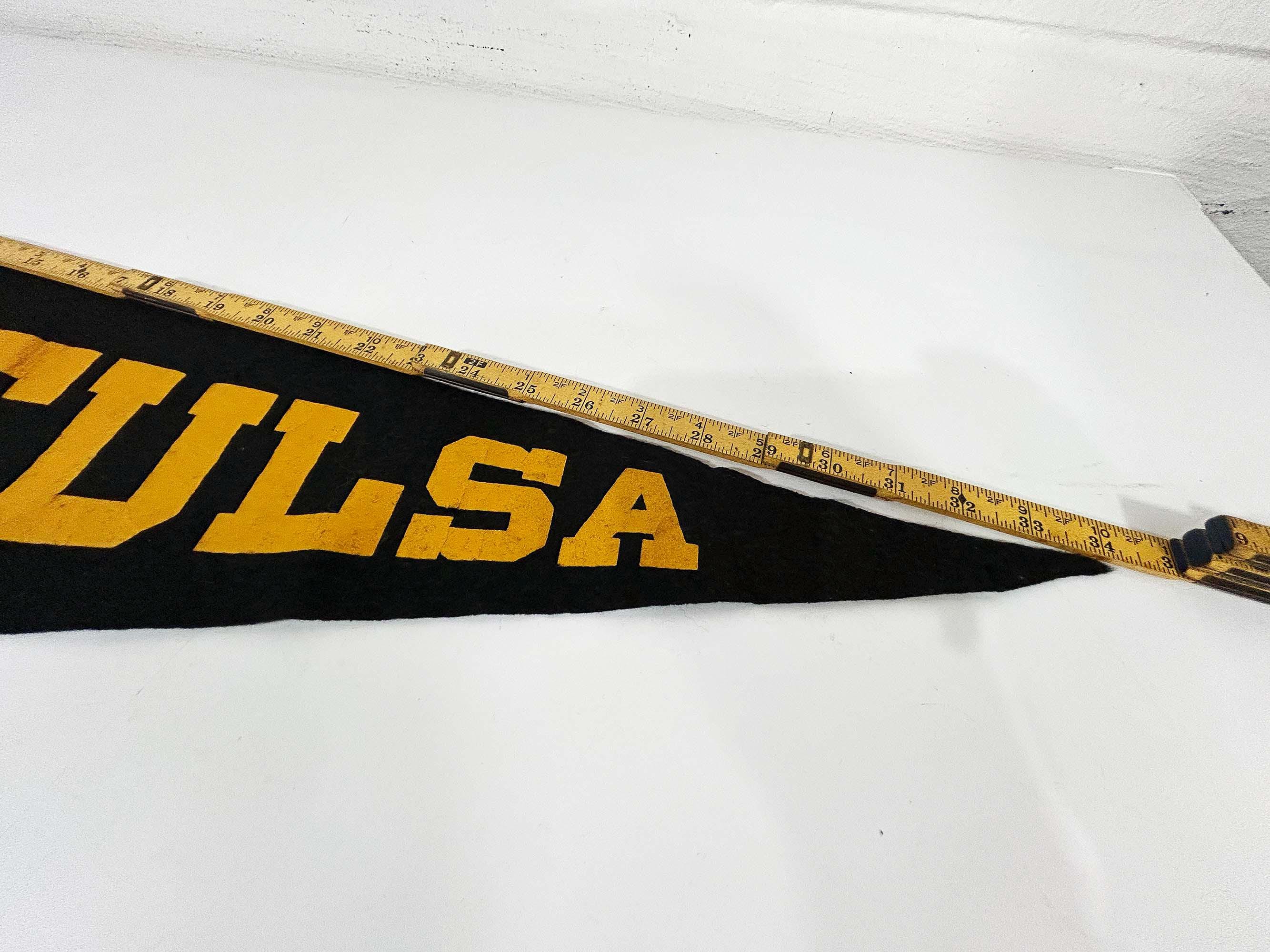 Really neat large vintage University of Tulsa pennant that would look great in your retro home! It is in good shape with a few push pin holes from being hung on a wall. There is some cracking on the design - please be sure to inspect all photos closely. The pennant is 34 inches long and 10 1/2 inches wide at it's widest point.
