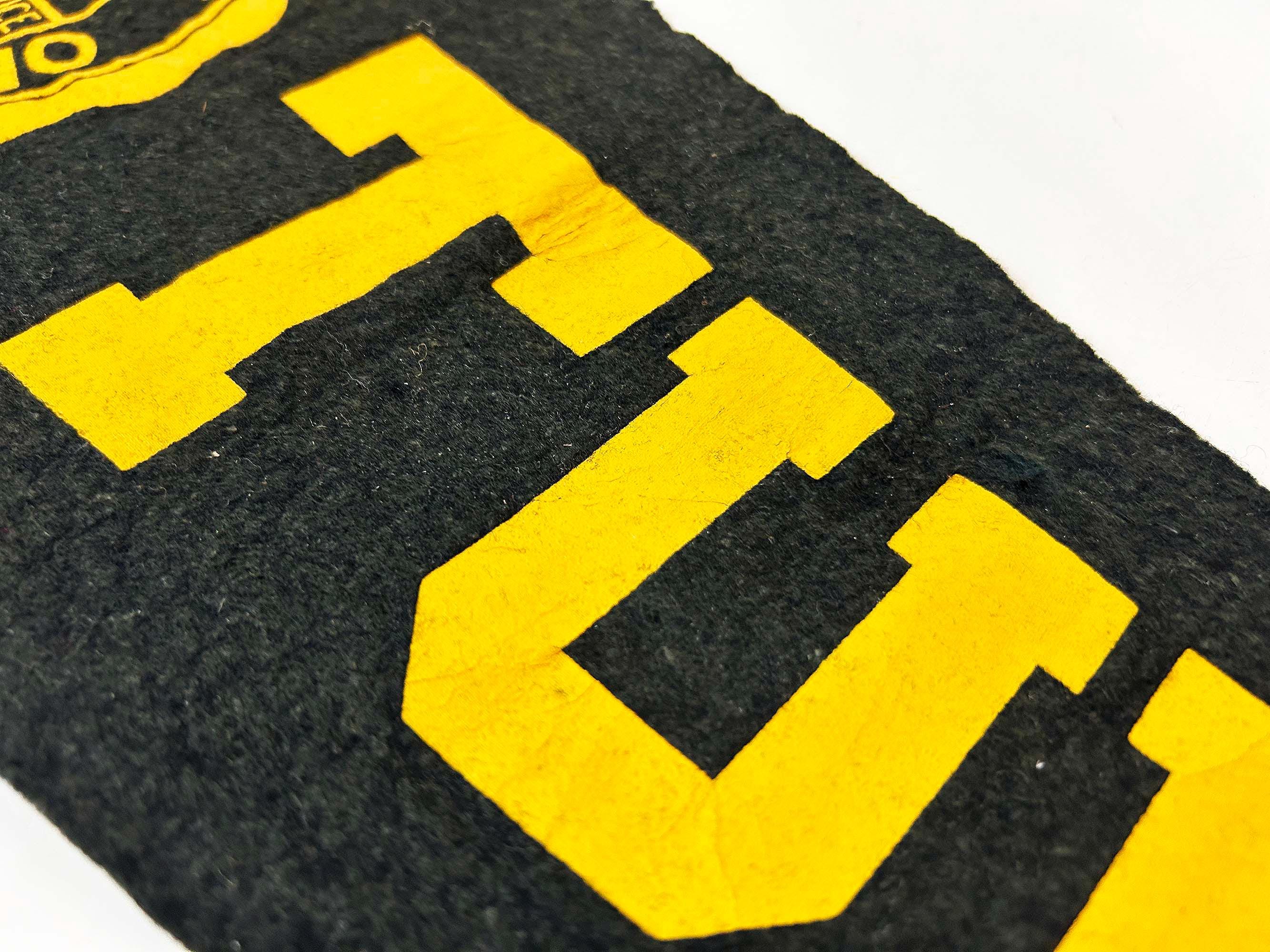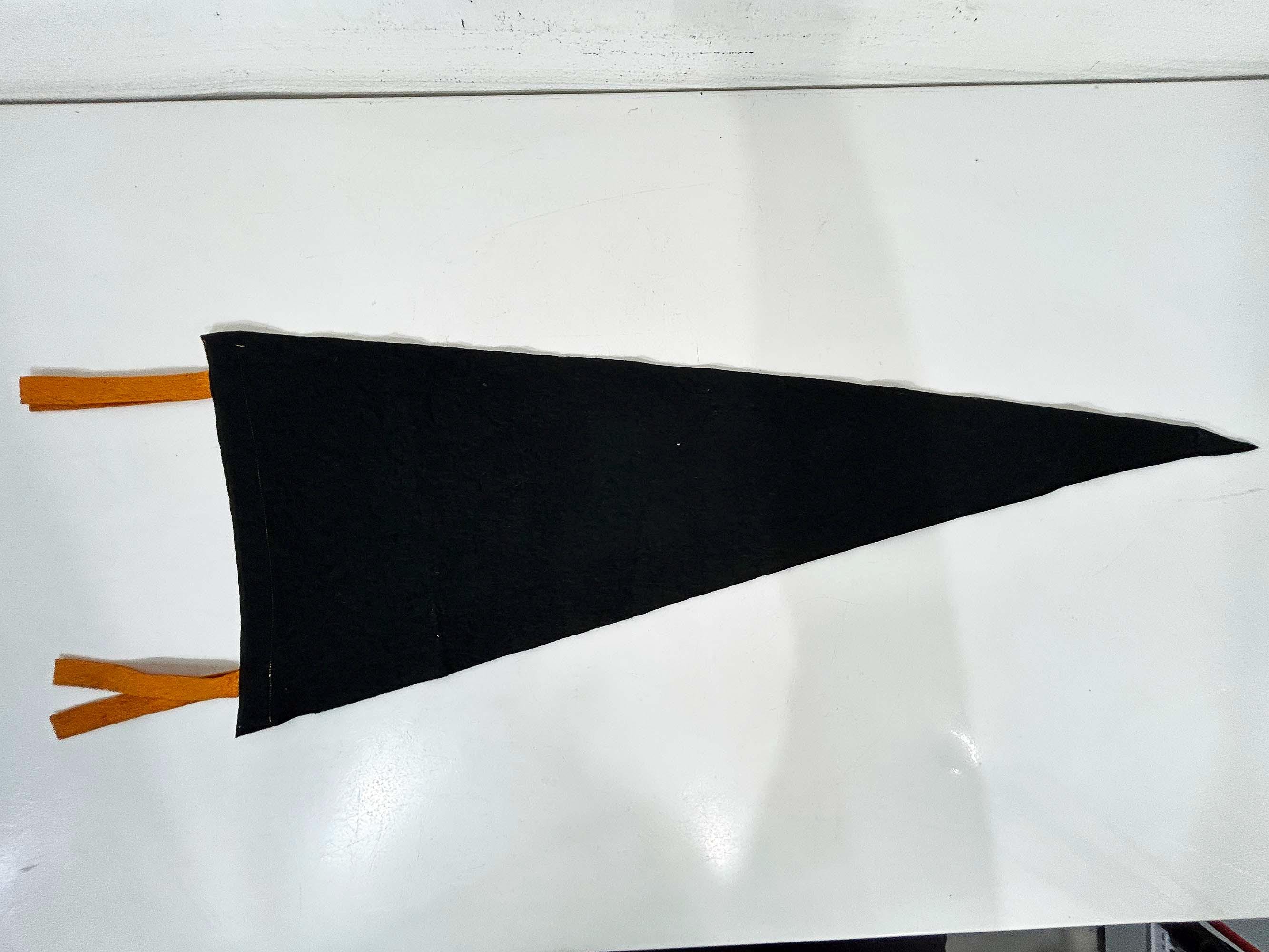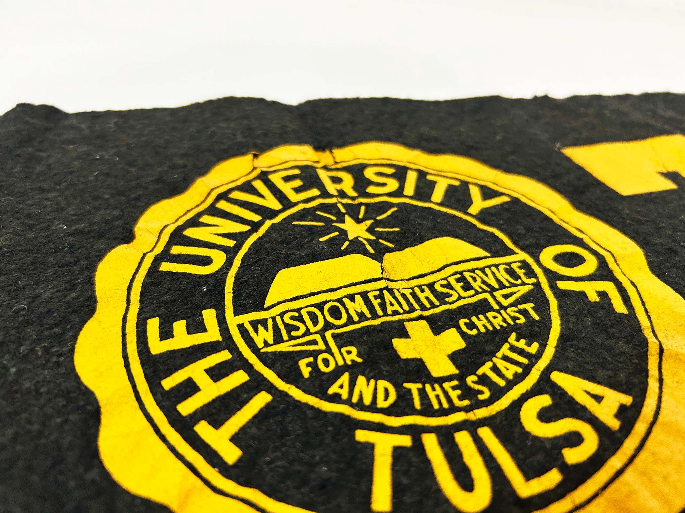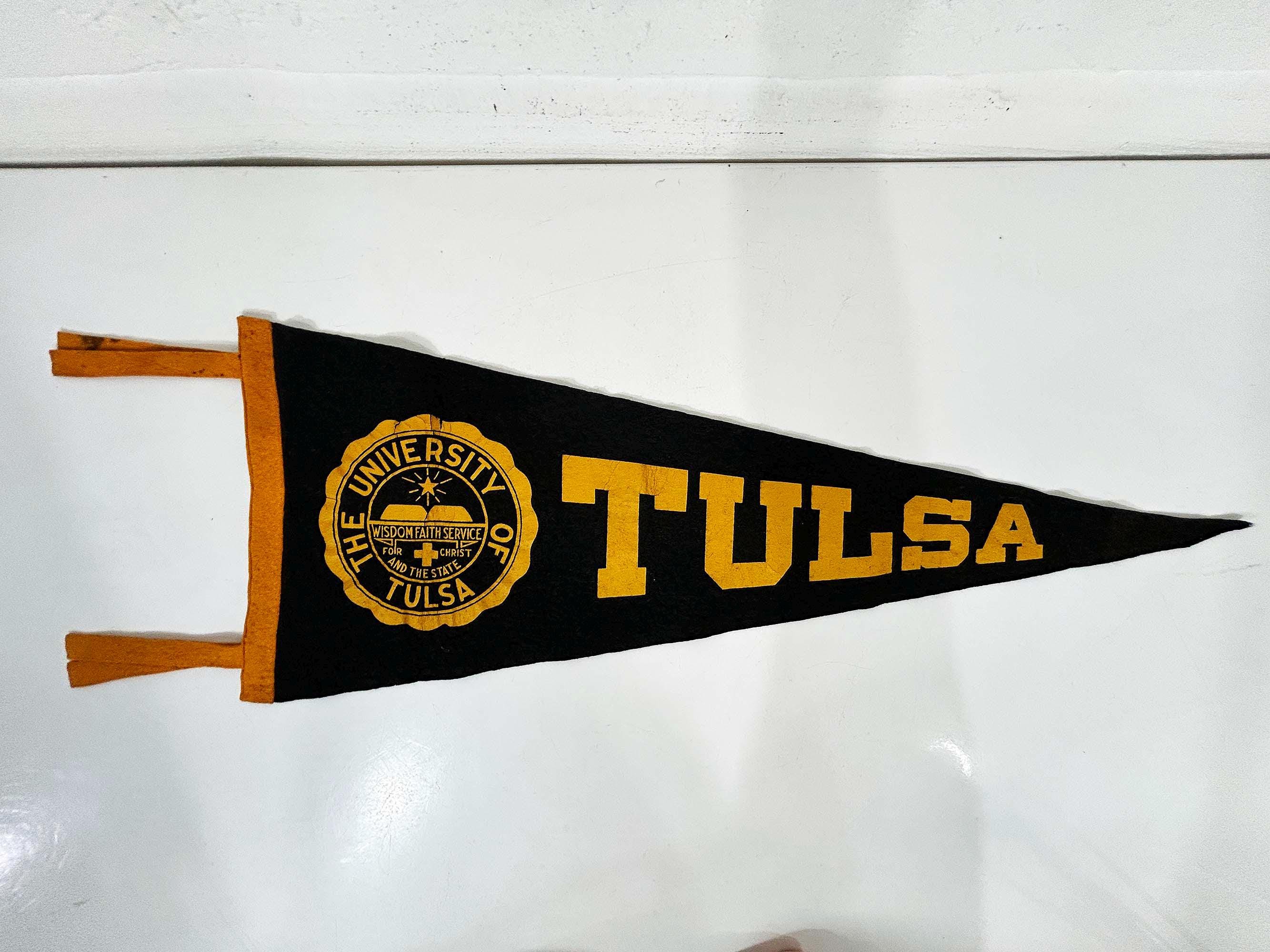 Really neat large vintage University of Tulsa pennant that would look great in your retro home! It is in good shape with a few push pin holes from being hung on a wall. There is some cracking on the design - please be sure to inspect all photos closely. The pennant is 34 inches long and 10 1/2 inches wide at it's widest point.