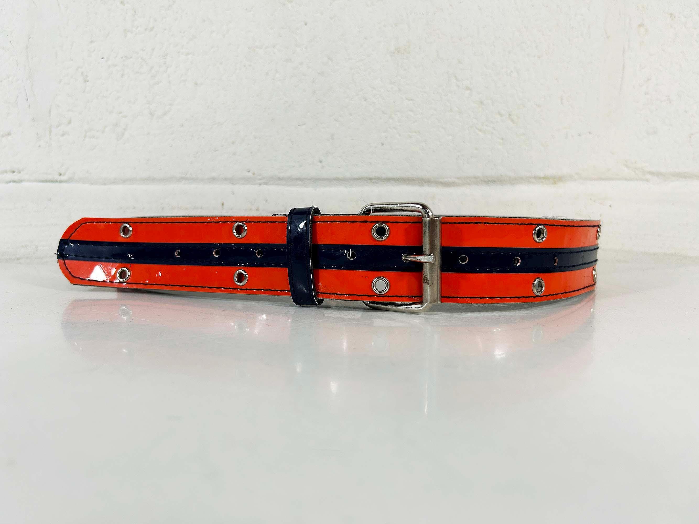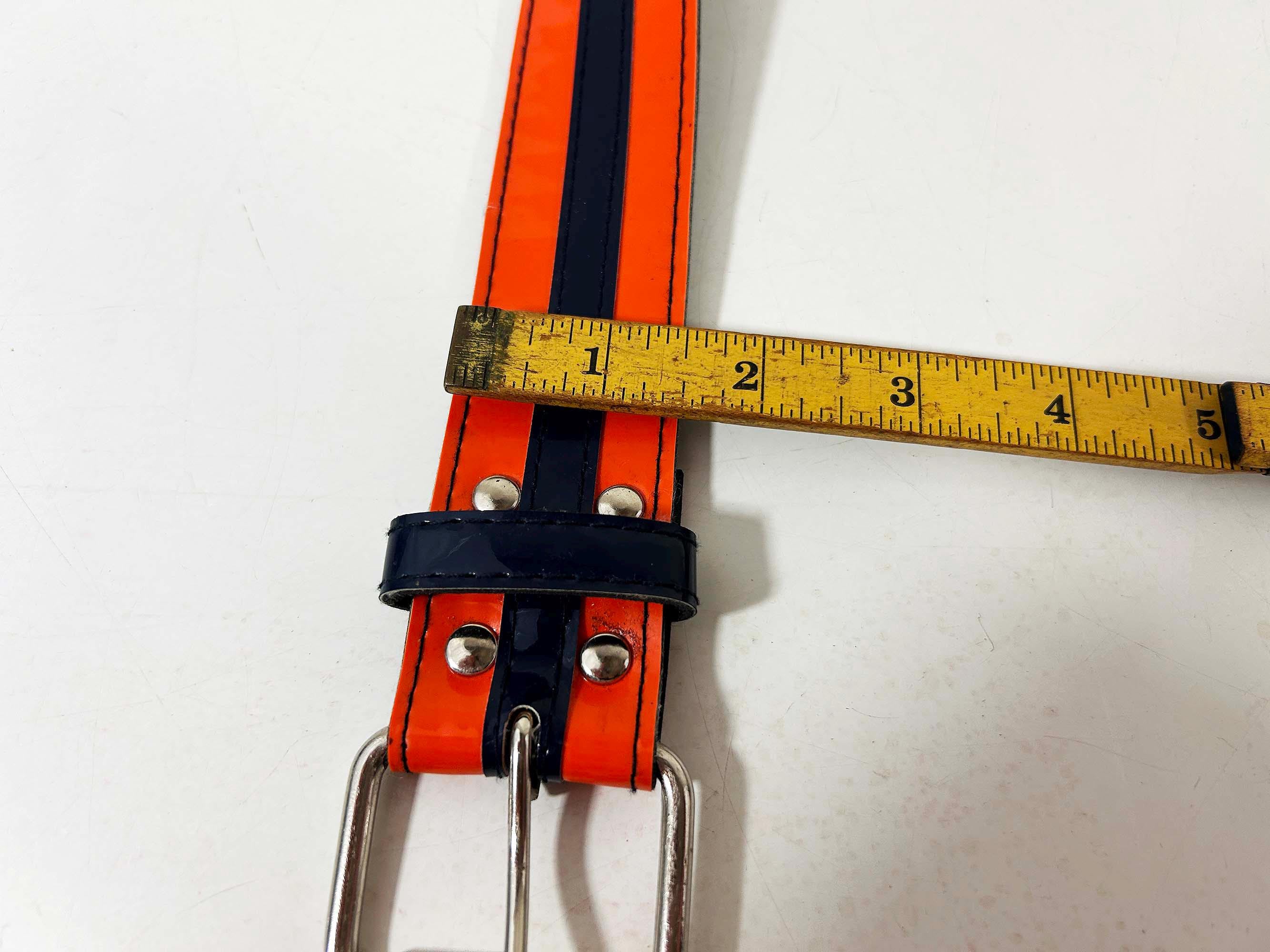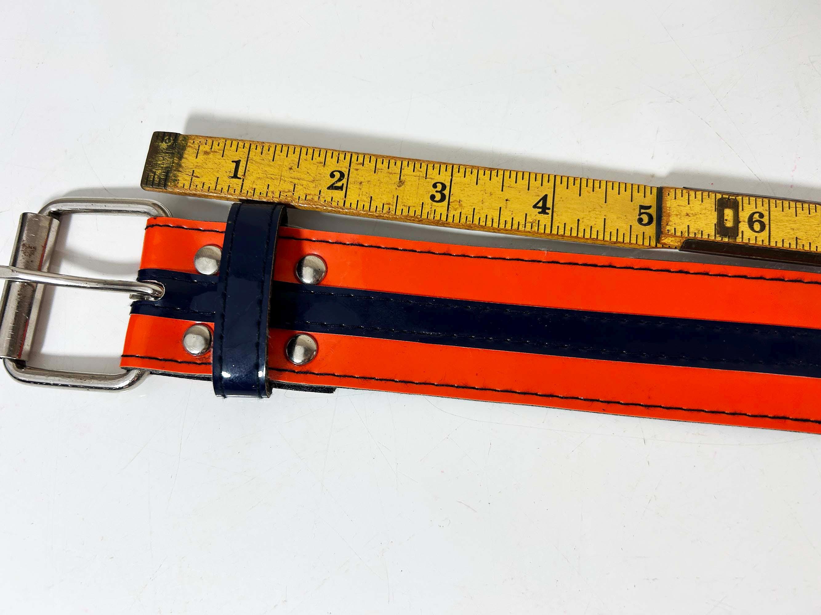 Super cute mod faux patent leather striped belt with a silver metal buckle. Super cute and in great shape. It is approximately 36 inches from end to end of the belt and 1 1/2 inches wide.