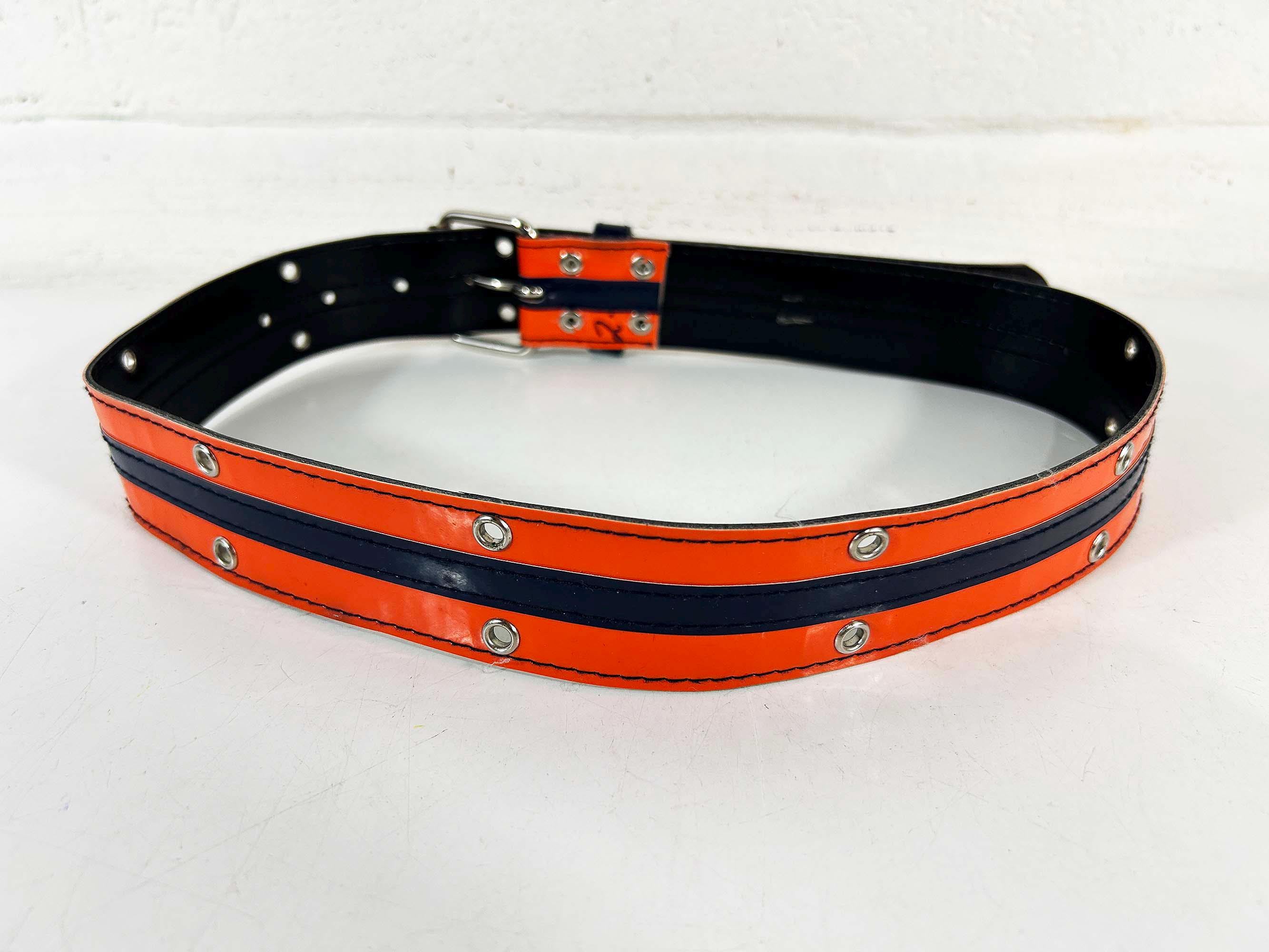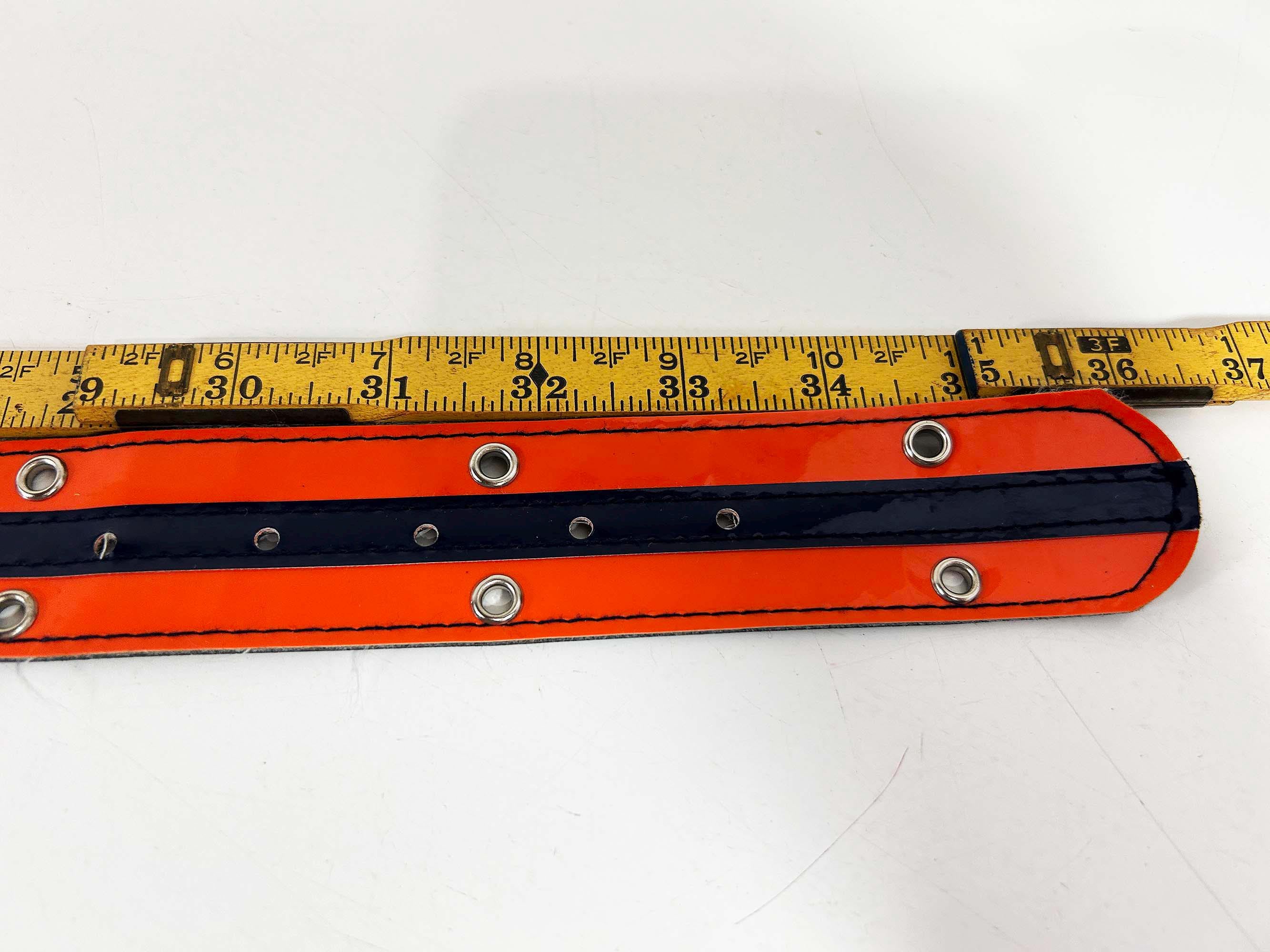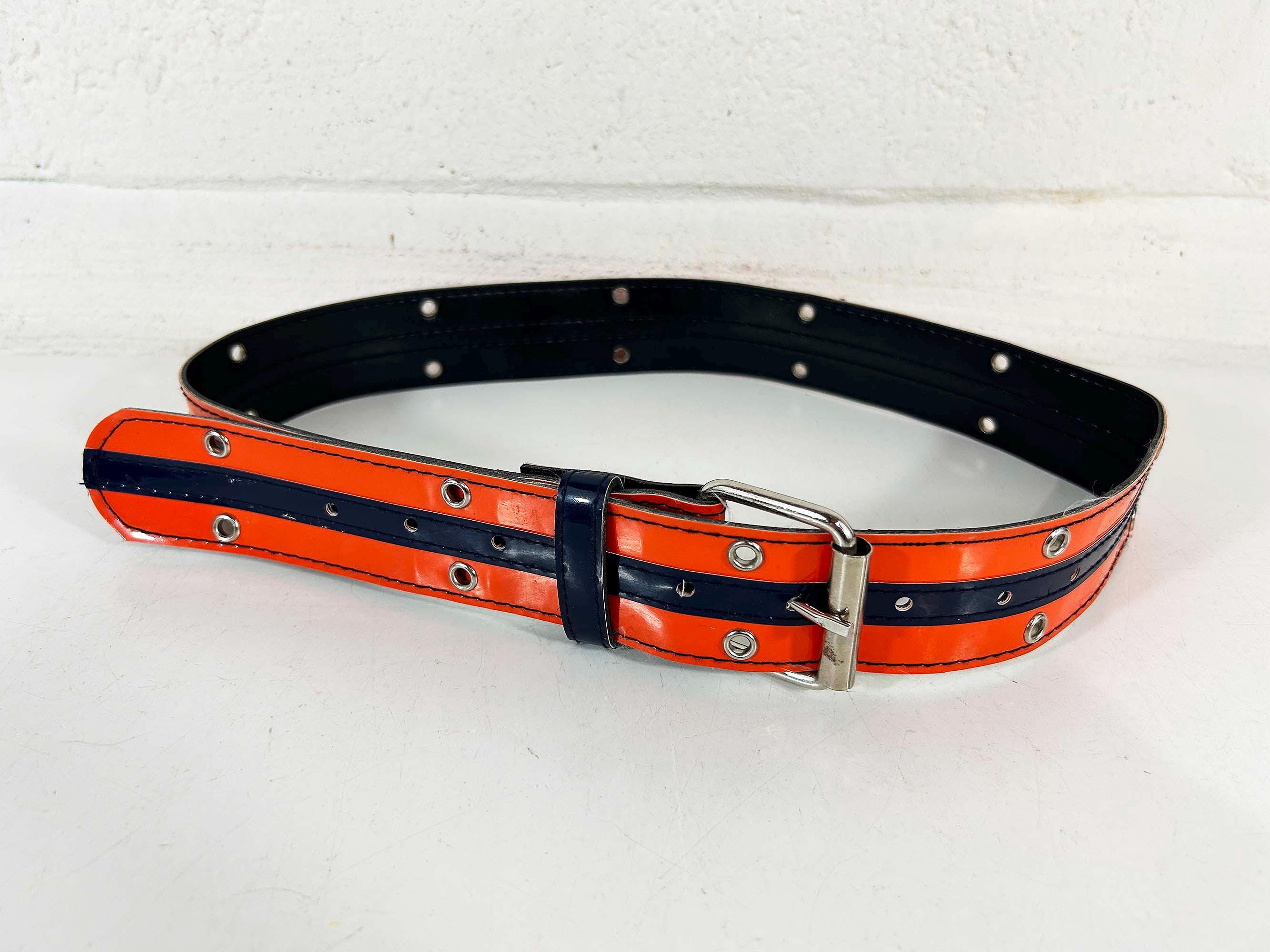 Super cute mod faux patent leather striped belt with a silver metal buckle. Super cute and in great shape. It is approximately 36 inches from end to end of the belt and 1 1/2 inches wide.