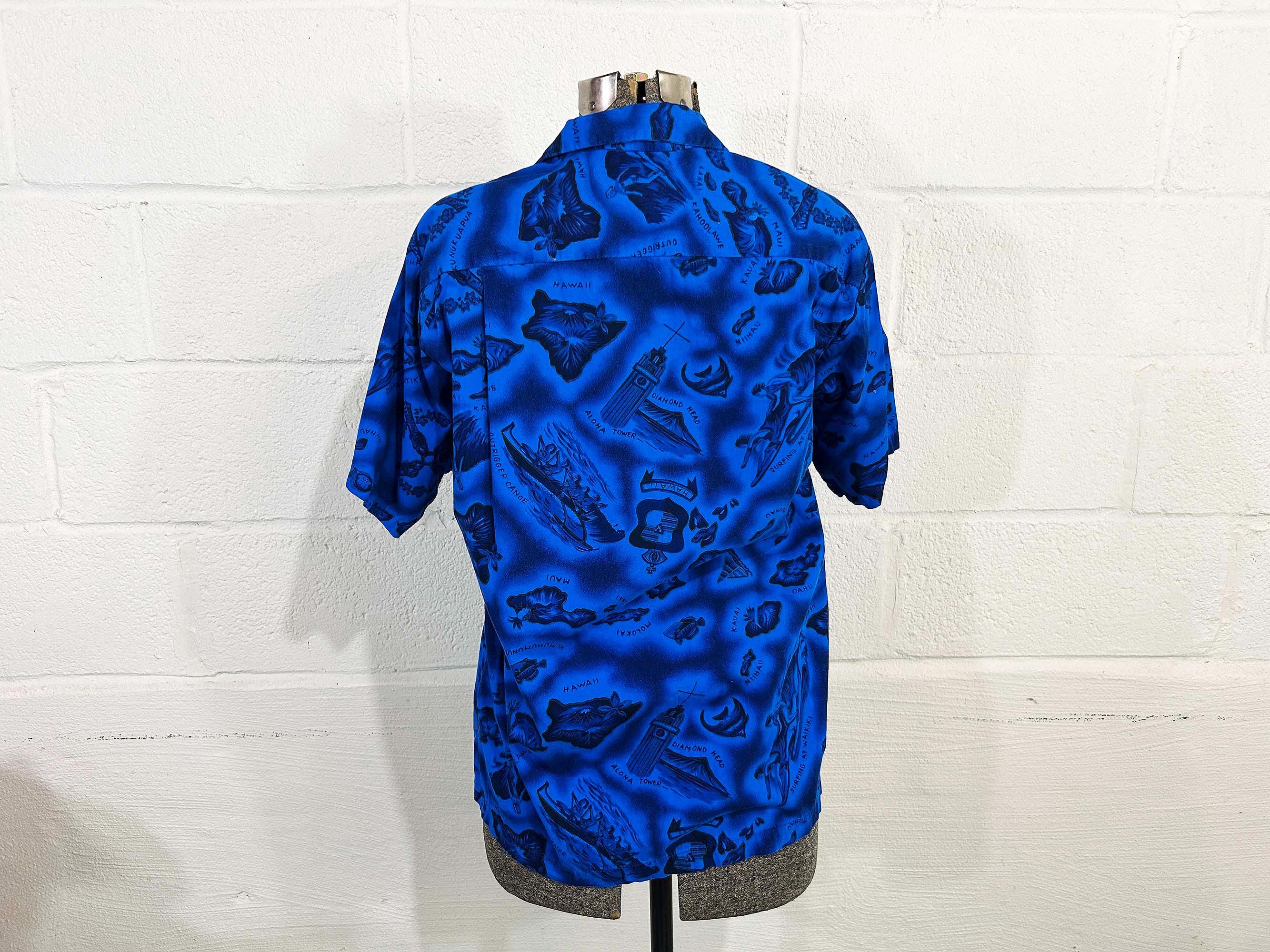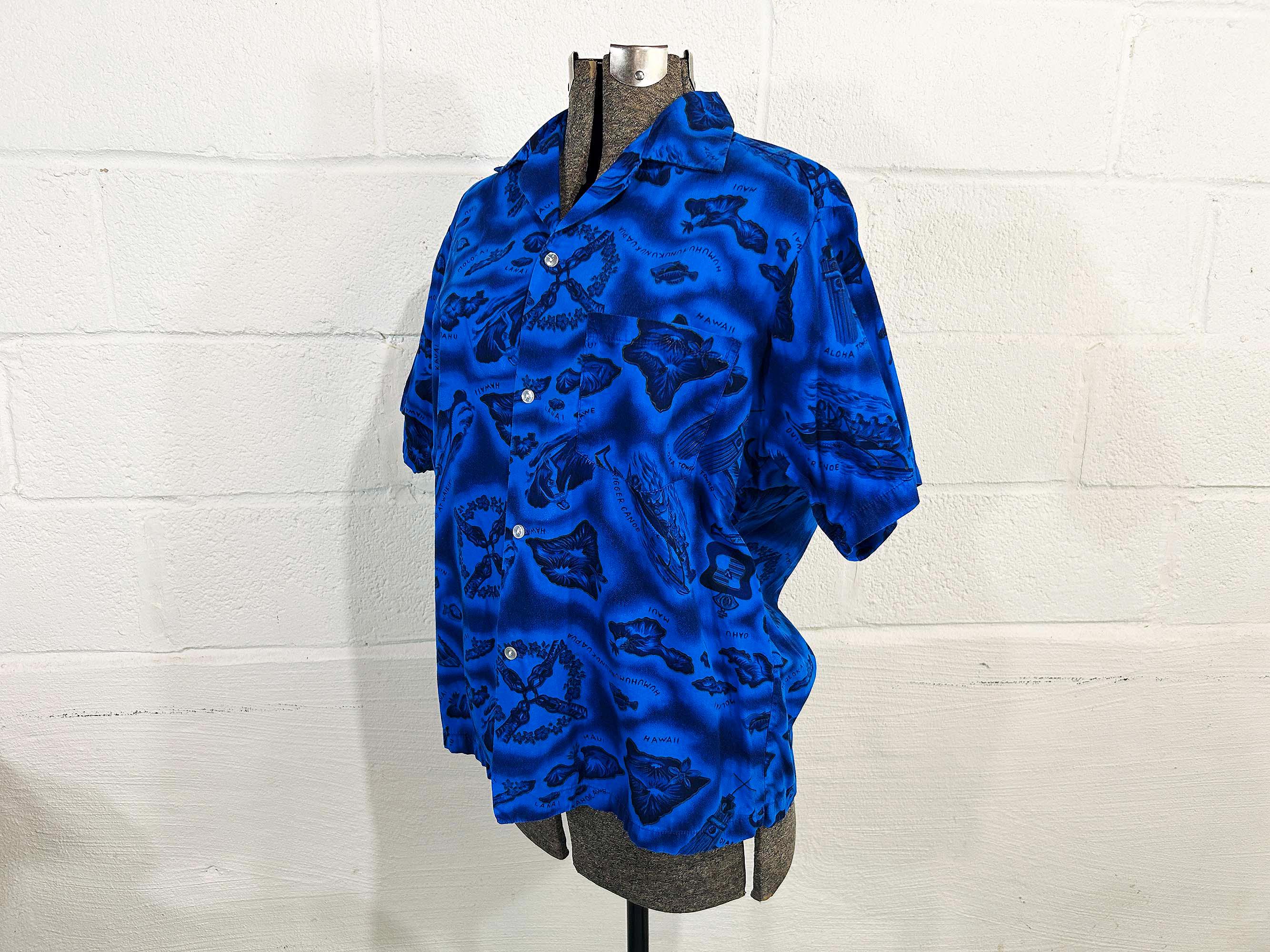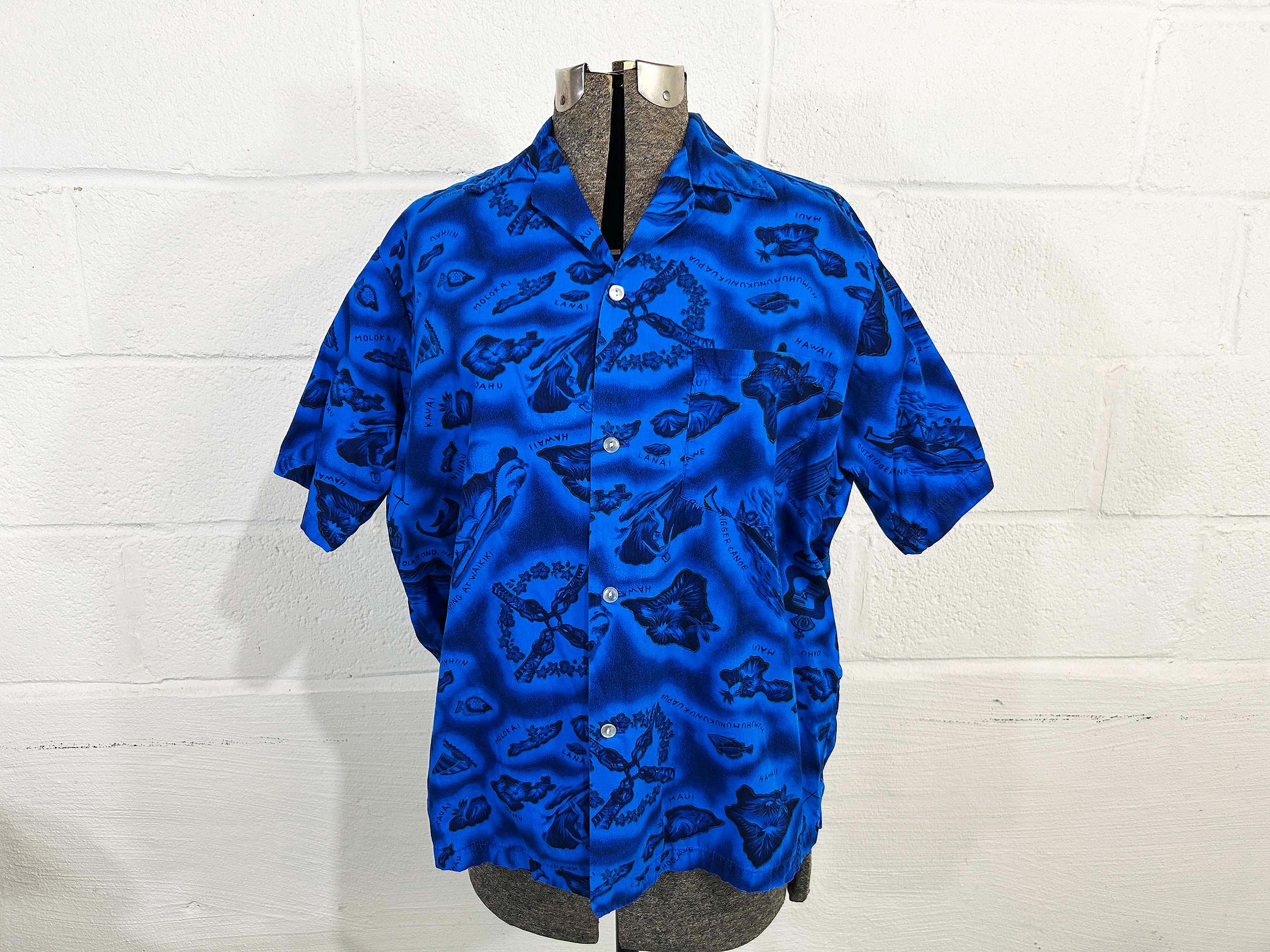 True vintage collared short sleeved Hawaiian shirt. Shirt is in excellent vintage condition with no significant wear. One front patch pocket. Fabric has NO stretch.