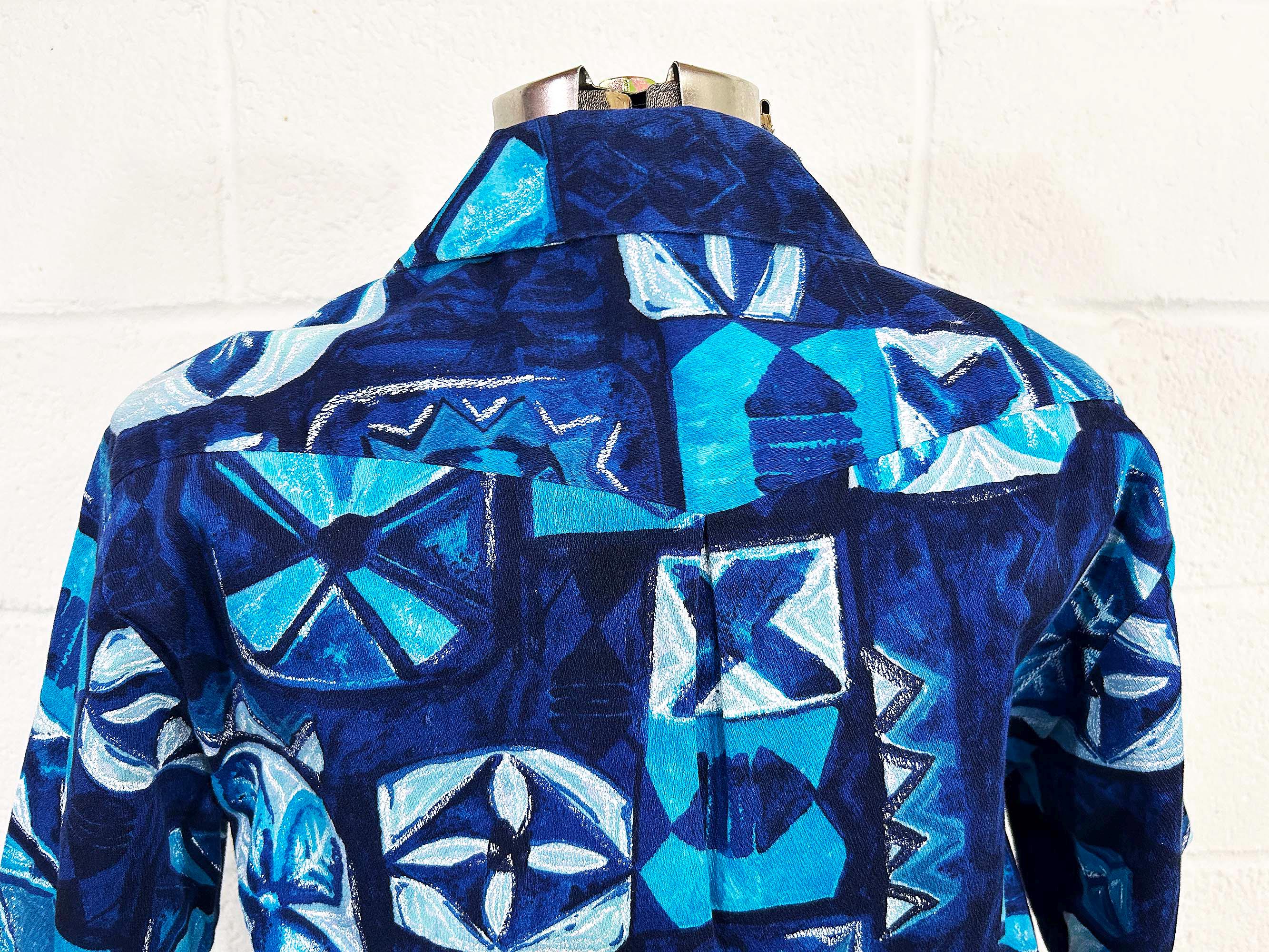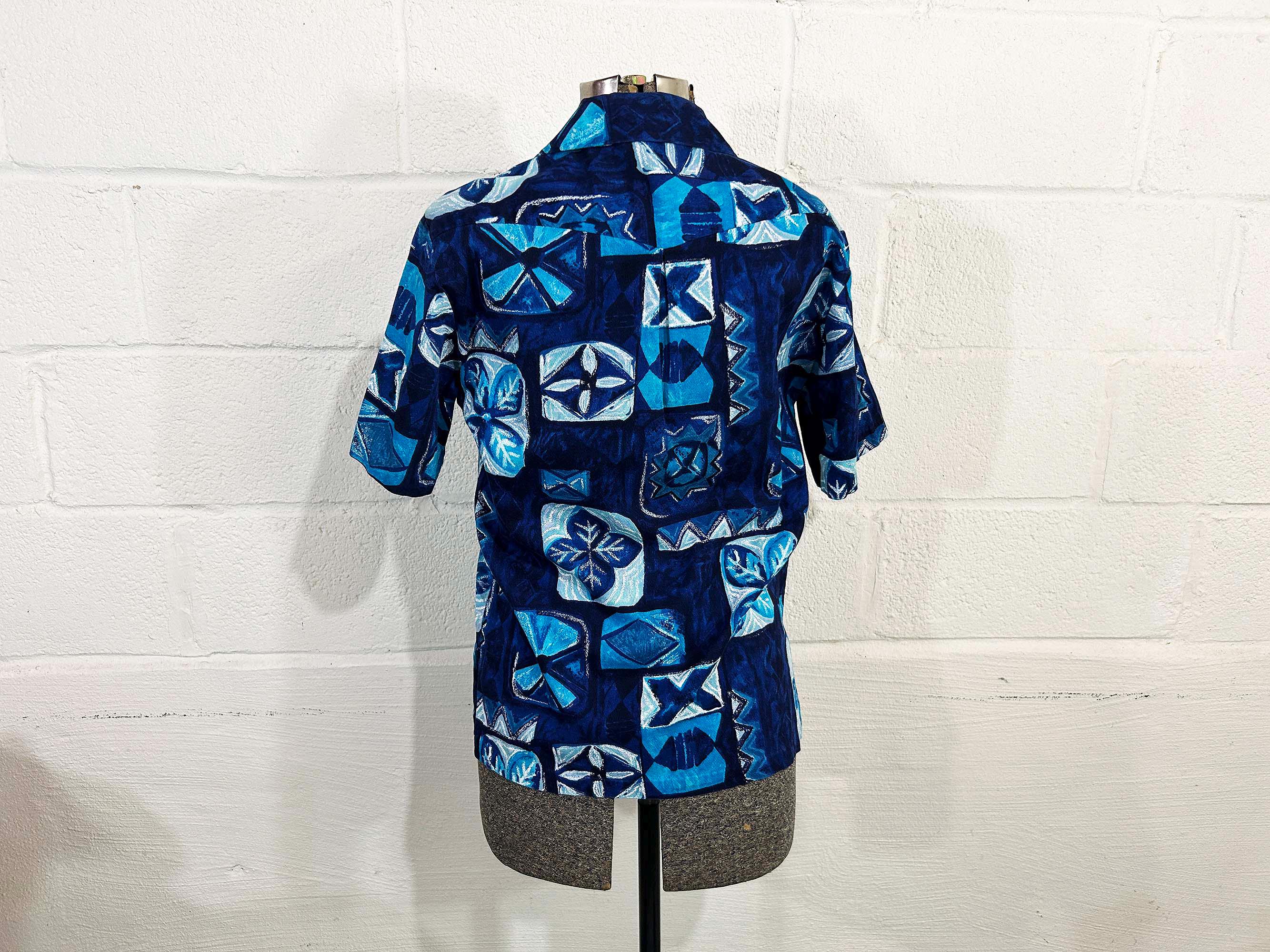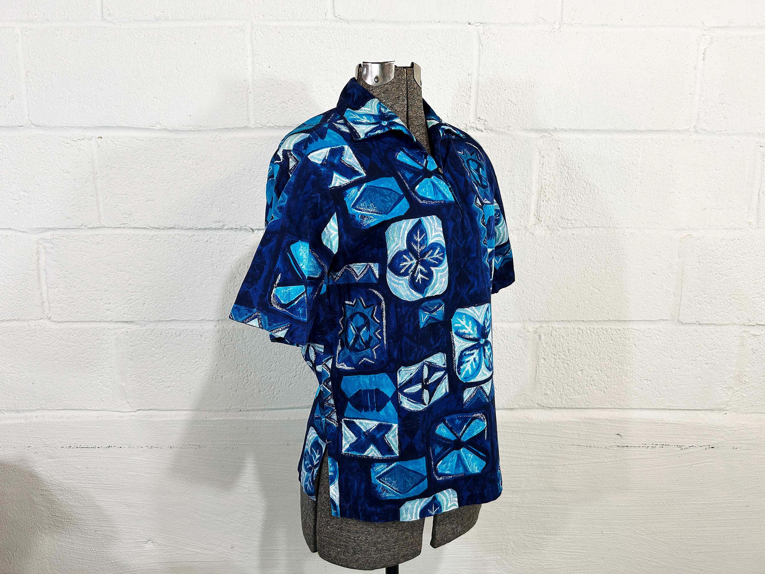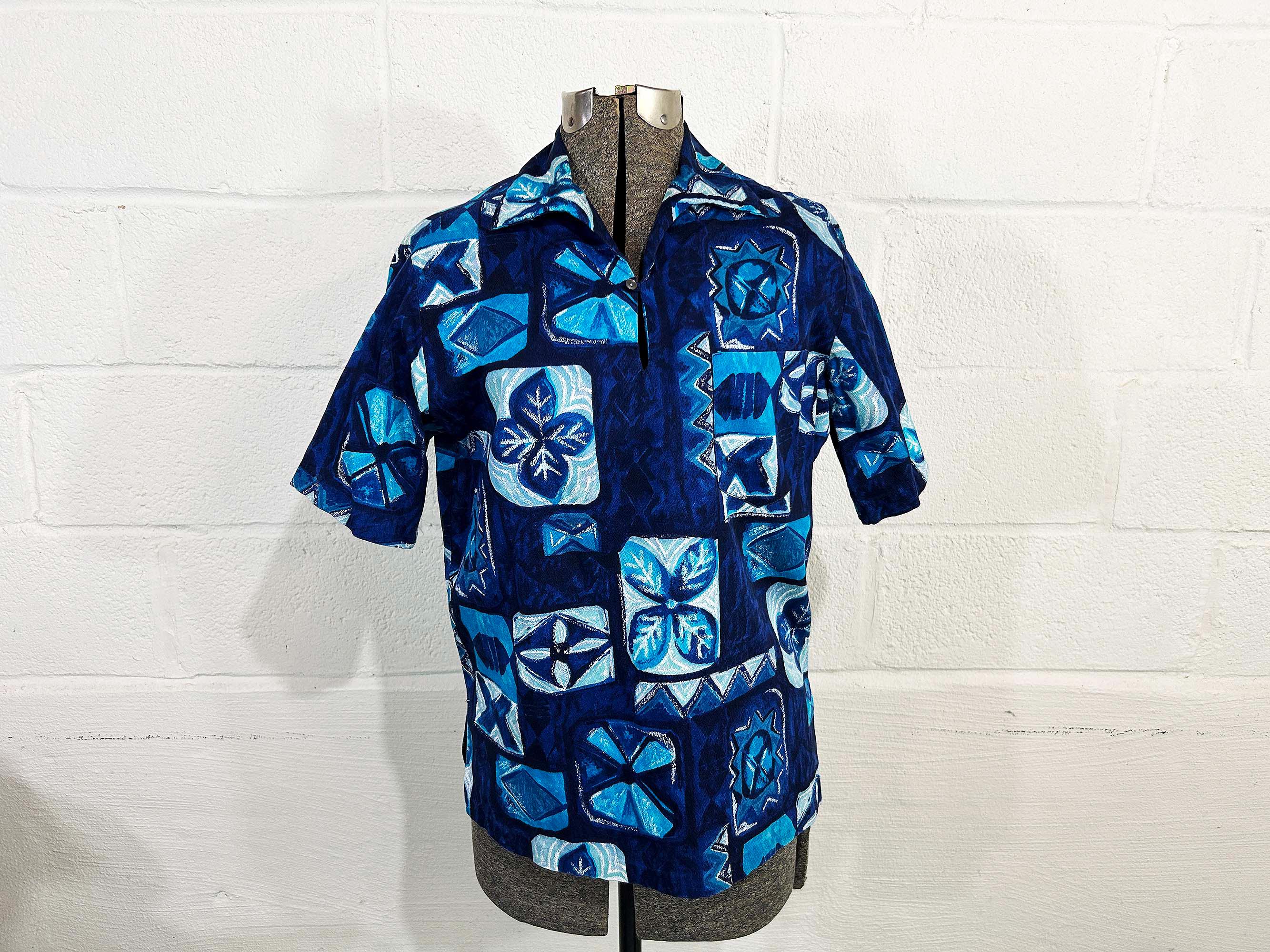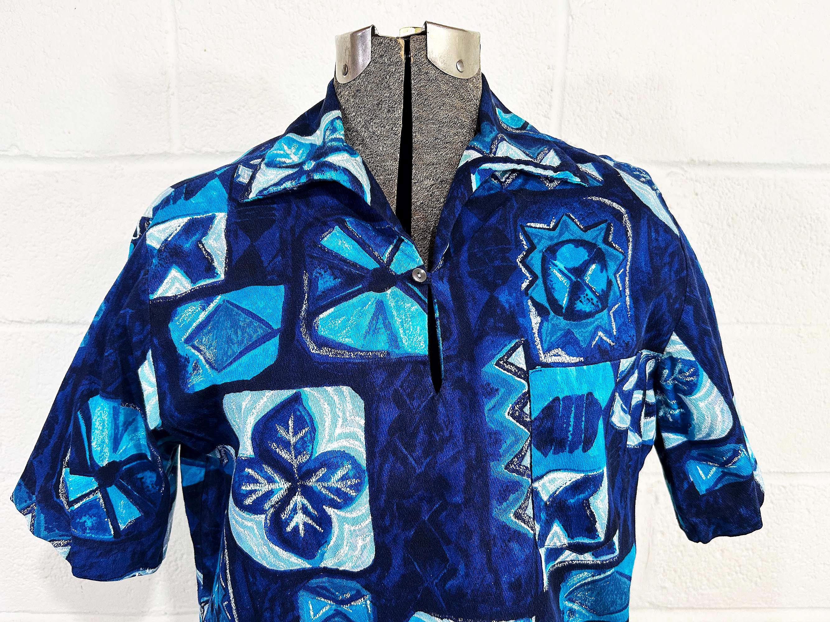 True vintage collared short sleeved tiki style shirt. Shirt is in excellent vintage condition with no significant wear. One front patch pocket with side slits on both sides of the bottom hem. Button at the neckline. Fabric has NO stretch.