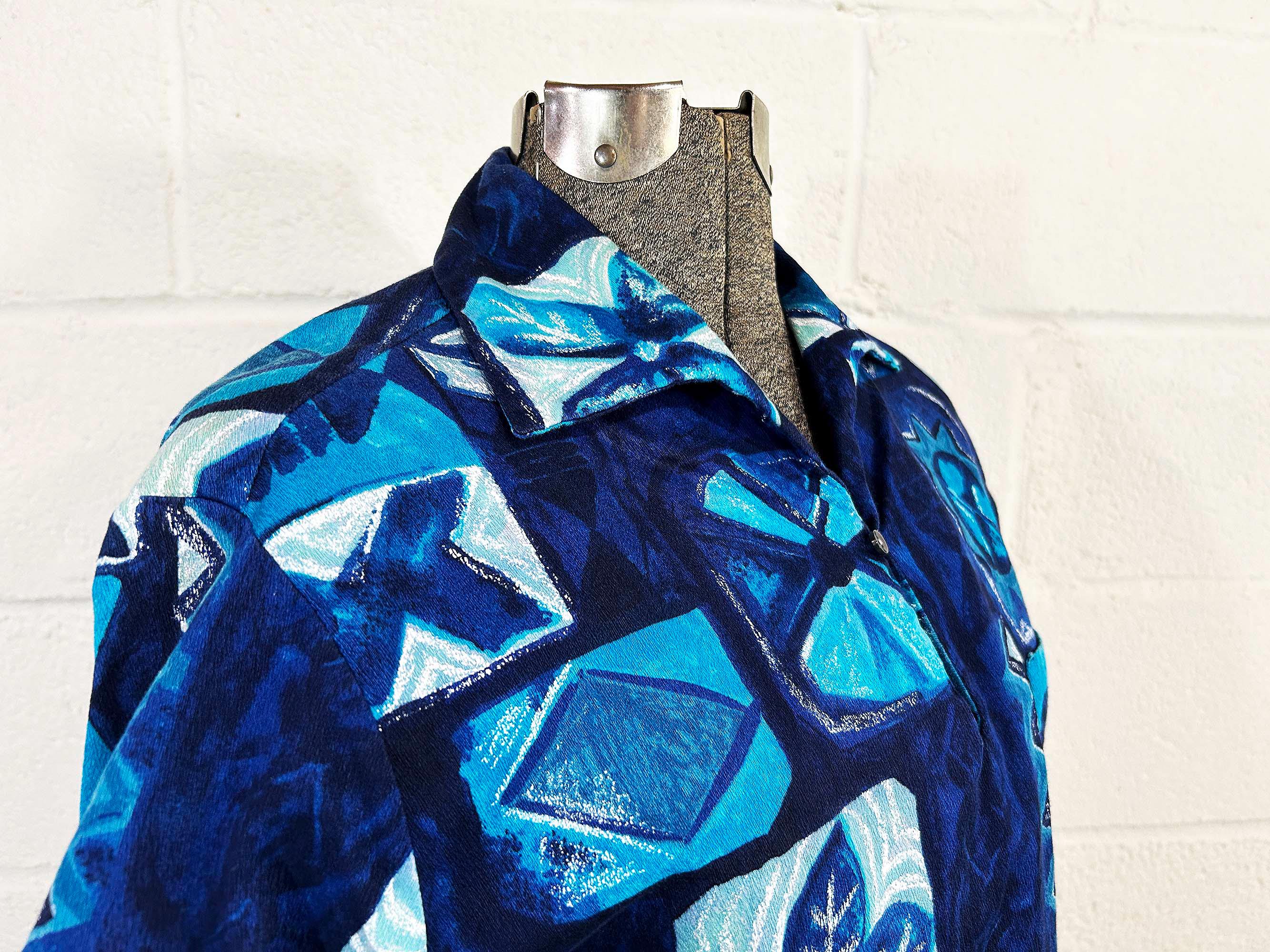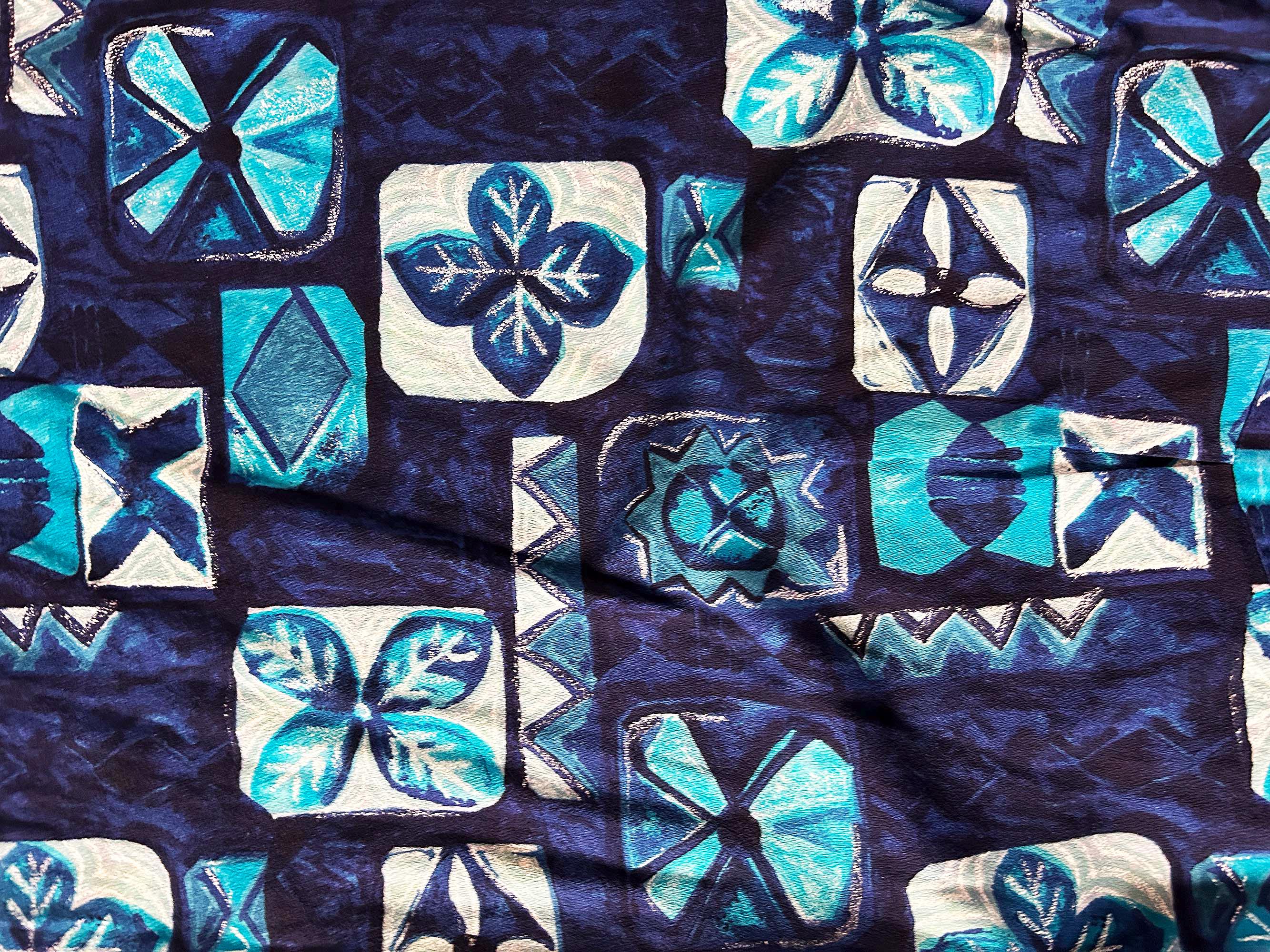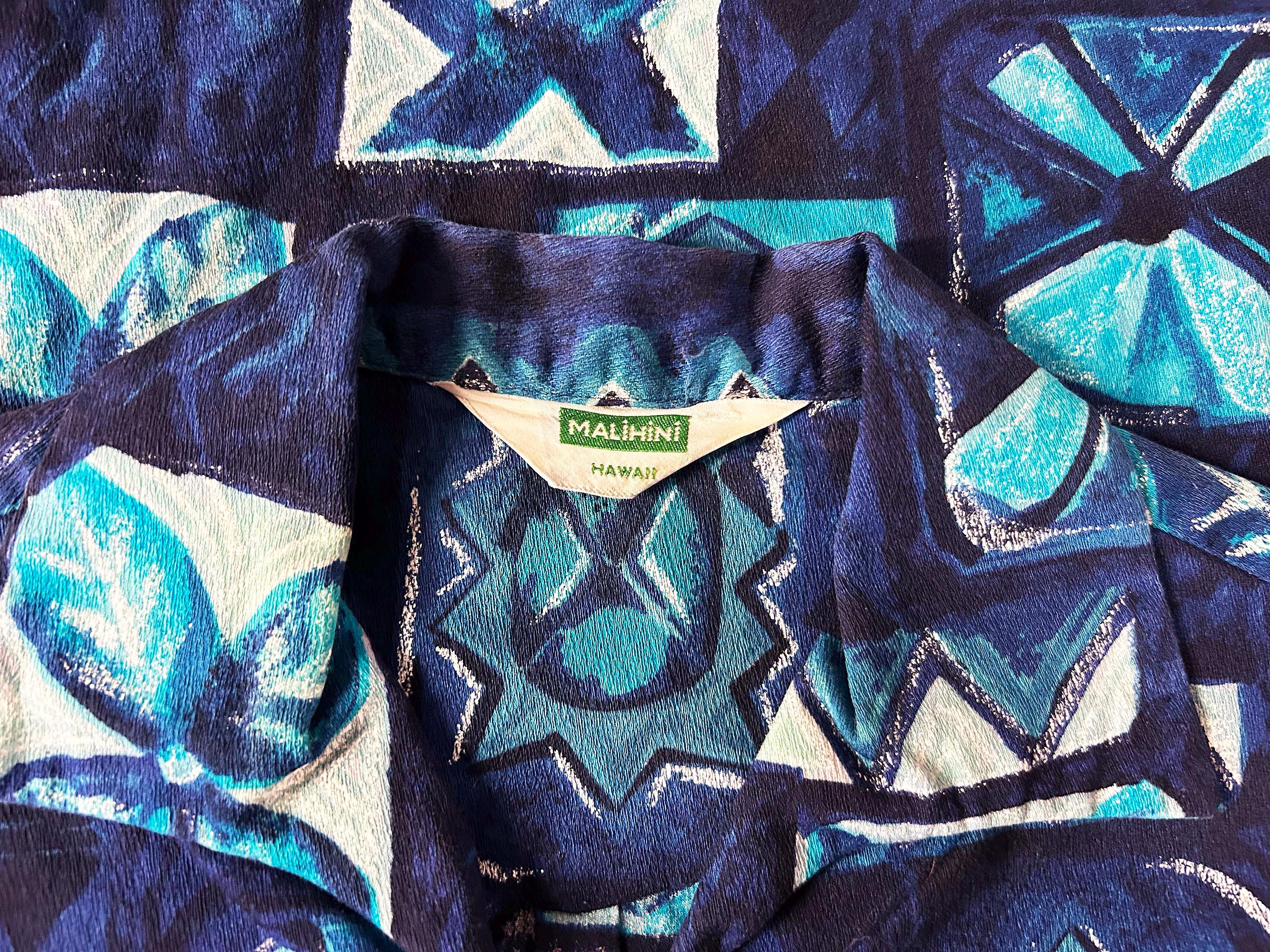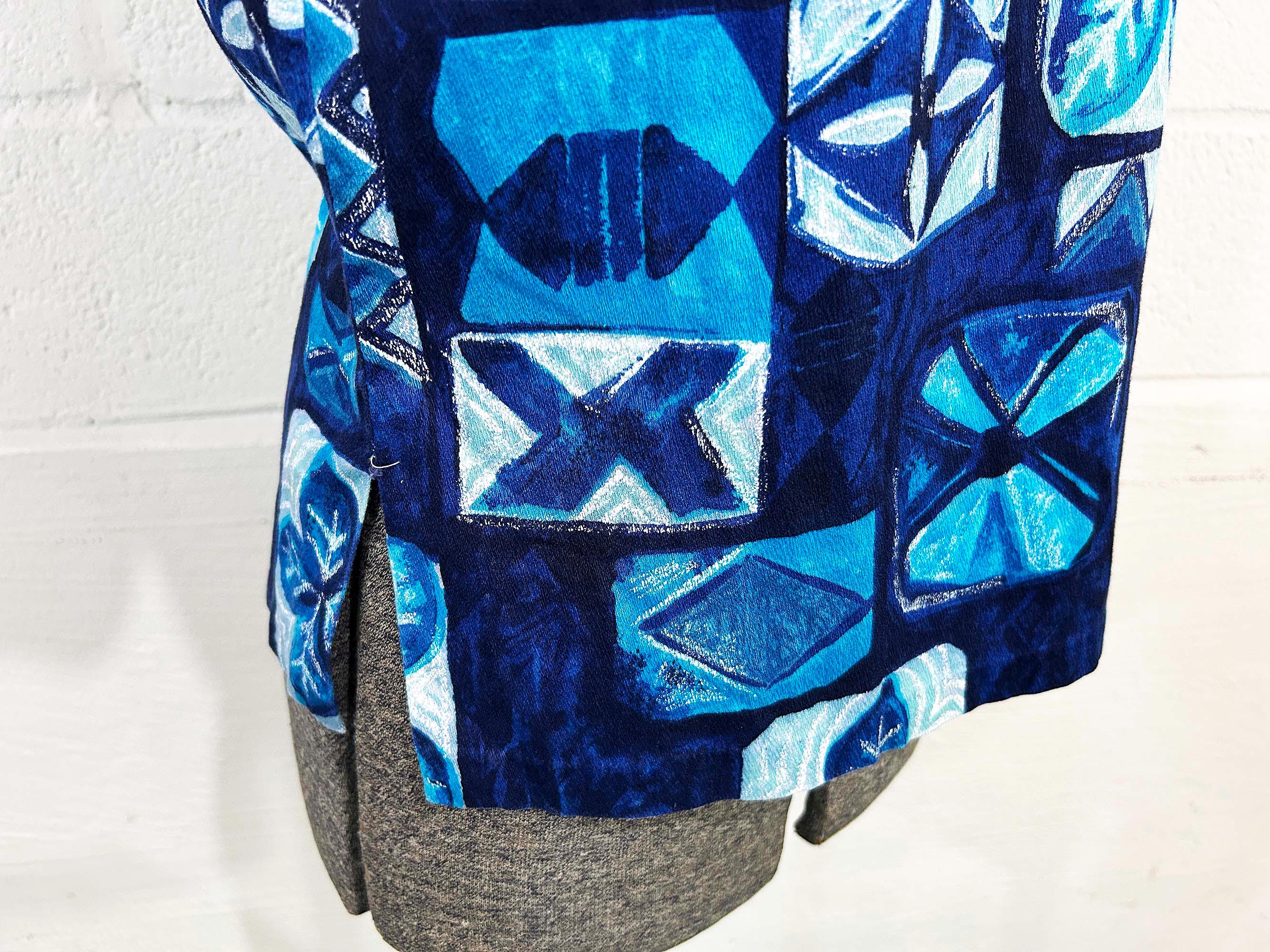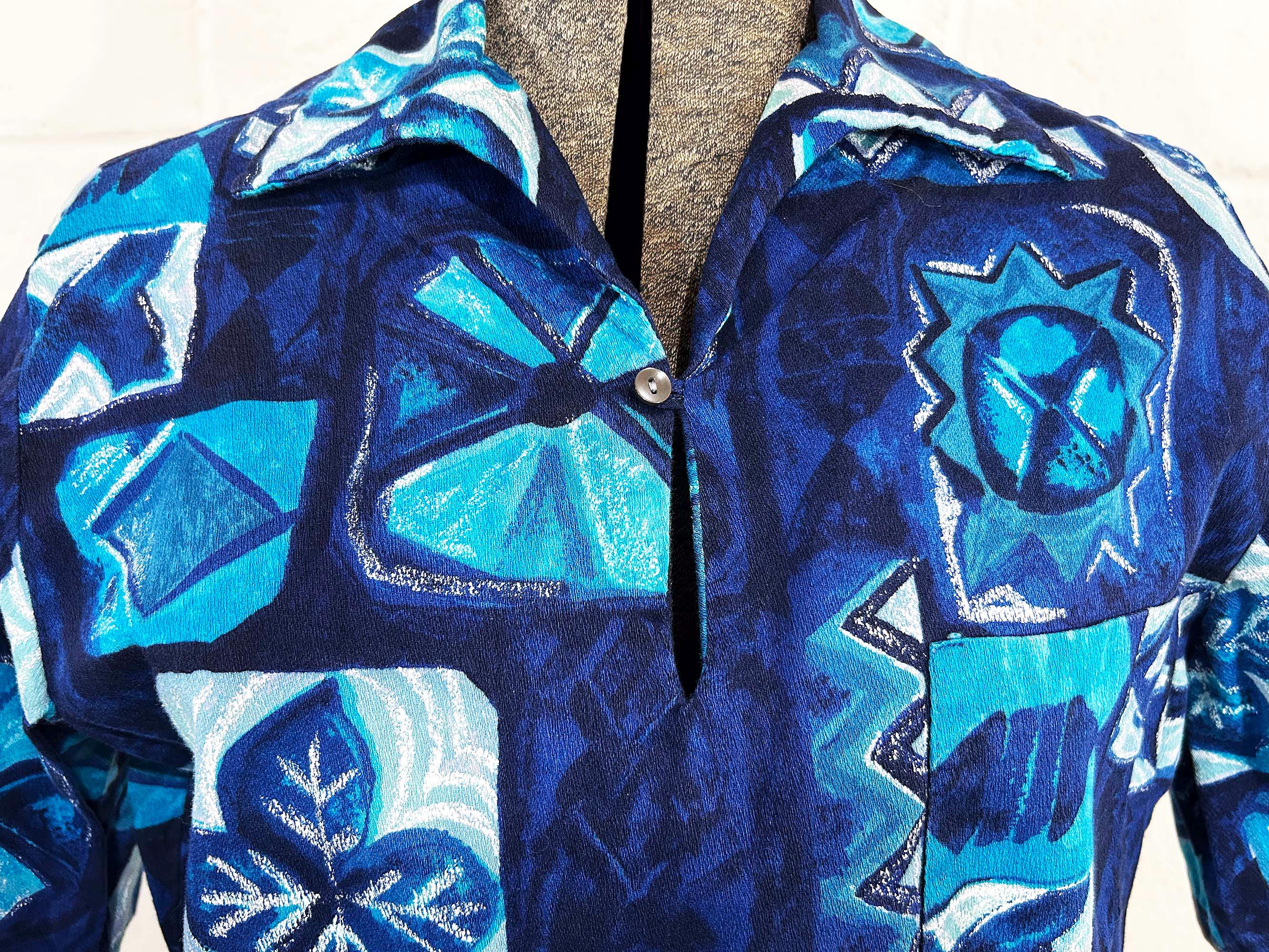 True vintage collared short sleeved tiki style shirt. Shirt is in excellent vintage condition with no significant wear. One front patch pocket with side slits on both sides of the bottom hem. Button at the neckline. Fabric has NO stretch.