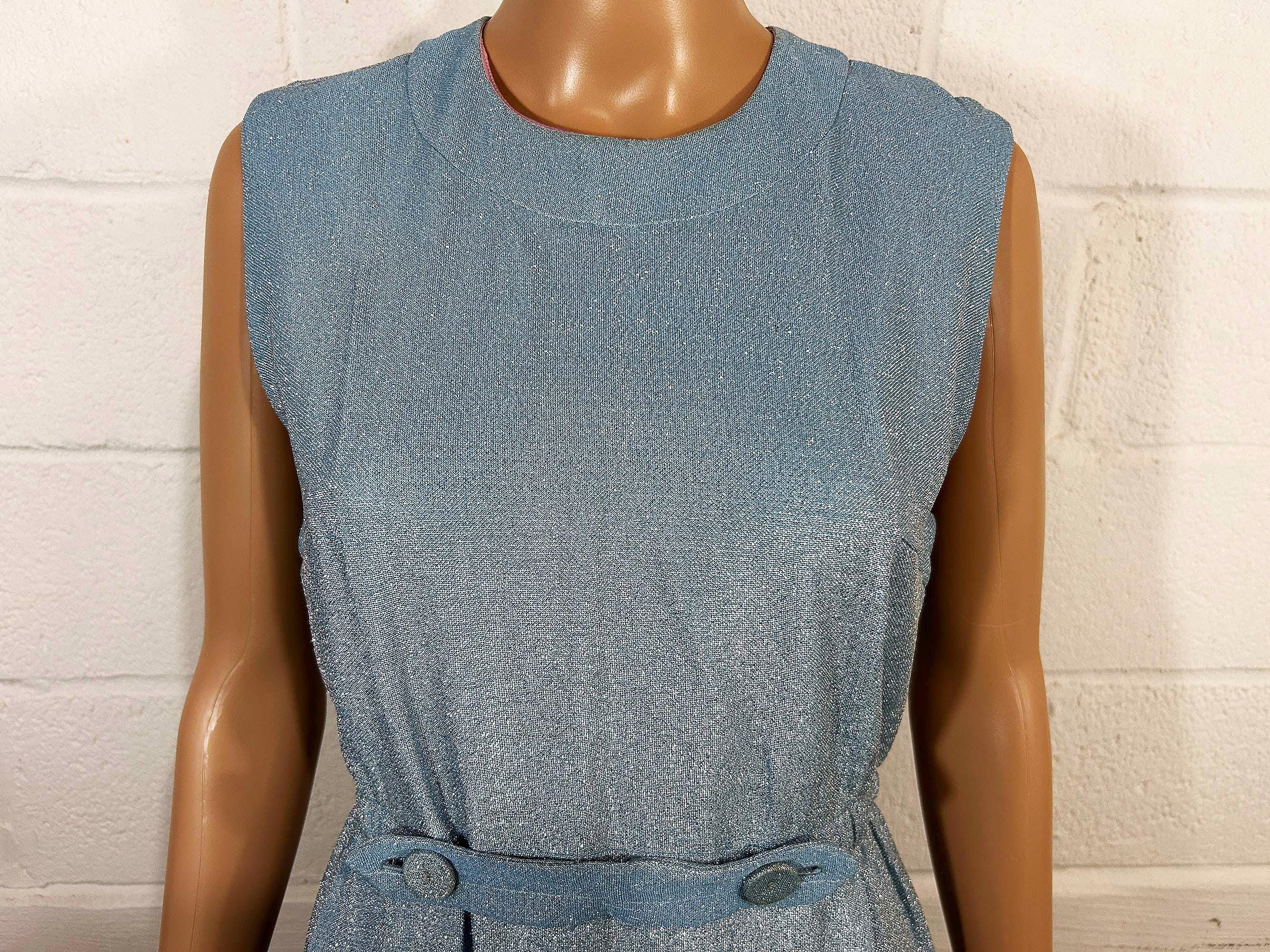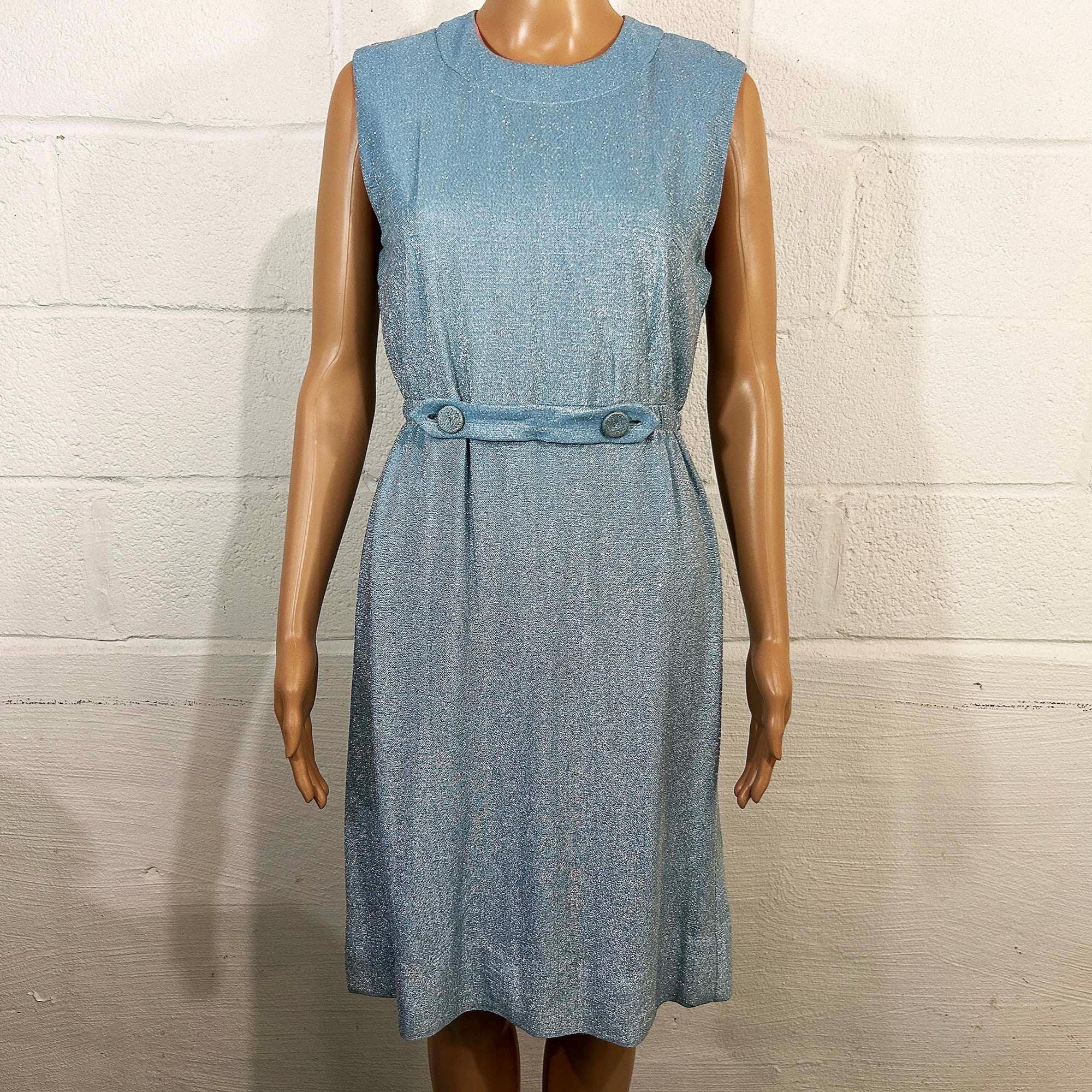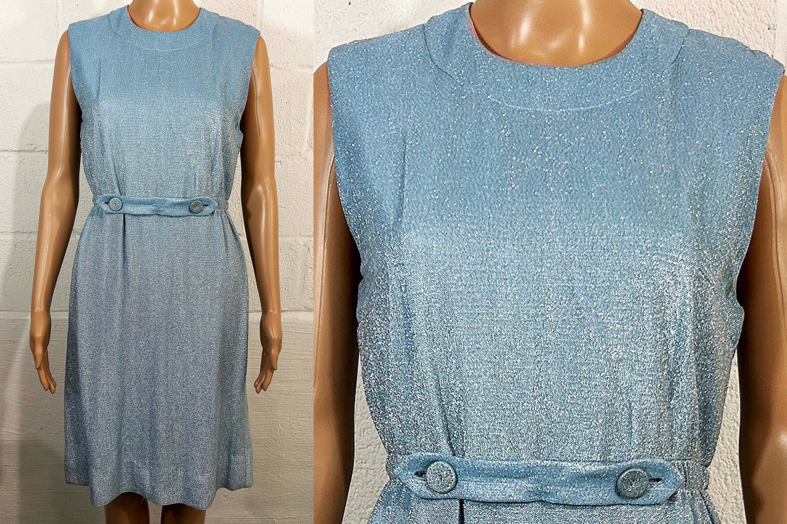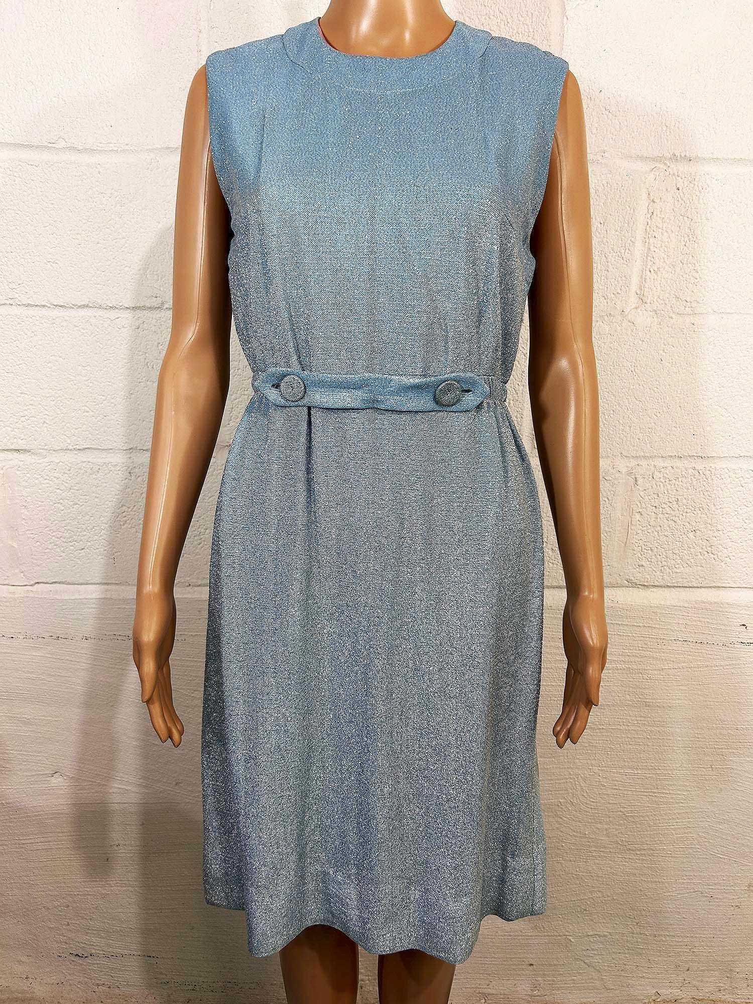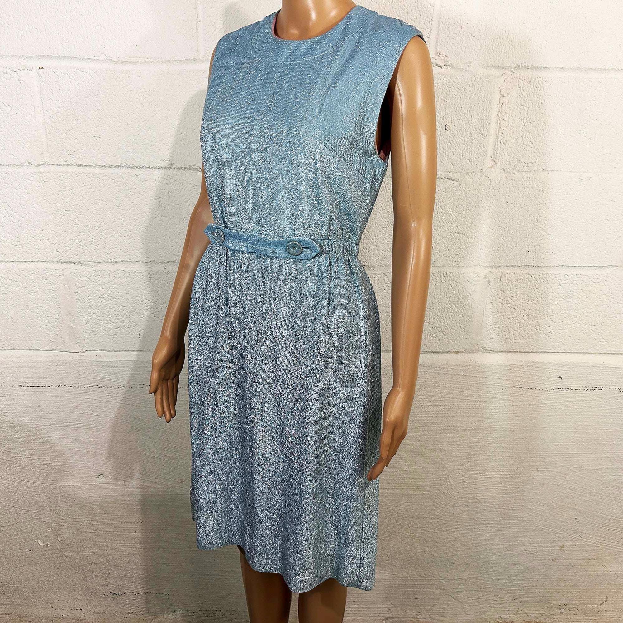Adorable baby blue glittery sleeveless dress. Elastic waist with a button and faux belt detail at the front. Slit in the back hem for movement. Half zip back. There are some threadbare spots at each of the shoulders - please be sure to inspect all photos closely. Fabric has some stretch.