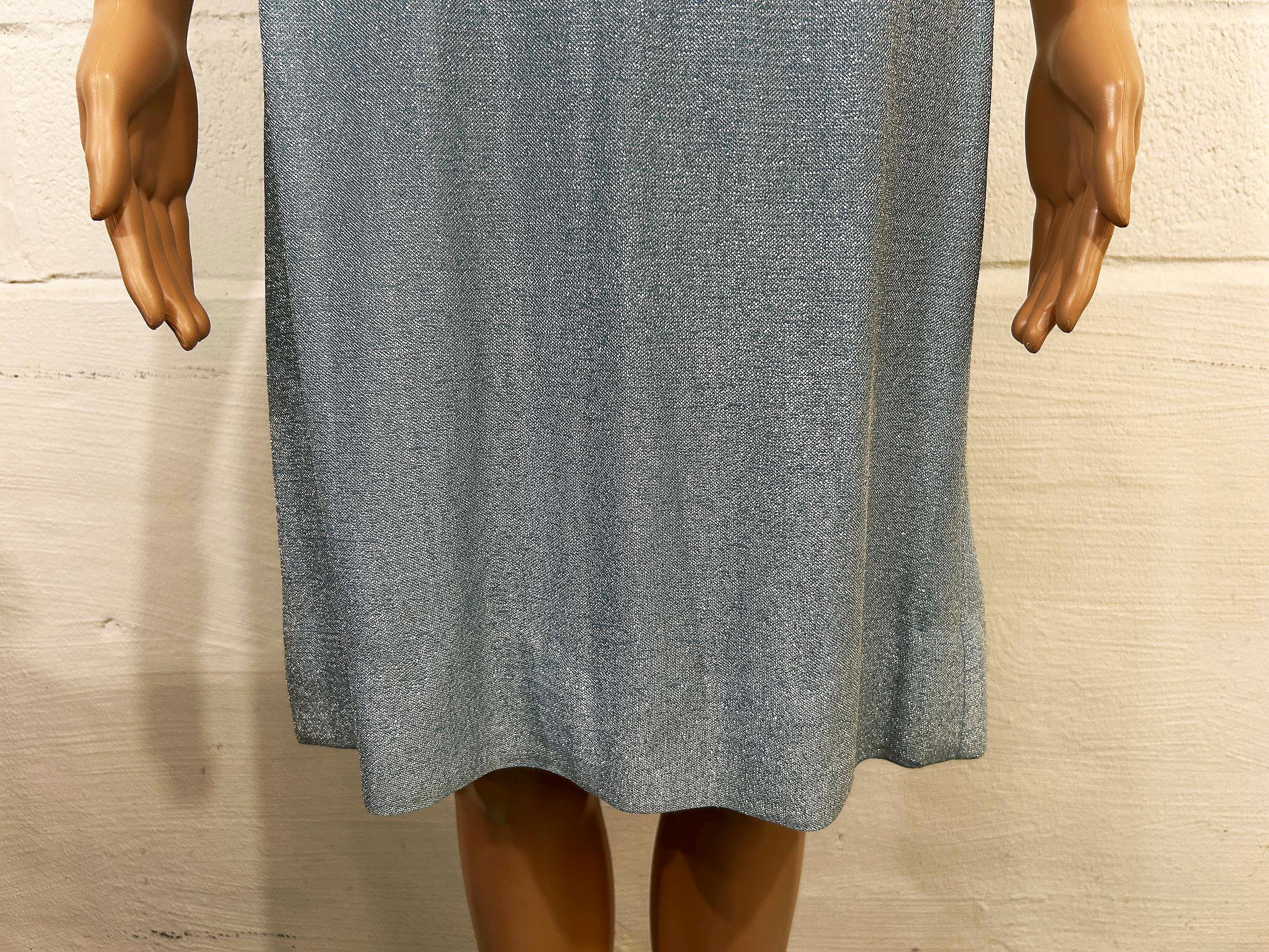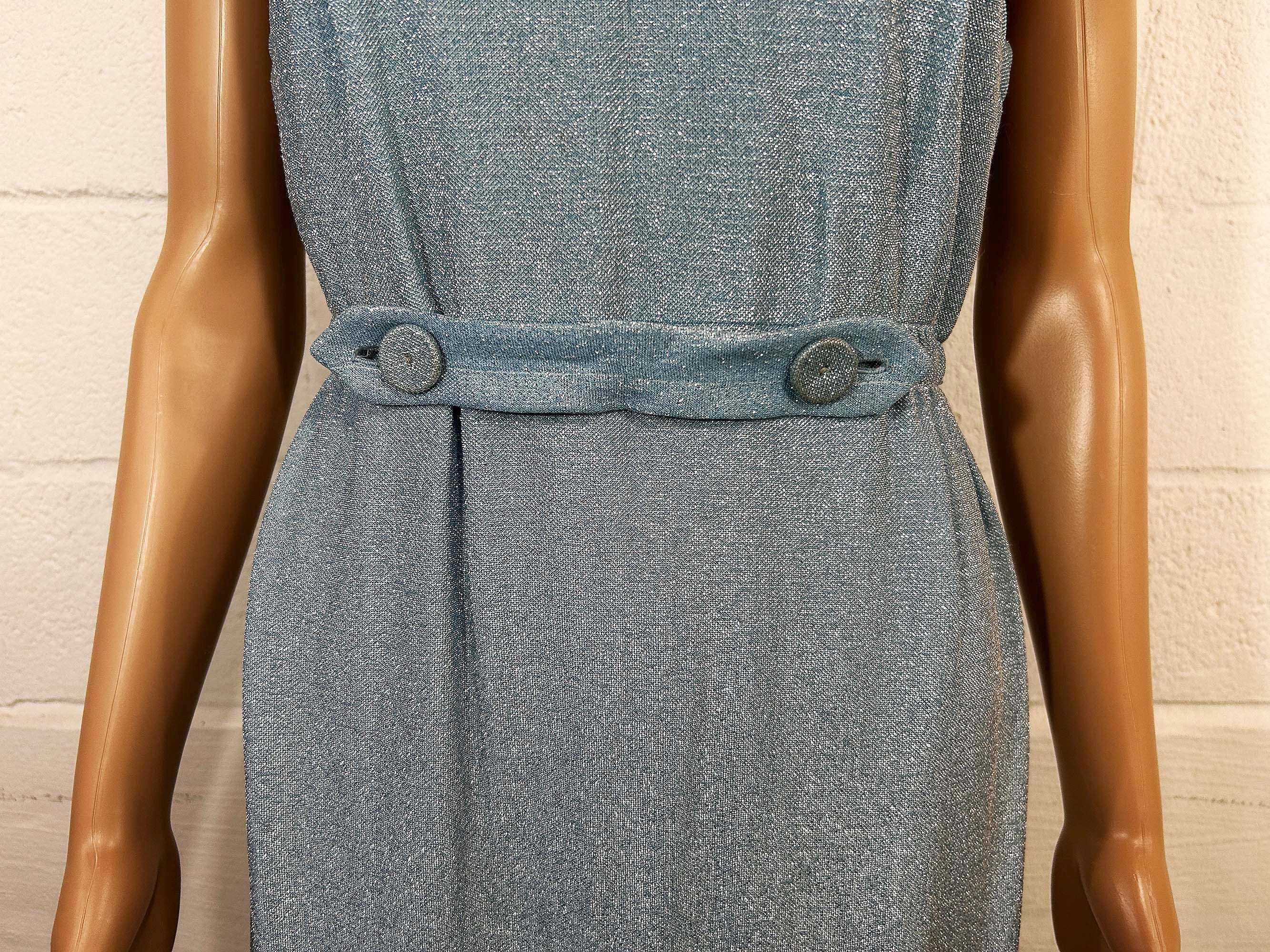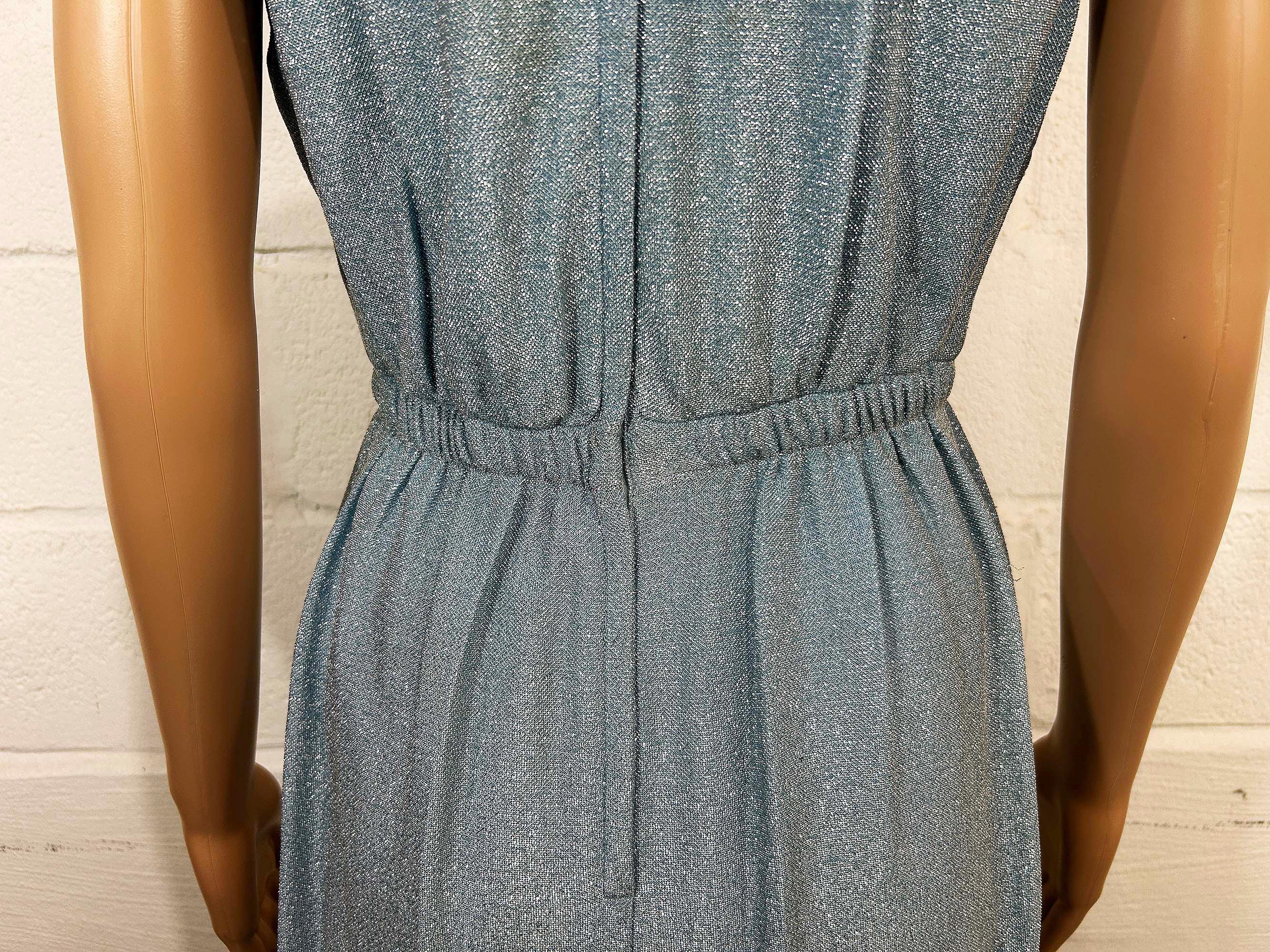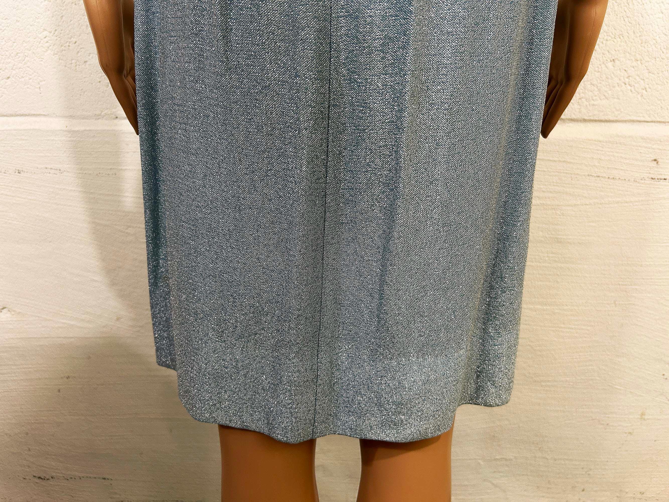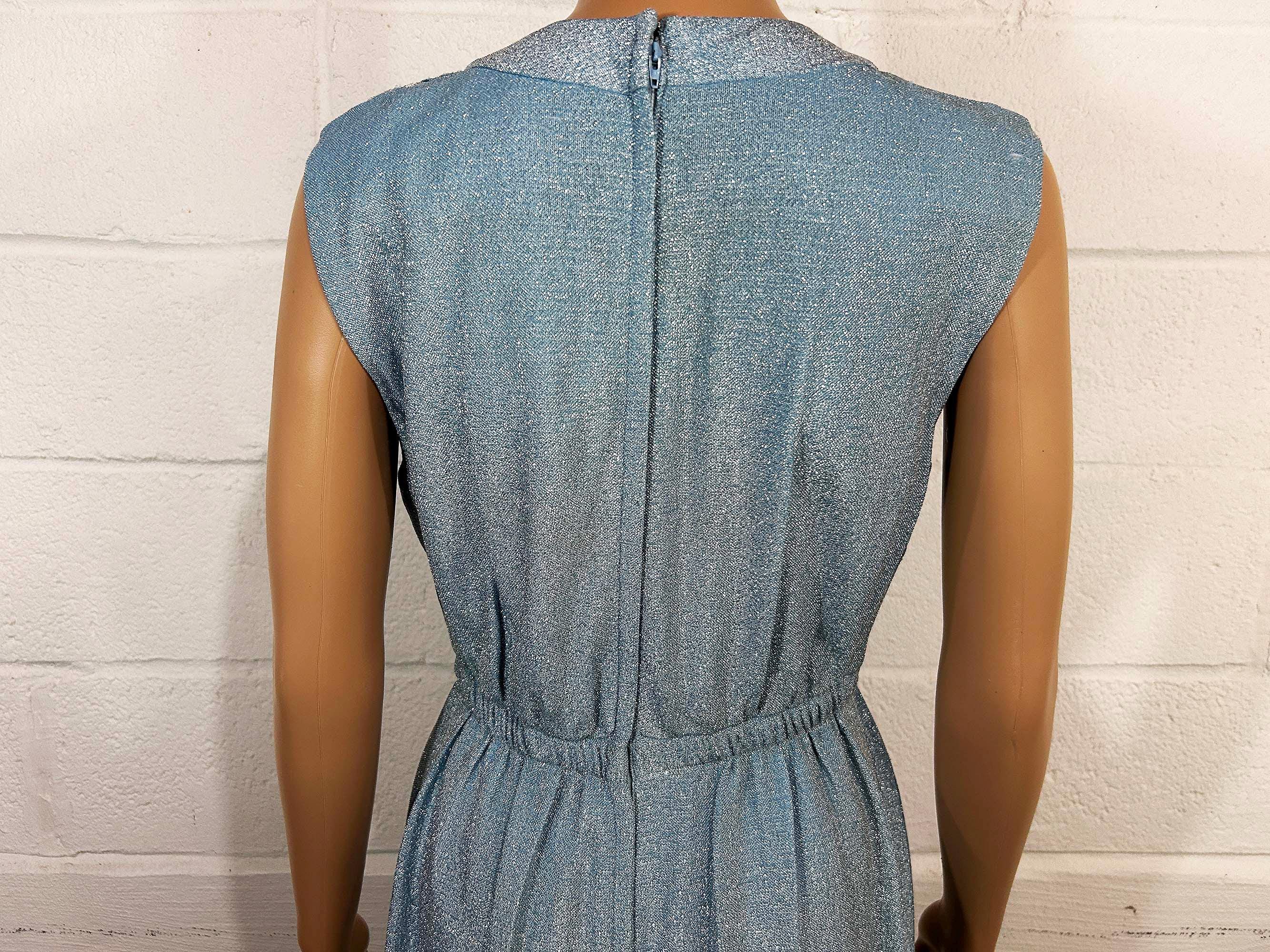 Adorable baby blue glittery sleeveless dress. Elastic waist with a button and faux belt detail at the front. Slit in the back hem for movement. Half zip back. There are some threadbare spots at each of the shoulders - please be sure to inspect all photos closely. Fabric has some stretch.