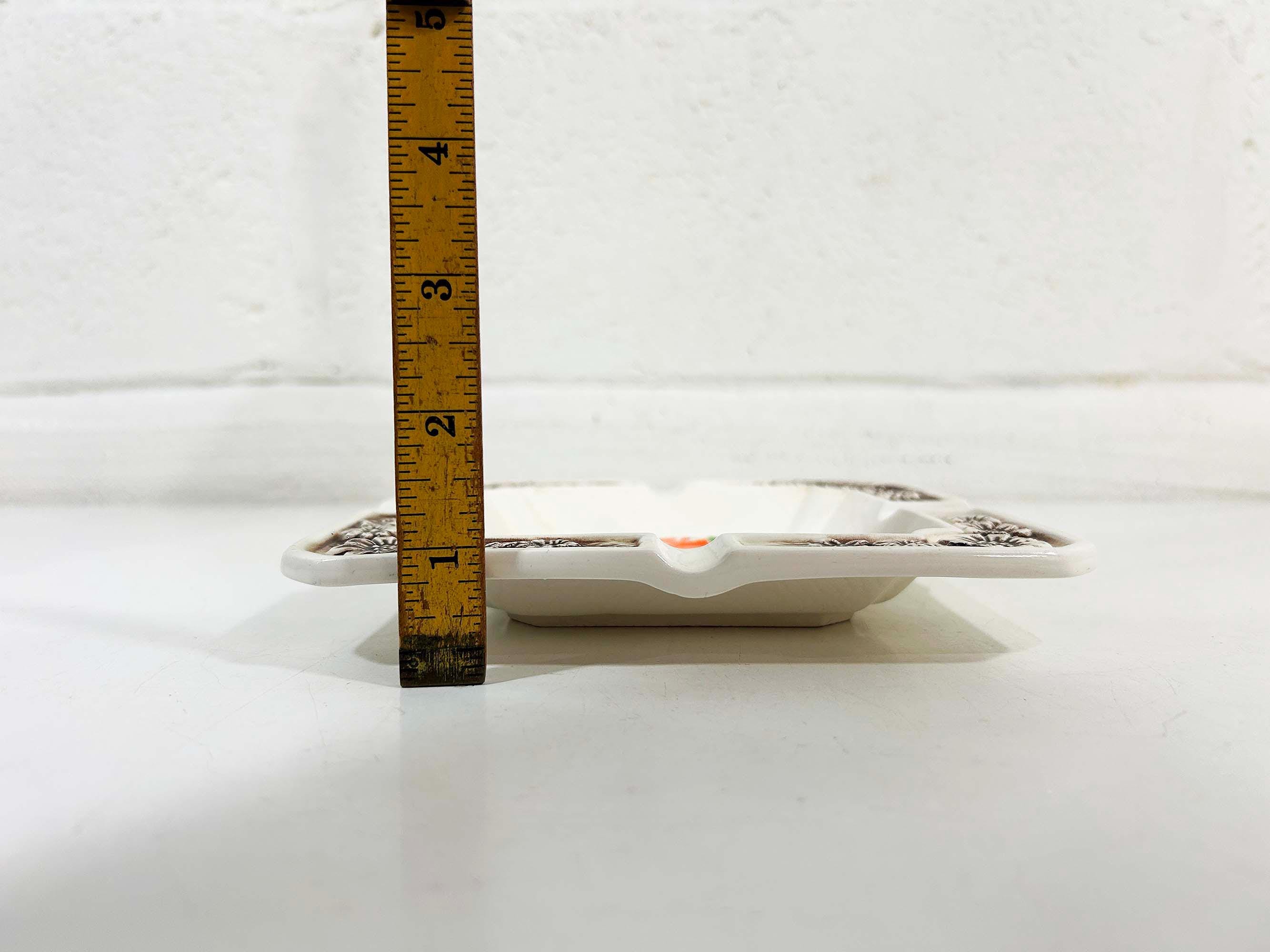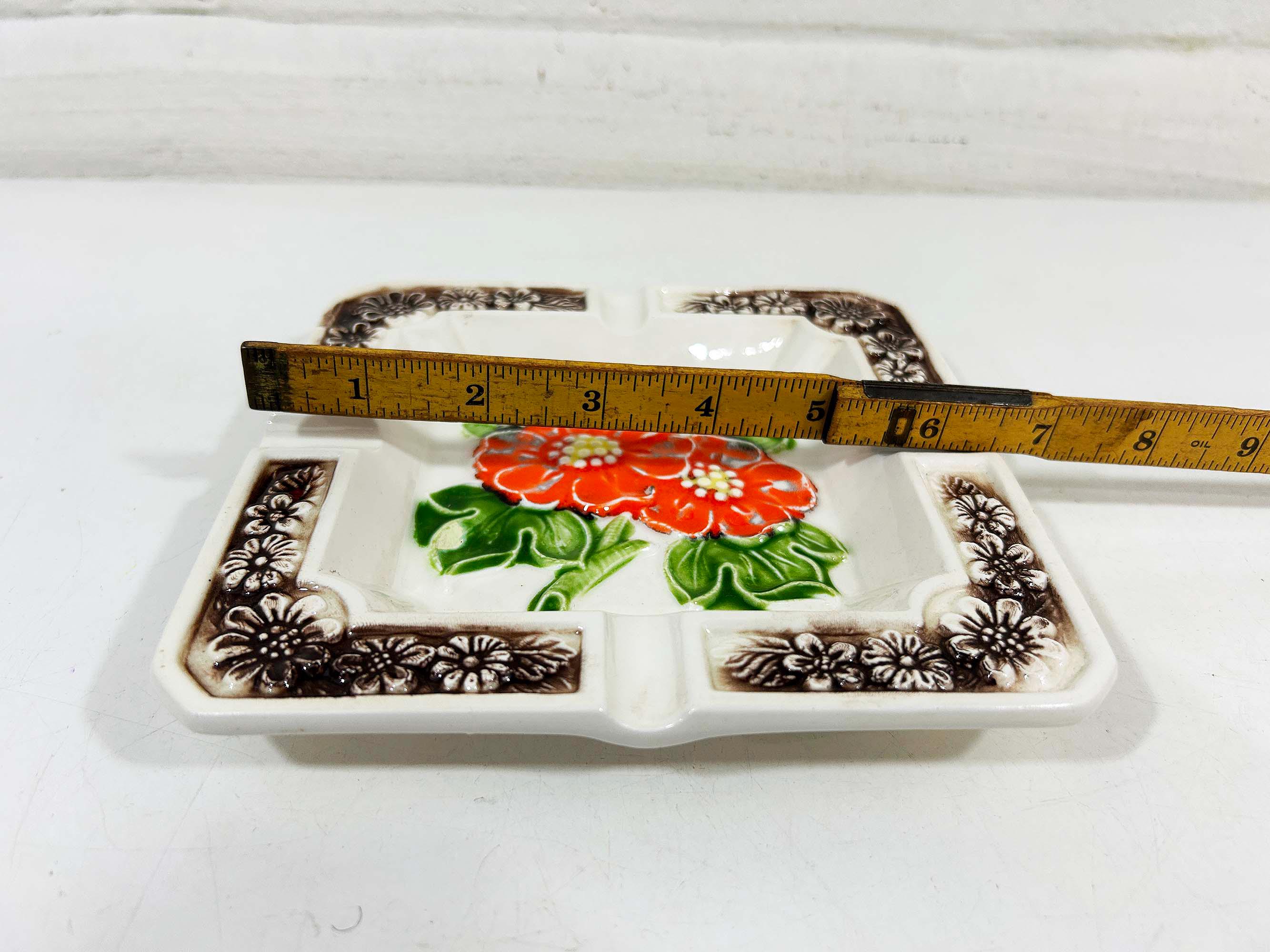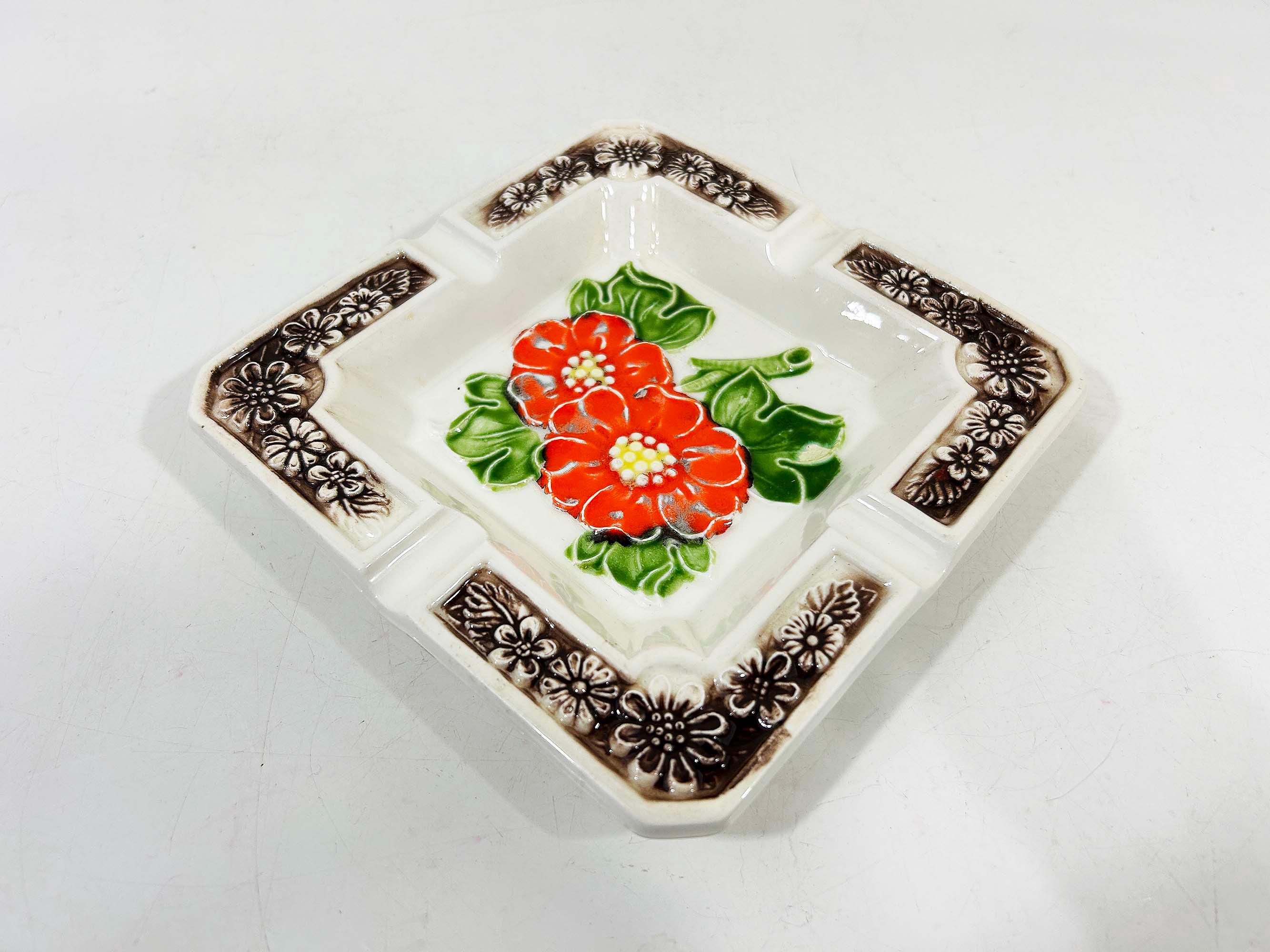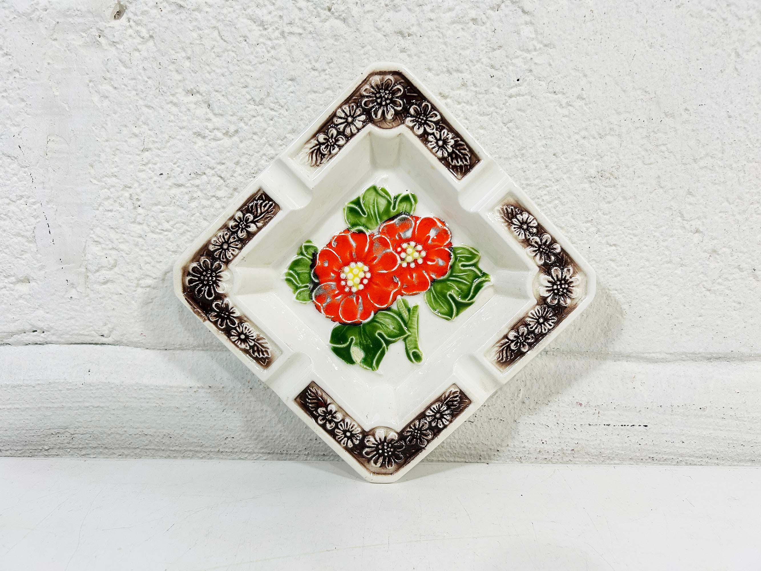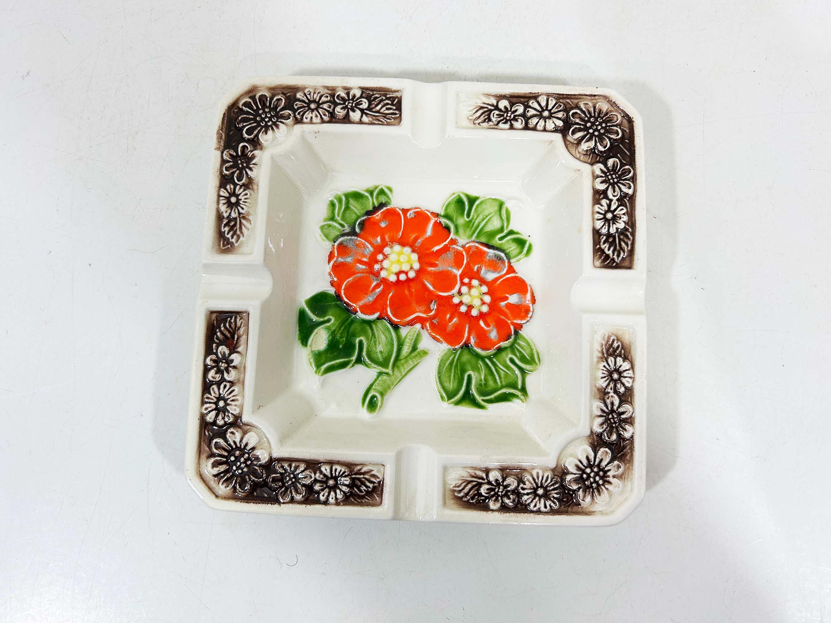 Lovely square floral ashtray. It is in good vintage condition with no significant flaws. The ashtray is about 6 1/2 inches square and 1 inch tall.