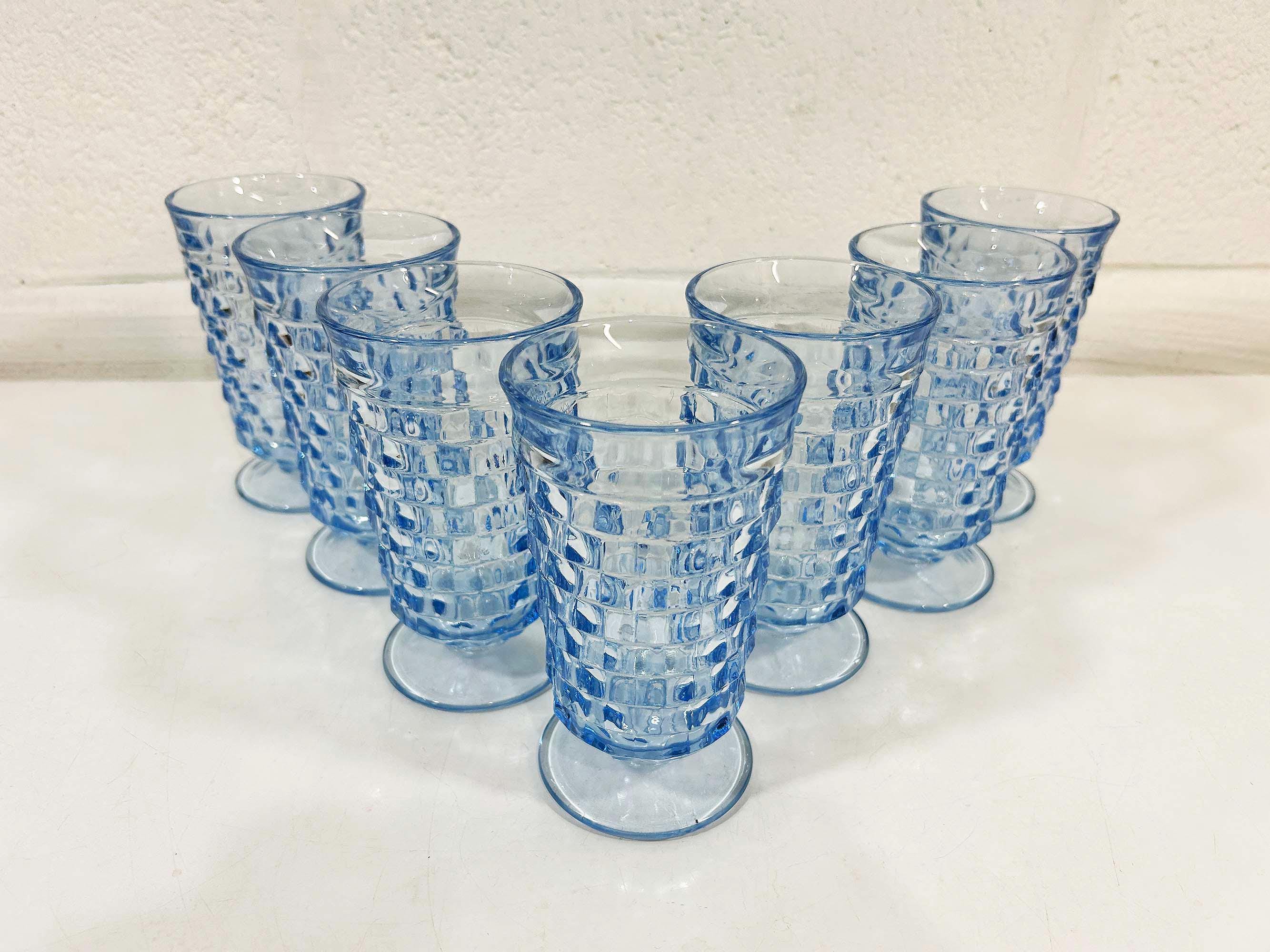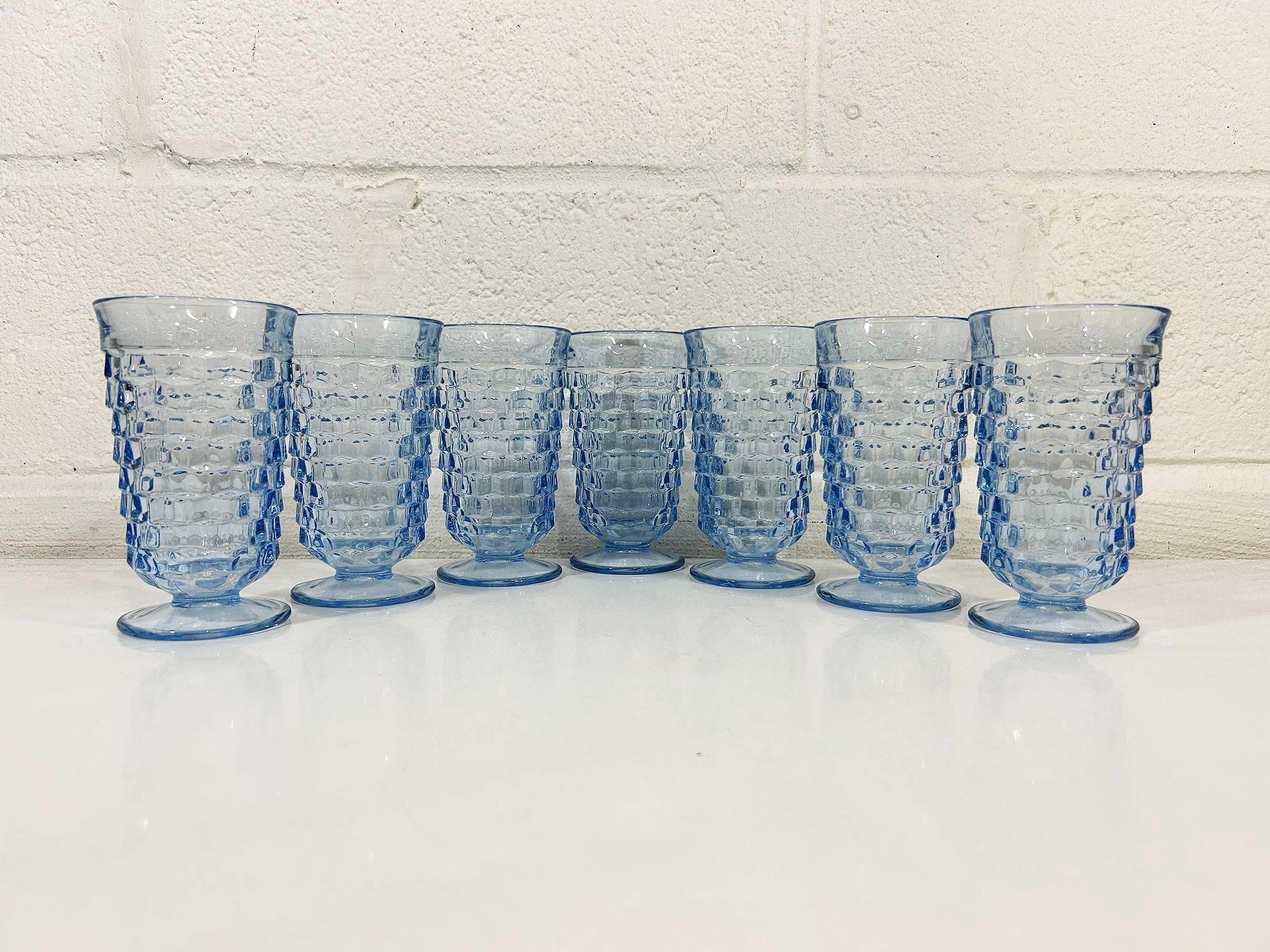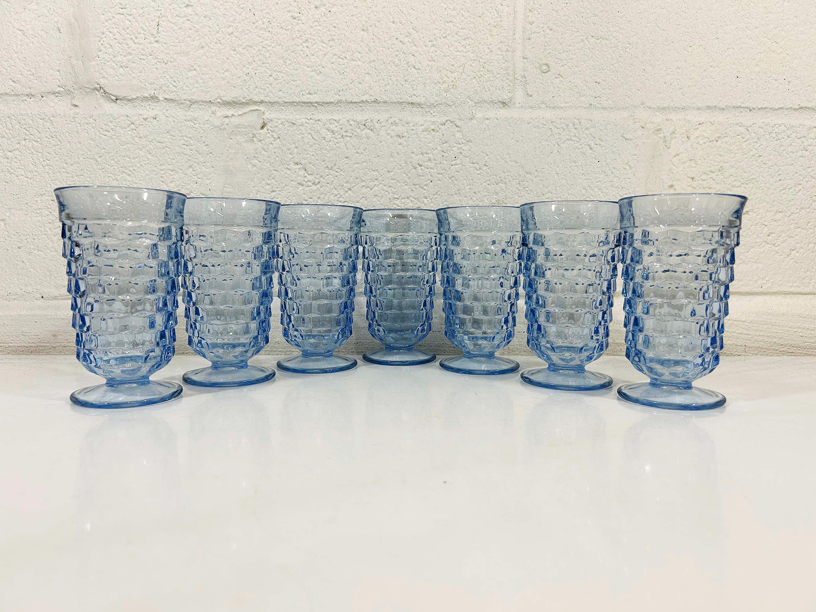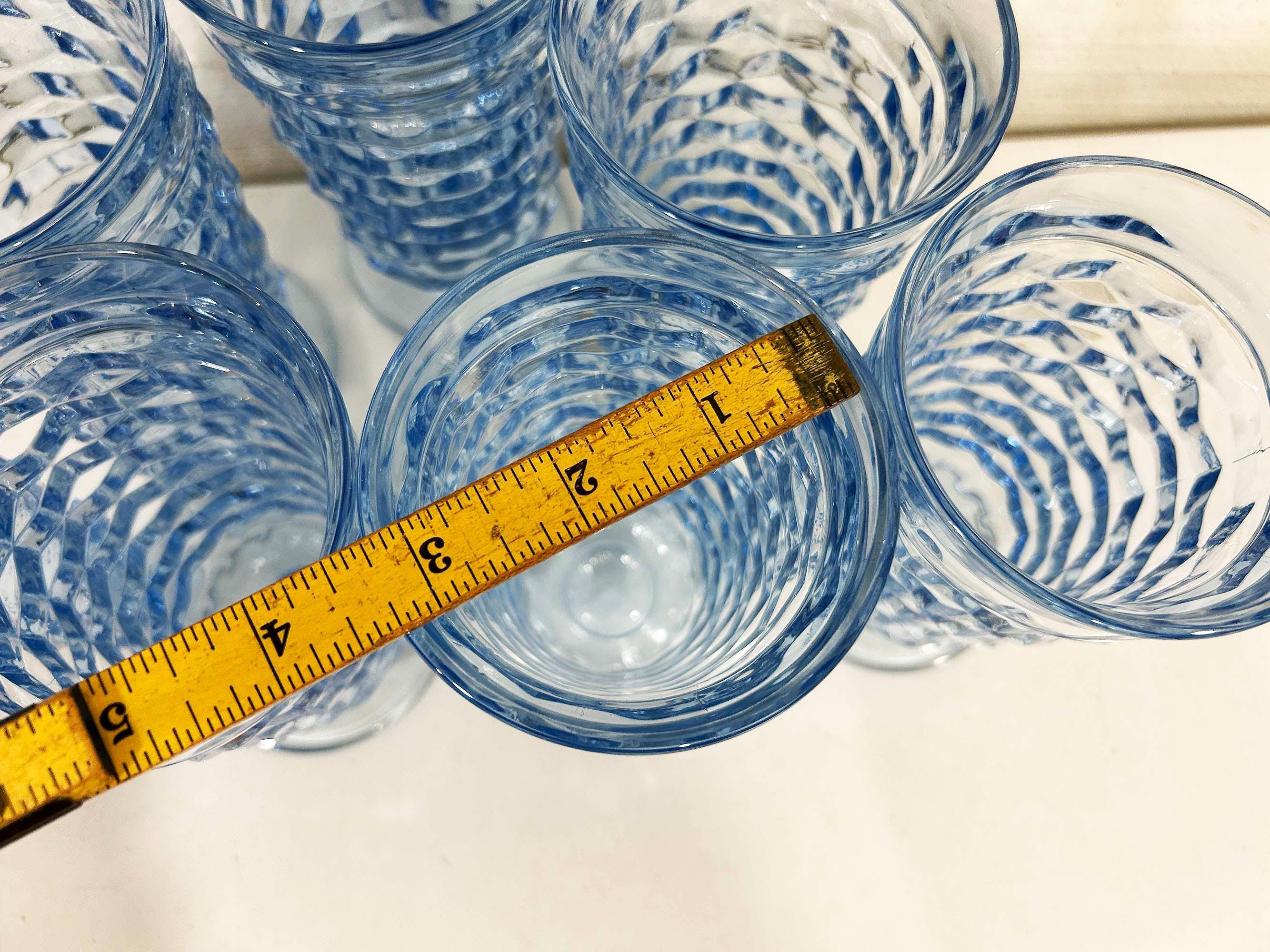 Lovely vintage set of 7 periwinkle iced tea glasses. Perfect addition to any bar or vintage kitchen! All are in excellent vintage condition with no significant flaws. Each glass is approximately 6 inches tall and 3 1/4 inches across the top. Each glass holds approximately 12 ounces of liquid when filled to the brim.