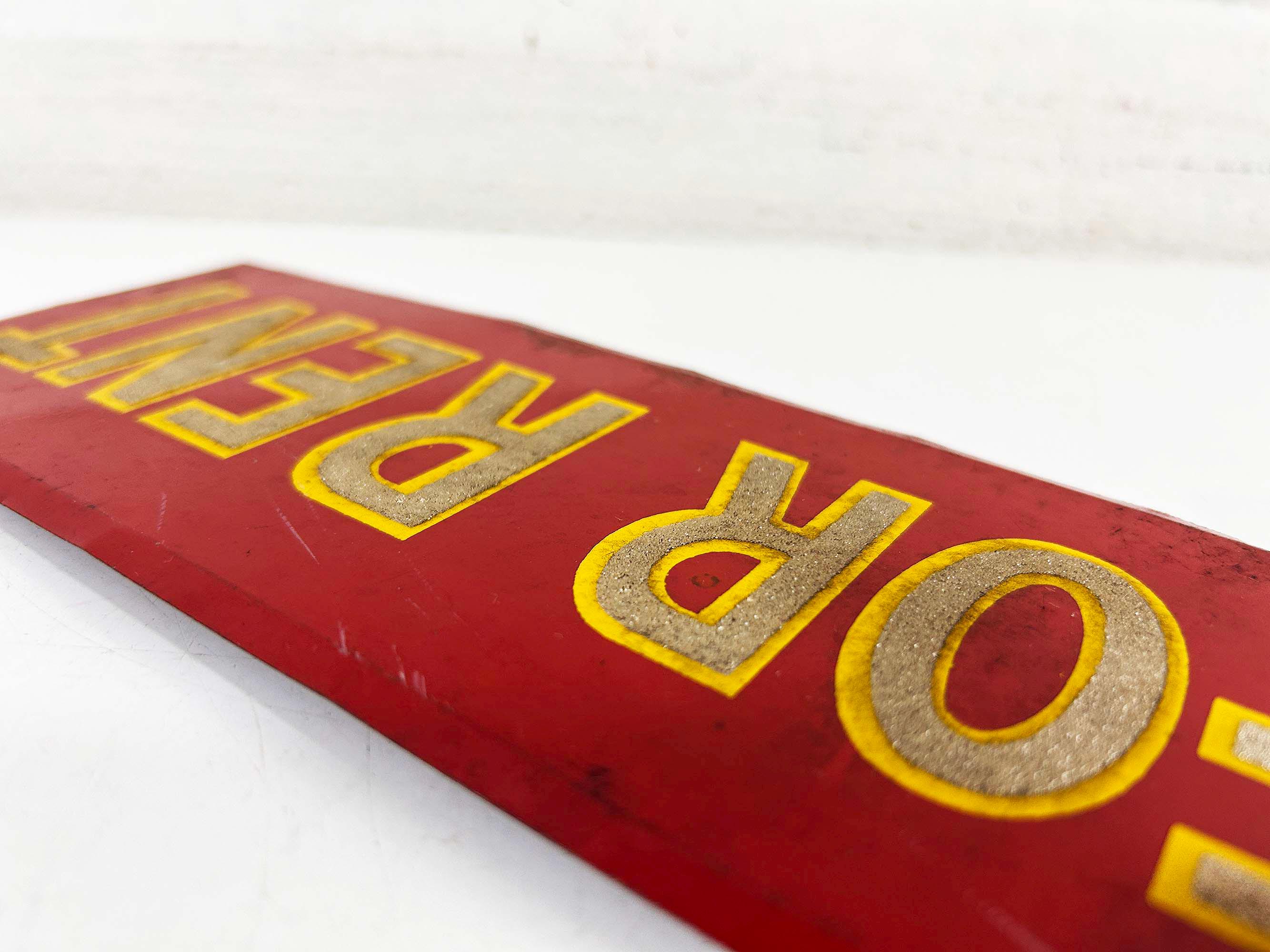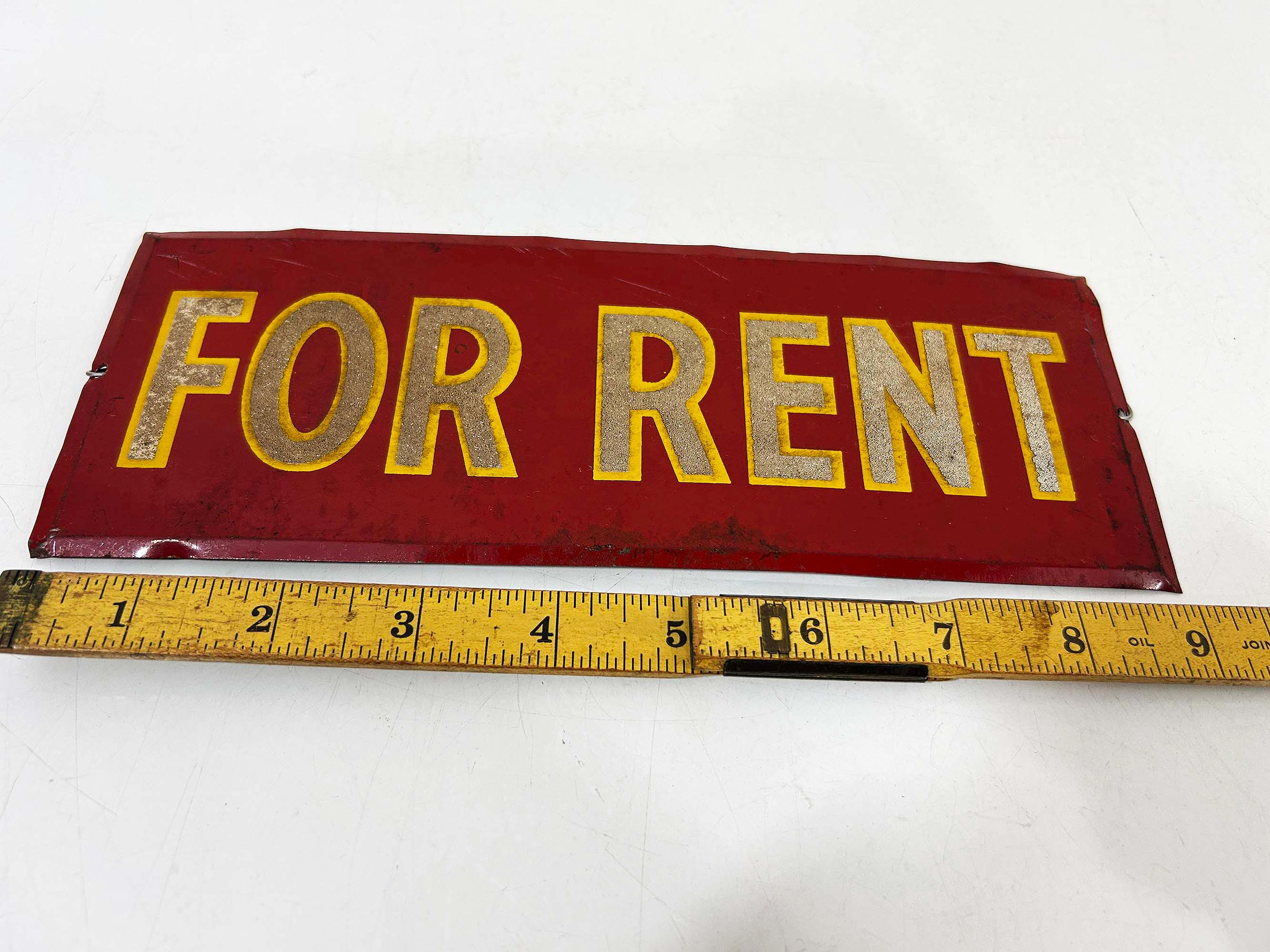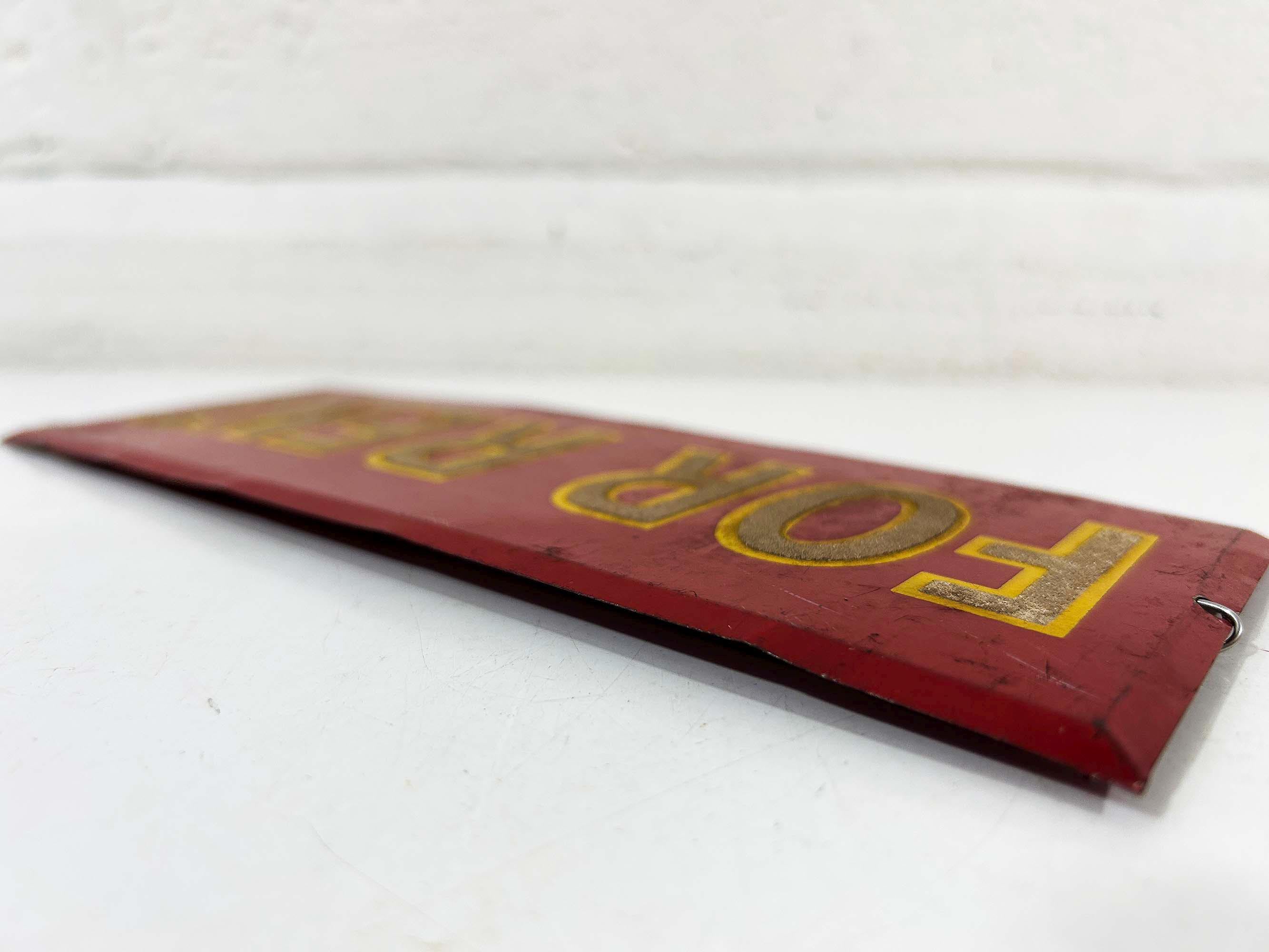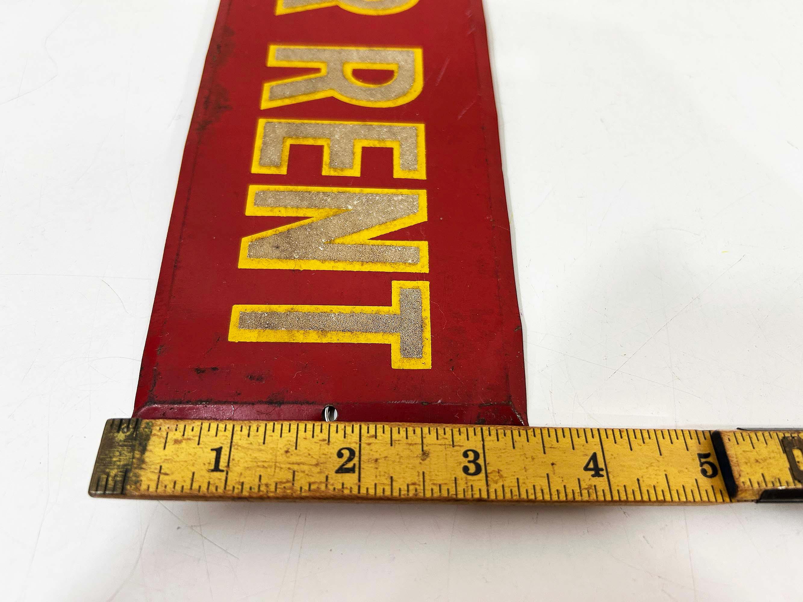 Very cool vintage red metal "For Rent" sign. It has some wear but still looks amazing. It is approximately 9 inches wide and 3 1/2 inches tall.