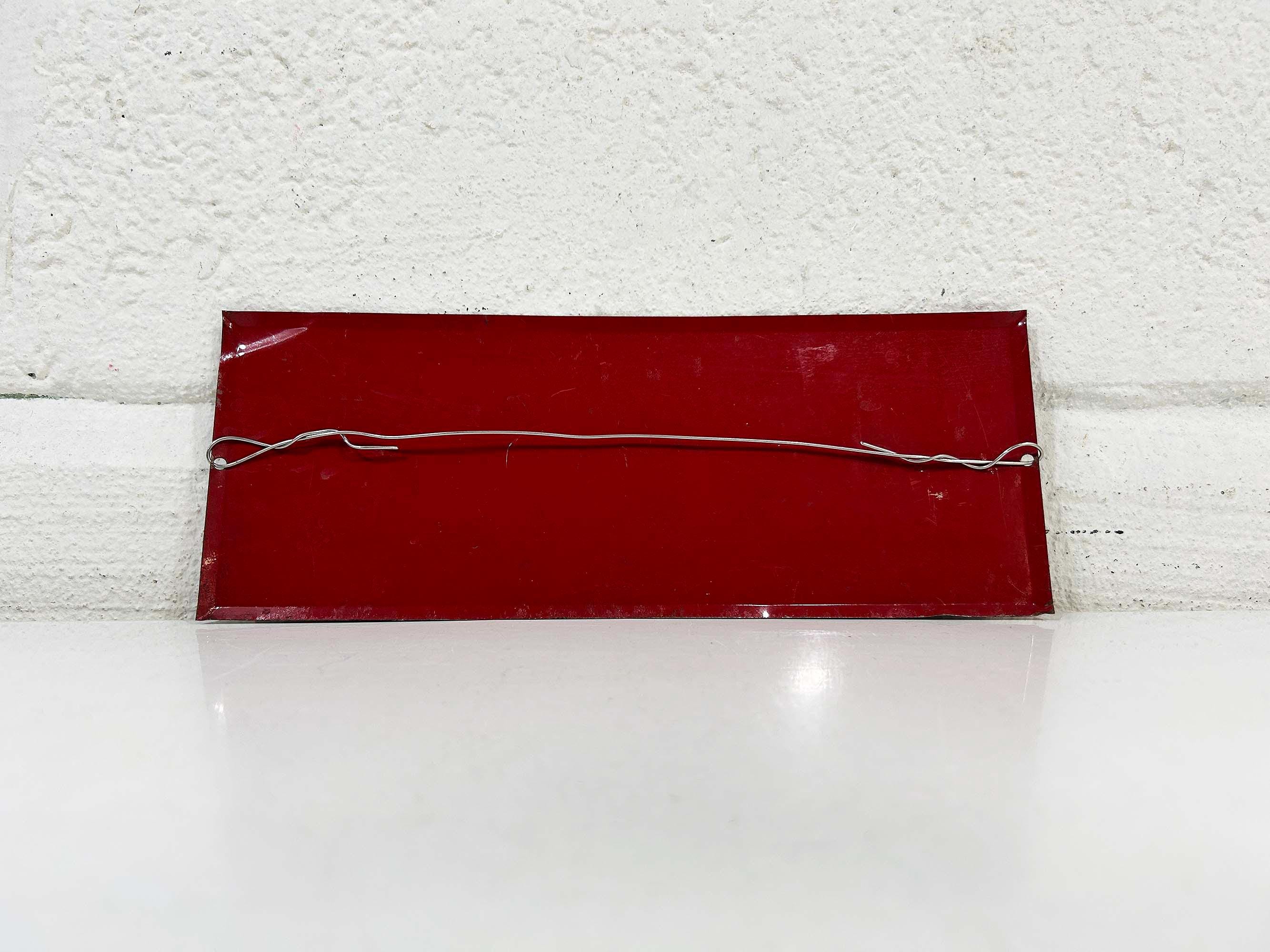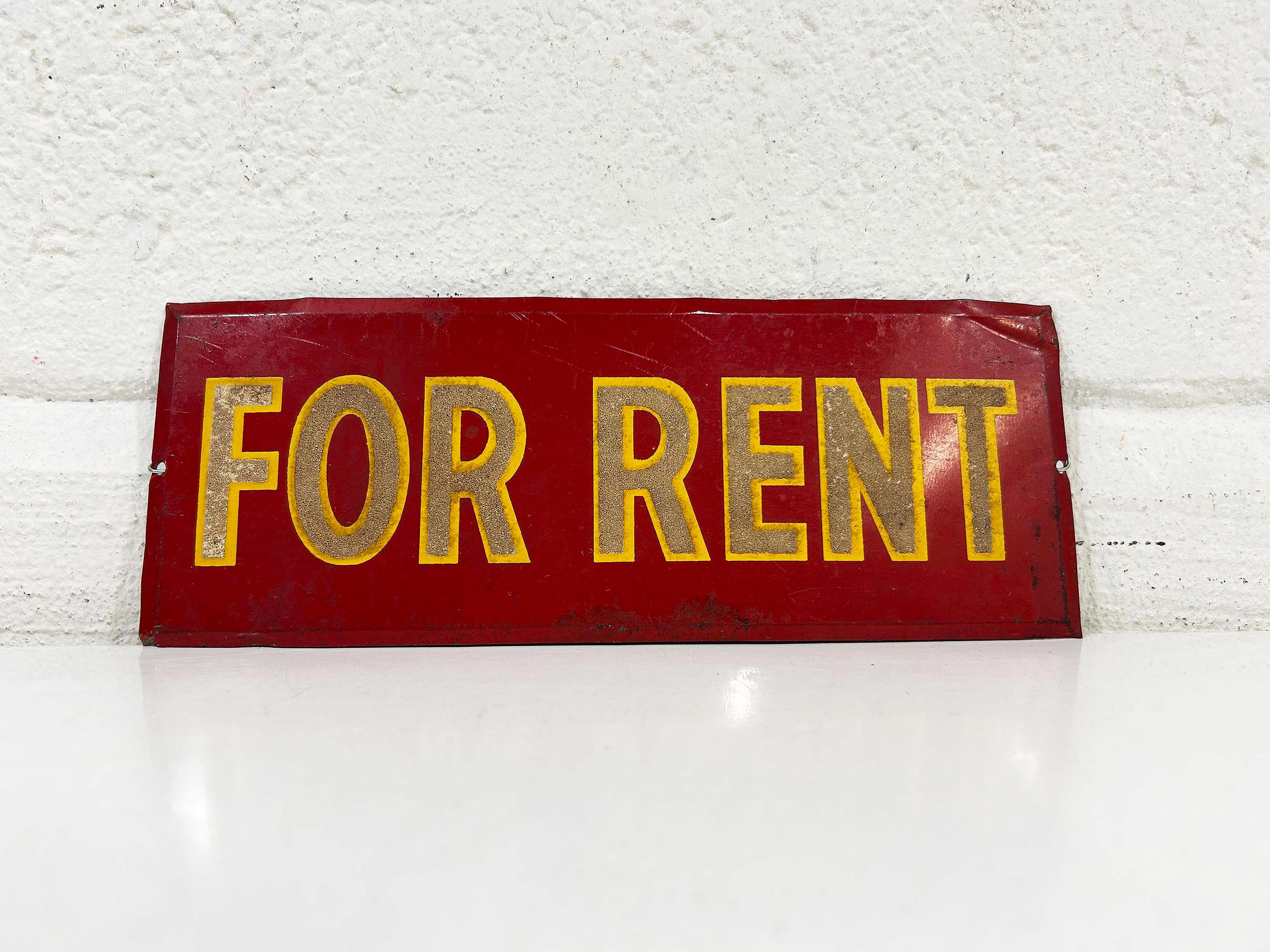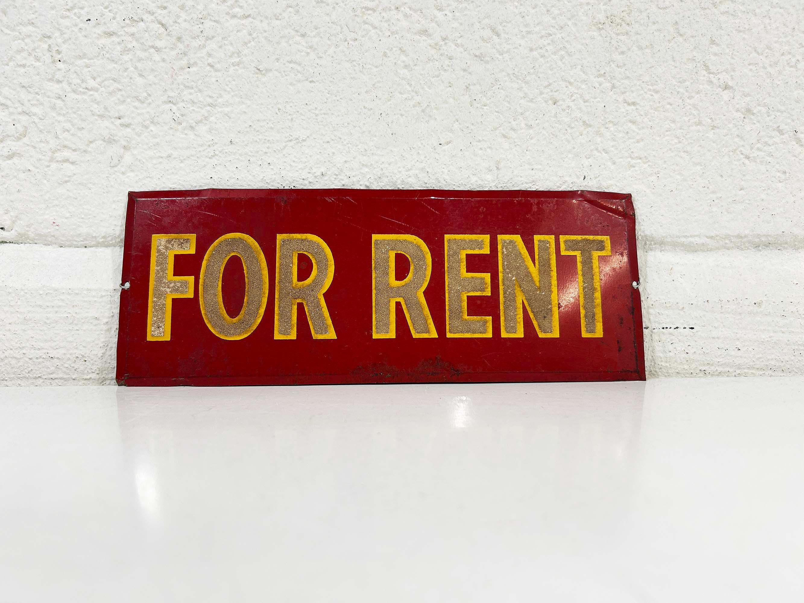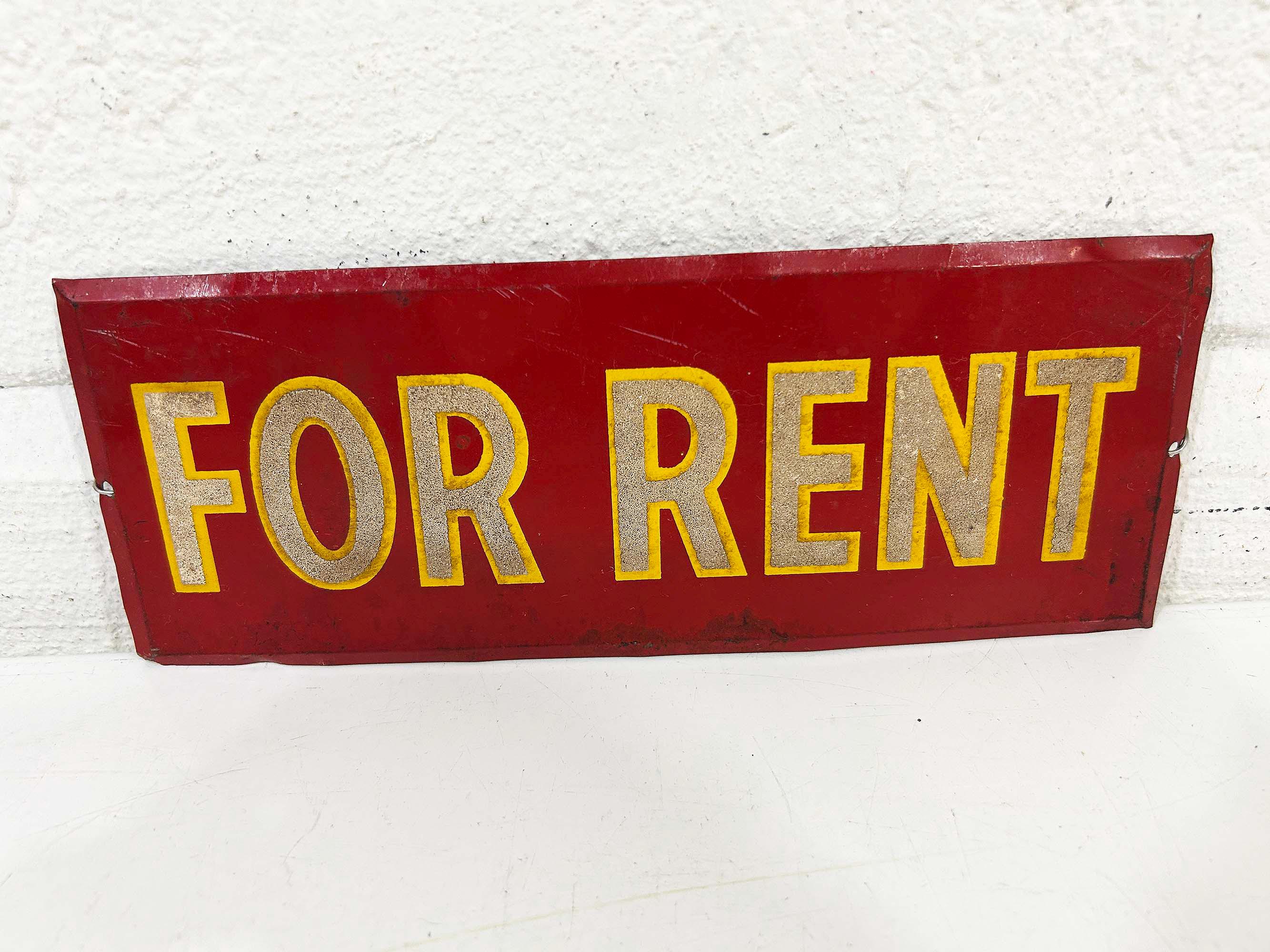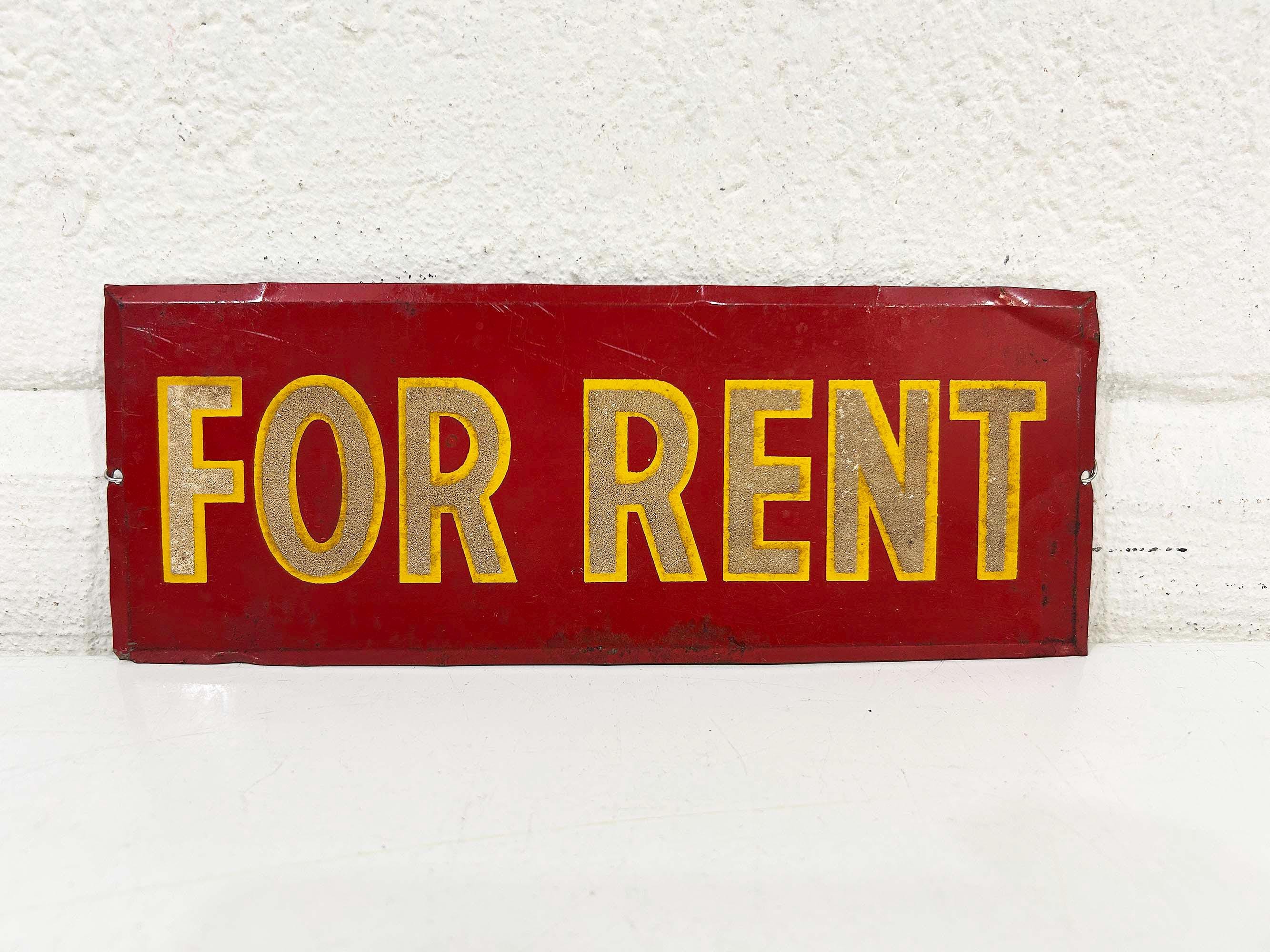 Very cool vintage red metal "For Rent" sign. It has some wear but still looks amazing. It is approximately 9 inches wide and 3 1/2 inches tall.