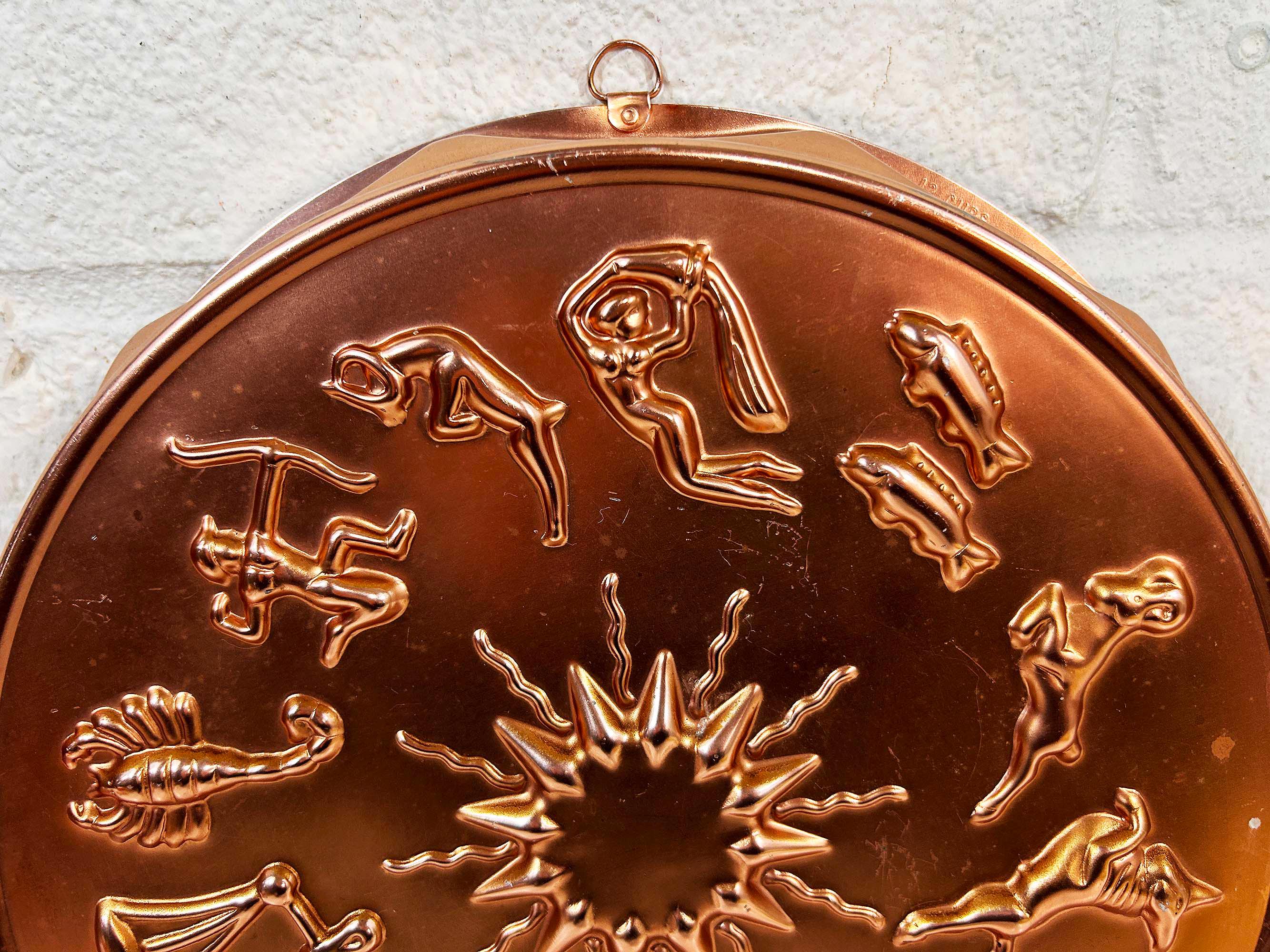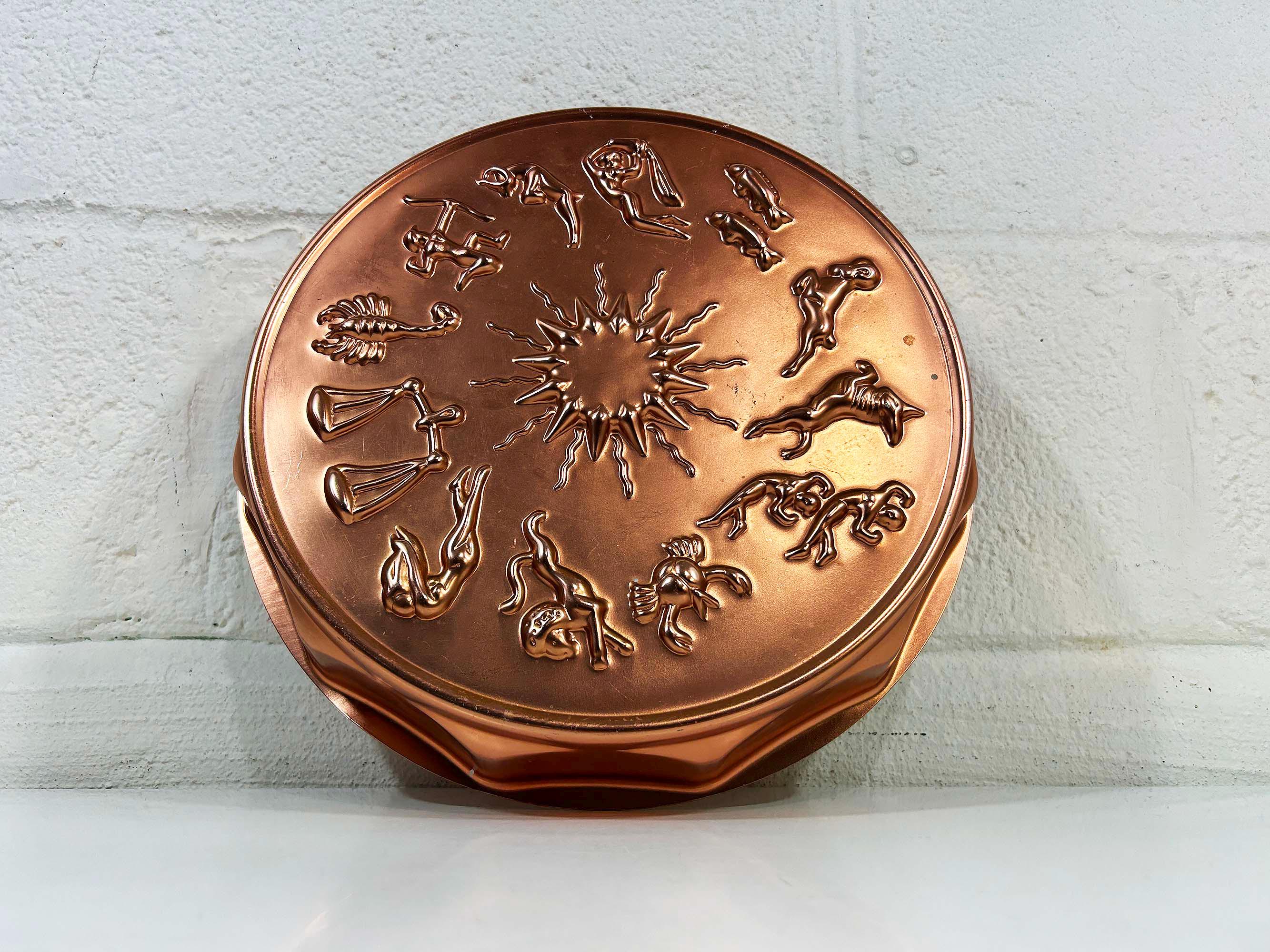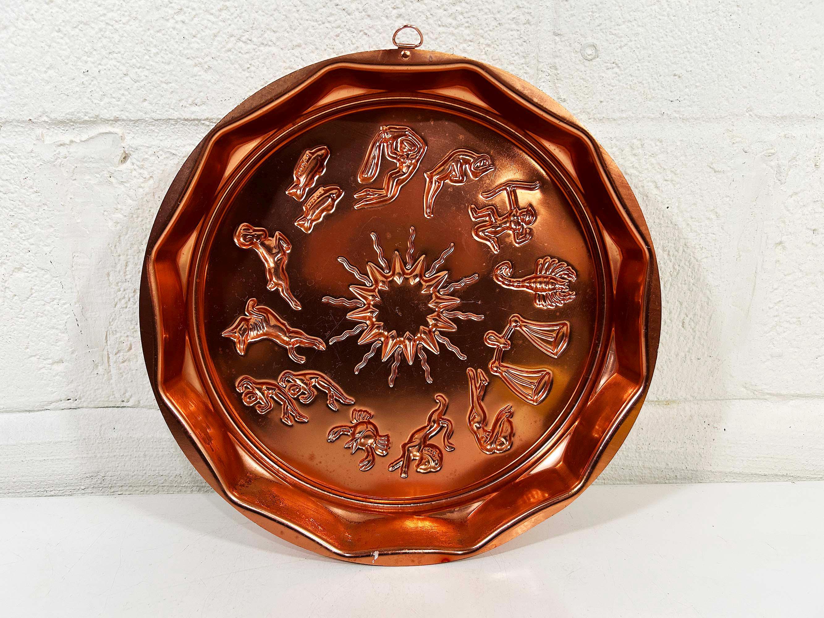 Lovely copper 12 cup mold with the signs of the Zodiac! This was originally made as a mold but can be used as cute wall decor. It is in good vintage condition with some scratches in a few spots and general wear - please be sure to inspect all photos closely. It is approximately 12 inches in diameter and 2 inches tall.