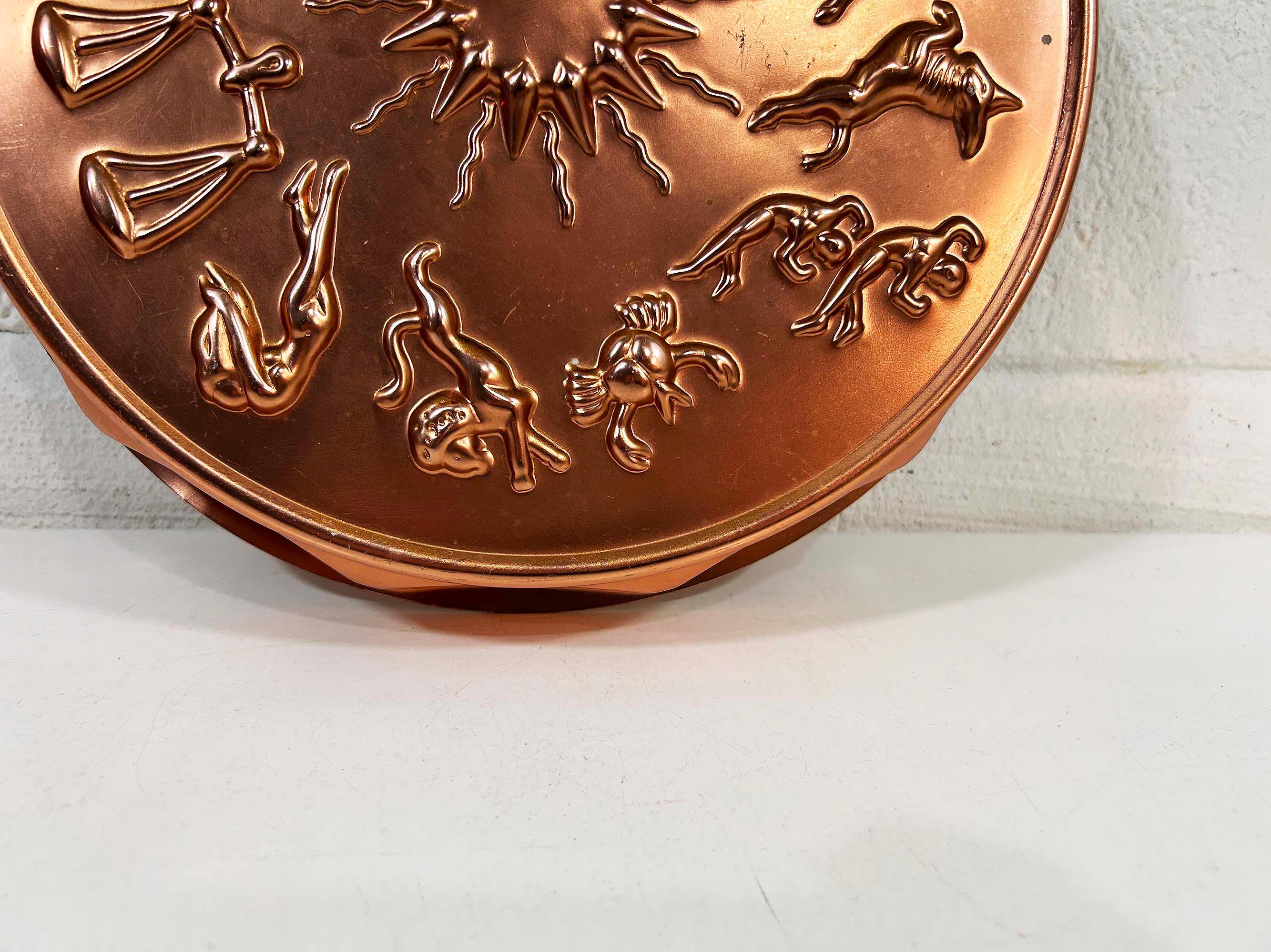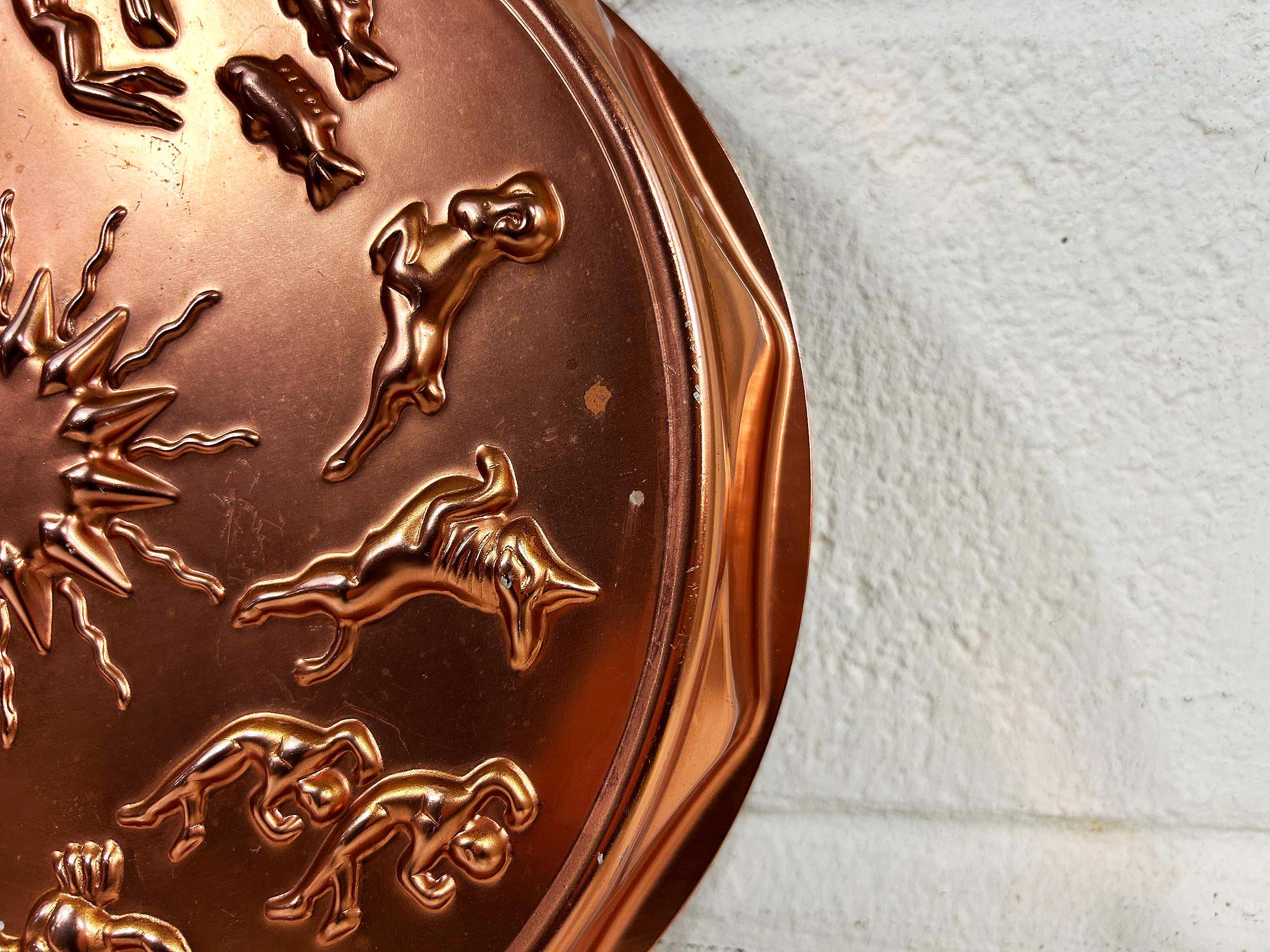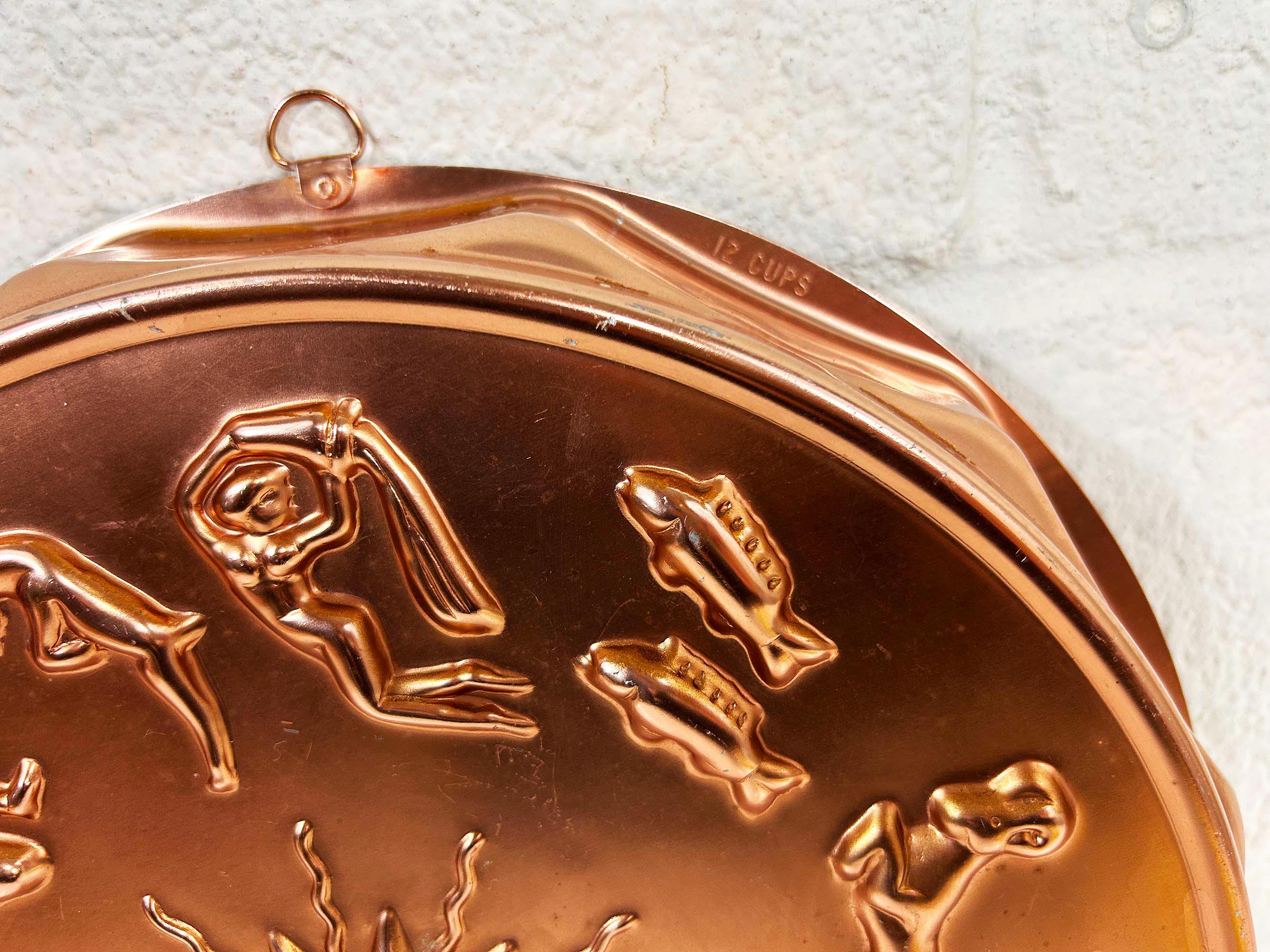 Lovely copper 12 cup mold with the signs of the Zodiac! This was originally made as a mold but can be used as cute wall decor. It is in good vintage condition with some scratches in a few spots and general wear - please be sure to inspect all photos closely. It is approximately 12 inches in diameter and 2 inches tall.