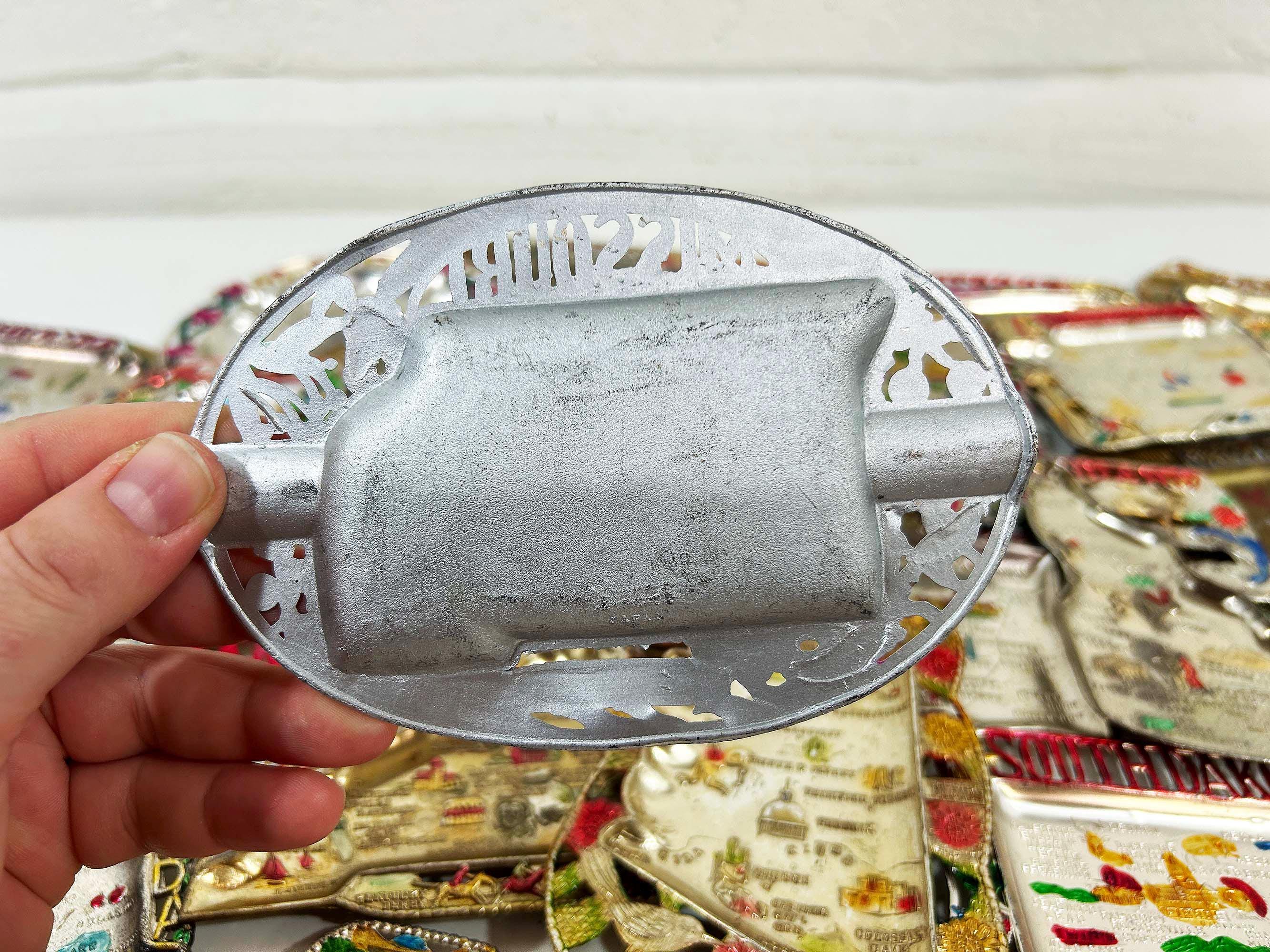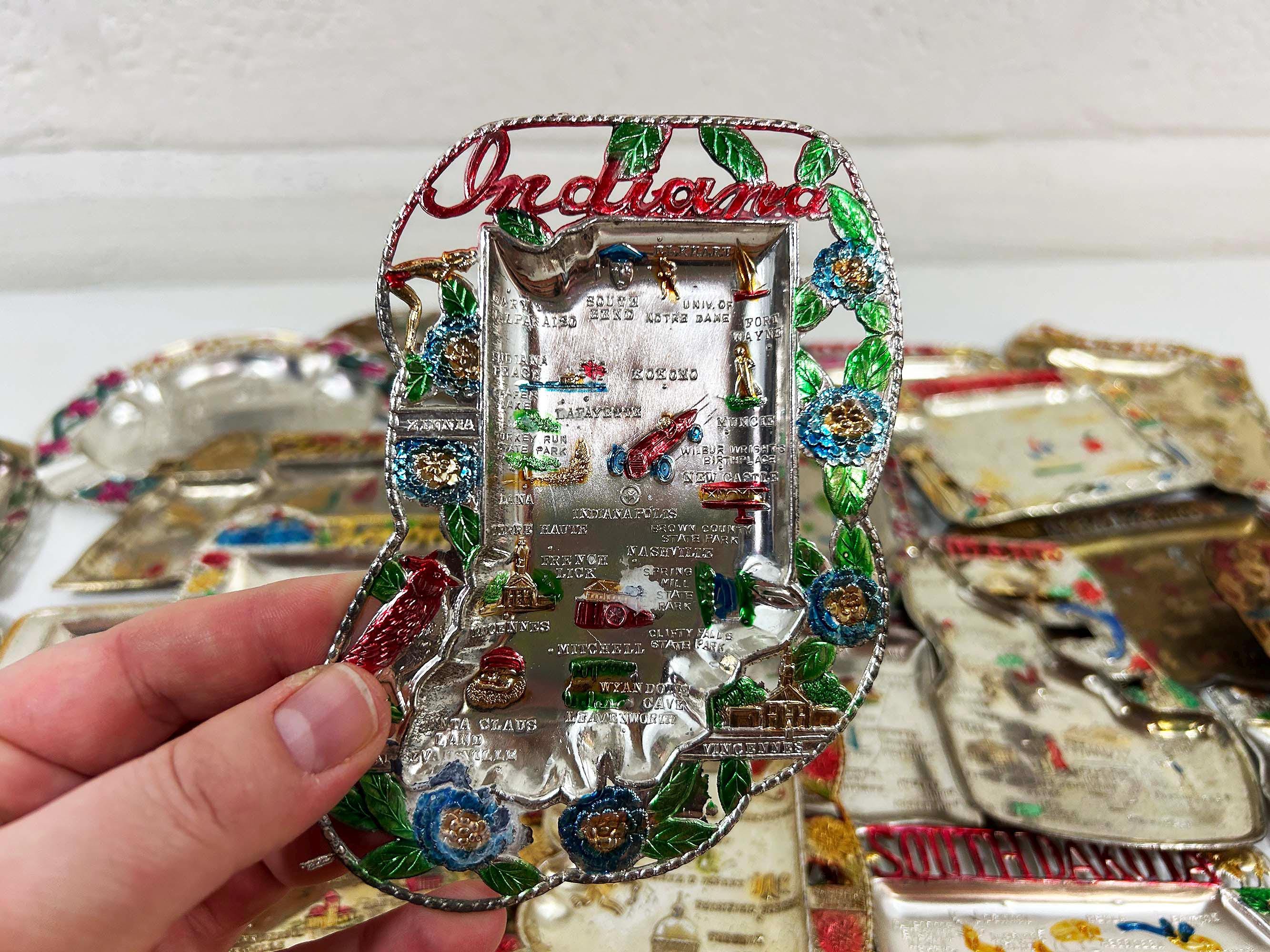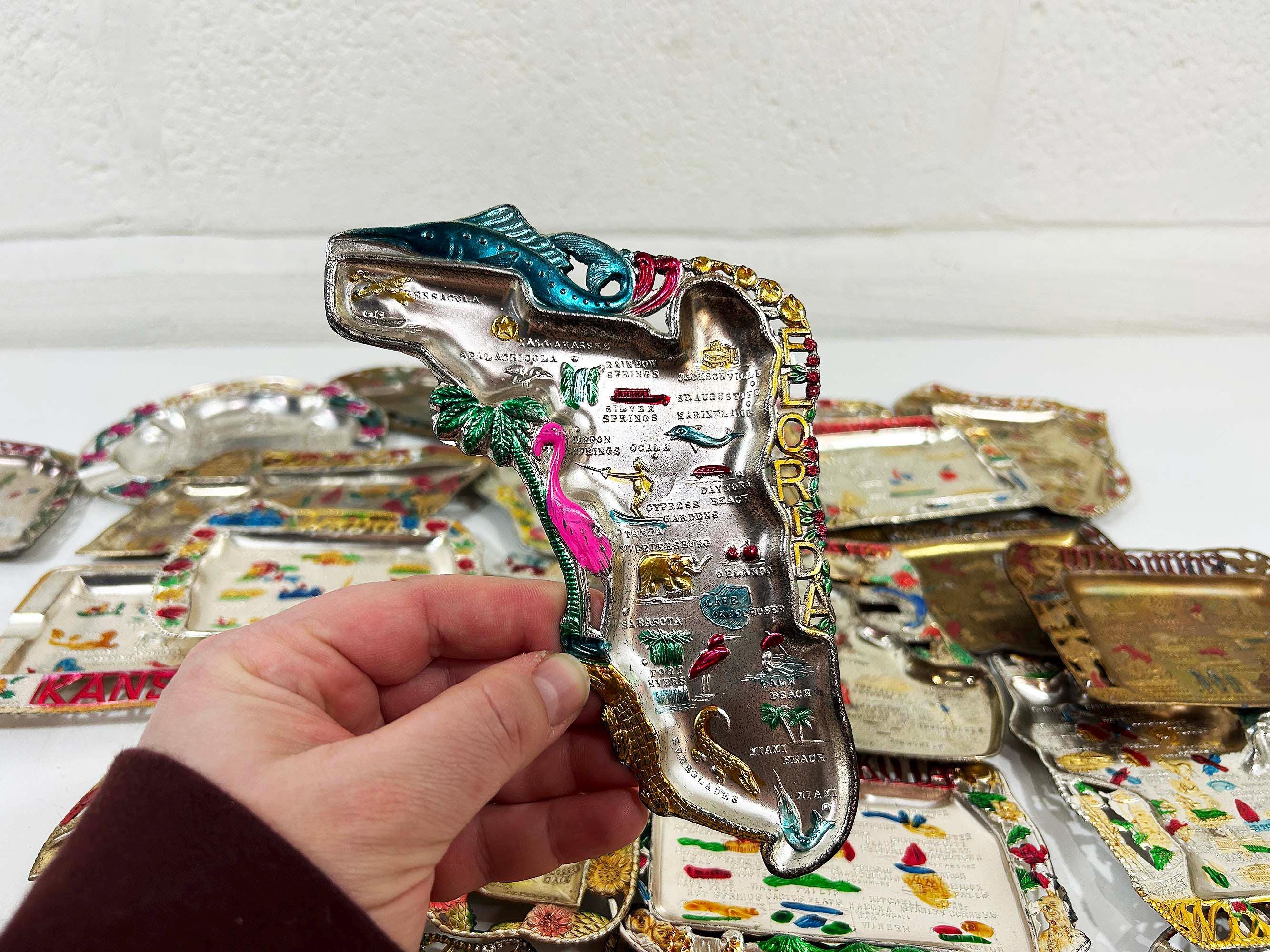 Super cool vintage US state souvenir ashtrays! Awesome graphics and designs on these. This would work great as a jewelry or change dish if you don't smoke. All of the trays have wear and damage - please be sure to inspect all photos closely. All the trays are marked "Made in Japan" on the back. They are all made of metal - possibly aluminum. They are all small trays - usually no more than 5 inches wide and 3 inches tall but it varies based on the shape. Each ashtray is sold individually - choose which state you'd like from the drop down menu.