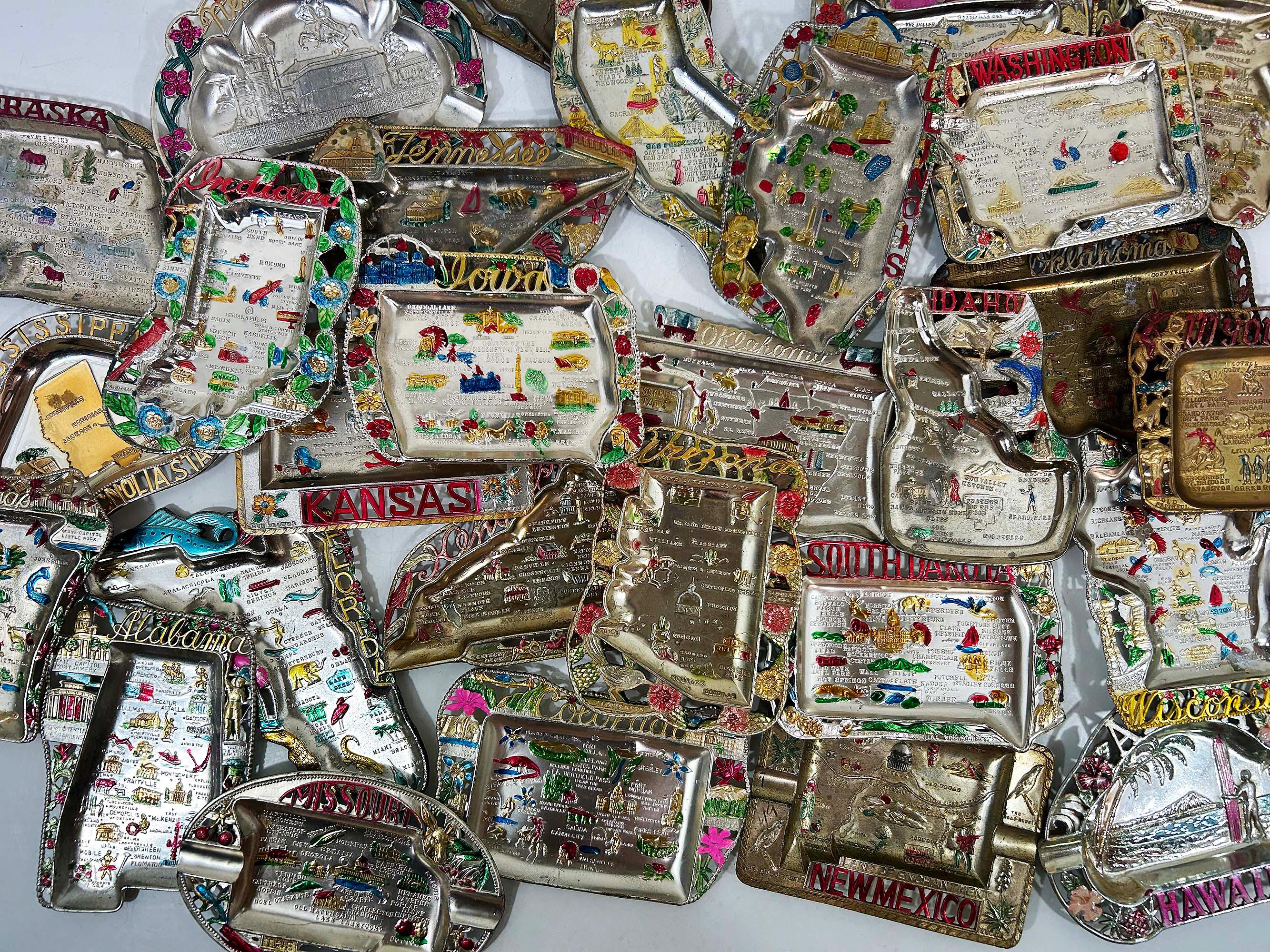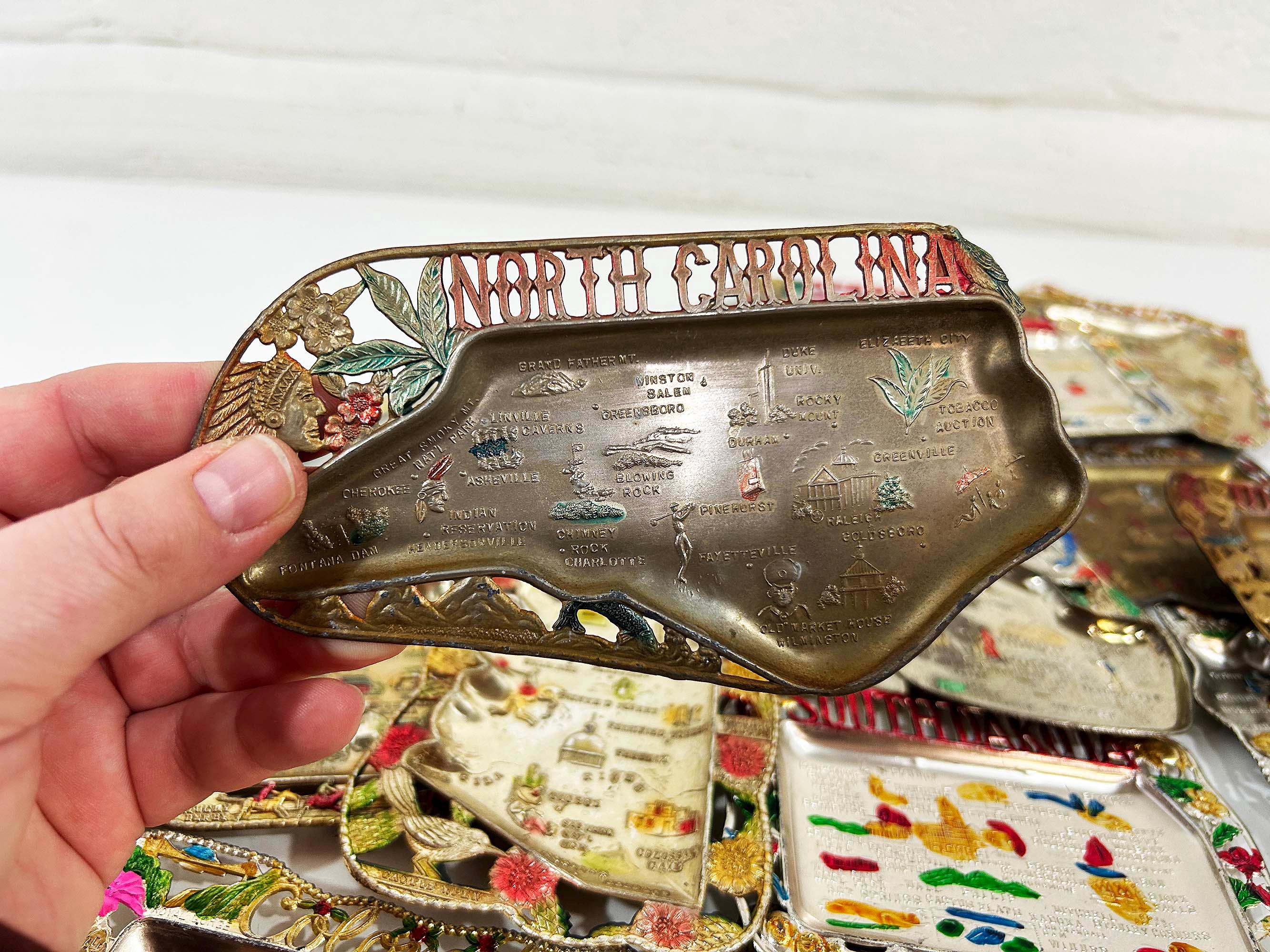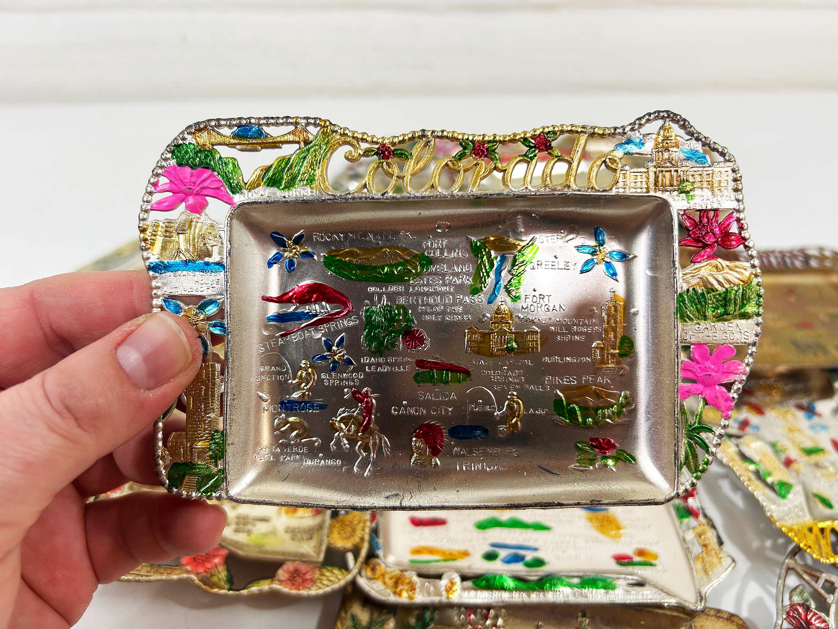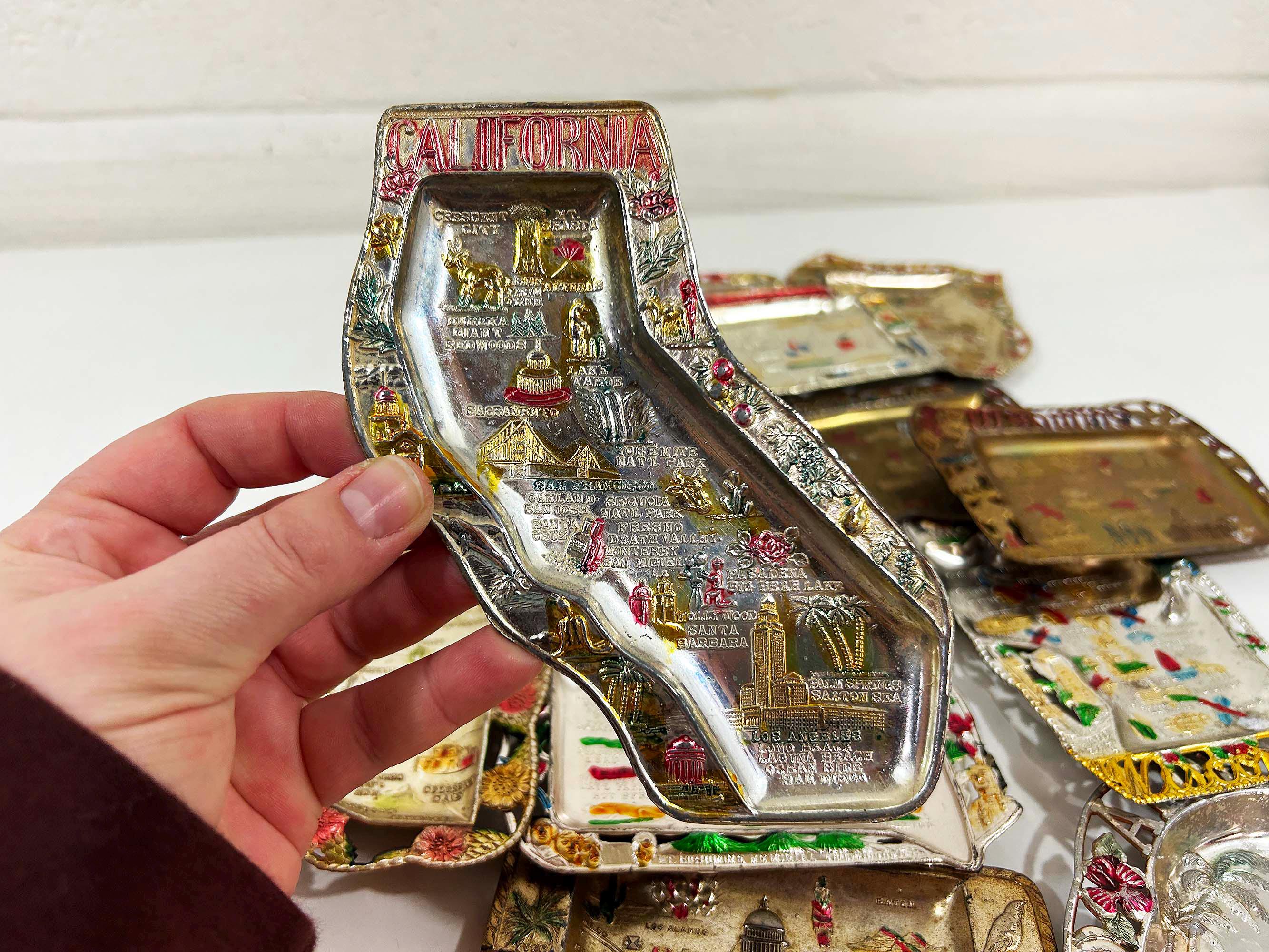 Super cool vintage US state souvenir ashtrays! Awesome graphics and designs on these. This would work great as a jewelry or change dish if you don't smoke. All of the trays have wear and damage - please be sure to inspect all photos closely. All the trays are marked "Made in Japan" on the back. They are all made of metal - possibly aluminum. They are all small trays - usually no more than 5 inches wide and 3 inches tall but it varies based on the shape. Each ashtray is sold individually - choose which state you'd like from the drop down menu.