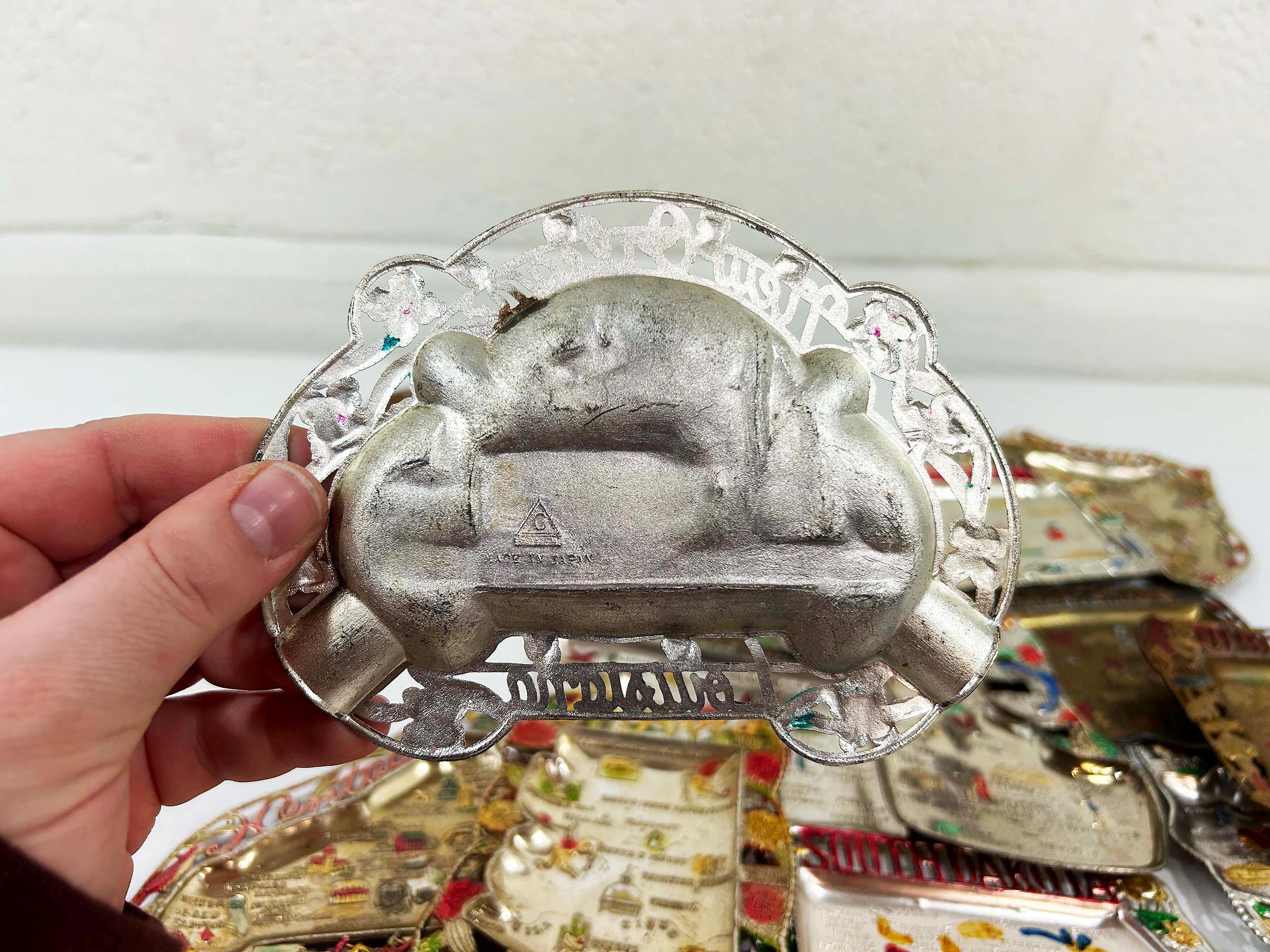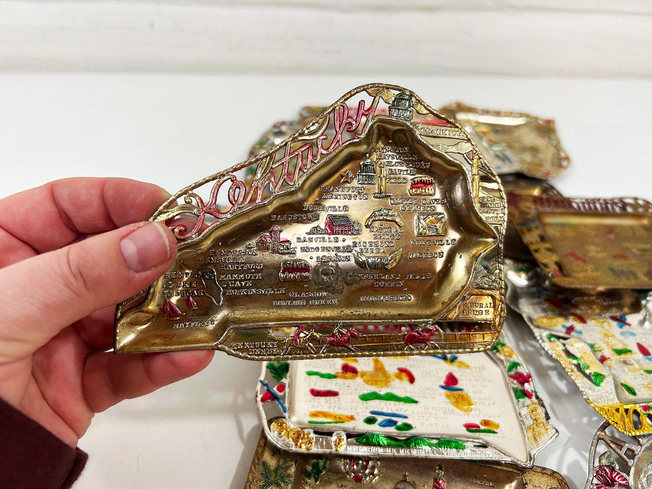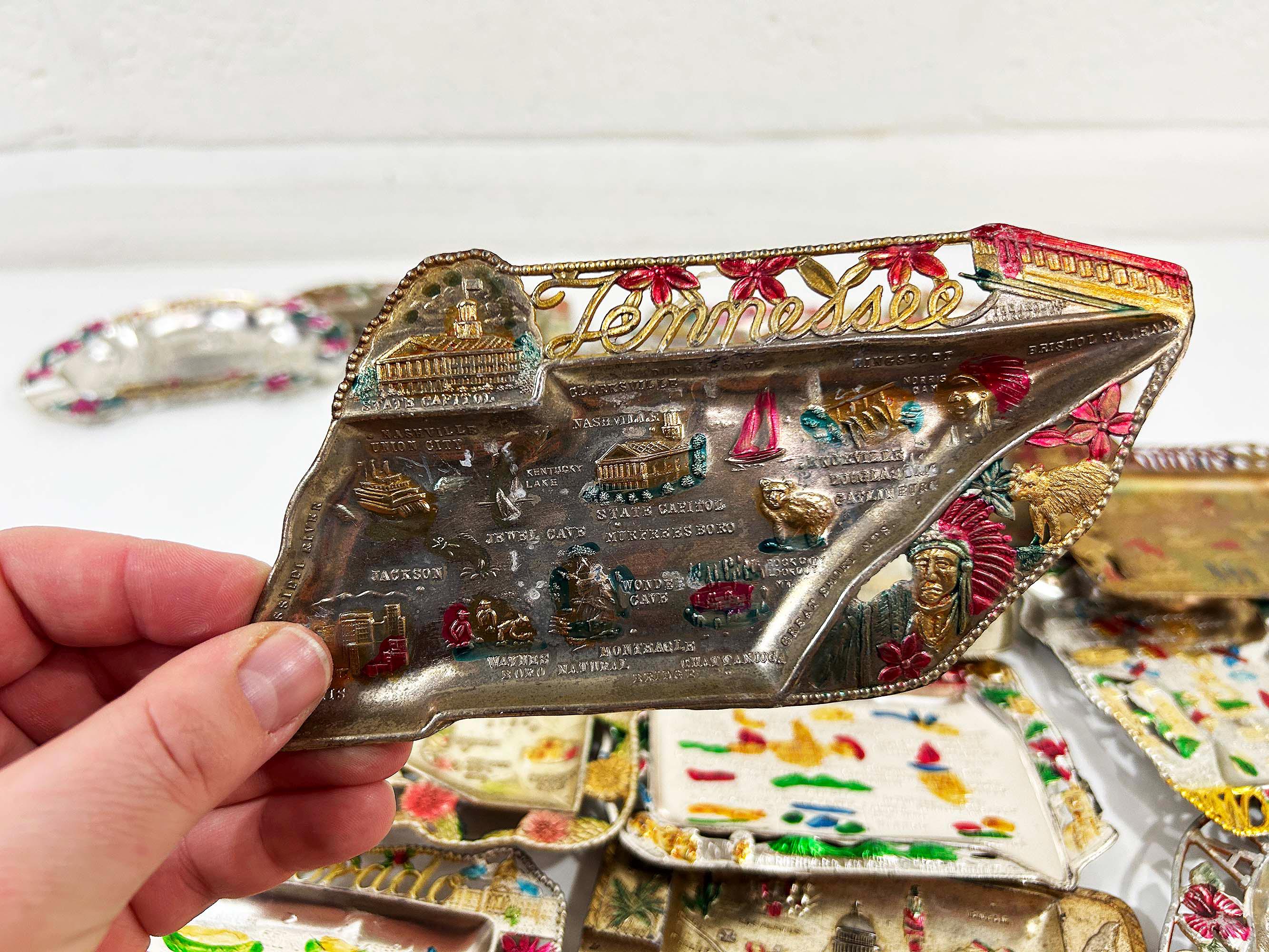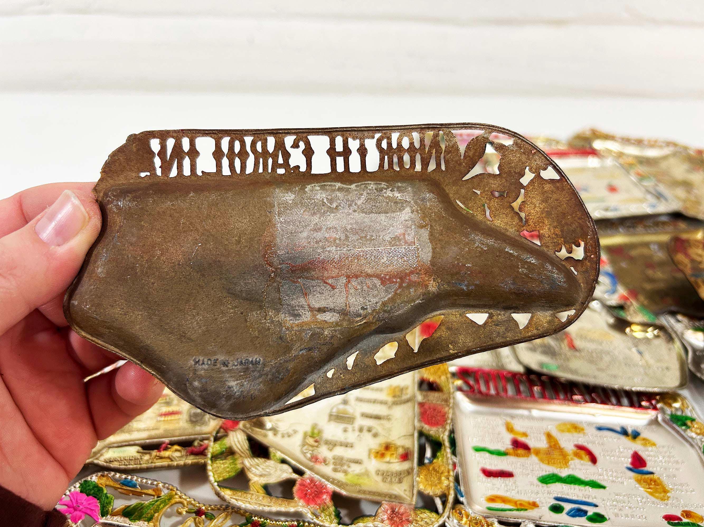 Super cool vintage US state souvenir ashtrays! Awesome graphics and designs on these. This would work great as a jewelry or change dish if you don't smoke. All of the trays have wear and damage - please be sure to inspect all photos closely. All the trays are marked "Made in Japan" on the back. They are all made of metal - possibly aluminum. They are all small trays - usually no more than 5 inches wide and 3 inches tall but it varies based on the shape. Each ashtray is sold individually - choose which state you'd like from the drop down menu.