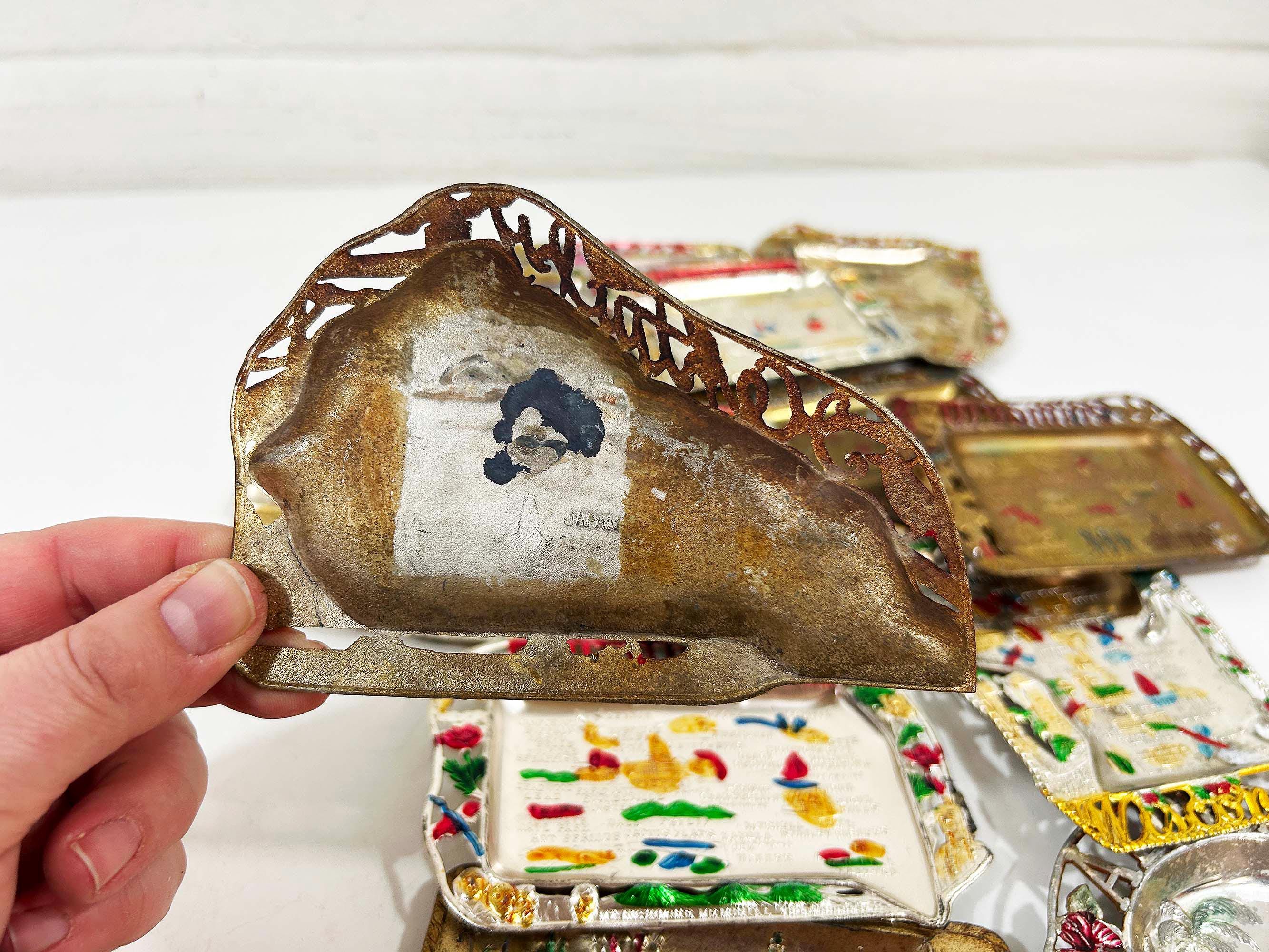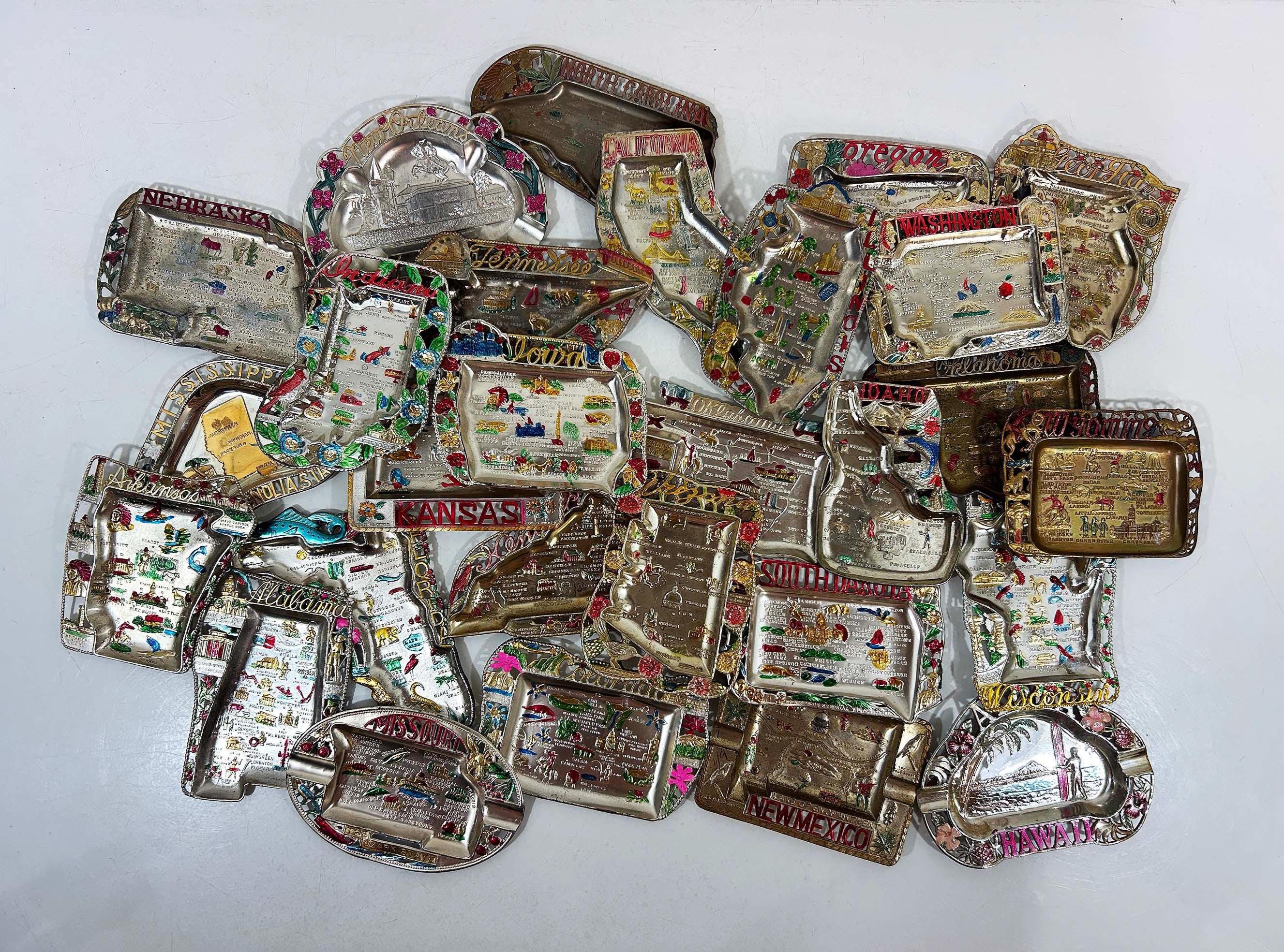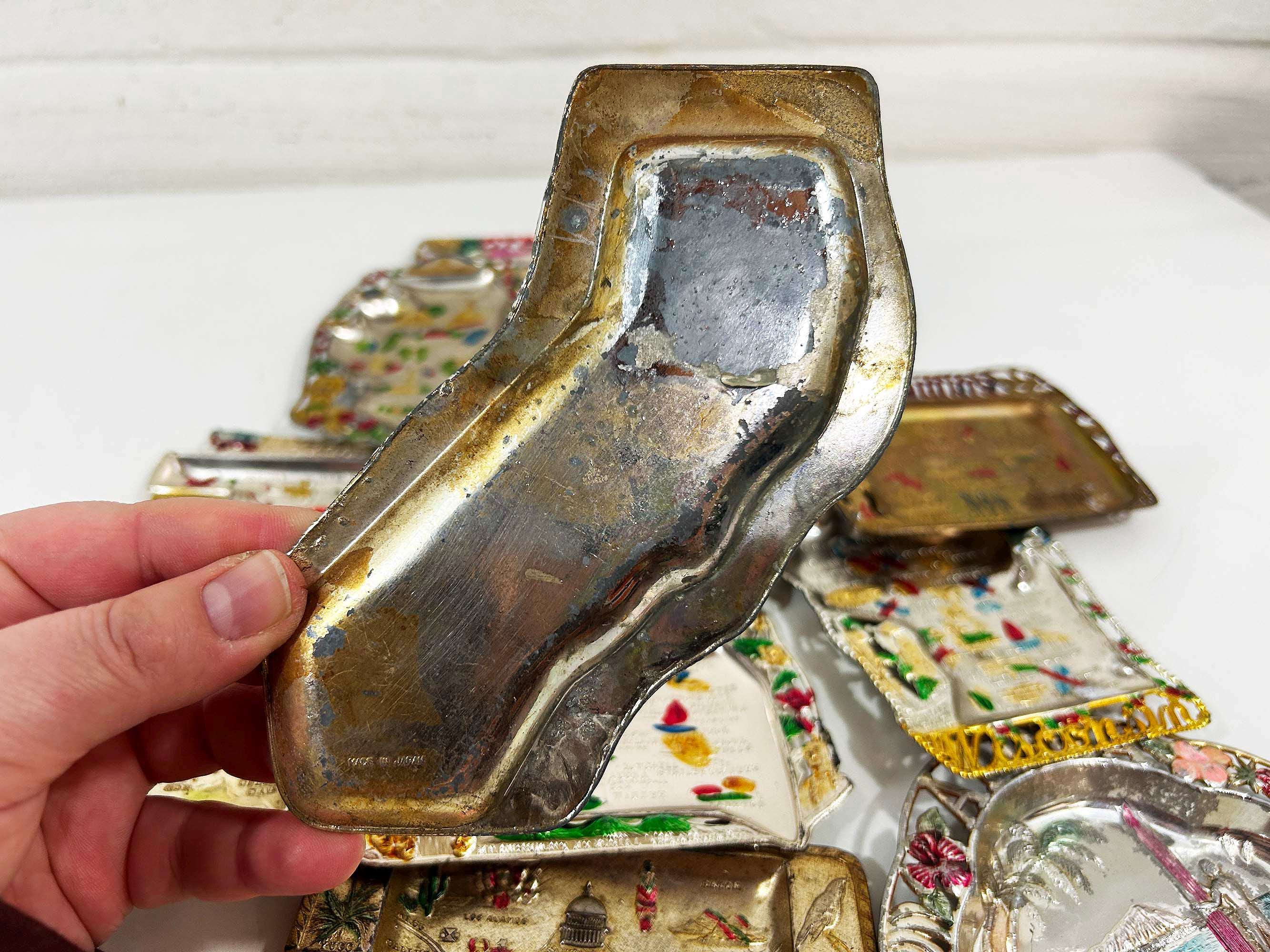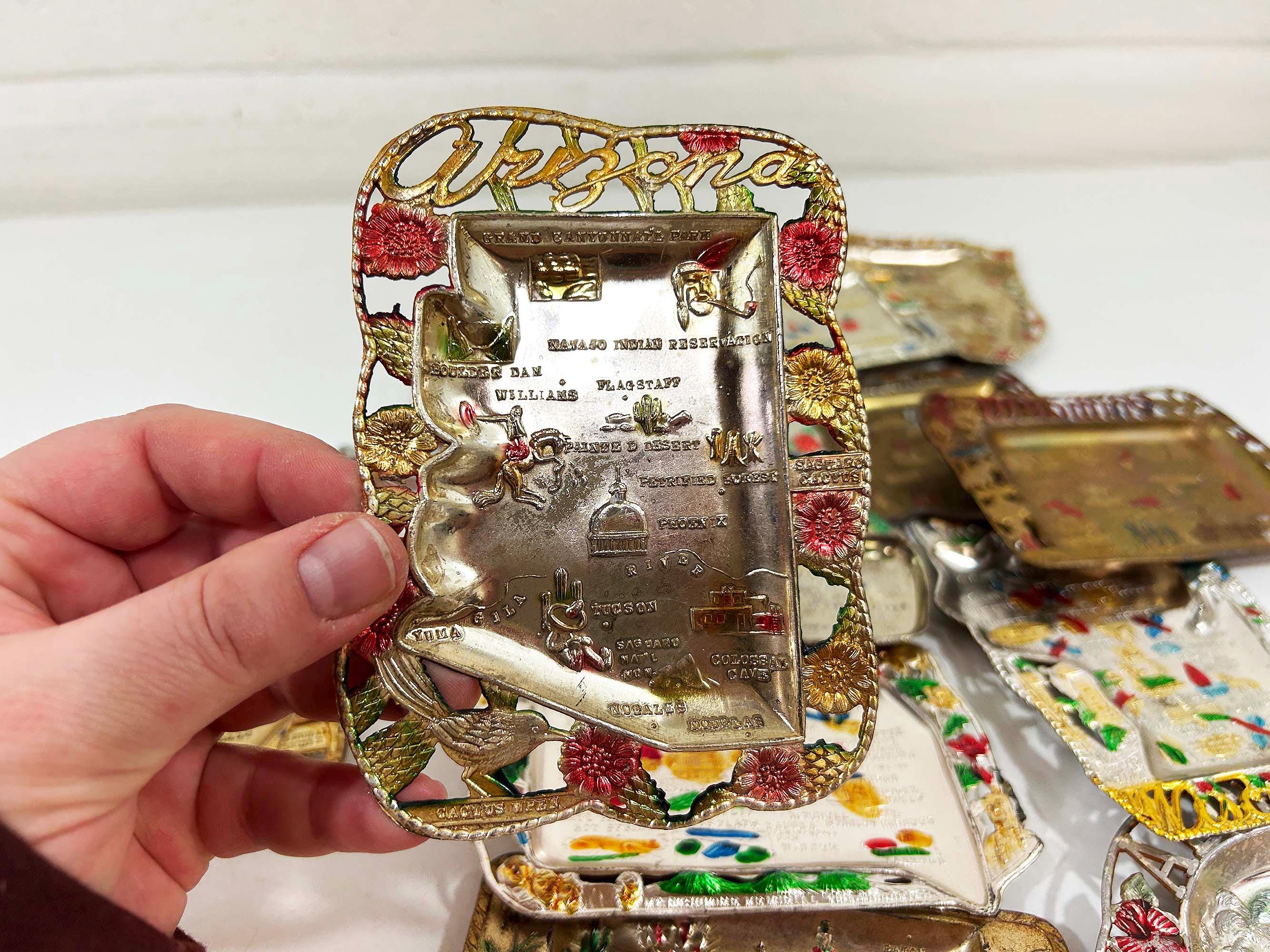 Super cool vintage US state souvenir ashtrays! Awesome graphics and designs on these. This would work great as a jewelry or change dish if you don't smoke. All of the trays have wear and damage - please be sure to inspect all photos closely. All the trays are marked "Made in Japan" on the back. They are all made of metal - possibly aluminum. They are all small trays - usually no more than 5 inches wide and 3 inches tall but it varies based on the shape. Each ashtray is sold individually - choose which state you'd like from the drop down menu.