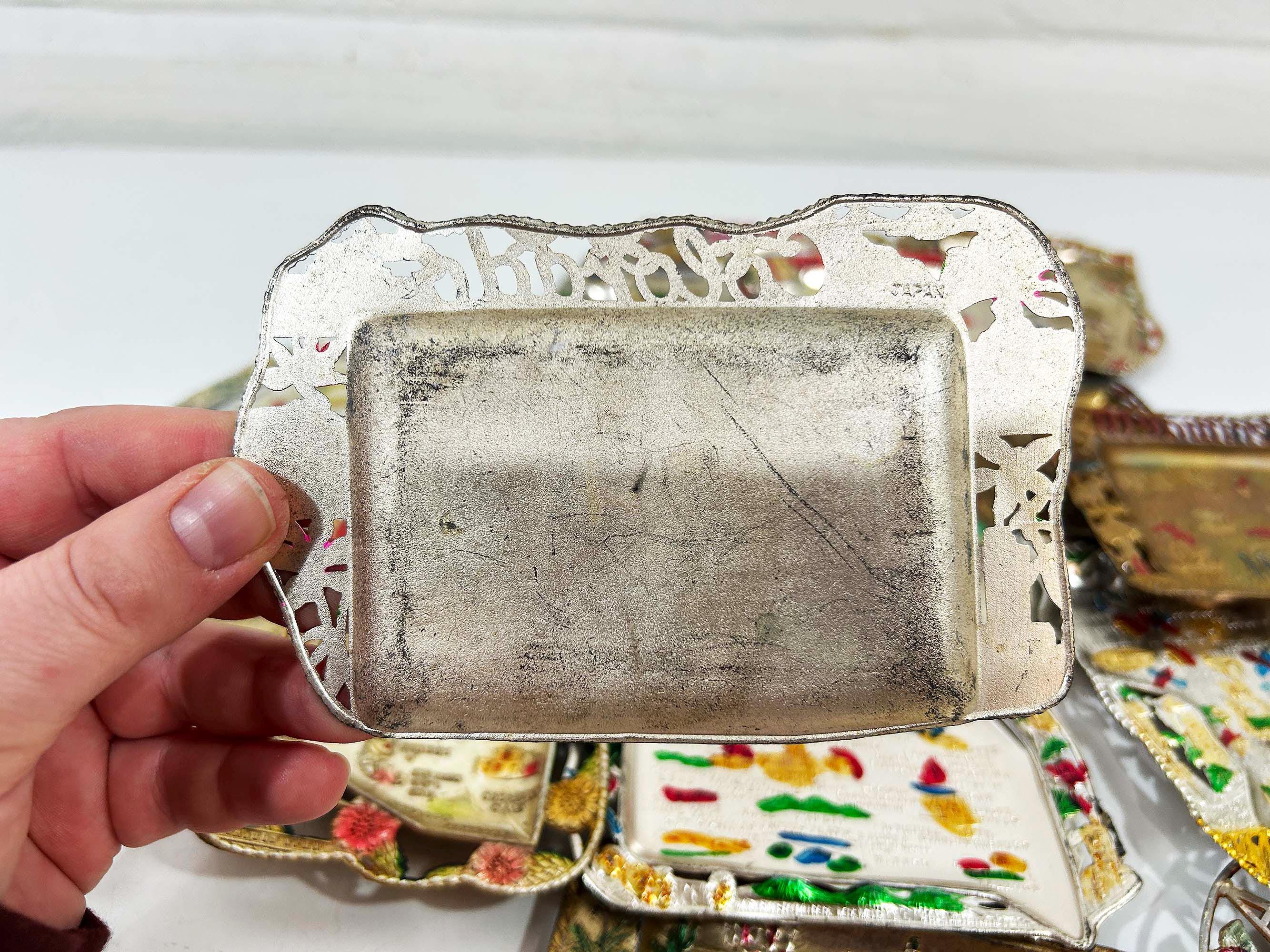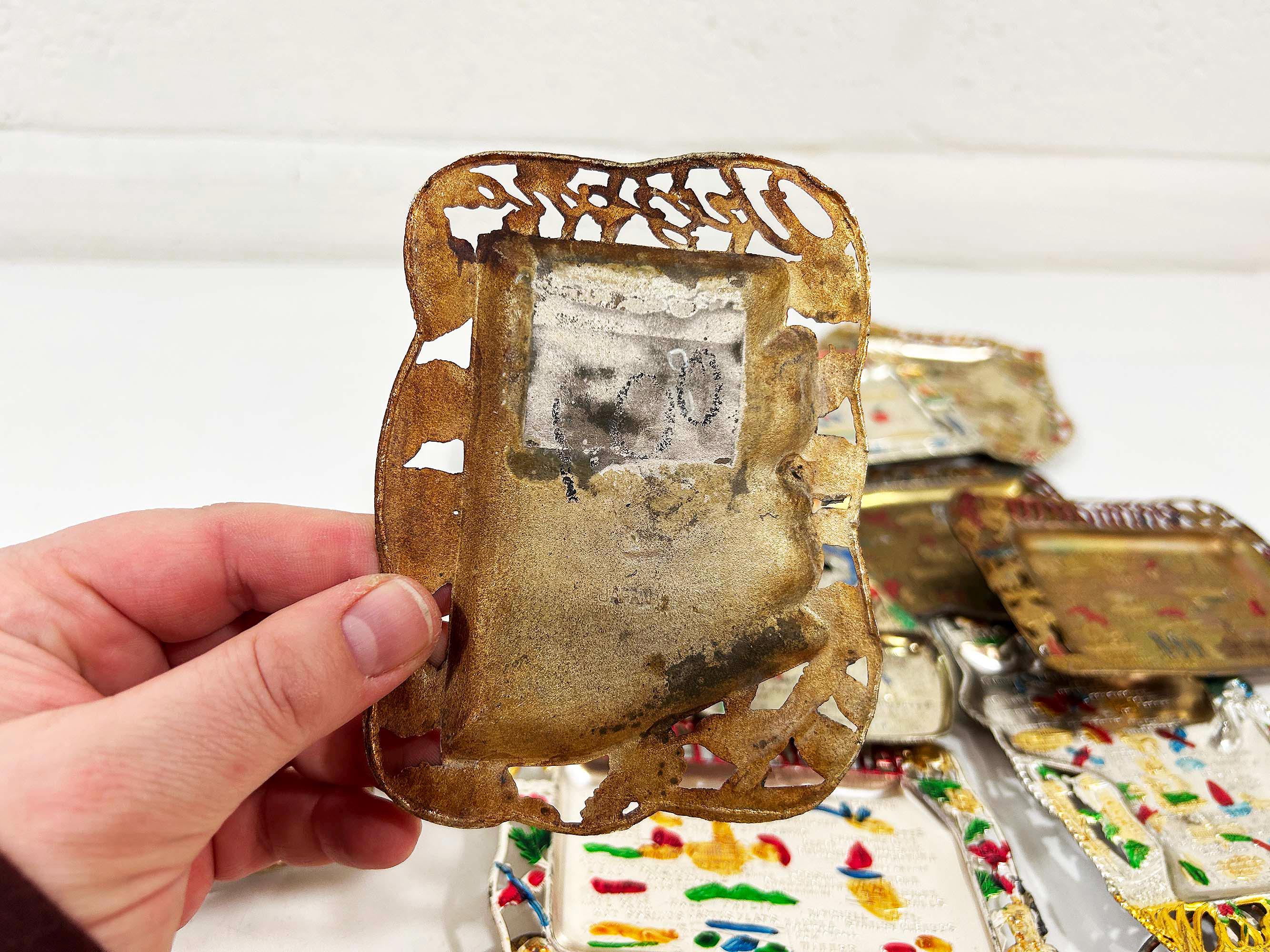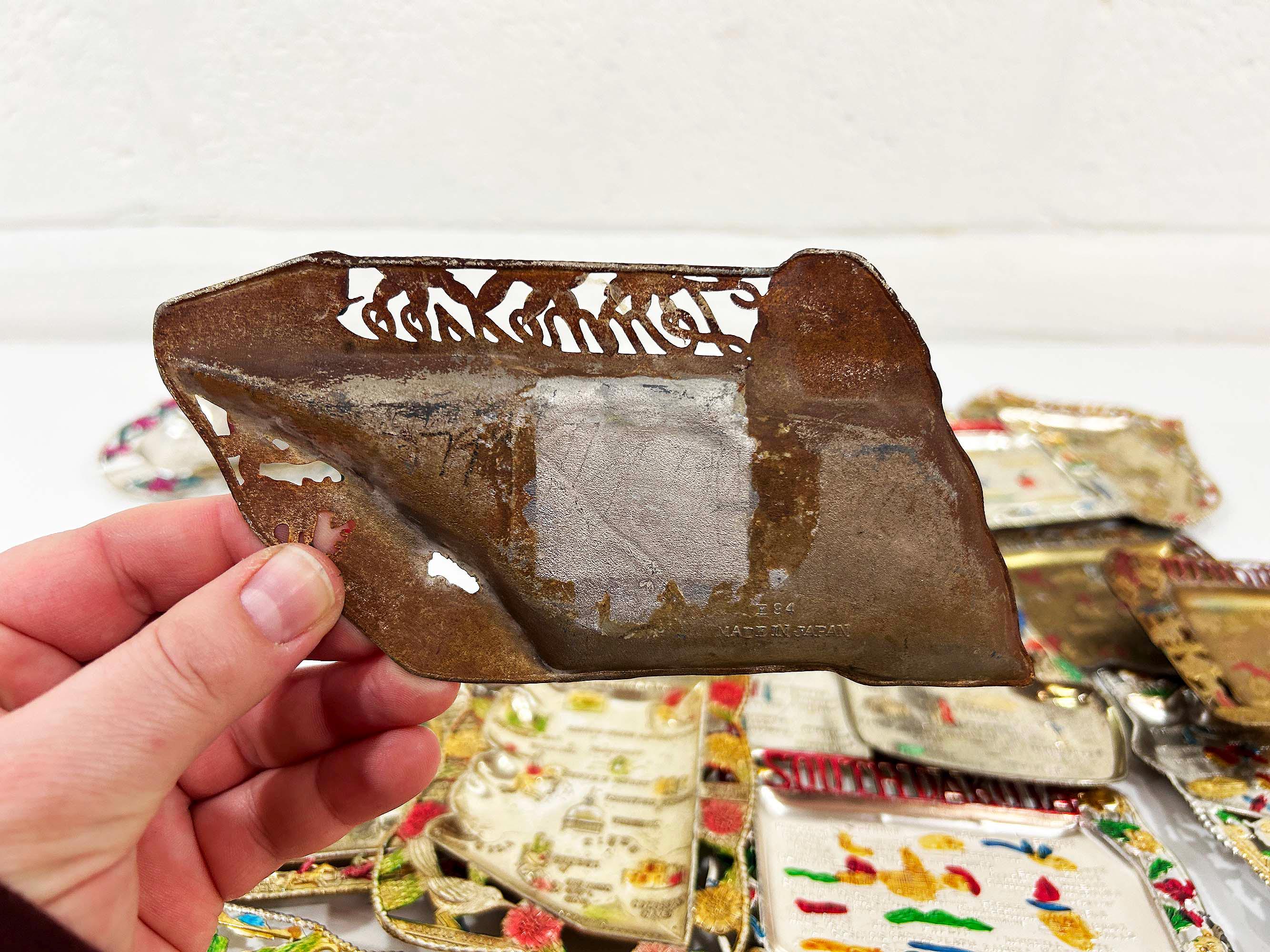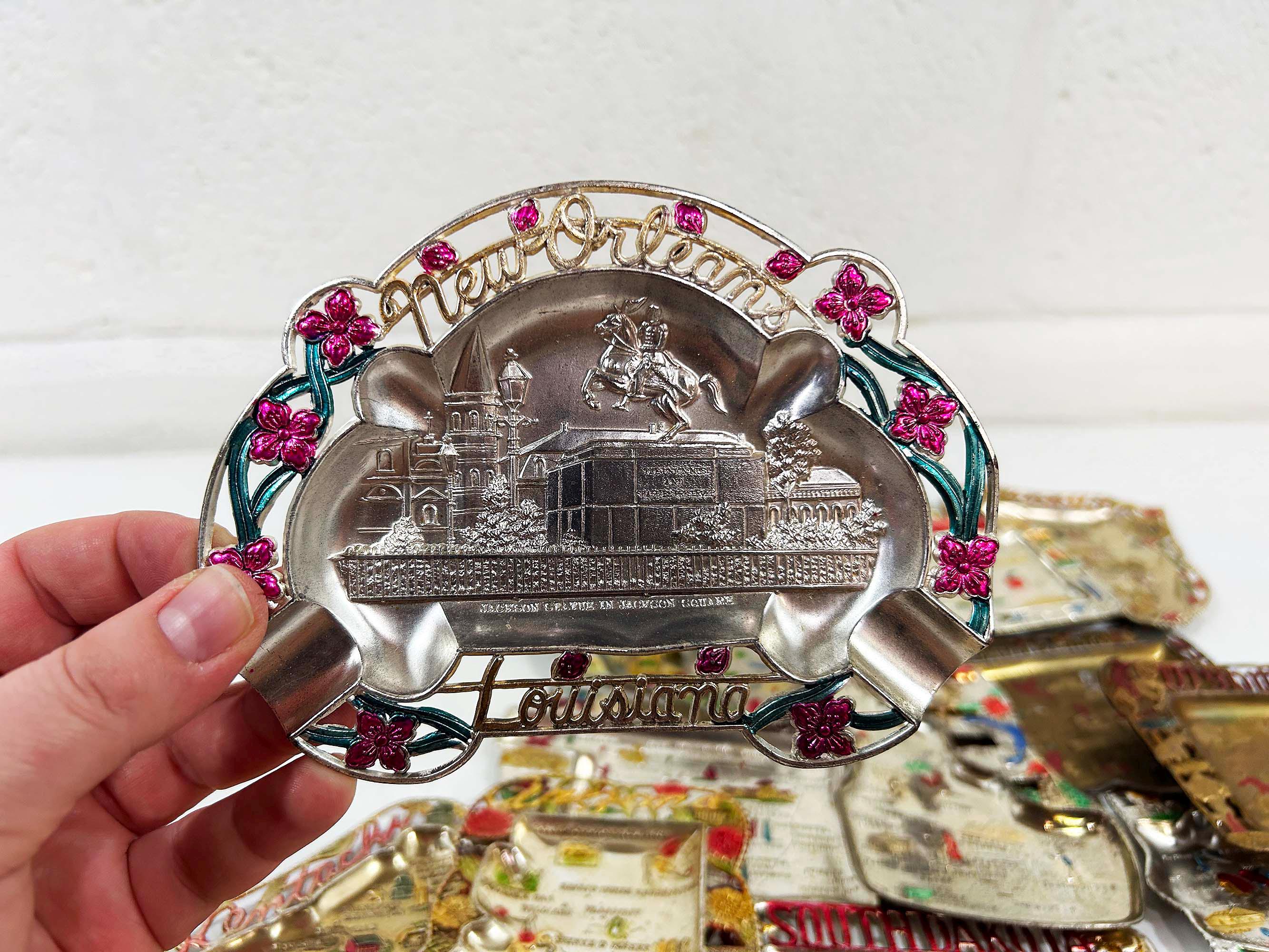 Super cool vintage US state souvenir ashtrays! Awesome graphics and designs on these. This would work great as a jewelry or change dish if you don't smoke. All of the trays have wear and damage - please be sure to inspect all photos closely. All the trays are marked "Made in Japan" on the back. They are all made of metal - possibly aluminum. They are all small trays - usually no more than 5 inches wide and 3 inches tall but it varies based on the shape. Each ashtray is sold individually - choose which state you'd like from the drop down menu.