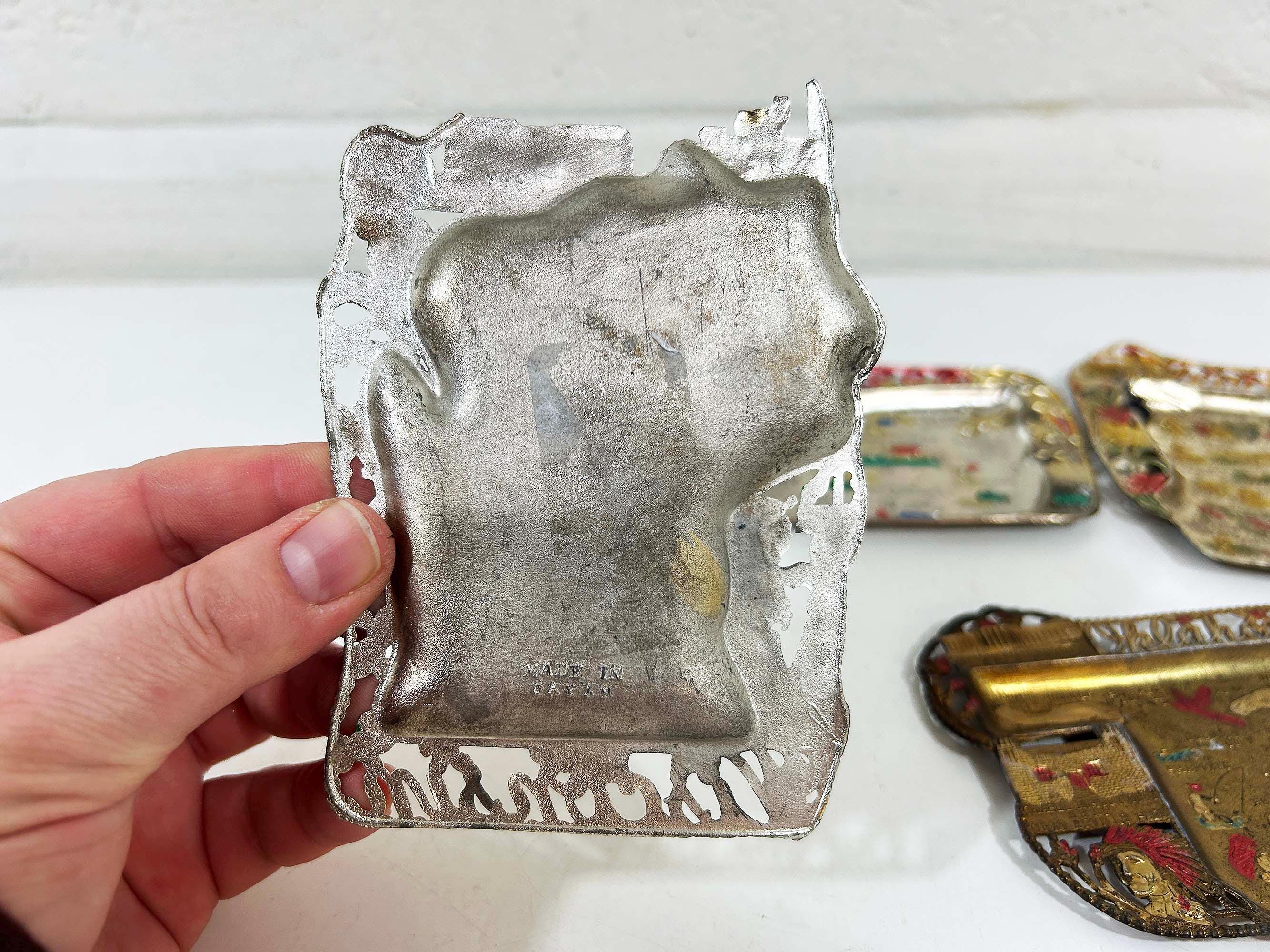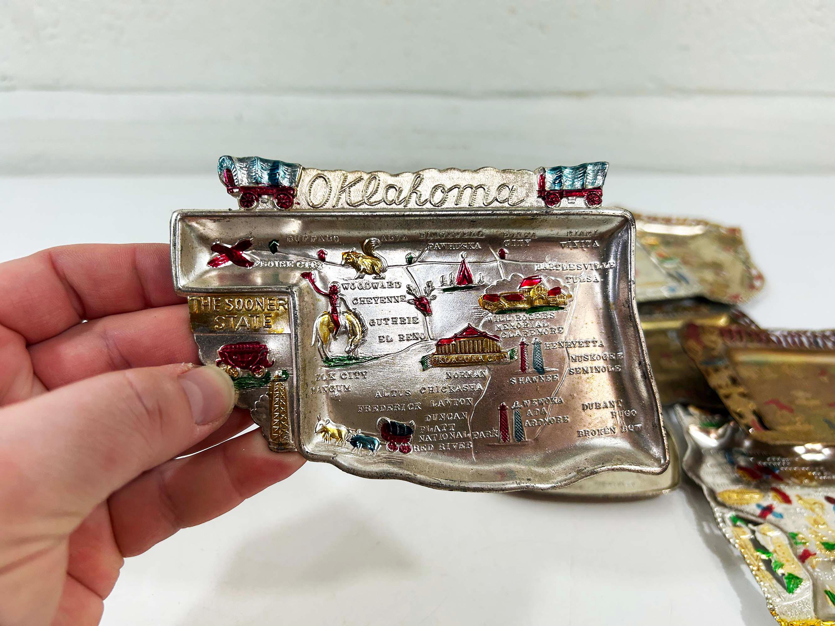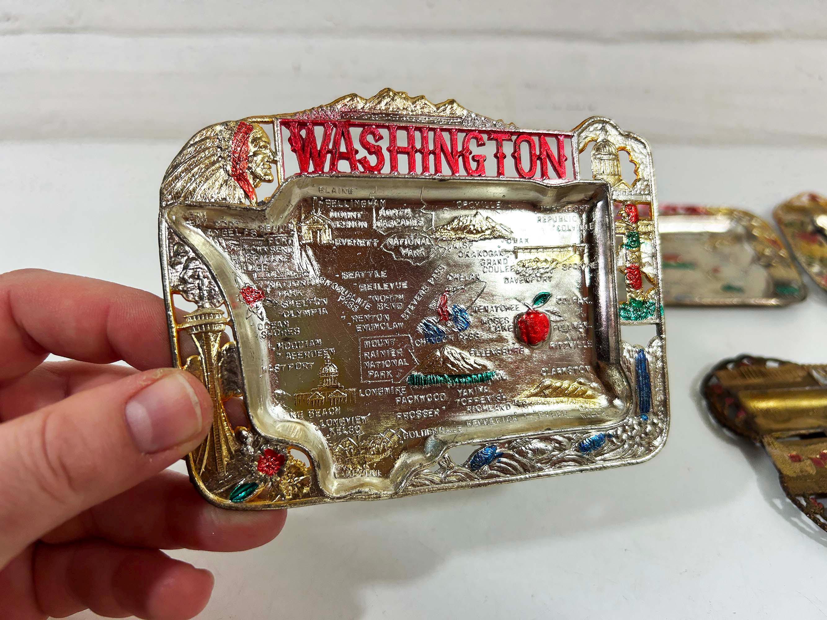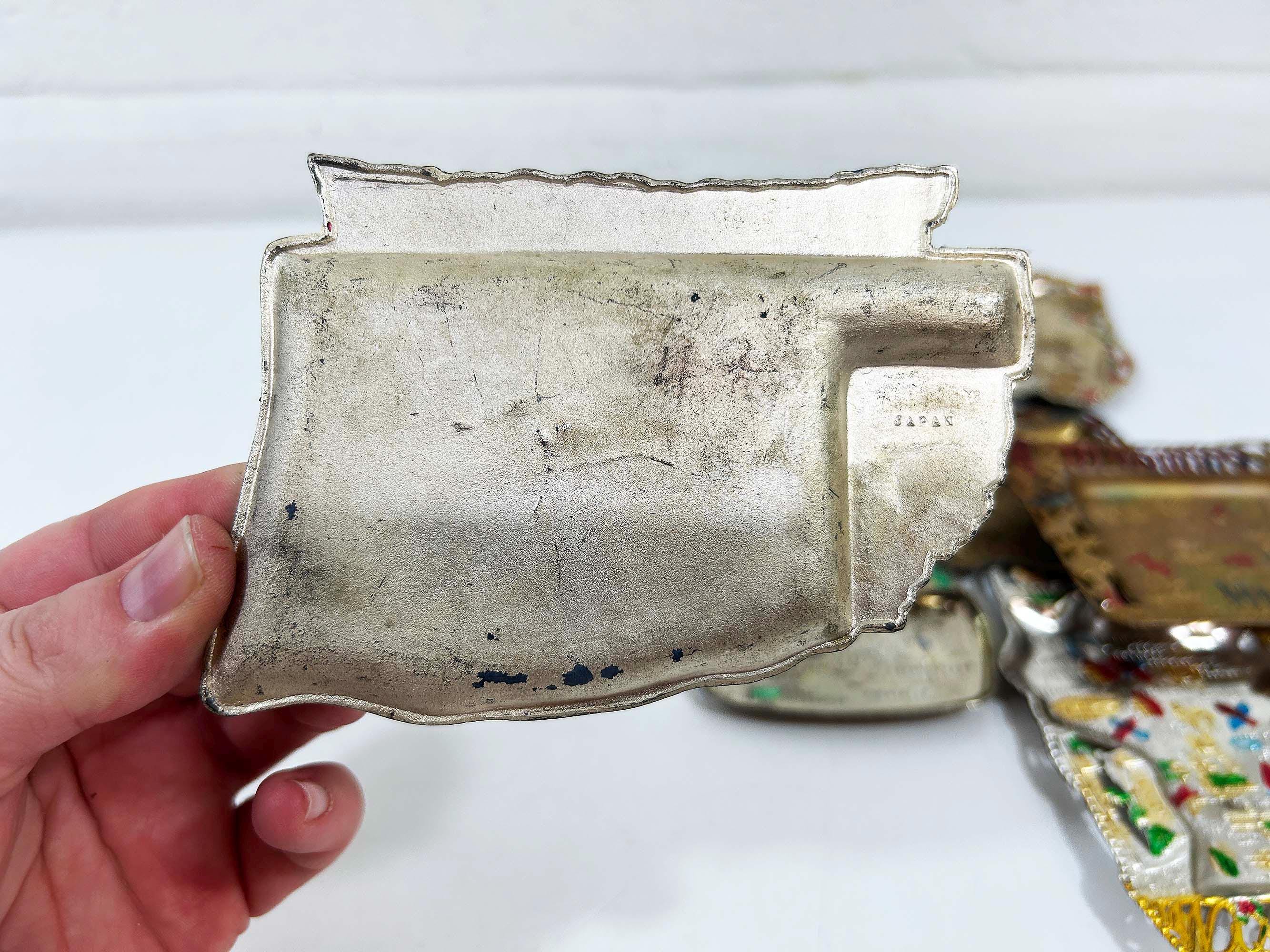 Super cool vintage US state souvenir ashtrays! Awesome graphics and designs on these. This would work great as a jewelry or change dish if you don't smoke. All of the trays have wear and damage - please be sure to inspect all photos closely. All the trays are marked "Made in Japan" on the back. They are all made of metal - possibly aluminum. They are all small trays - usually no more than 5 inches wide and 3 inches tall but it varies based on the shape. Each ashtray is sold individually - choose which state you'd like from the drop down menu.