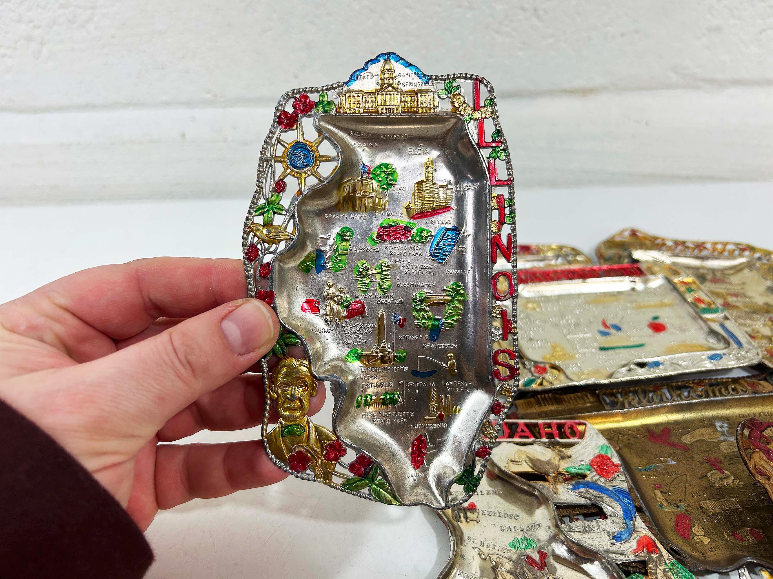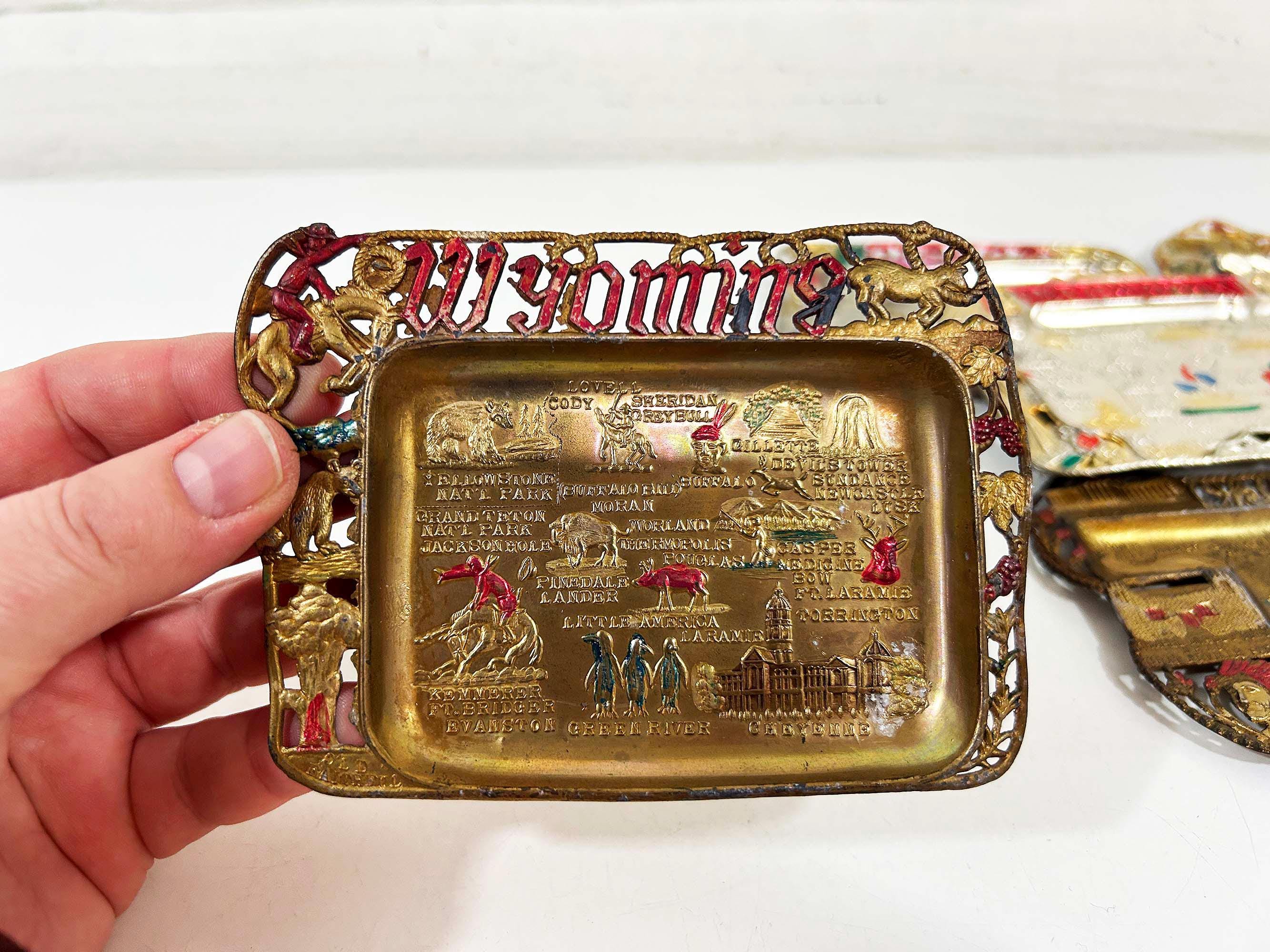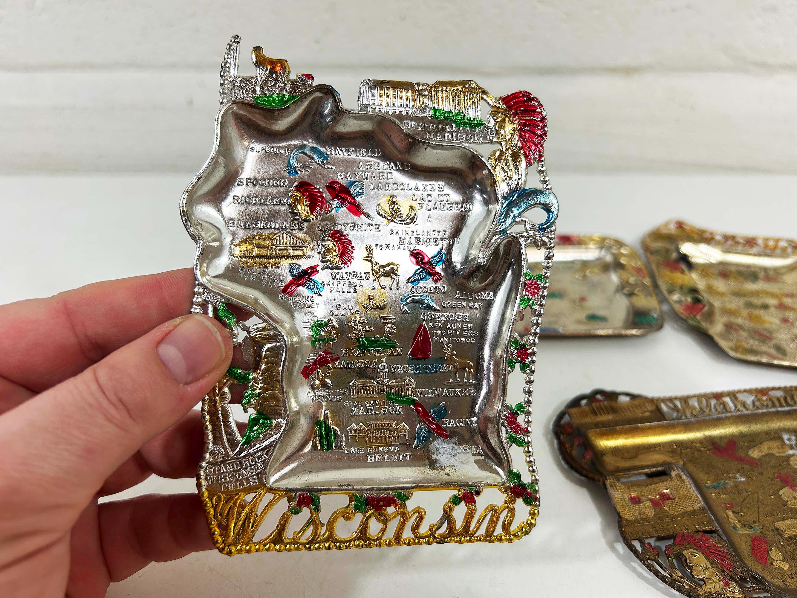 Super cool vintage US state souvenir ashtrays! Awesome graphics and designs on these. This would work great as a jewelry or change dish if you don't smoke. All of the trays have wear and damage - please be sure to inspect all photos closely. All the trays are marked "Made in Japan" on the back. They are all made of metal - possibly aluminum. They are all small trays - usually no more than 5 inches wide and 3 inches tall but it varies based on the shape. Each ashtray is sold individually - choose which state you'd like from the drop down menu.