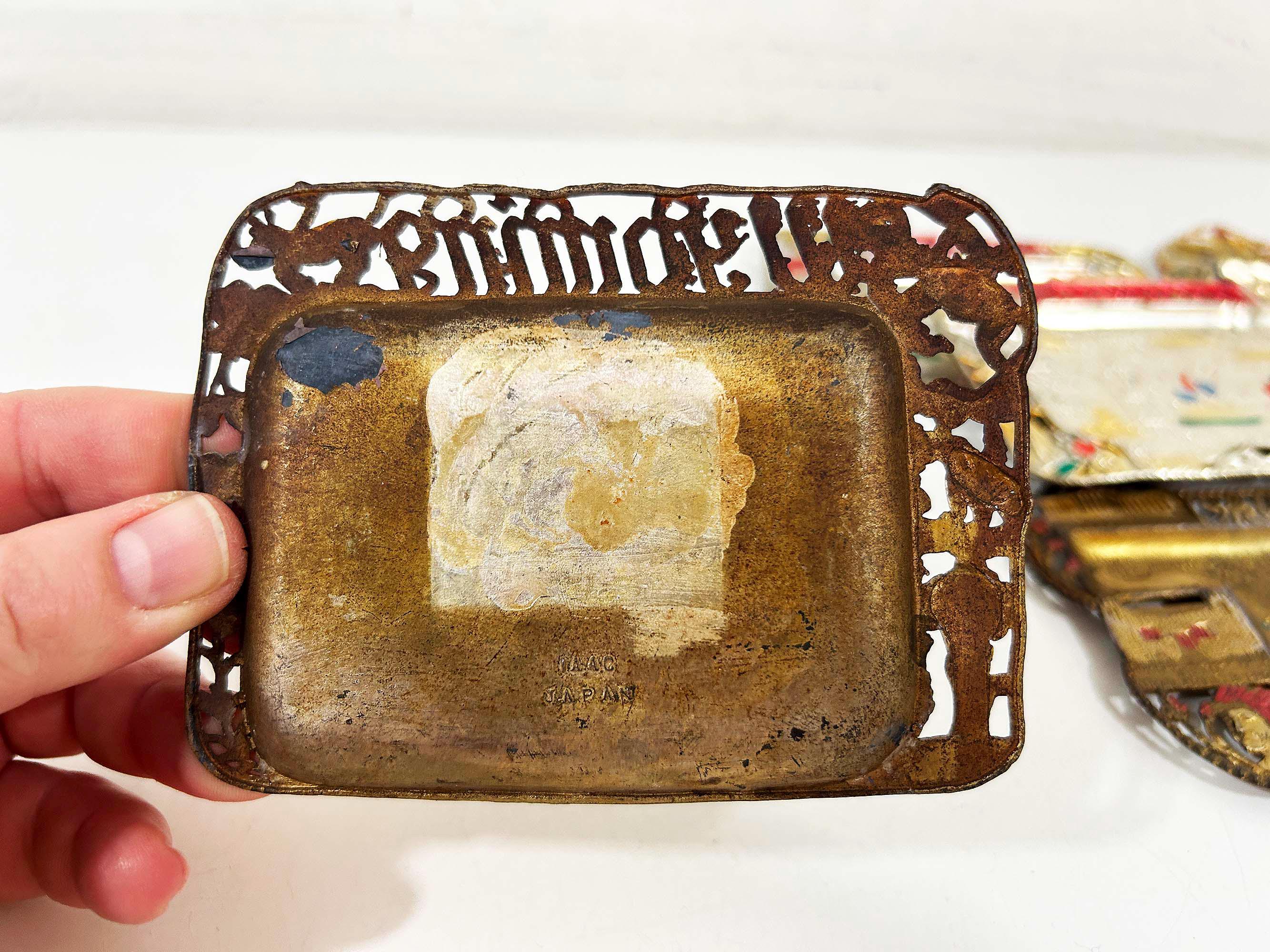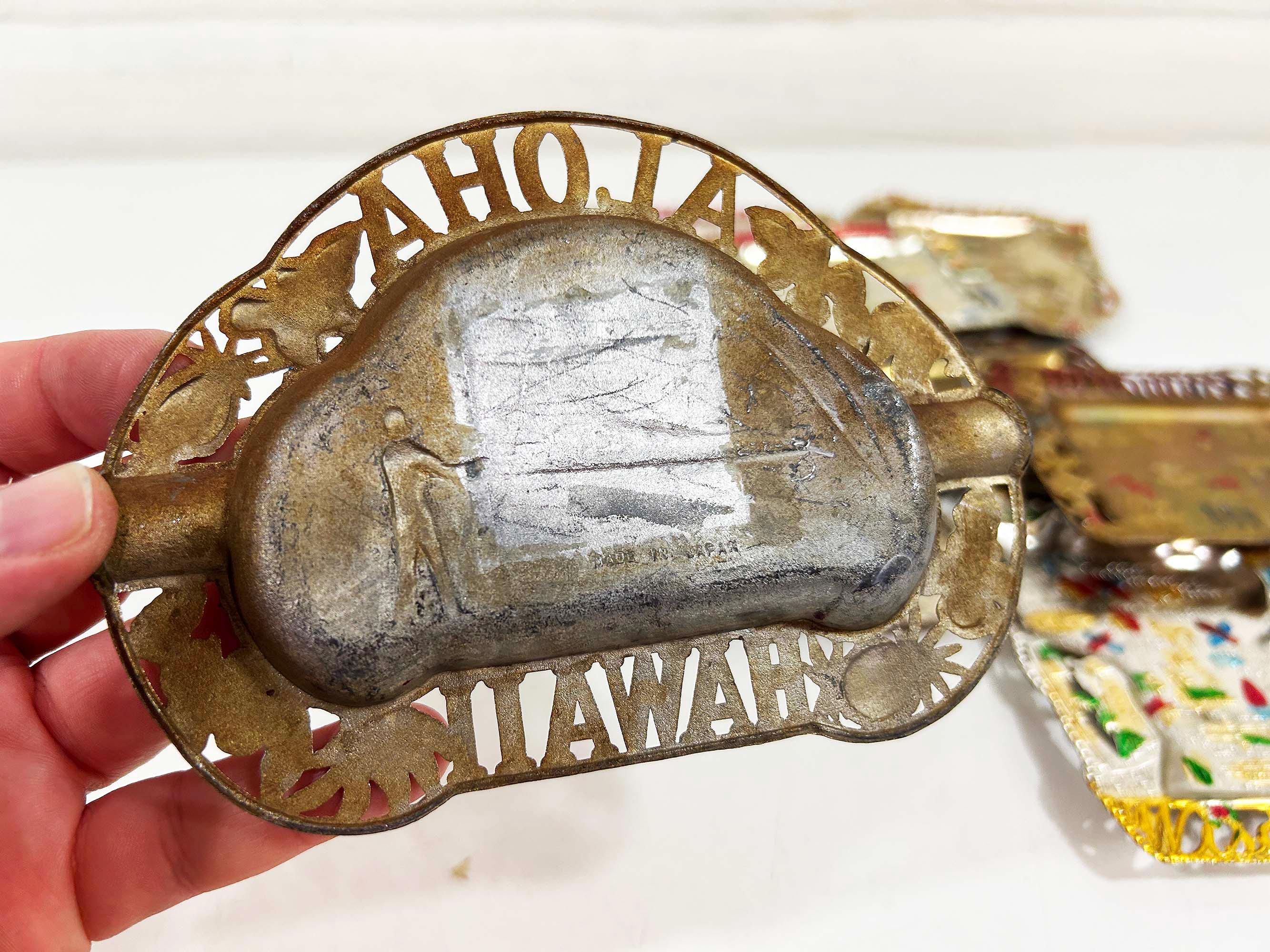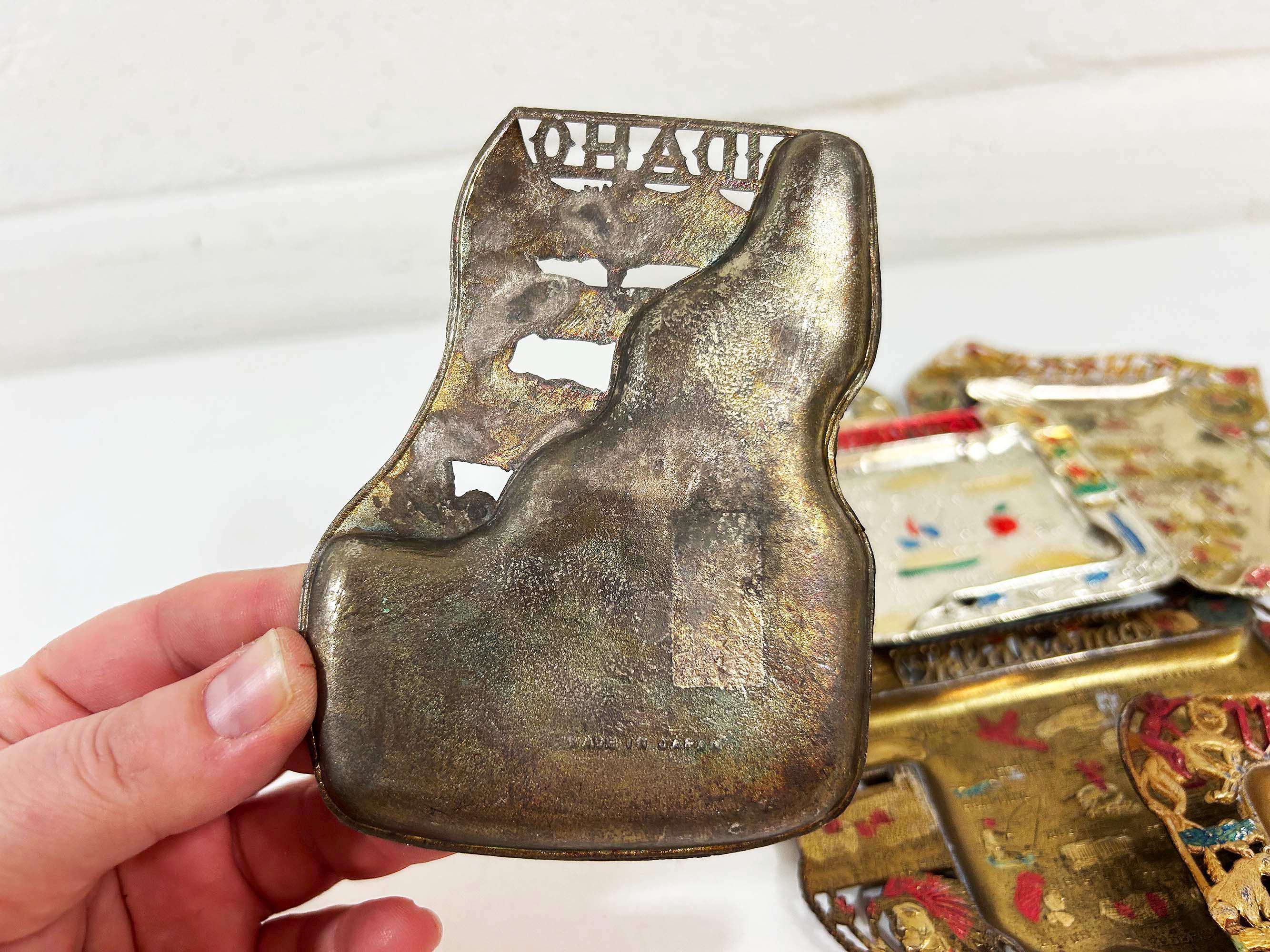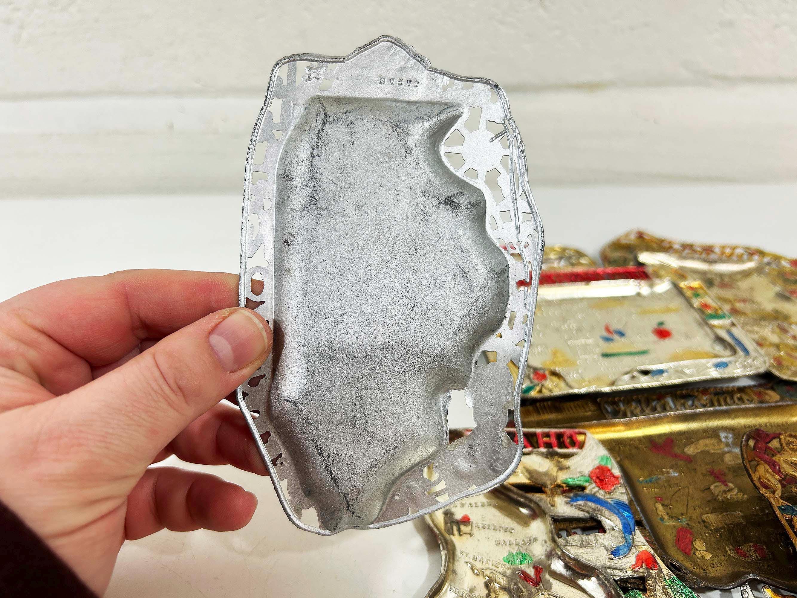 Super cool vintage US state souvenir ashtrays! Awesome graphics and designs on these. This would work great as a jewelry or change dish if you don't smoke. All of the trays have wear and damage - please be sure to inspect all photos closely. All the trays are marked "Made in Japan" on the back. They are all made of metal - possibly aluminum. They are all small trays - usually no more than 5 inches wide and 3 inches tall but it varies based on the shape. Each ashtray is sold individually - choose which state you'd like from the drop down menu.