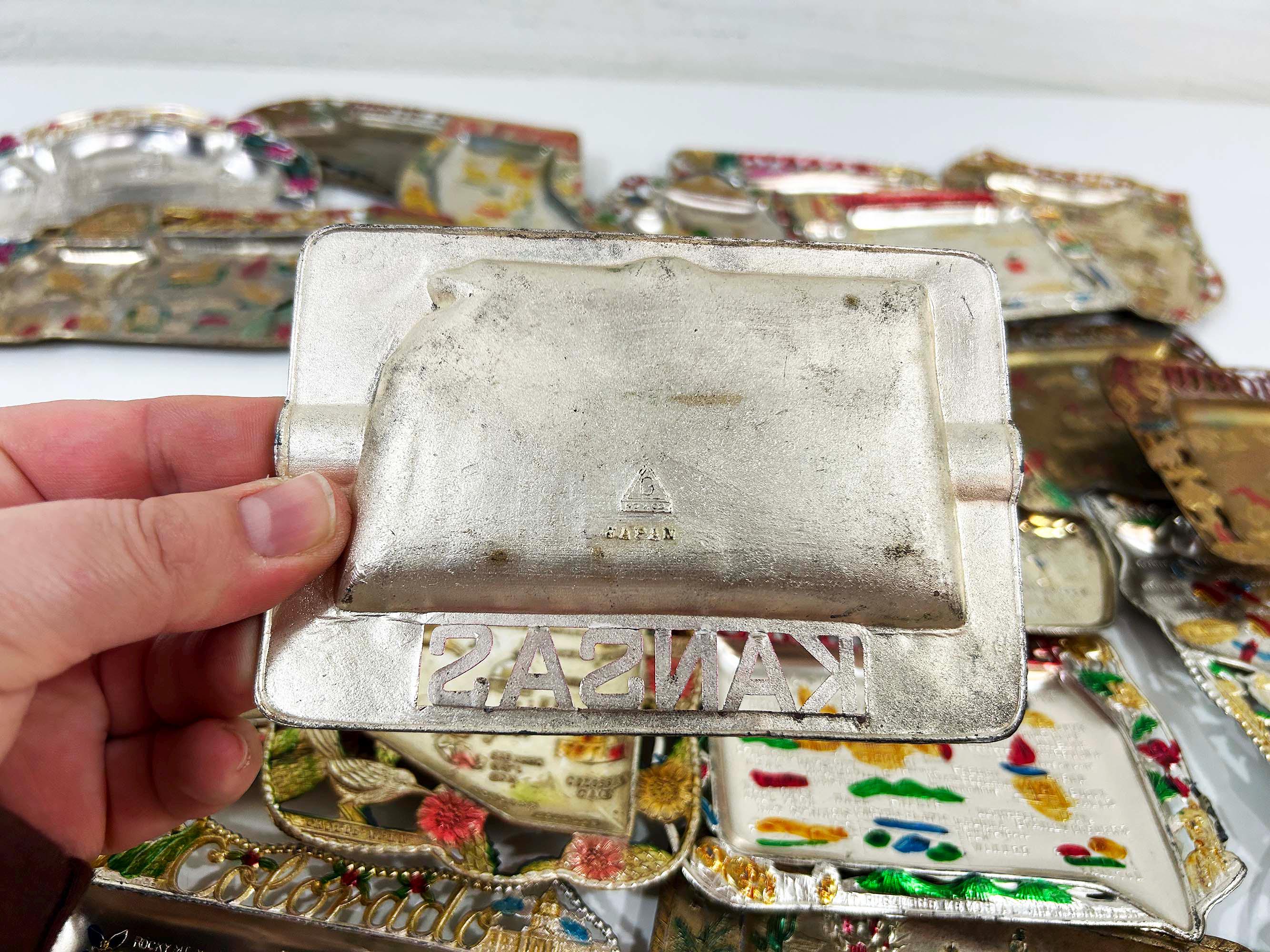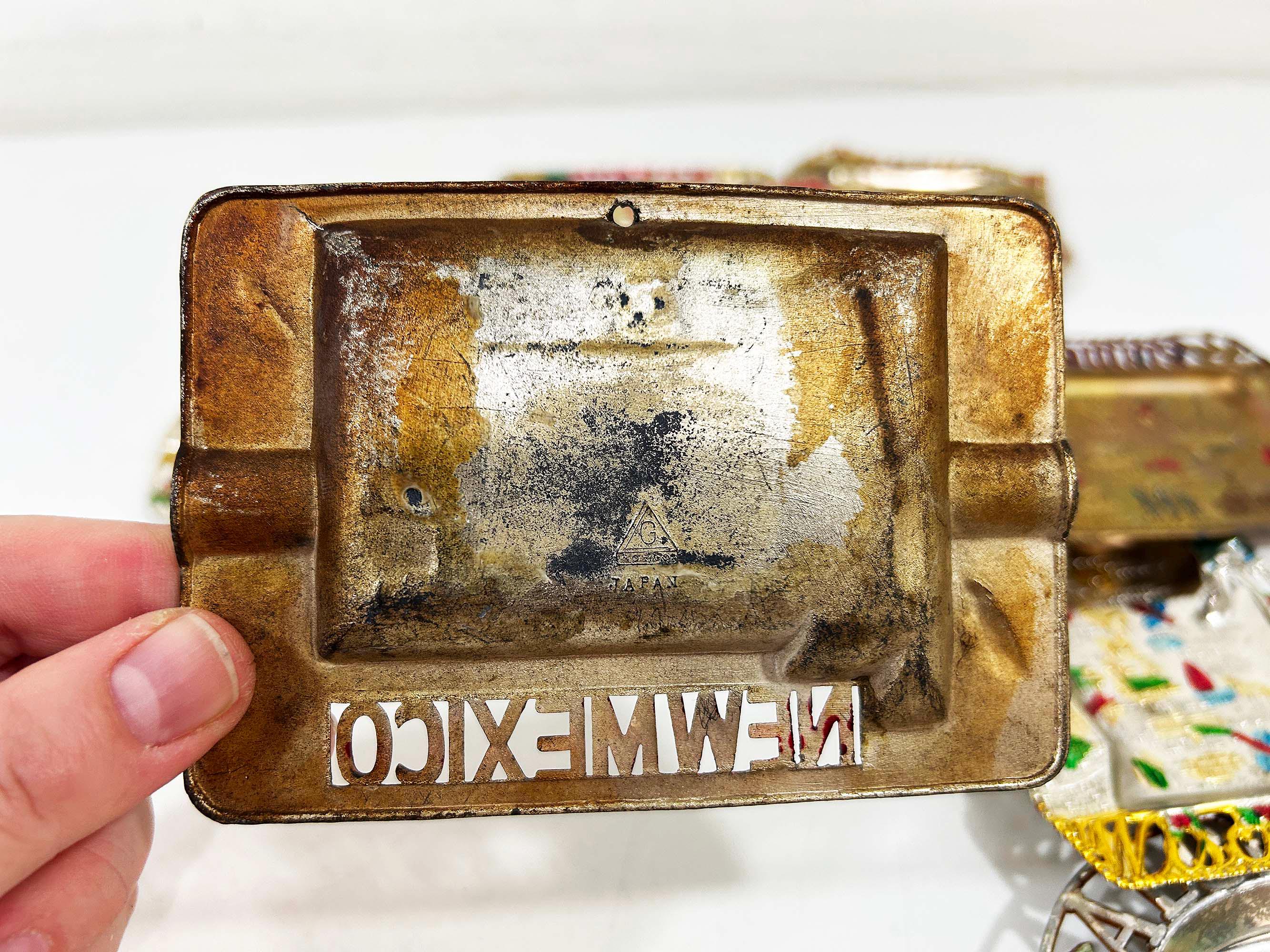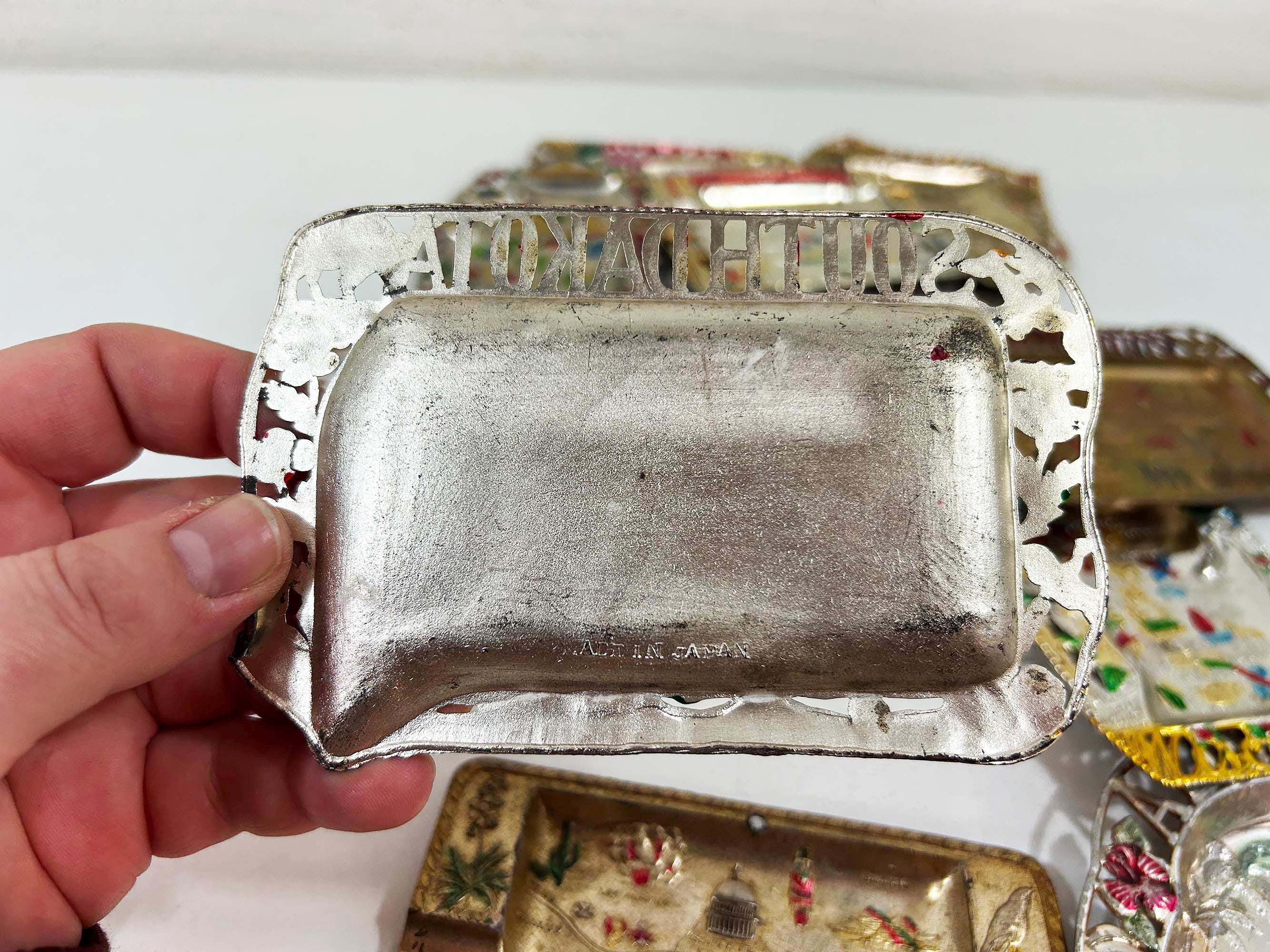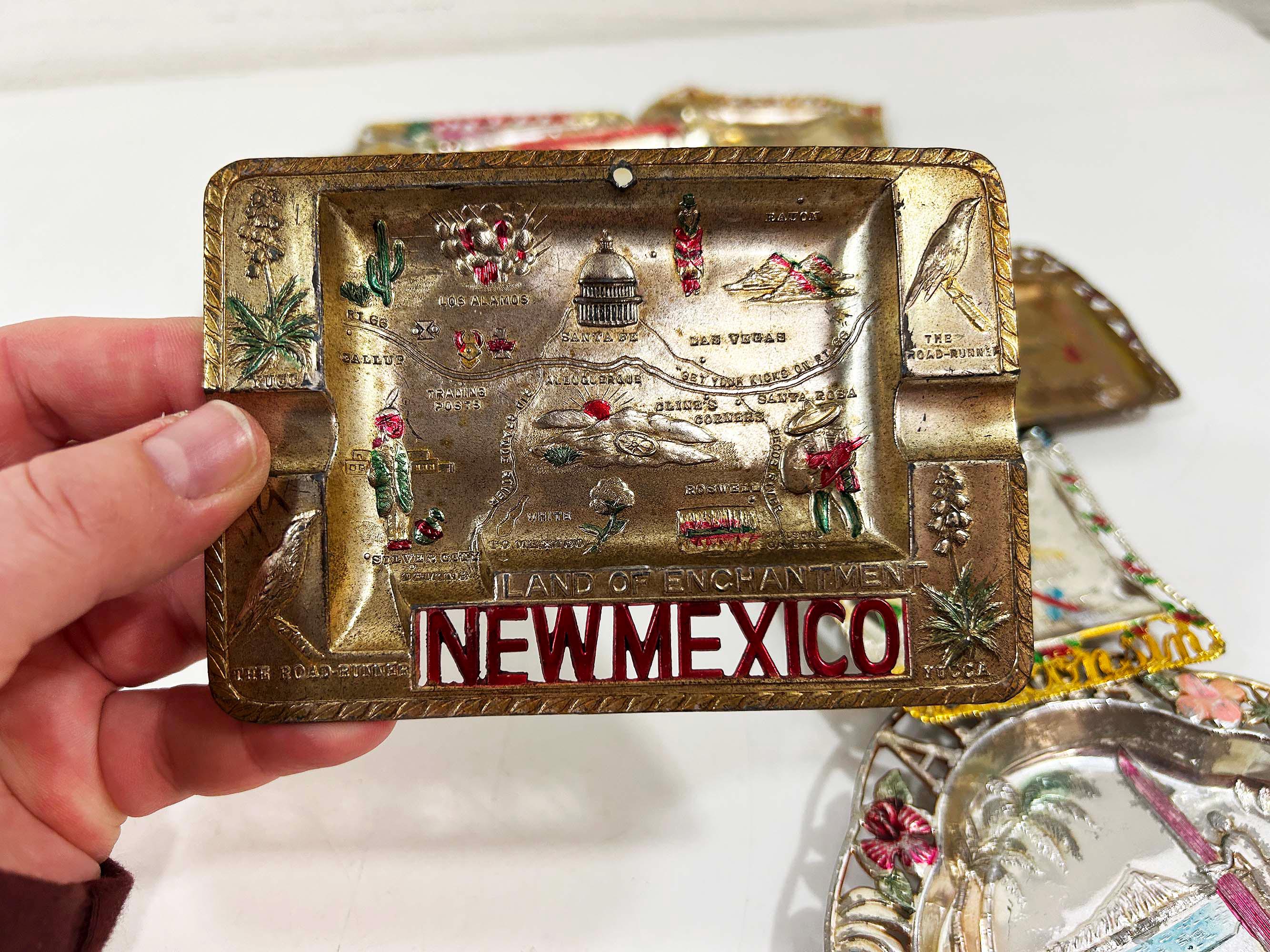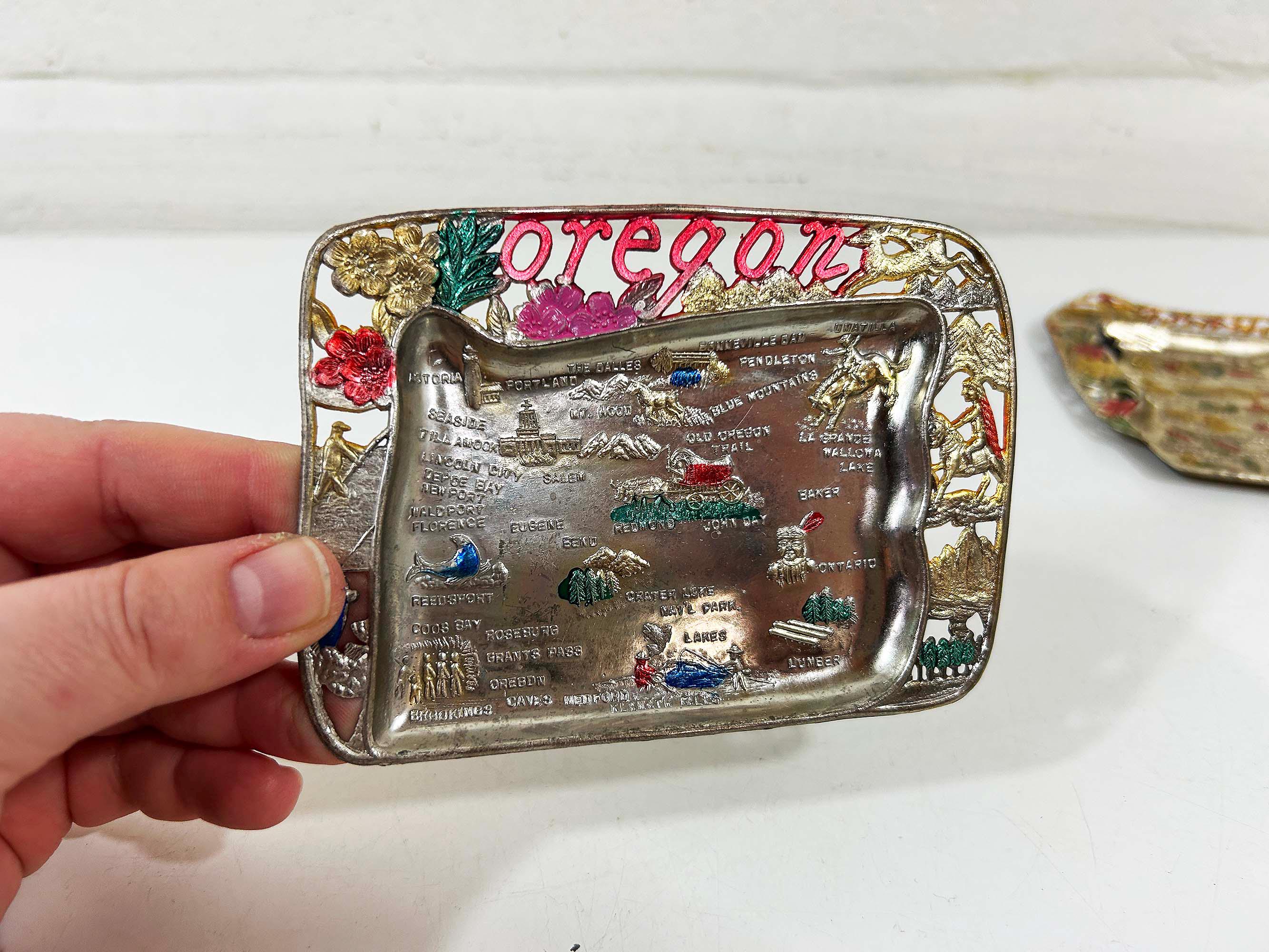 Super cool vintage US state souvenir ashtrays! Awesome graphics and designs on these. This would work great as a jewelry or change dish if you don't smoke. All of the trays have wear and damage - please be sure to inspect all photos closely. All the trays are marked "Made in Japan" on the back. They are all made of metal - possibly aluminum. They are all small trays - usually no more than 5 inches wide and 3 inches tall but it varies based on the shape. Each ashtray is sold individually - choose which state you'd like from the drop down menu.
