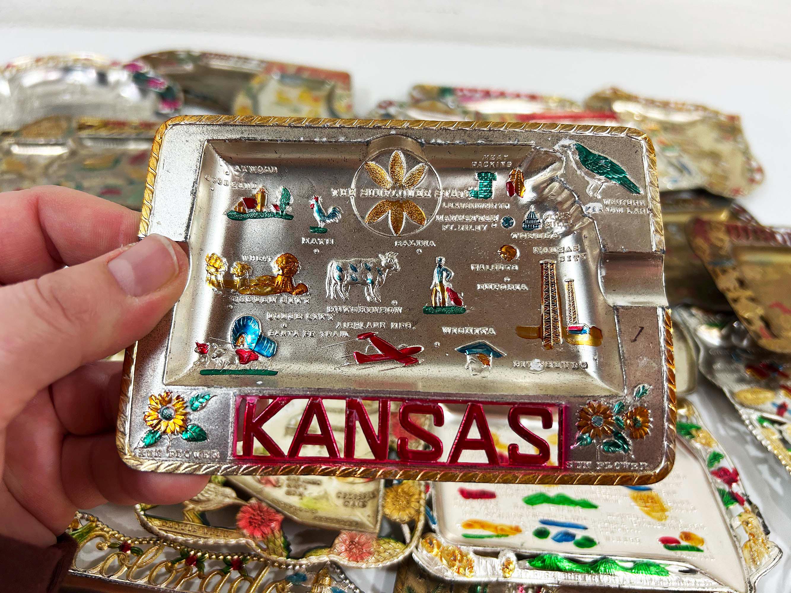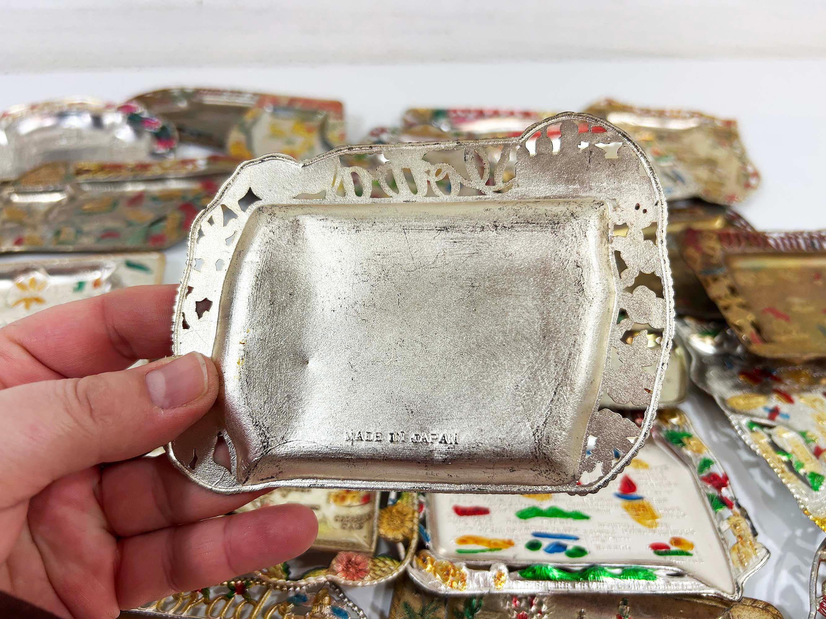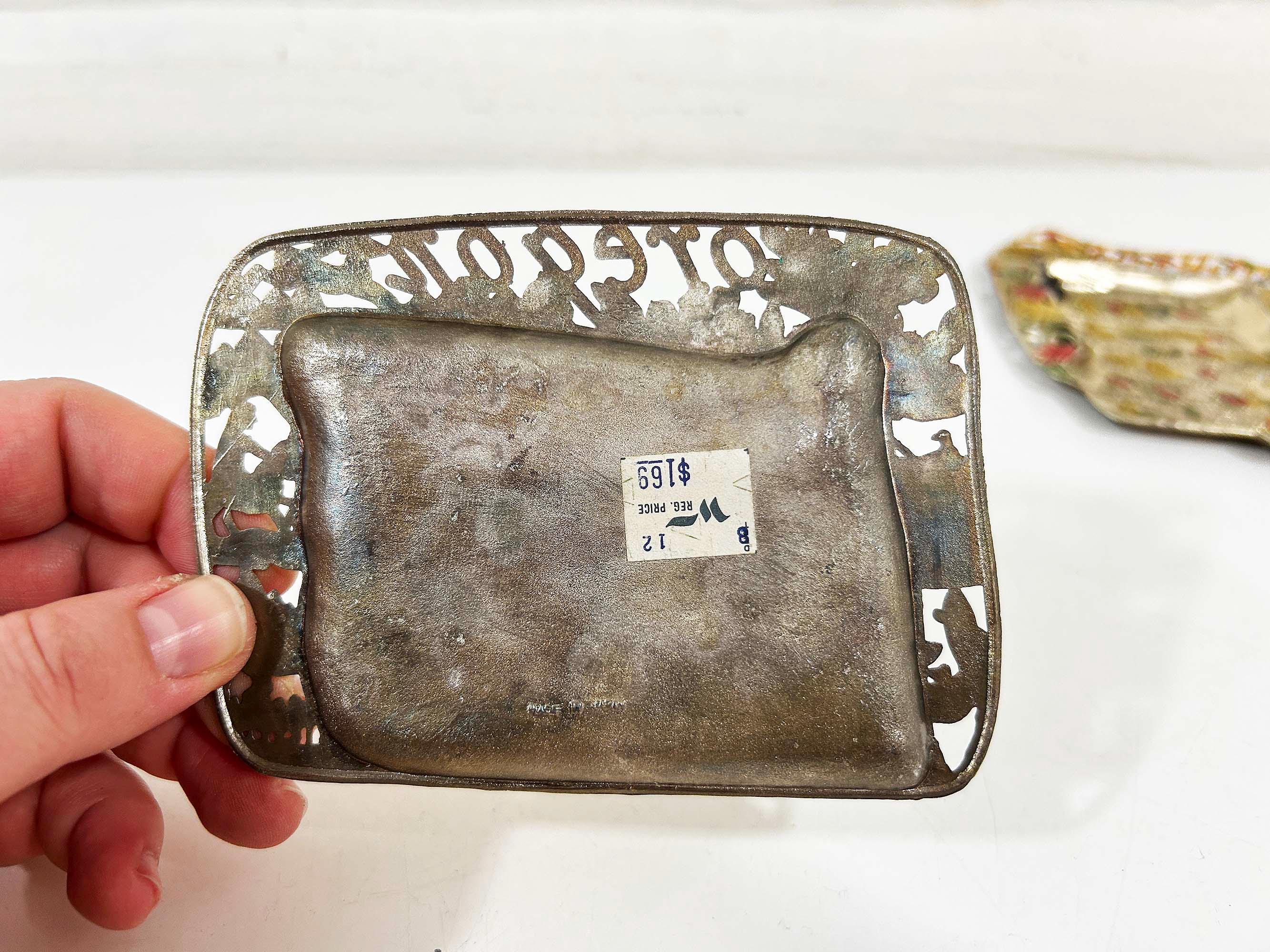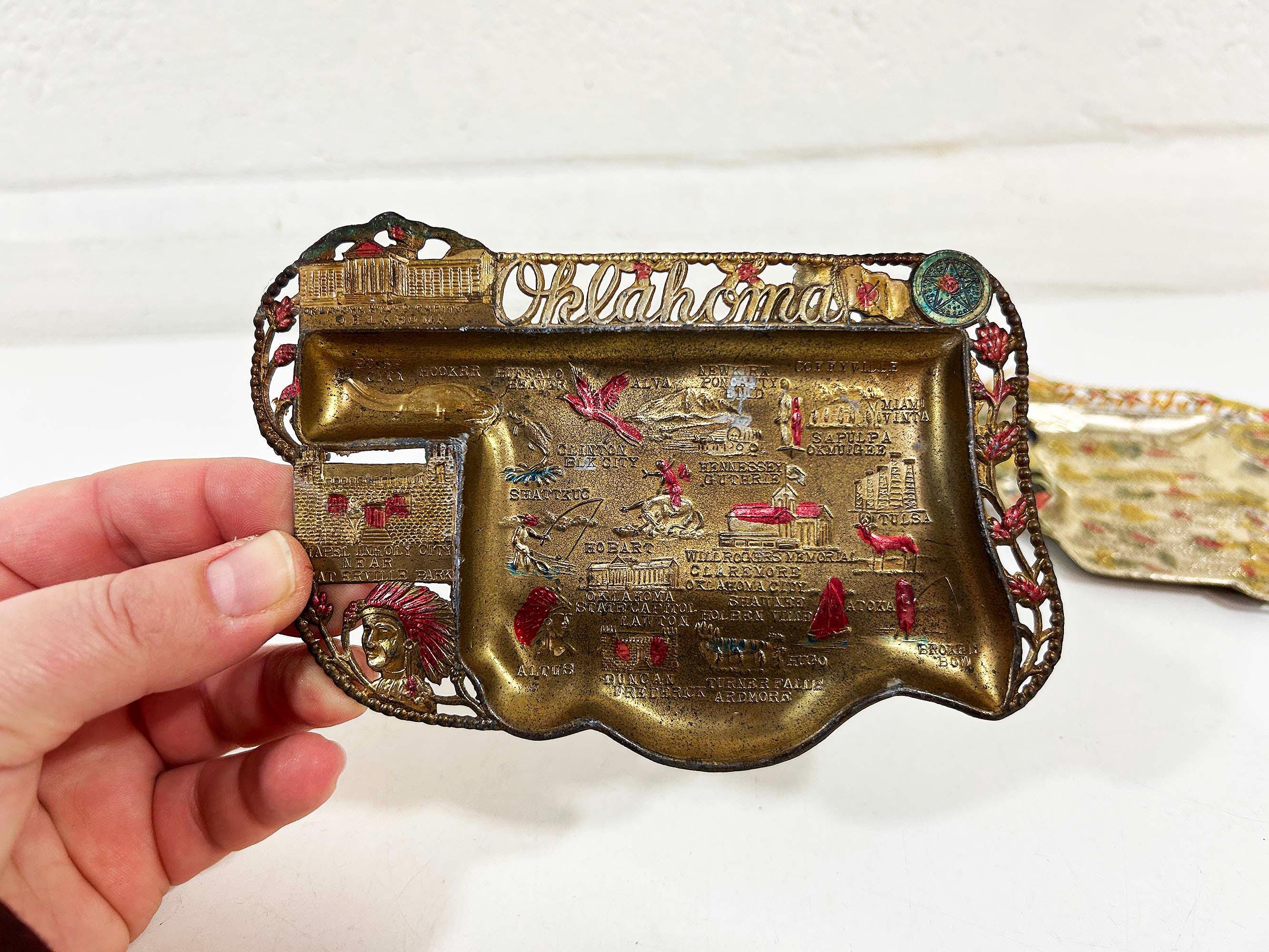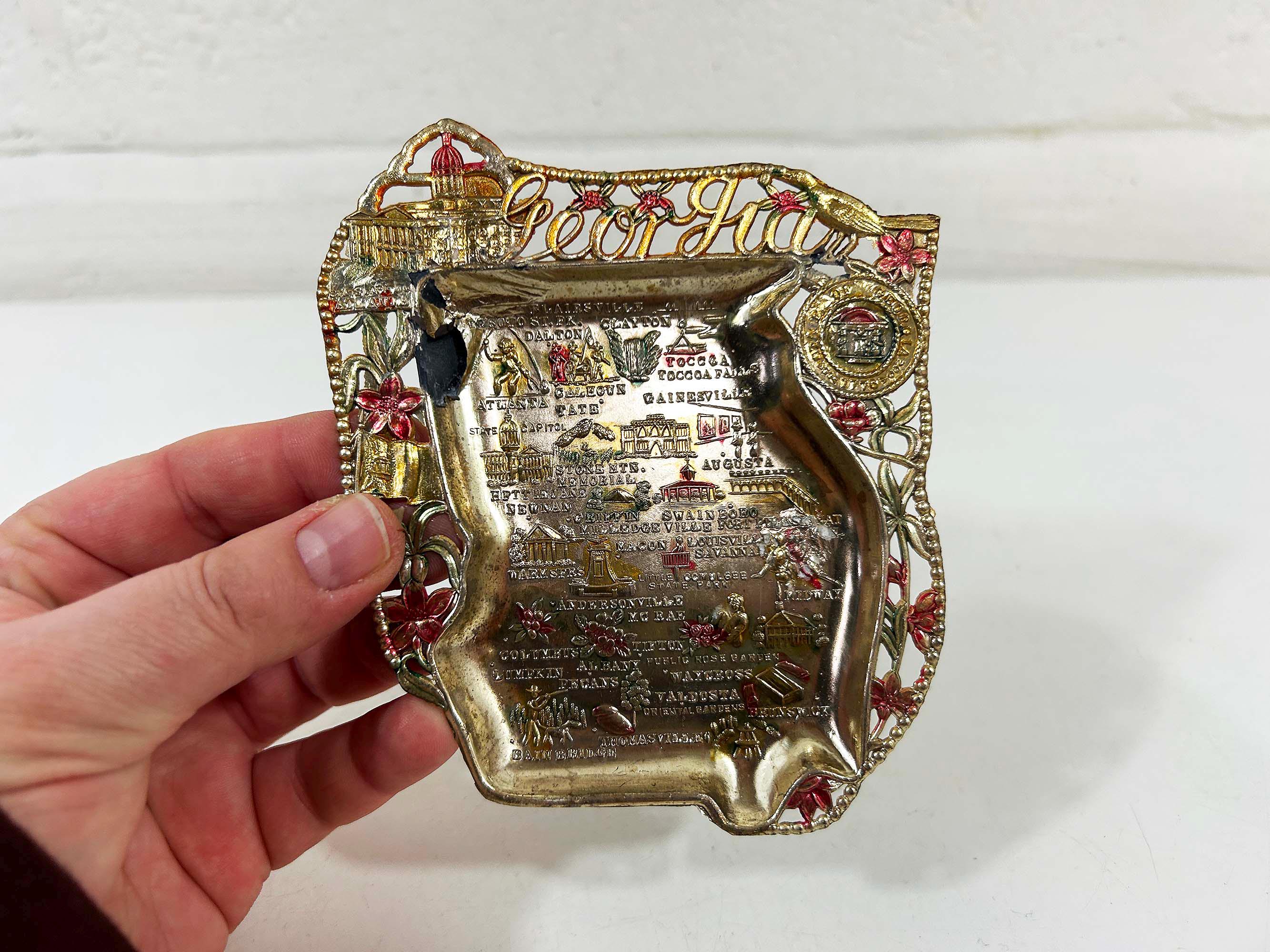 Super cool vintage US state souvenir ashtrays! Awesome graphics and designs on these. This would work great as a jewelry or change dish if you don't smoke. All of the trays have wear and damage - please be sure to inspect all photos closely. All the trays are marked "Made in Japan" on the back. They are all made of metal - possibly aluminum. They are all small trays - usually no more than 5 inches wide and 3 inches tall but it varies based on the shape. Each ashtray is sold individually - choose which state you'd like from the drop down menu.