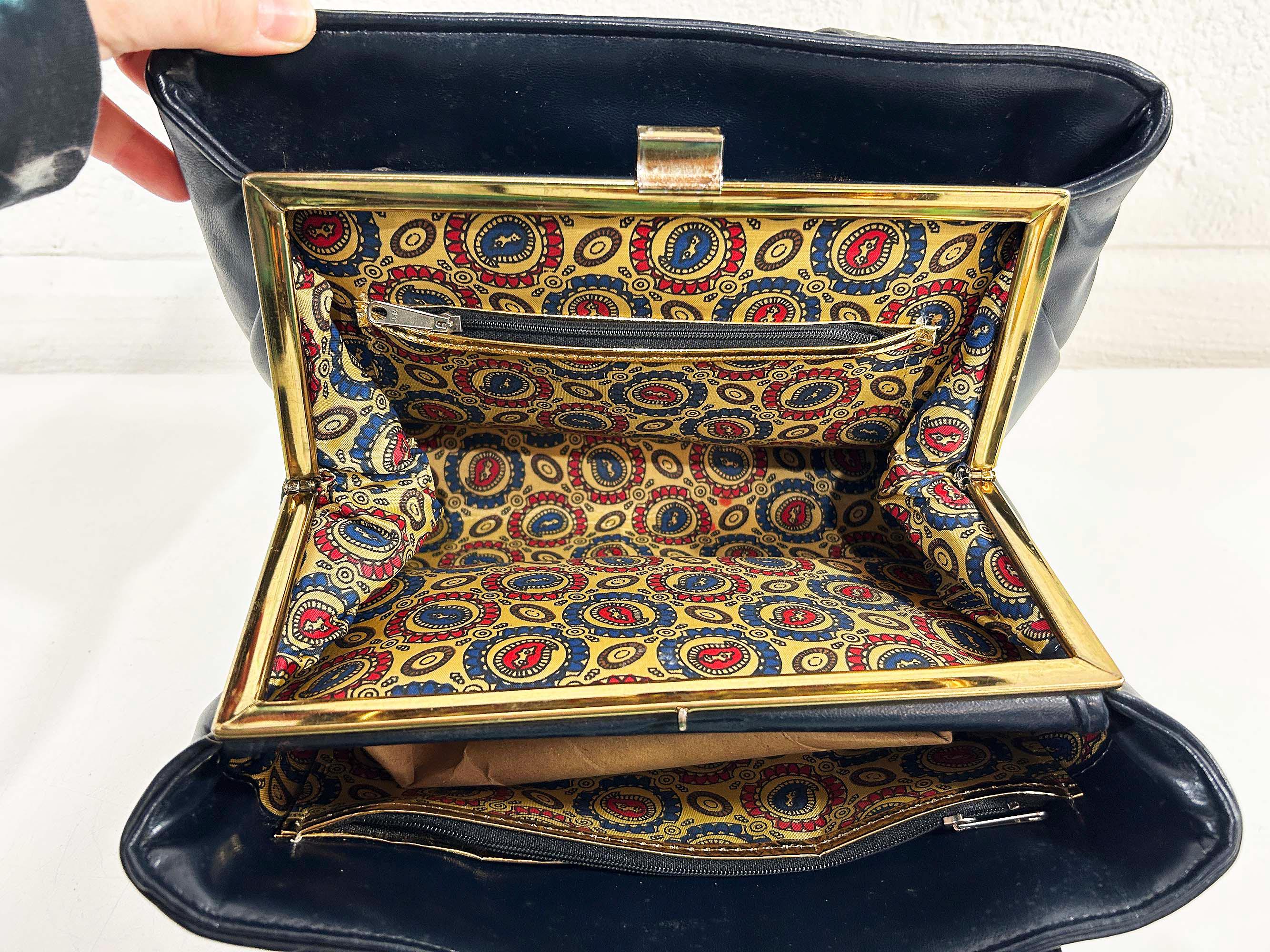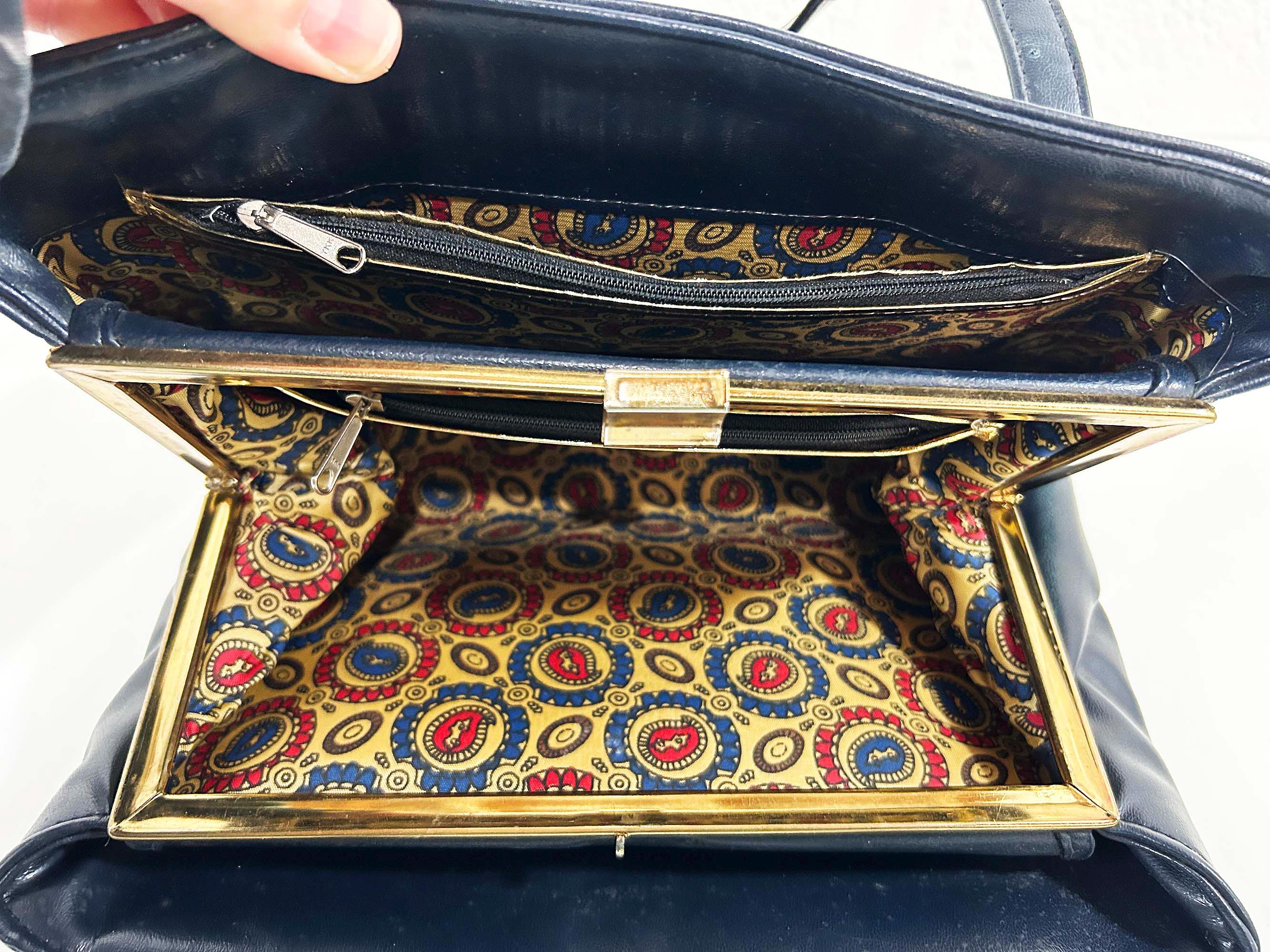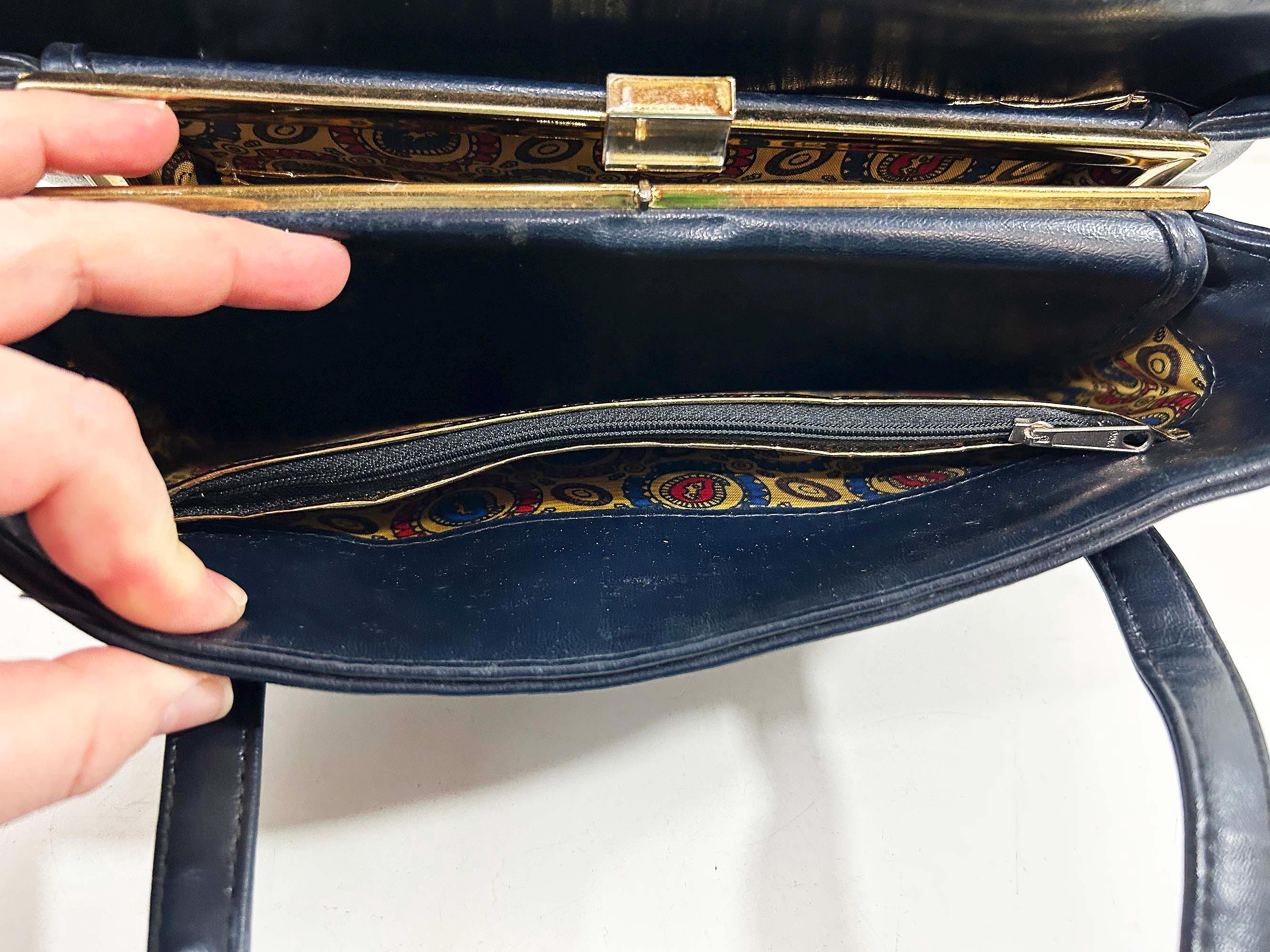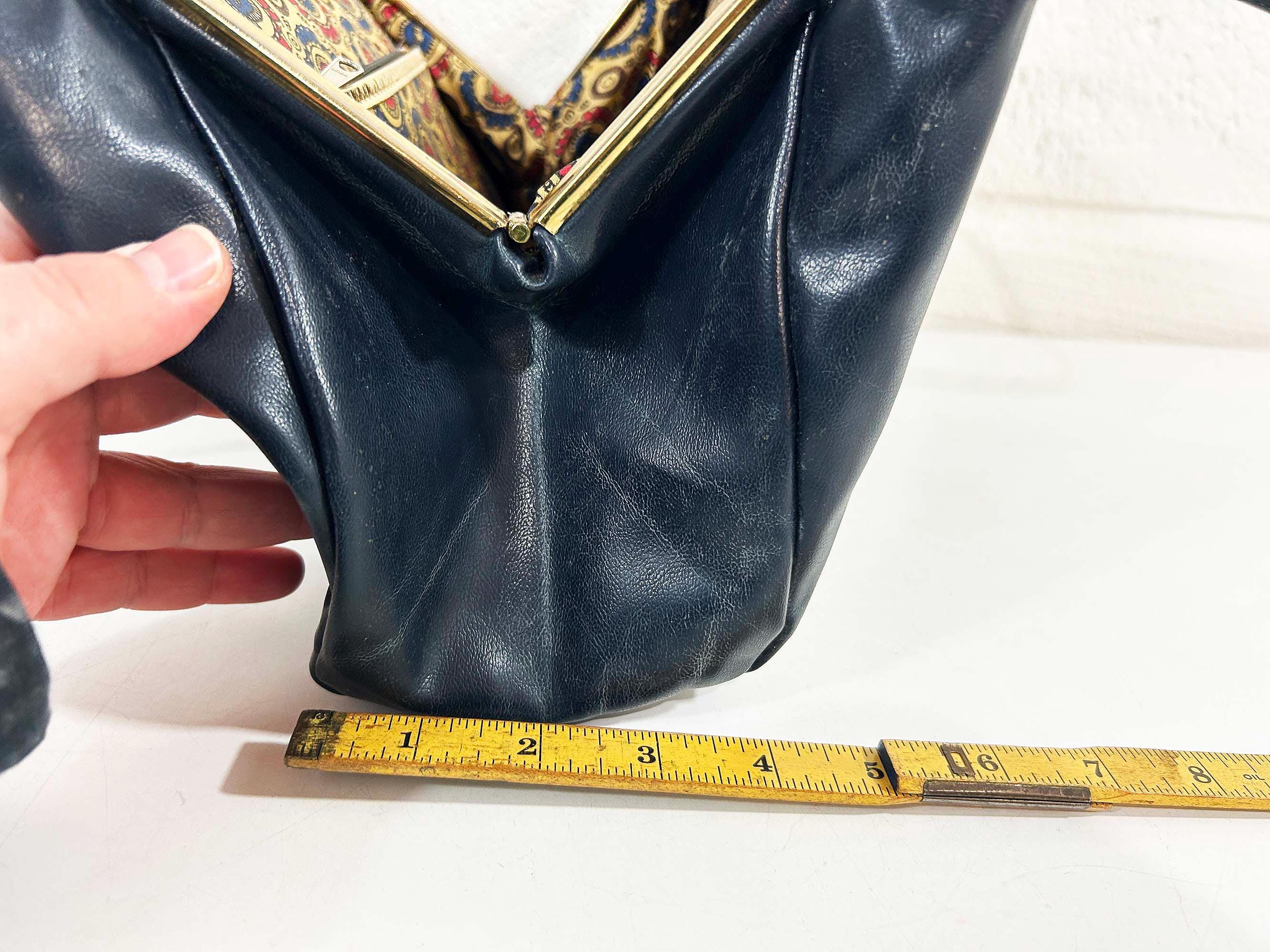 SUPER cute vinyl navy blue structured evening purse. It is in great condition but it has been loved over the years - there are some light scuffs and scratches here and there. It is lined with a pretty paisley fabric. Lots of pockets and dividers to keep things organized inside. When the purse is closed its approximately 11 inches wide, 8 inches tall, and 4 inches deep. The handle drop is approximately 6 inches.